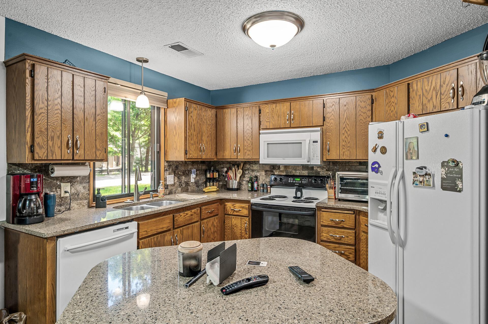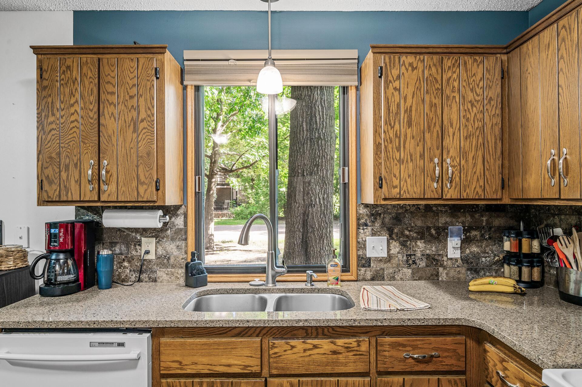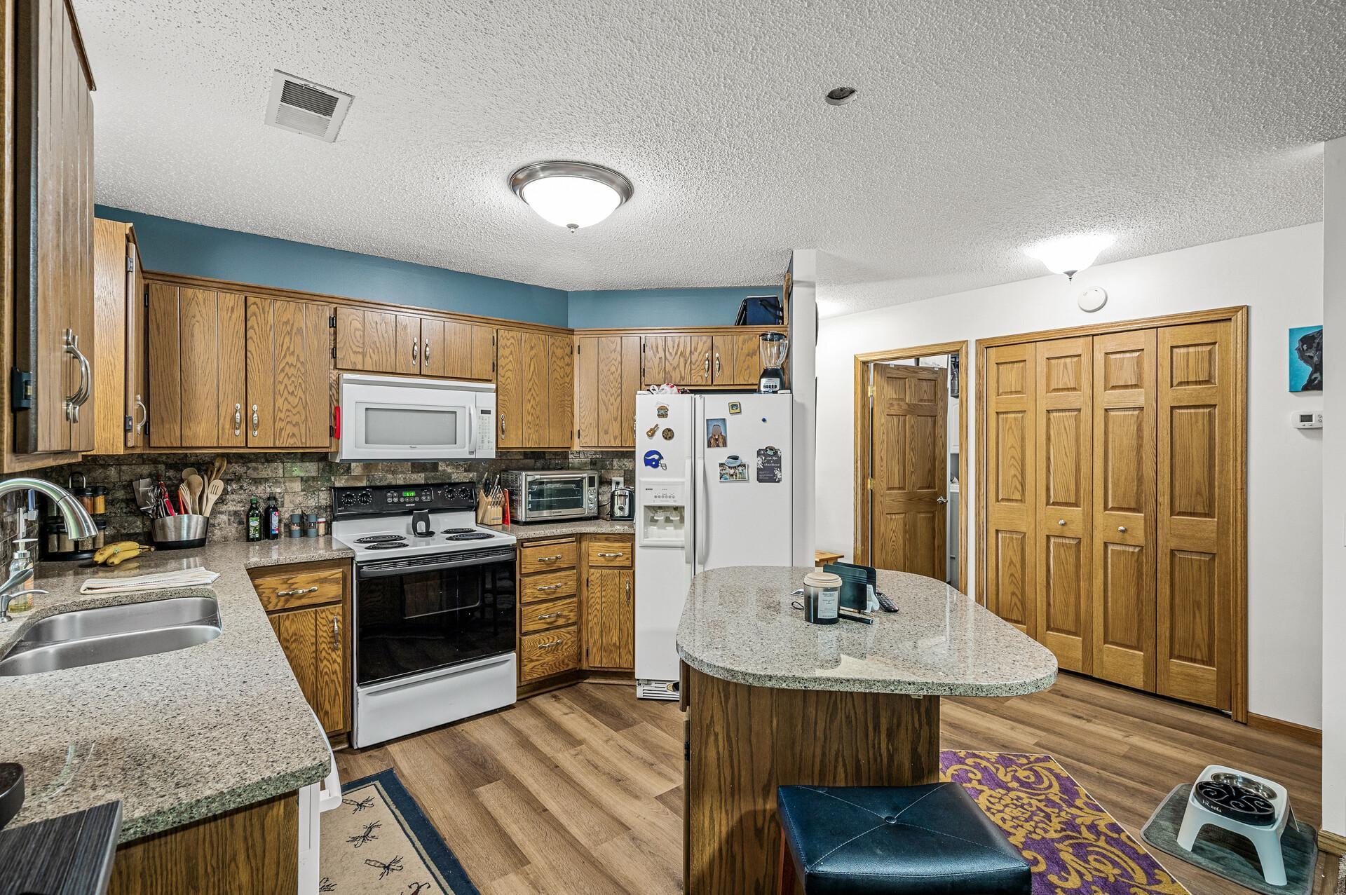 Come see this wonderful 1- level townhome located on a quiet road close to shops, restaurants and an easy drive to I-35 for a quick commute. The rear-facing, quiet patio with a nice wooded view allows a peaceful setting for a morning coffee. The quartz counters, and vinyl planking help create an easy to maintain and beautiful kitchen. The second bedroom has a built in cabinet in the closet and was used as a den/office. Extra built-in storage space in the well-sized 2 car garage.
