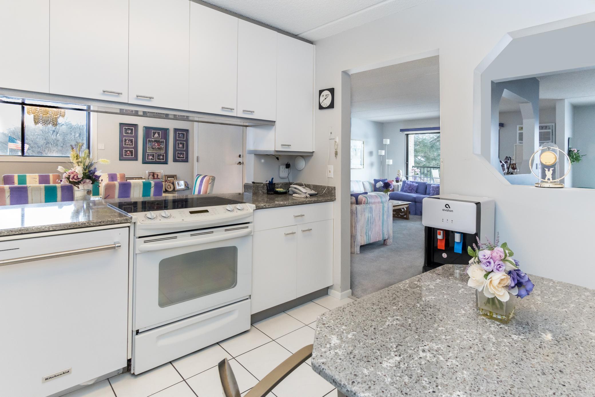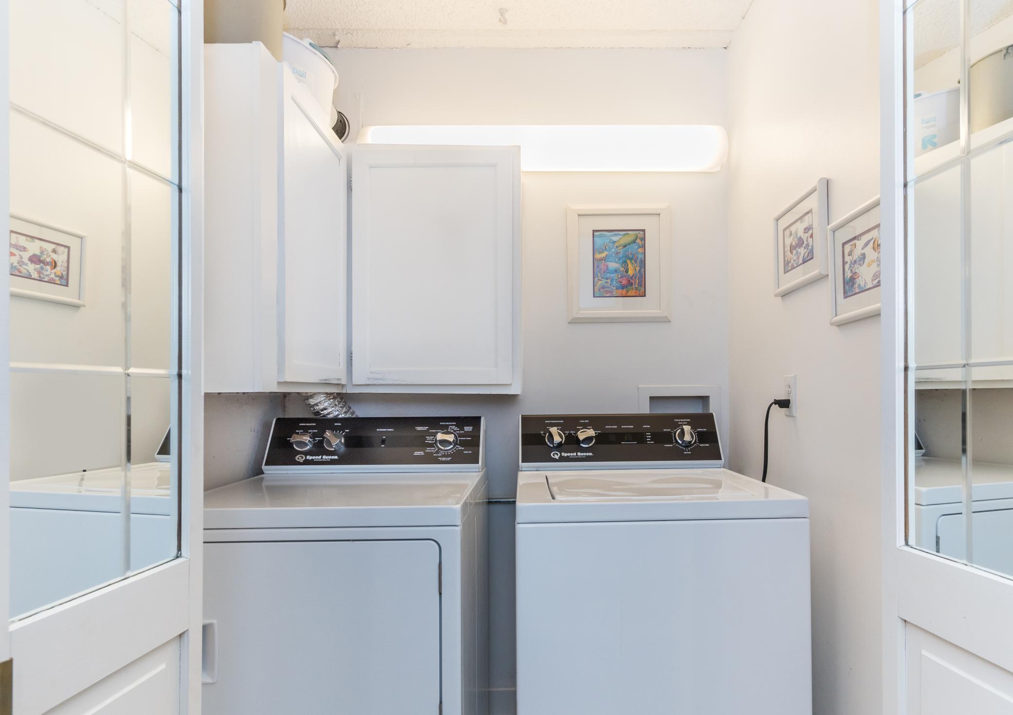 RARE end unit! Turnkey home! In unit laundry! Open and airy! This is a three bedroom unit. Large primary suite with walk-in closet. New carpet throughout. Two new air conditioners. New light fixtures. New Speed Queen washer and dryer. Automatic window coverings. Two large balconies. Shared amenities include: Indoor and outdoor pools, party room, exercise room, Jacuzzi, sauna and tennis courts. Guest suite.