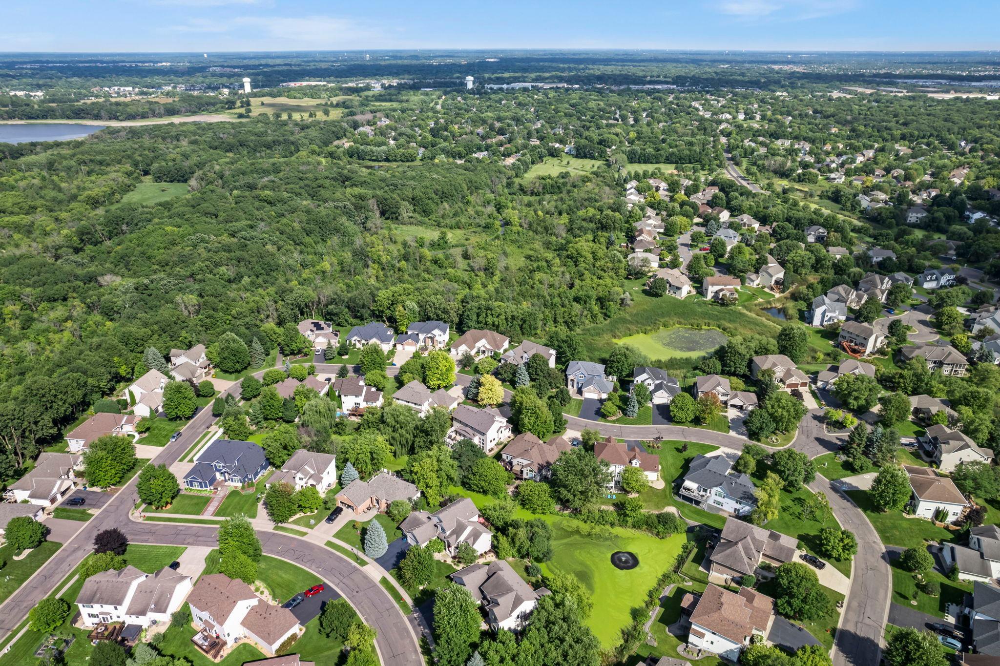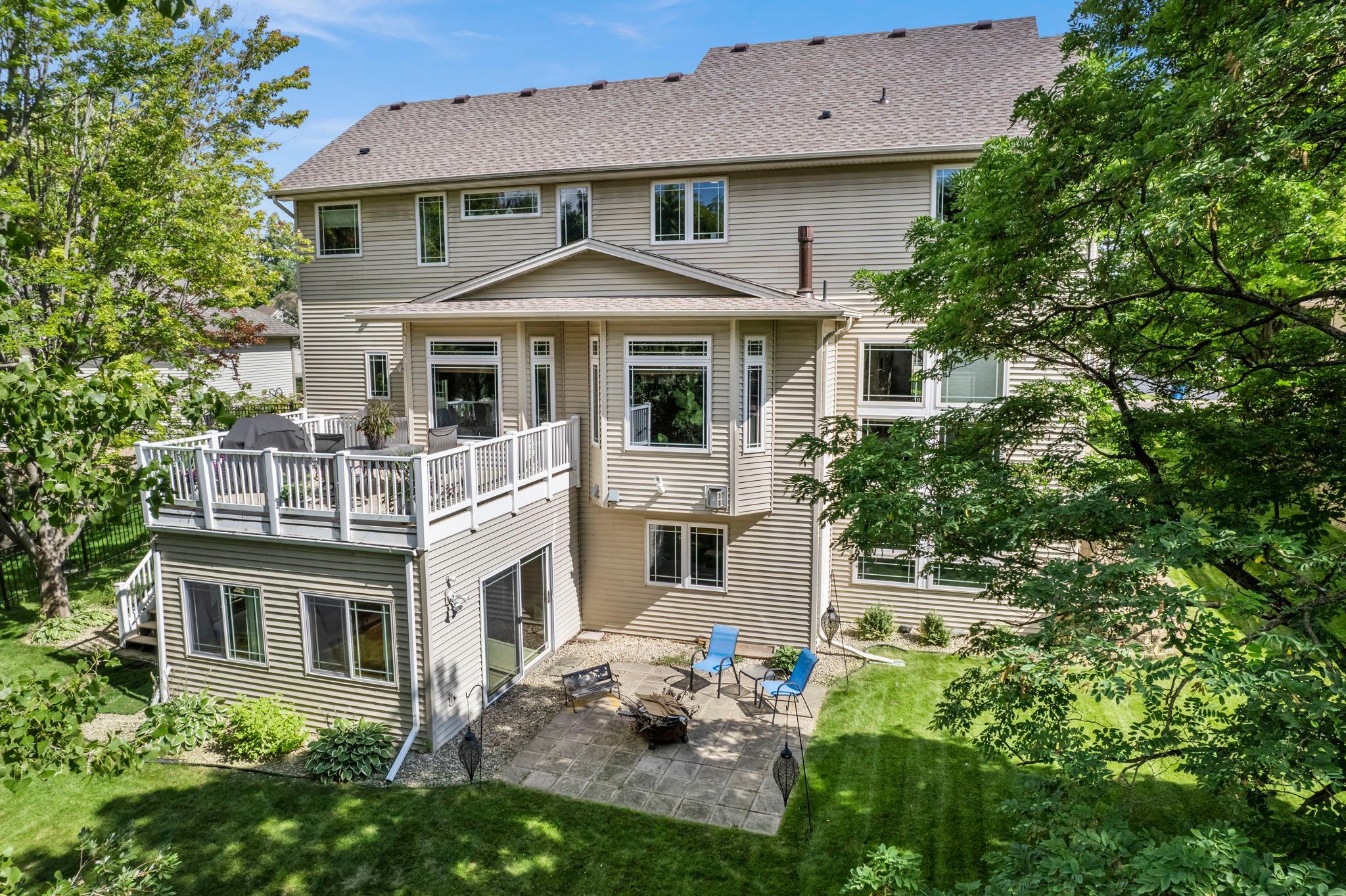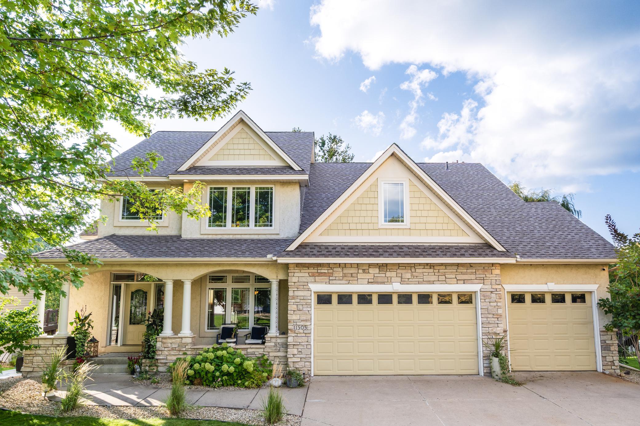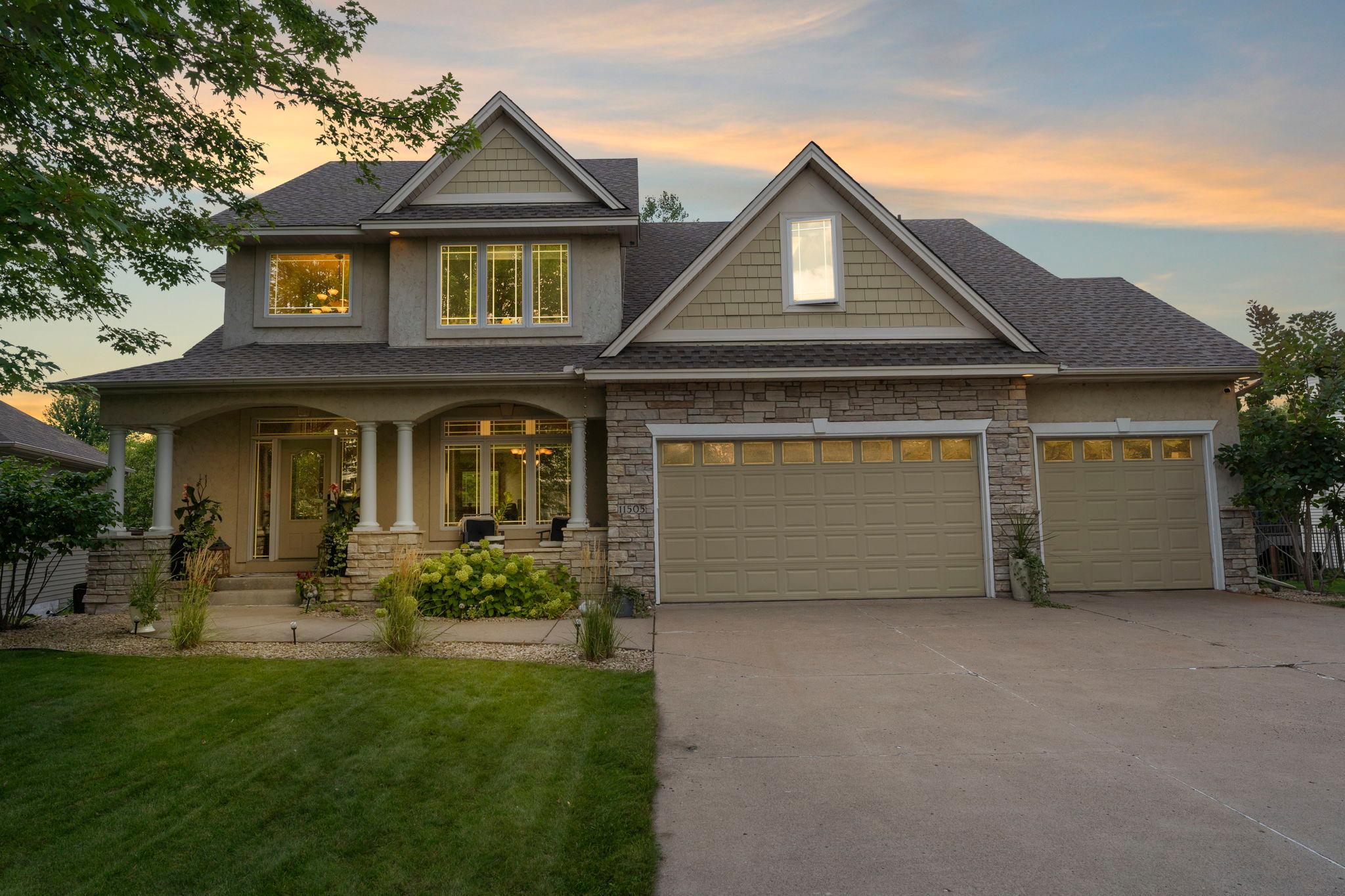 Impressive luxury inside and out! The original owner was the builder, so this quality-built home is loaded with upgrades and unique custom features. Perfectly situated just steps away from 4,900 acres of Elm Creek Park Reserve, which offers amenities for almost every outdoor activity. This home offers both natural beauty and everyday convenience. The exterior boasts gorgeous curb appeal. First thing you will notice besides the beautiful landscaped yard with in-ground sprinkles, is the concrete driveway leading to the 3 car heated garage. An expansive covered front porch greets you to the front door. Inside, the open and inviting layout begins with a two-story slate-floored foyer, and a catwalk that overlooks the 2 story massive lower level family room/great room with floor to ceiling windows and leads you to a cozy hearth area with gas fireplace and informal dining. The spacious kitchen is a true centerpiece with a huge island, granite countertops, under cabinet lighting, stainless steel appliances and adjacent formal dining with new premium carpet. Step outside onto your large maintenance free deck which overlooks the creek that connects two ponds. In the winter, you will find it being used for winter ice skating and hockey. A convenient half bath and laundry room with large walk-in closet complete the main level. New premium carpet leads you upstairs to four spacious bedrooms, a full bath with dual sinks for 3 of the bedrooms to share and at the end of the hall, you will come into the luxury owner’s suite with tray ceilings, an over-sized (HUGE) walk-in closet and a spa-like bath retreat, with jetted soaking tub, walk-in shower and heated floor. The lower level is designed for entertaining! All new LTV flooring, floor to ceiling double-sided fireplace, floor to ceiling windows, two expansive living areas or recreational area, custom wet bar with under cabinet lighting, wine and beverage fridges, another huge bedroom that doubles as an office, a fully renovated full bath in 2024, a three-season hot tub room and storage galore! All newly painted interior in 2025, new roof in 2024, new furnace and A/C in 2022 and new water heater in 2025. Just move in and enjoy!!