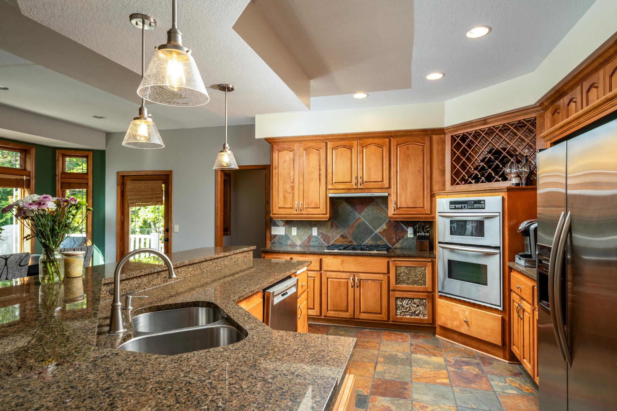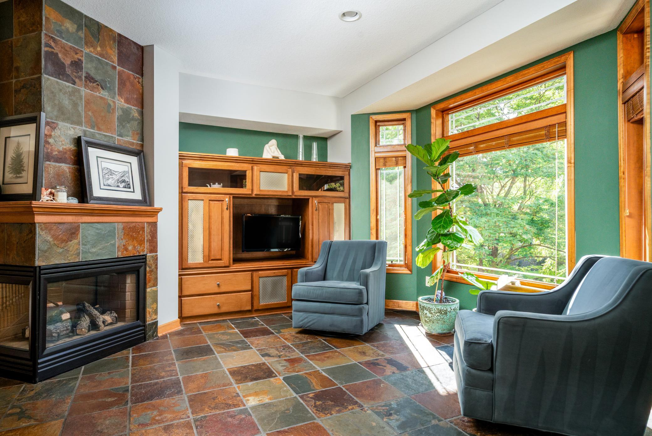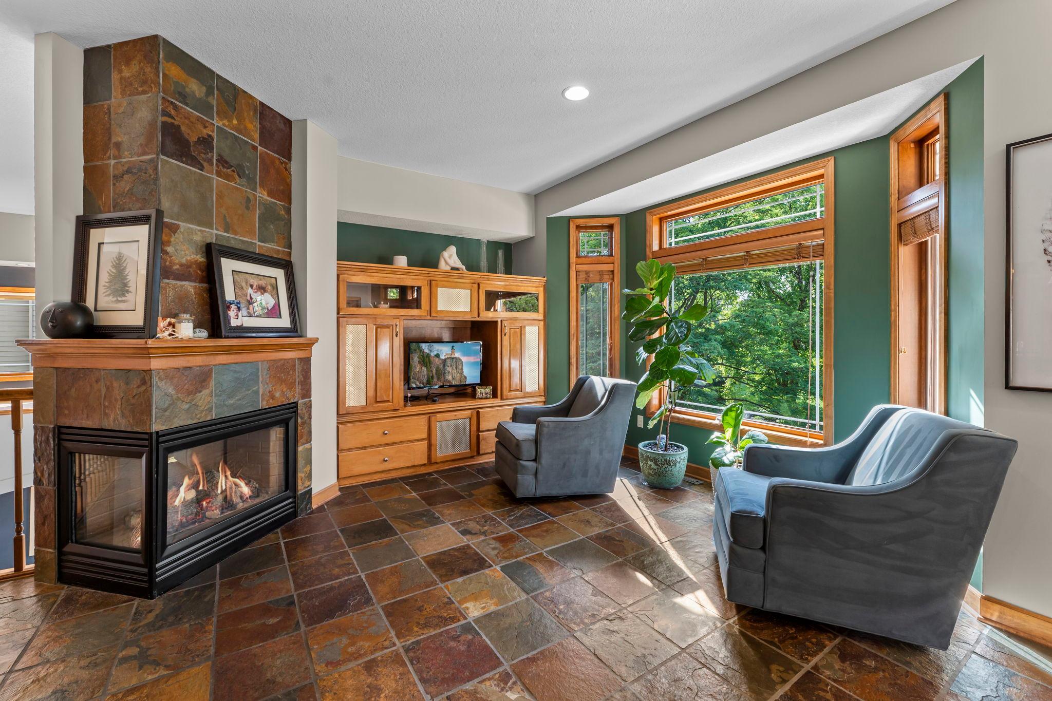 Impressive luxury inside and out! The original owner was the builder, so this quality-built home is loaded with upgrades and unique custom features. Perfectly situated just steps away from 4,900 acres of Elm Creek Park Reserve, which offers amenities for almost every outdoor activity. This home offers both natural beauty and everyday convenience. The exterior boasts gorgeous curb appeal. First thing you will notice besides the beautiful landscaped yard with in-ground sprinkles, is the concrete driveway leading to the 3 car heated garage. An expansive covered front porch greets you to the front door. Inside, the open and inviting layout begins with a two-story slate-floored foyer, and a catwalk that overlooks the 2 story massive lower level family room/great room with floor to ceiling windows and leads you to a cozy hearth area with gas fireplace and informal dining. The spacious kitchen is a true centerpiece with a huge island, granite countertops, under cabinet lighting, stainless steel appliances and adjacent formal dining with new premium carpet. Step outside onto your large maintenance free deck which overlooks the creek that connects two ponds. In the winter, you will find it being used for winter ice skating and hockey. A convenient half bath and laundry room with large walk-in closet complete the main level. New premium carpet leads you upstairs to four spacious bedrooms, a full bath with dual sinks for 3 of the bedrooms to share and at the end of the hall, you will come into the luxury owner’s suite with tray ceilings, an over-sized (HUGE) walk-in closet and a spa-like bath retreat, with jetted soaking tub, walk-in shower and heated floor. The lower level is designed for entertaining! All new LTV flooring, floor to ceiling double-sided fireplace, floor to ceiling windows, two expansive living areas or recreational area, custom wet bar with under cabinet lighting, wine and beverage fridges, another huge bedroom that doubles as an office, a fully renovated full bath in 2024, a three-season hot tub room and storage galore! All newly painted interior in 2025, new roof in 2024, new furnace and A/C in 2022 and new water heater in 2025. Just move in and enjoy!!