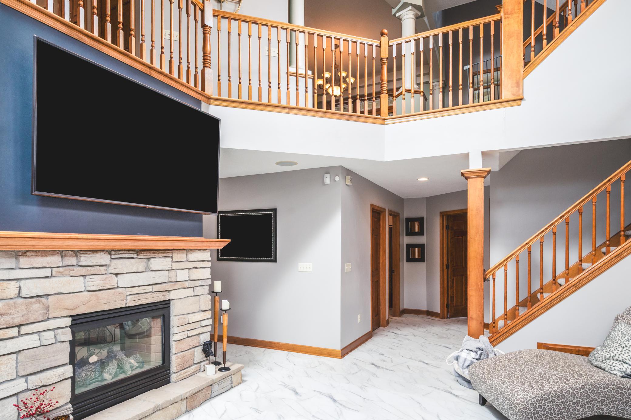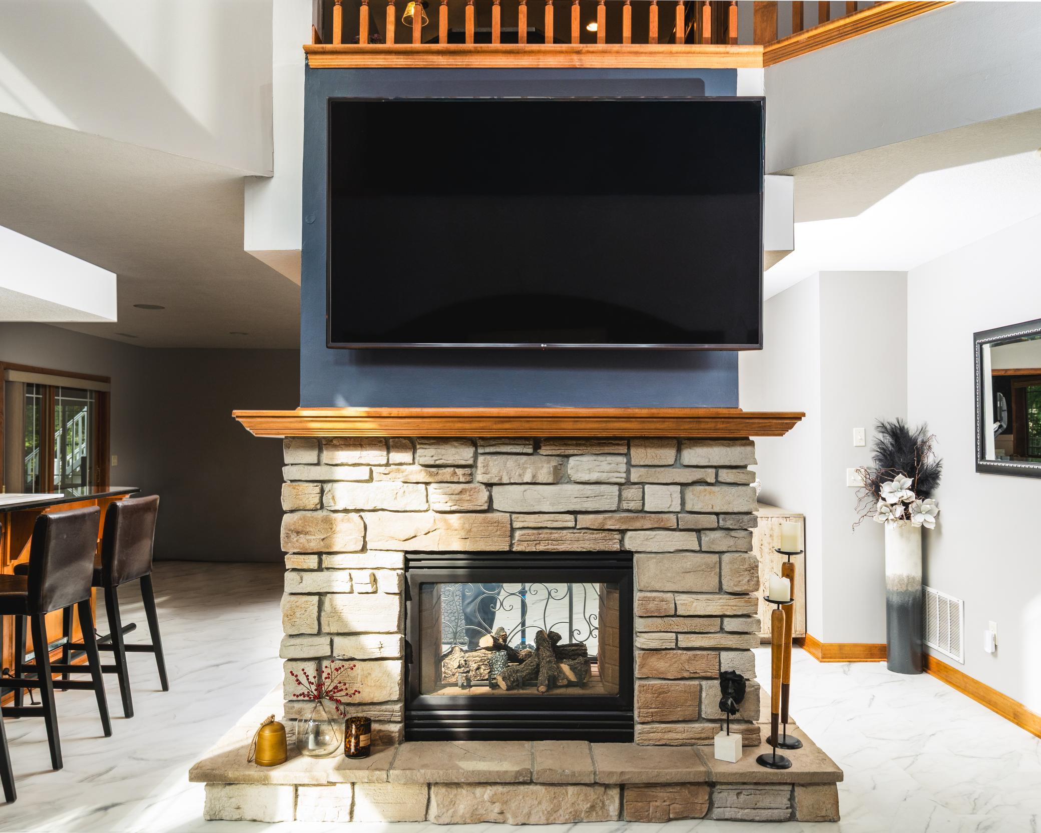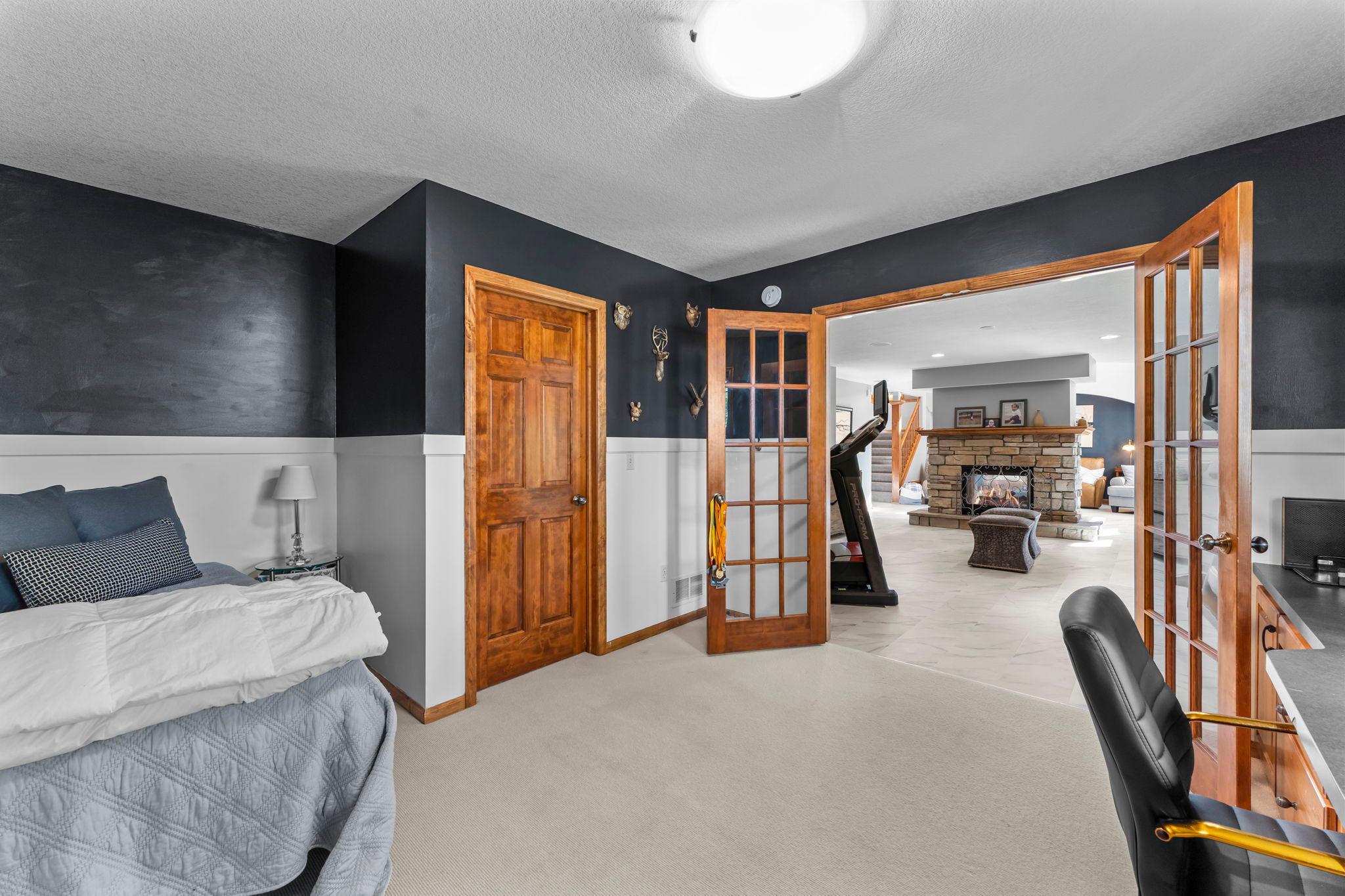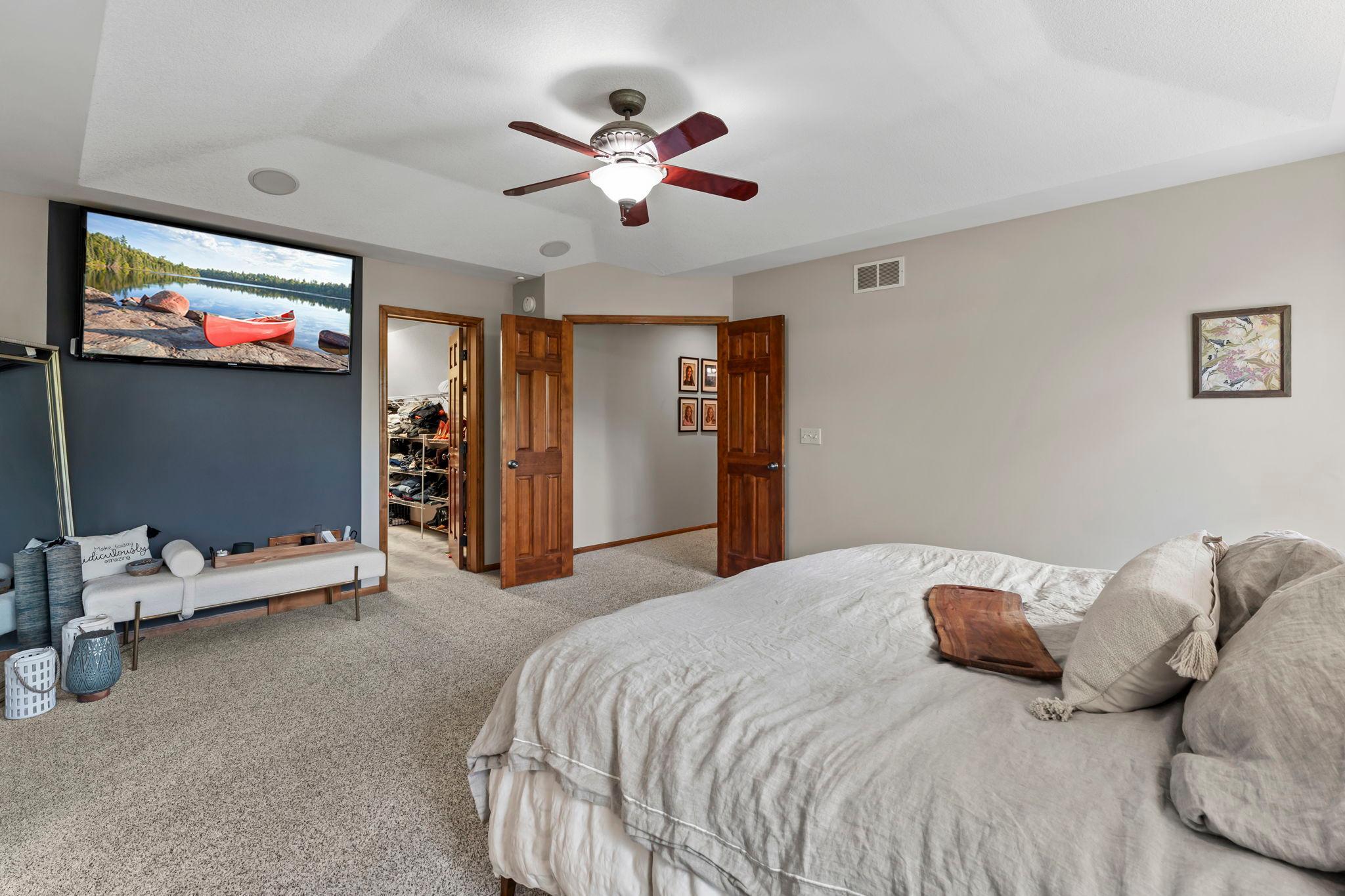 Impressive luxury inside and out! The original owner was the builder, so this quality-built home is loaded with upgrades and unique custom features. Perfectly situated just steps away from 4,900 acres of Elm Creek Park Reserve, which offers amenities for almost every outdoor activity. This home offers both natural beauty and everyday convenience. The exterior boasts gorgeous curb appeal. First thing you will notice besides the beautiful landscaped yard with in-ground sprinkles, is the concrete driveway leading to the 3 car heated garage. An expansive covered front porch greets you to the front door. Inside, the open and inviting layout begins with a two-story slate-floored foyer, and a catwalk that overlooks the 2 story massive lower level family room/great room with floor to ceiling windows and leads you to a cozy hearth area with gas fireplace and informal dining. The spacious kitchen is a true centerpiece with a huge island, granite countertops, under cabinet lighting, stainless steel appliances and adjacent formal dining with new premium carpet. Step outside onto your large maintenance free deck which overlooks the creek that connects two ponds. In the winter, you will find it being used for winter ice skating and hockey. A convenient half bath and laundry room with large walk-in closet complete the main level. New premium carpet leads you upstairs to four spacious bedrooms, a full bath with dual sinks for 3 of the bedrooms to share and at the end of the hall, you will come into the luxury owner’s suite with tray ceilings, an over-sized (HUGE) walk-in closet and a spa-like bath retreat, with jetted soaking tub, walk-in shower and heated floor. The lower level is designed for entertaining! All new LTV flooring, floor to ceiling double-sided fireplace, floor to ceiling windows, two expansive living areas or recreational area, custom wet bar with under cabinet lighting, wine and beverage fridges, another huge bedroom that doubles as an office, a fully renovated full bath in 2024, a three-season hot tub room and storage galore! All newly painted interior in 2025, new roof in 2024, new furnace and A/C in 2022 and new water heater in 2025. Just move in and enjoy!!