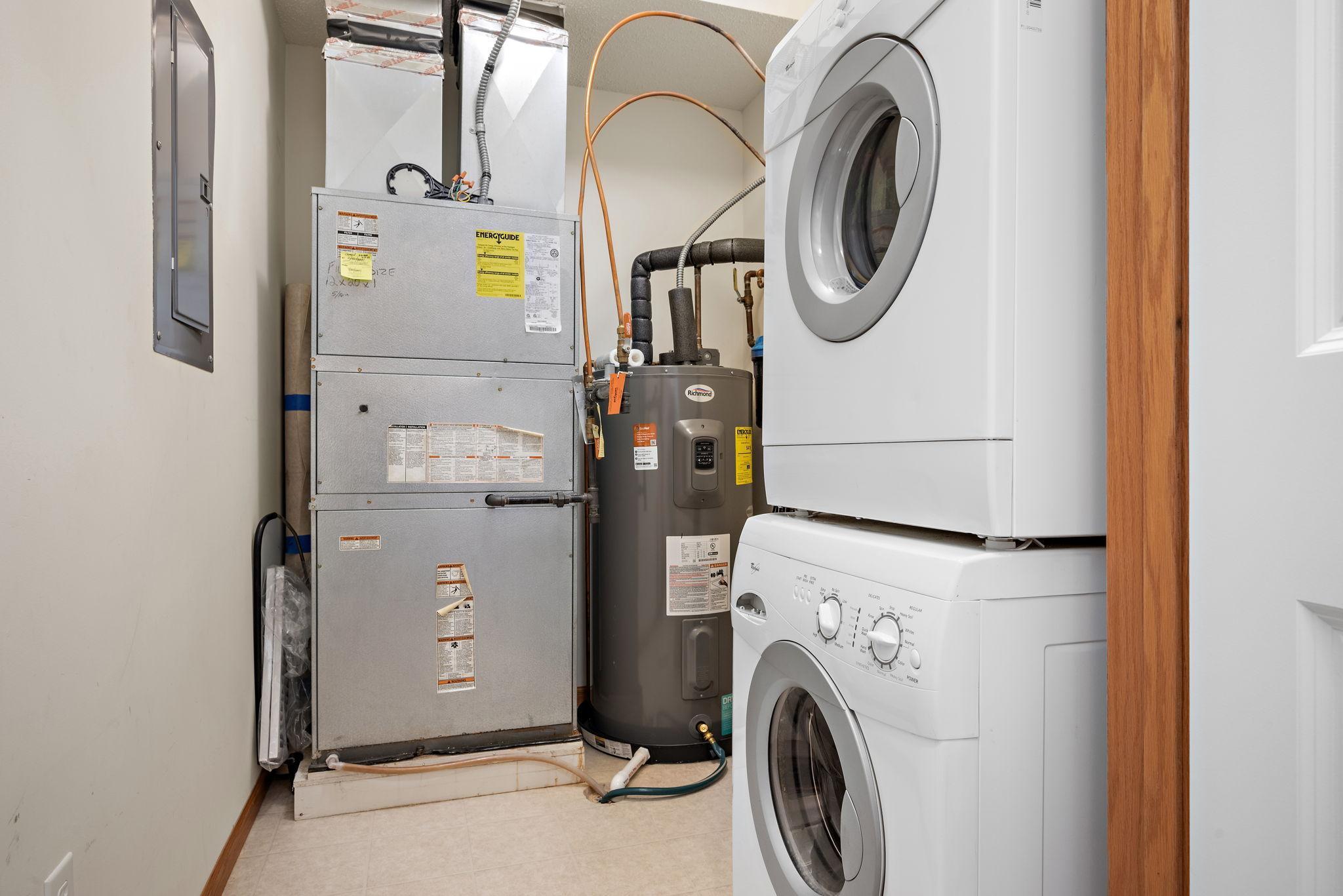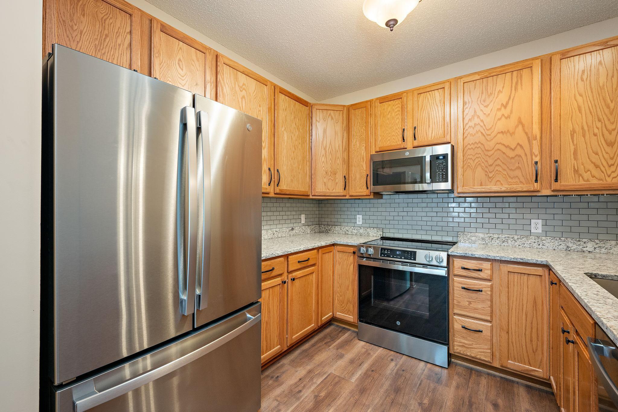 Welcome to this move-in condition 3-bedroom, 2-bathroom condo in Eden Prairie's Williams Place community. This spacious, one level 2nd floor unit offers a practical, open layout with wide doorways and high ceilings, combining the feel of single-family living with all the conveniences of condo life. New in 2025 are LVP flooring, kitchen counters, backsplash, and stainless appliances. The primary includes an ensuite bath and walk-in closet. Two additional bedrooms, one with WIC, provide flexibility for a home office or guests. Natural light pours in through south and west-facing windows. Cozy up by the gas-burning fireplace in the living area. Enjoy the peace and serenity of a covered balcony surrounded by beautiful flowering trees. This unit also includes two heated garage tandem parking spaces and ample storage 6x3 locked storage in the heated garage, conveniently located near the elevator. You'll enjoy quick access to Eden Prairie Center, major highways, and scenic trails.
