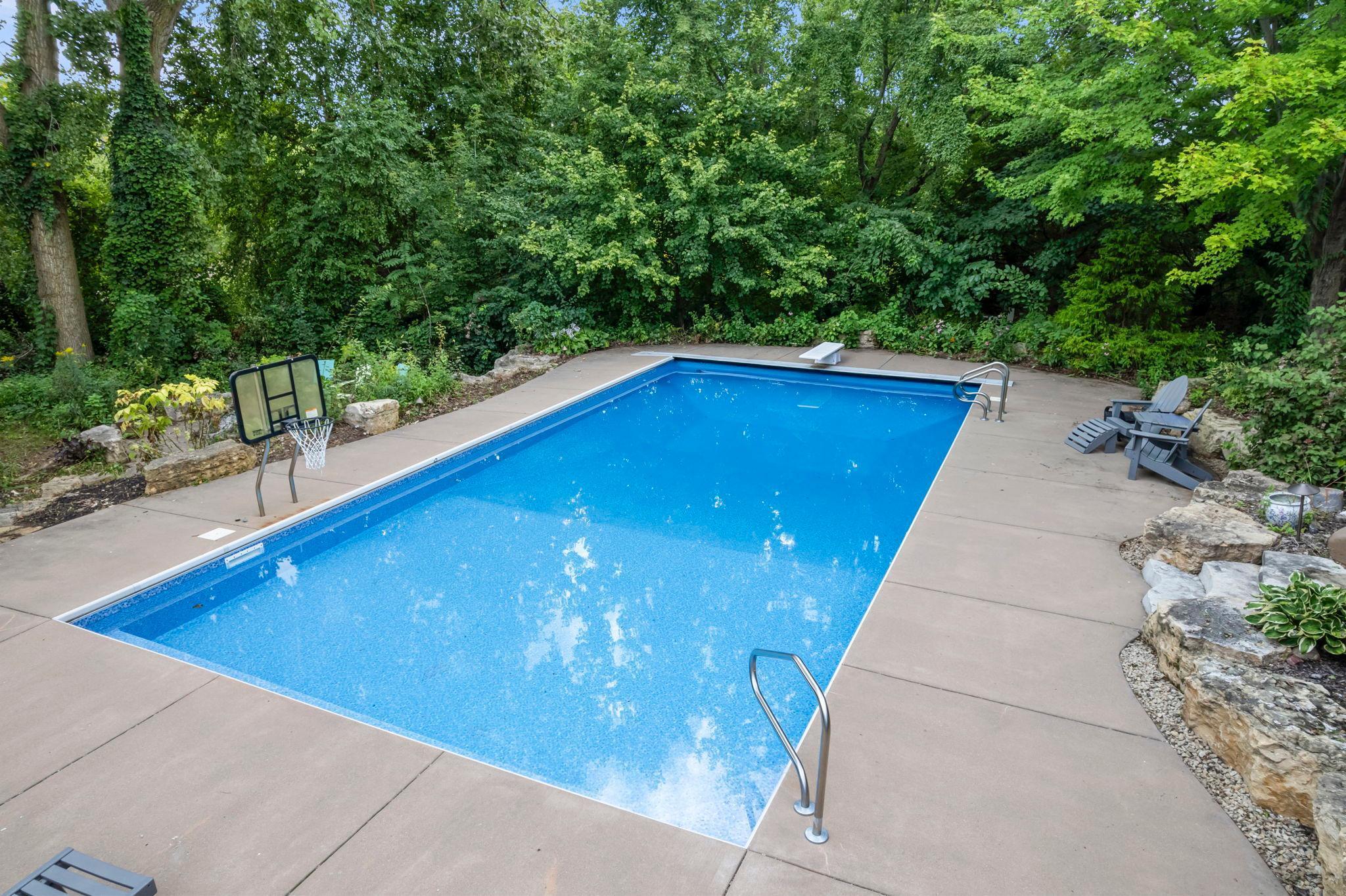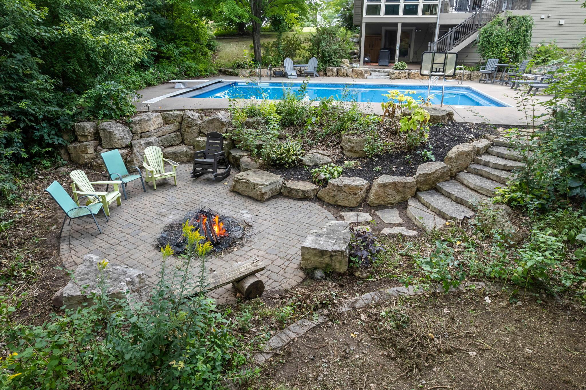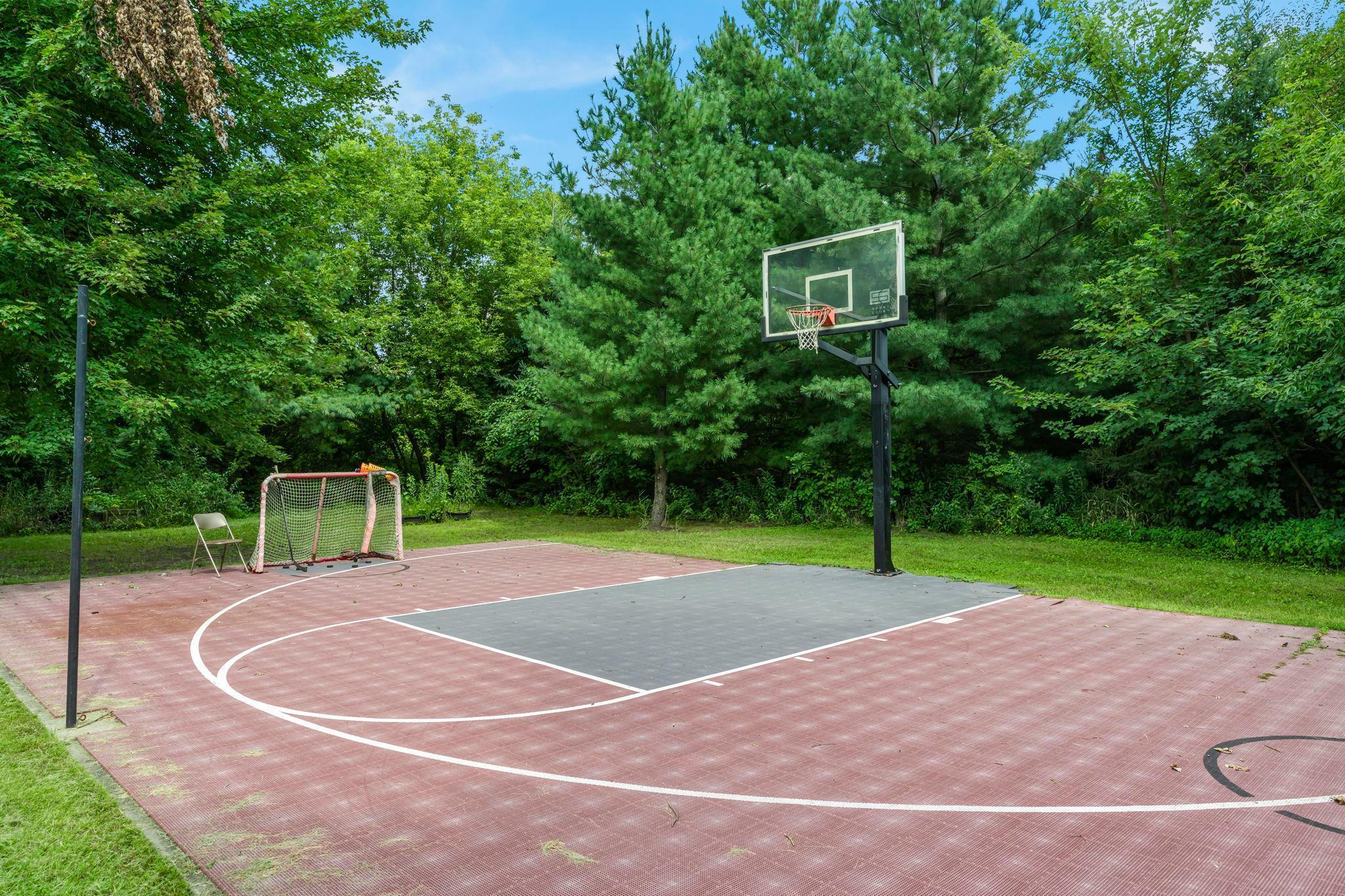 Welcome to a home that combines elegance, comfort, and incredible outdoor living. Set on 3+ private acres near Stonebrooke Golf Club, this 4-bedroom, 4-bath residence offers a backyard retreat with a heated saltwater pool, sport court, firepit, and maintenance-free deck—perfect for entertaining or relaxing in style. Inside, a two-story foyer with hardwood floors opens to a sun-filled living room with a gas fireplace, a main floor office, and a three-season porch. The gourmet kitchen features hickory cabinets, granite counters, stainless steel appliances, and an adjacent laundry/mud room with custom cabinetry. Upstairs, you’ll find spacious bedrooms with walk-in closets and heated tile floors in all baths, including the serene primary suite with its own fireplace. The walk-out lower level expands your living space with a large family room featuring a stone fireplace, custom built-ins, and a 4th bedroom with an ensuite bath. This is the perfect blend of privacy, space, and high-end living.