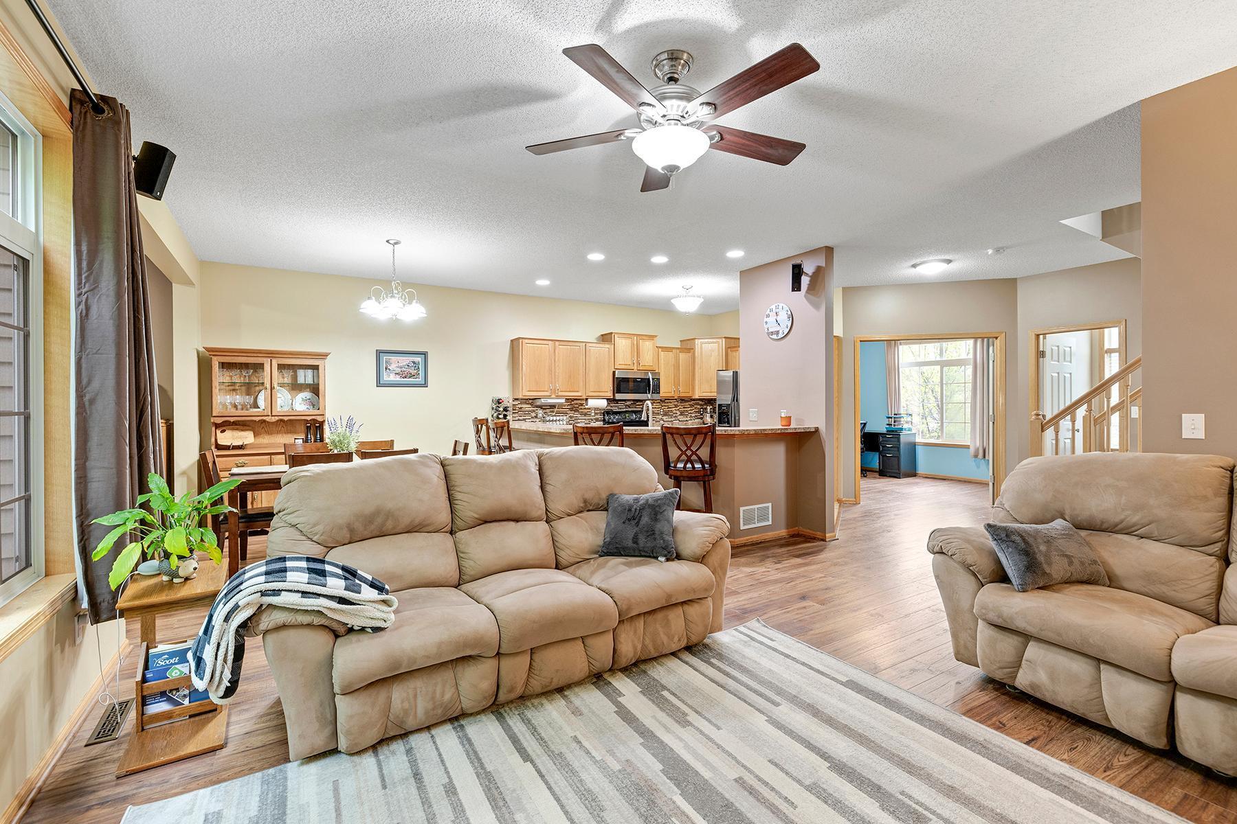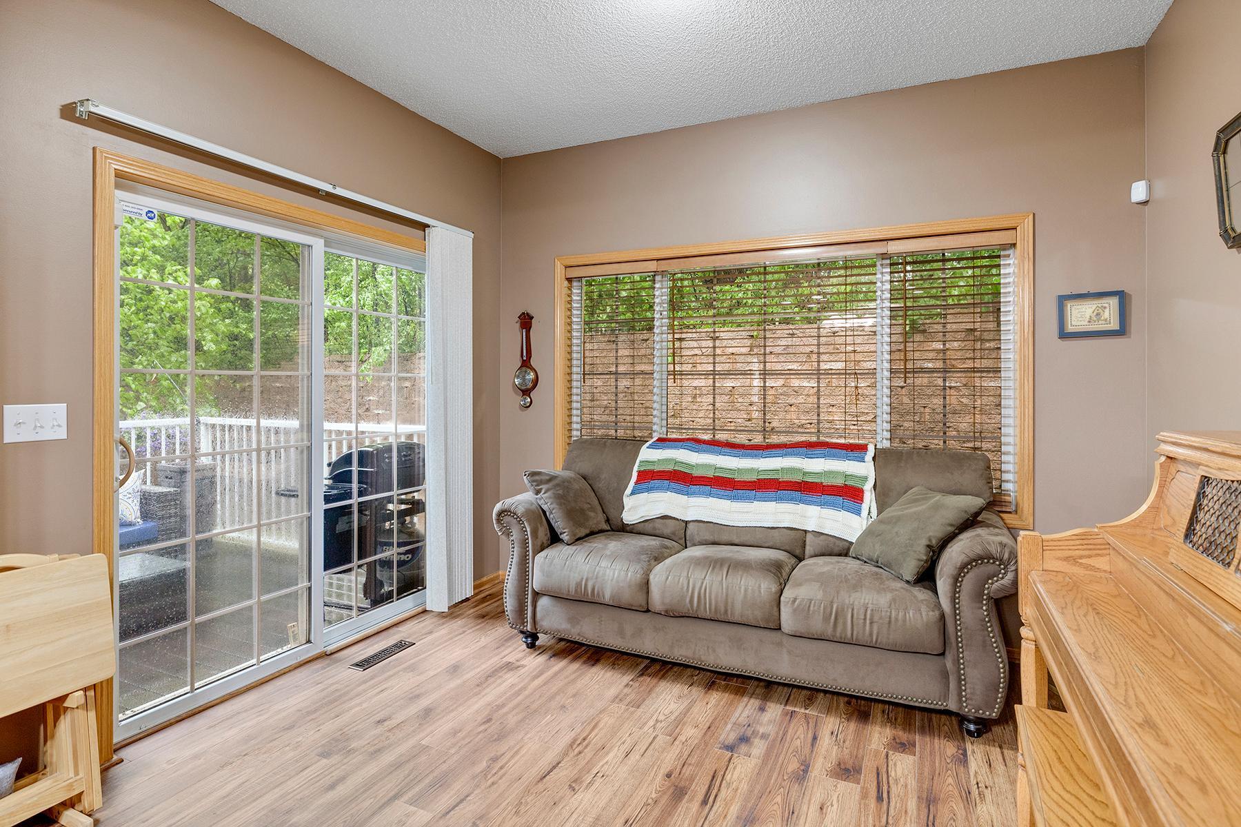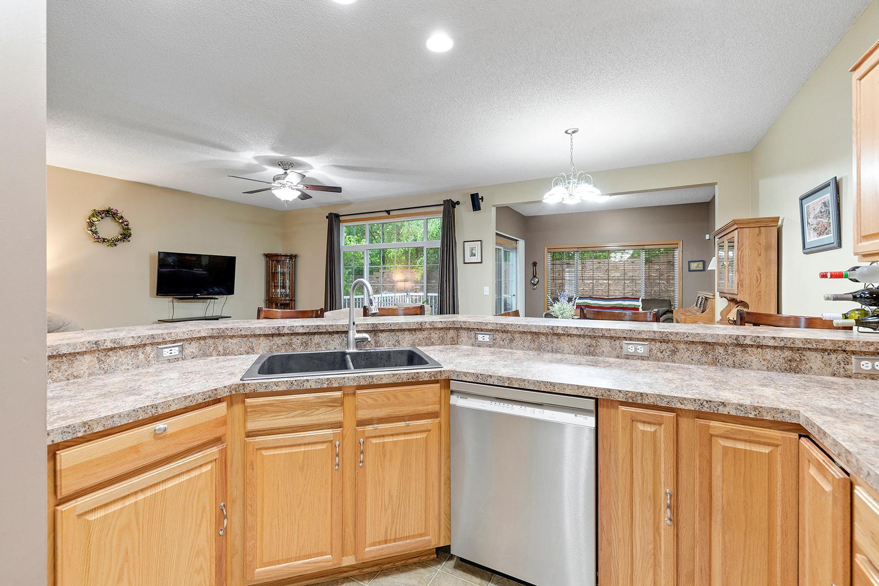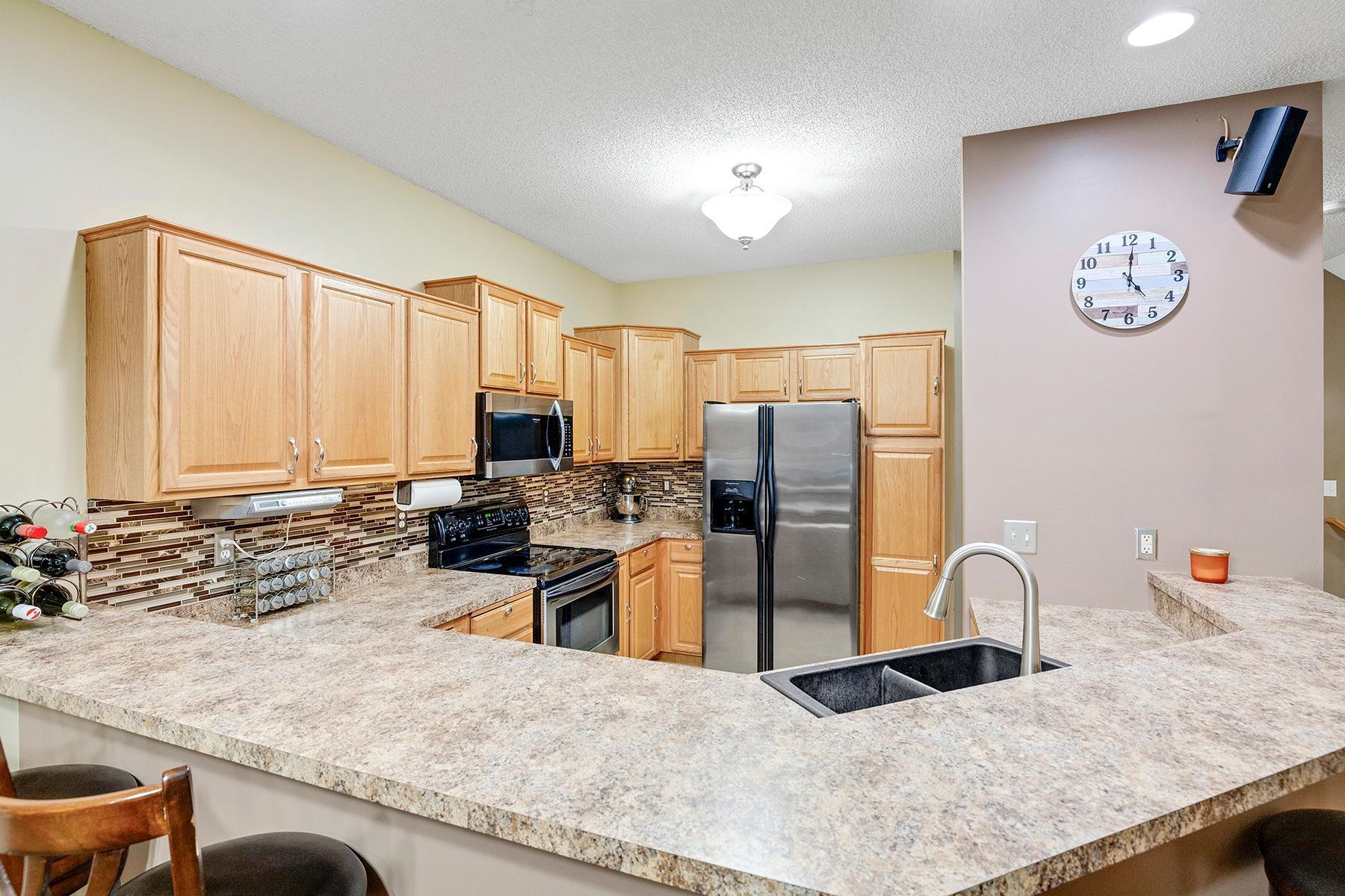 This stunning end-unit townhome offers privacy and natural beauty, backing up to serene woods and featuring front-to-back windows that fill the home with light. The open-concept main level includes hardwood floors throughout the living areas, a bright sunroom with peaceful wooded views, and a spacious kitchen that flows into the living room—perfect for entertaining. The kitchen includes quality appliances, a walk-in pantry, and access to the deck. You'll also find a convenient main-level office. Upstairs, the primary suite features a private bath, along with a second bedroom, full bath, and laundry. The finished lower level is currently used as a family room with a wet bar but could easily function as a third bedroom with its own 3/4 bath. Recent updates include new toilets (2021), CO2/smoke detectors on each level (2021), bedroom smoke detectors (2021), a new furnace and A/C (2022), water heater and softener (2023), and a new dishwasher (2024). Carpets were professionally cleaned in 2025, and the home has been meticulously maintained with annual servicing of HVAC, electric, and plumbing systems by On Time Service Pros. Located in a highly convenient area close to shopping, restaurants, and major freeways, and served by the sought-after Prior Lake schools. Move-in ready with thoughtful upgrades throughout!