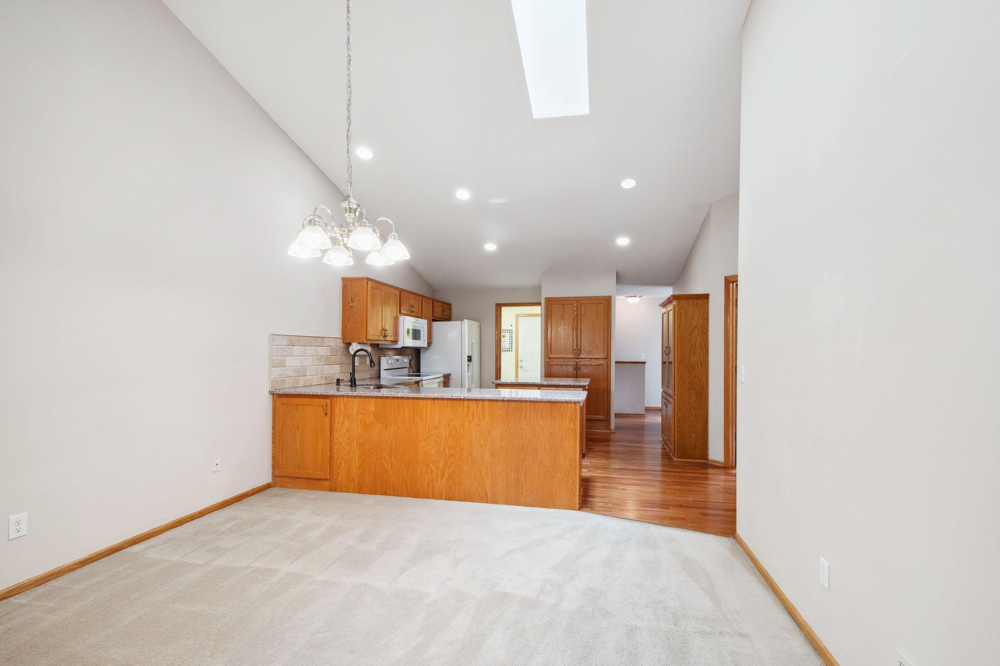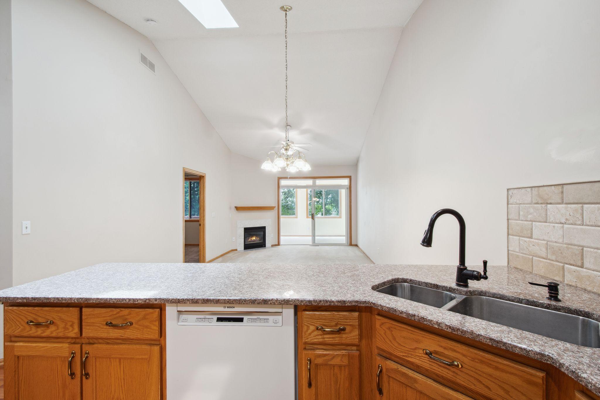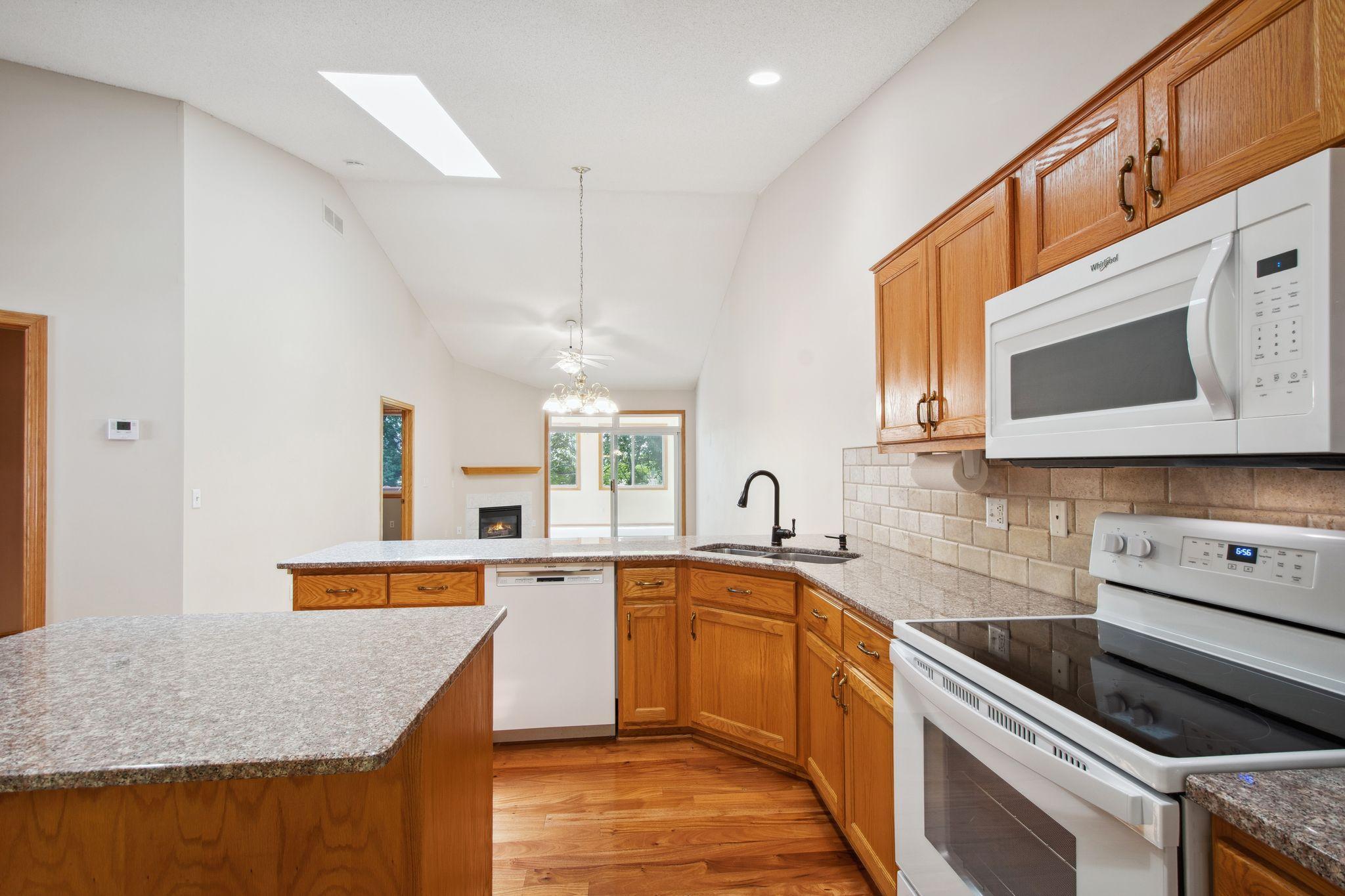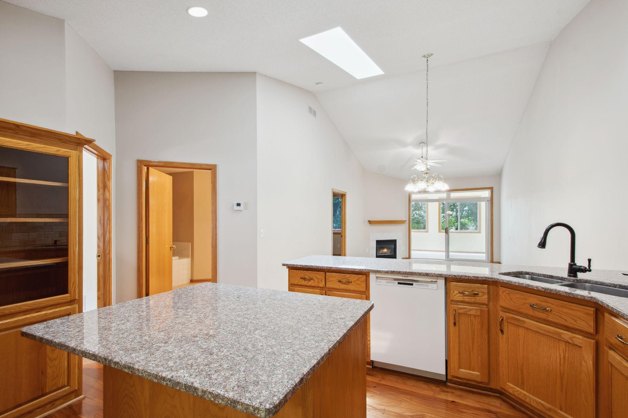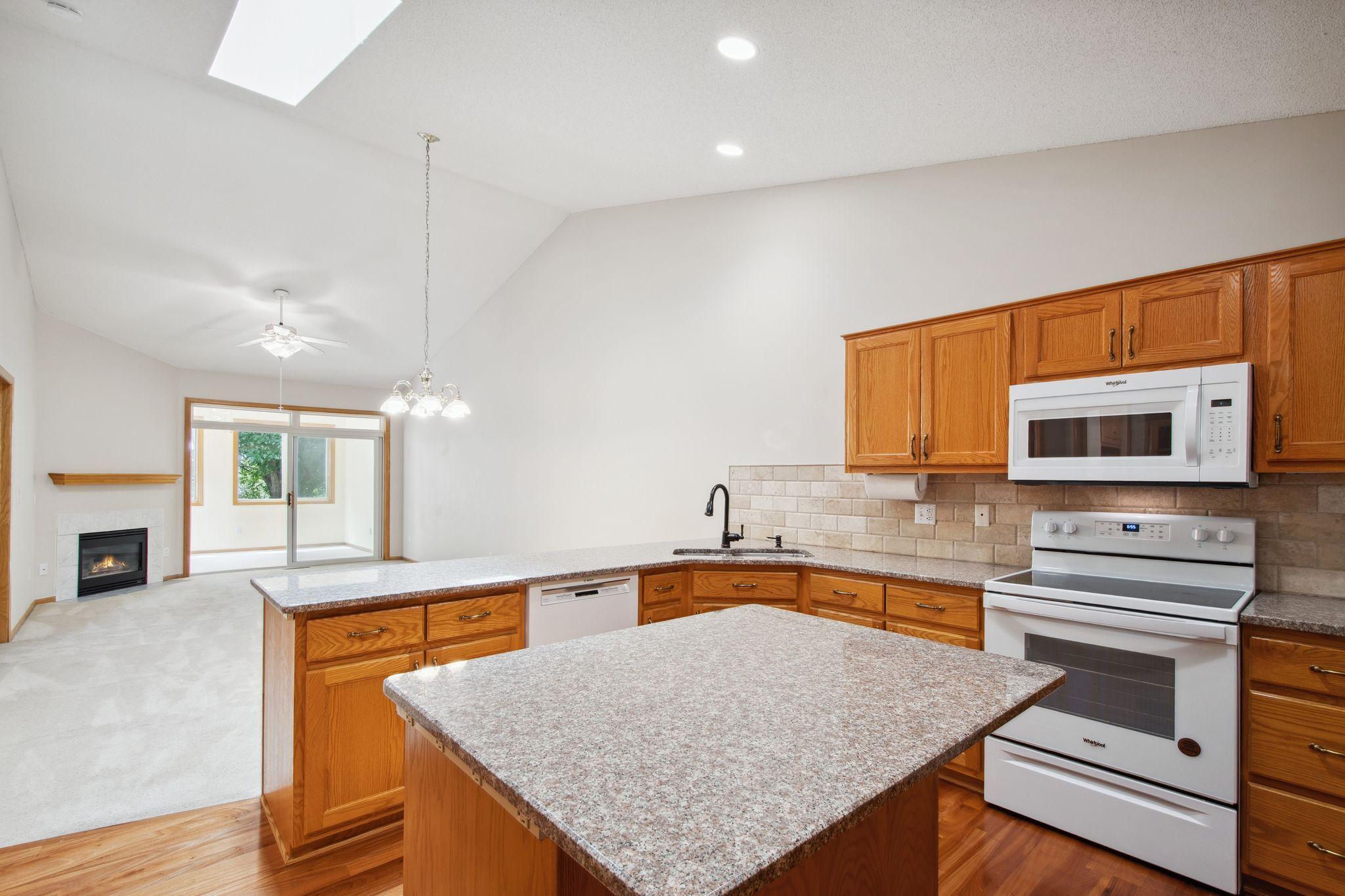 Welcome to this beautifully designed one-level, 3-bedroom, 2-bathroom townhome with a walkout basement, offering a perfect blend of comfort, style, and natural surroundings. This home features an inviting layout, with thoughtful upgrades throughout. The kitchen is both functional and charming, with hardwood floors, granite countertops, and built-in hutches, ideal for storage and display. The open-concept living area boasts vaulted ceilings and a skylight, filling the space with natural light. Relax year-round in the four-season porch, or step out onto the private deck (stained in 2025) overlooking a beautiful wooded area-a perfect spot for morning coffee or evening gatherings. The main-floor laundry adds everyday convenience, while the walkout basement offers additional living space and endless possibilities-family room, guest suite, office, or hobby area and a large space for storage. Updates include: garage door opener w/camera (2022), smoke alarms hard wired (2023), stove (2023), refrigerator (2021) and lower level tub to walk-in shower (2023). Don't miss this rare opportunity to own a move-in ready townhome, in a peaceful setting that feels like a retreat, yet is close to everything. Check out this wonderful home that is ready for your memories!