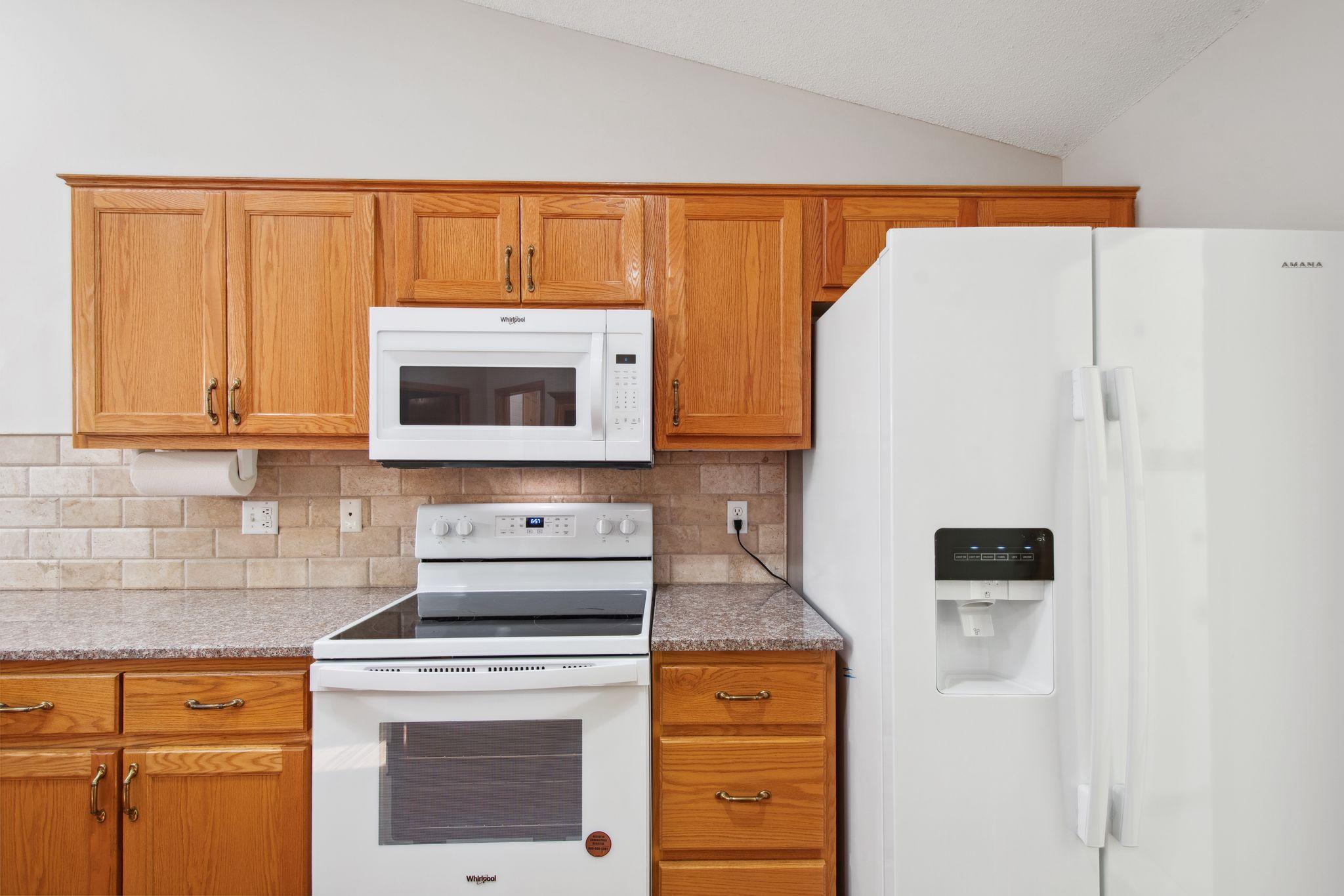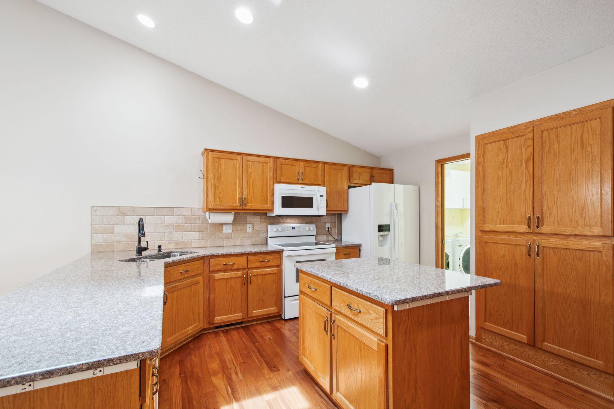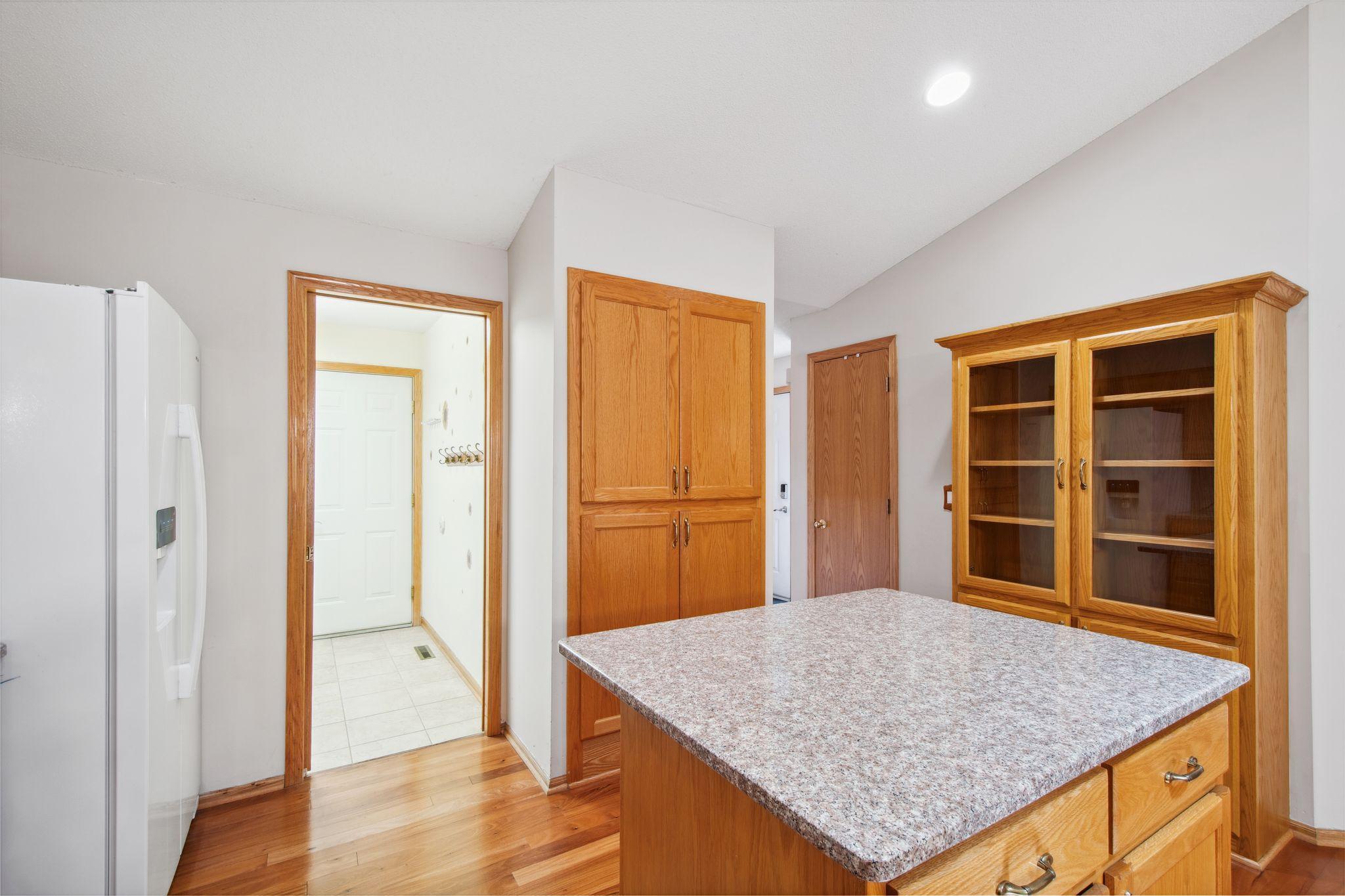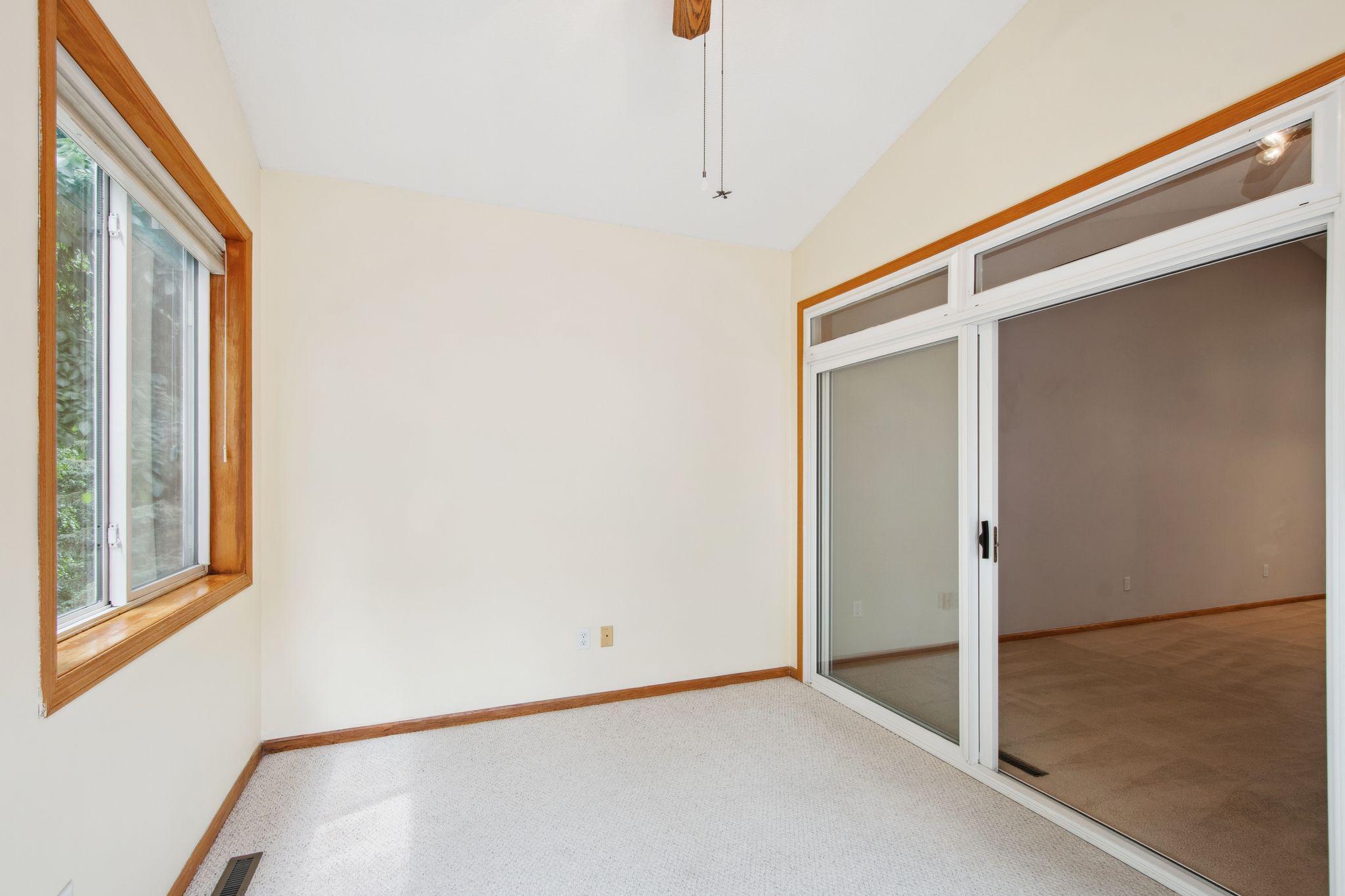 Welcome to this beautifully designed one-level, 3-bedroom, 2-bathroom townhome with a walkout basement, offering a perfect blend of comfort, style, and natural surroundings. This home features an inviting layout, with thoughtful upgrades throughout. The kitchen is both functional and charming, with hardwood floors, granite countertops, and built-in hutches, ideal for storage and display. The open-concept living area boasts vaulted ceilings and a skylight, filling the space with natural light. Relax year-round in the four-season porch, or step out onto the private deck (stained in 2025) overlooking a beautiful wooded area-a perfect spot for morning coffee or evening gatherings. The main-floor laundry adds everyday convenience, while the walkout basement offers additional living space and endless possibilities-family room, guest suite, office, or hobby area and a large space for storage. Updates include: garage door opener w/camera (2022), smoke alarms hard wired (2023), stove (2023), refrigerator (2021) and lower level tub to walk-in shower (2023). Don't miss this rare opportunity to own a move-in ready townhome, in a peaceful setting that feels like a retreat, yet is close to everything. Check out this wonderful home that is ready for your memories!