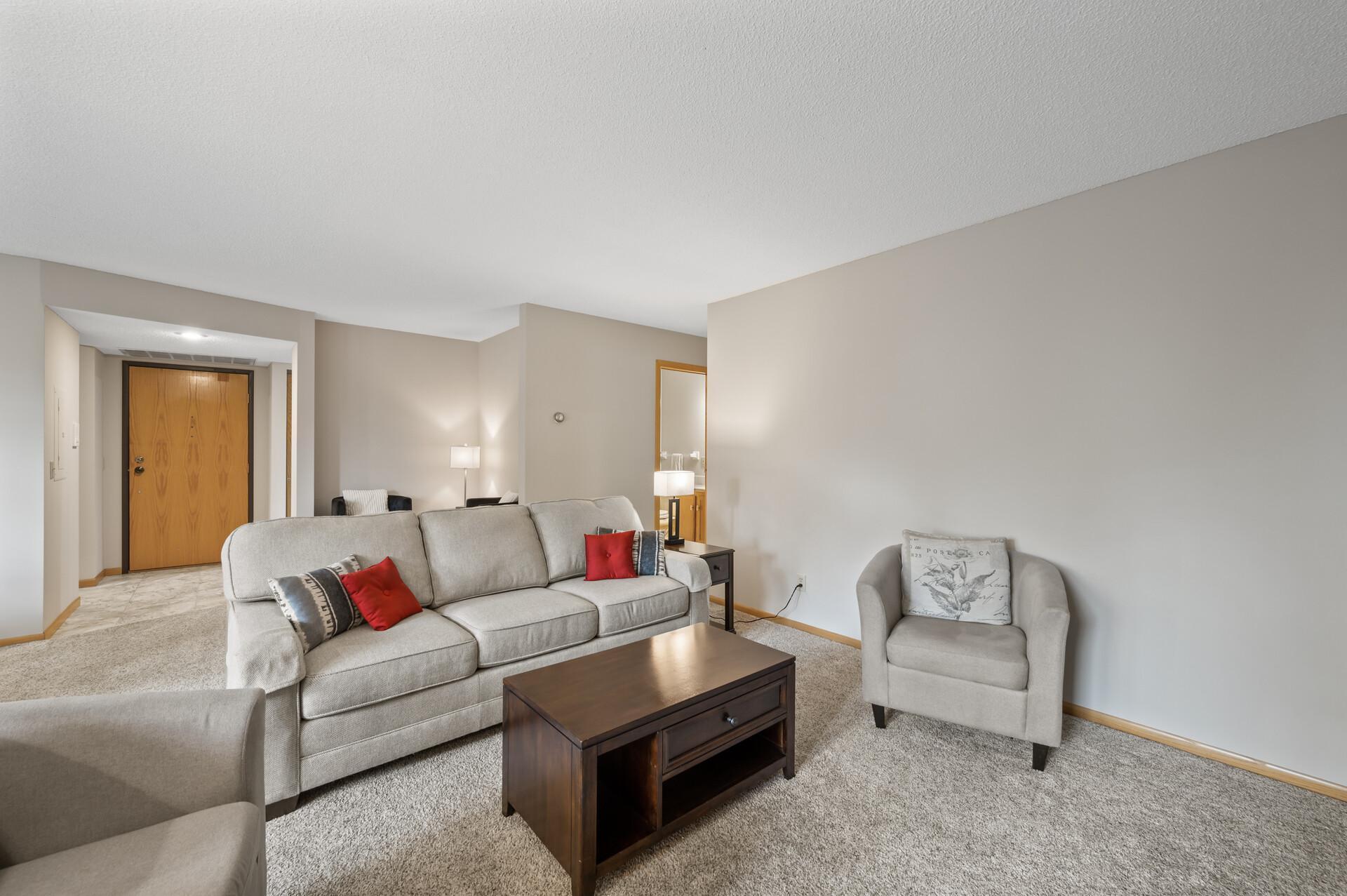 Move-in ready 2BR/2BA one-level condo in the heart of downtown Rosemount. Freshly painted and professionally cleaned carpets make it easy to settle right in. Spacious layout with tons of in-unit storage, plus assigned underground parking and a dedicated storage unit. Convenient elevator access, quick close possible, and centrally located near shopping, dining, and transit. A great opportunity for easy living in a prime location!