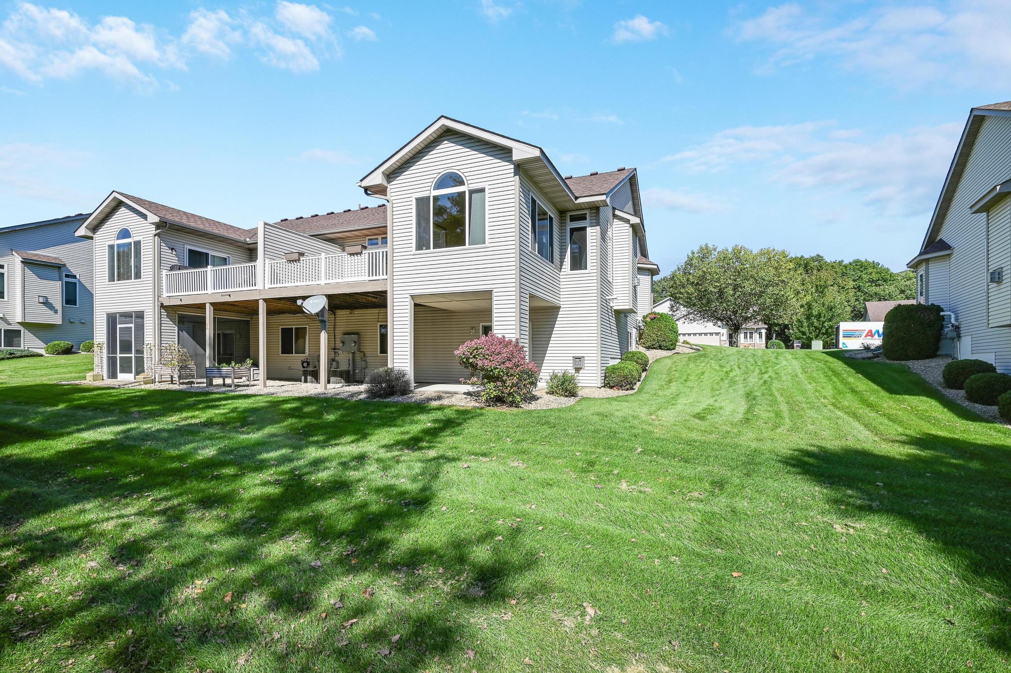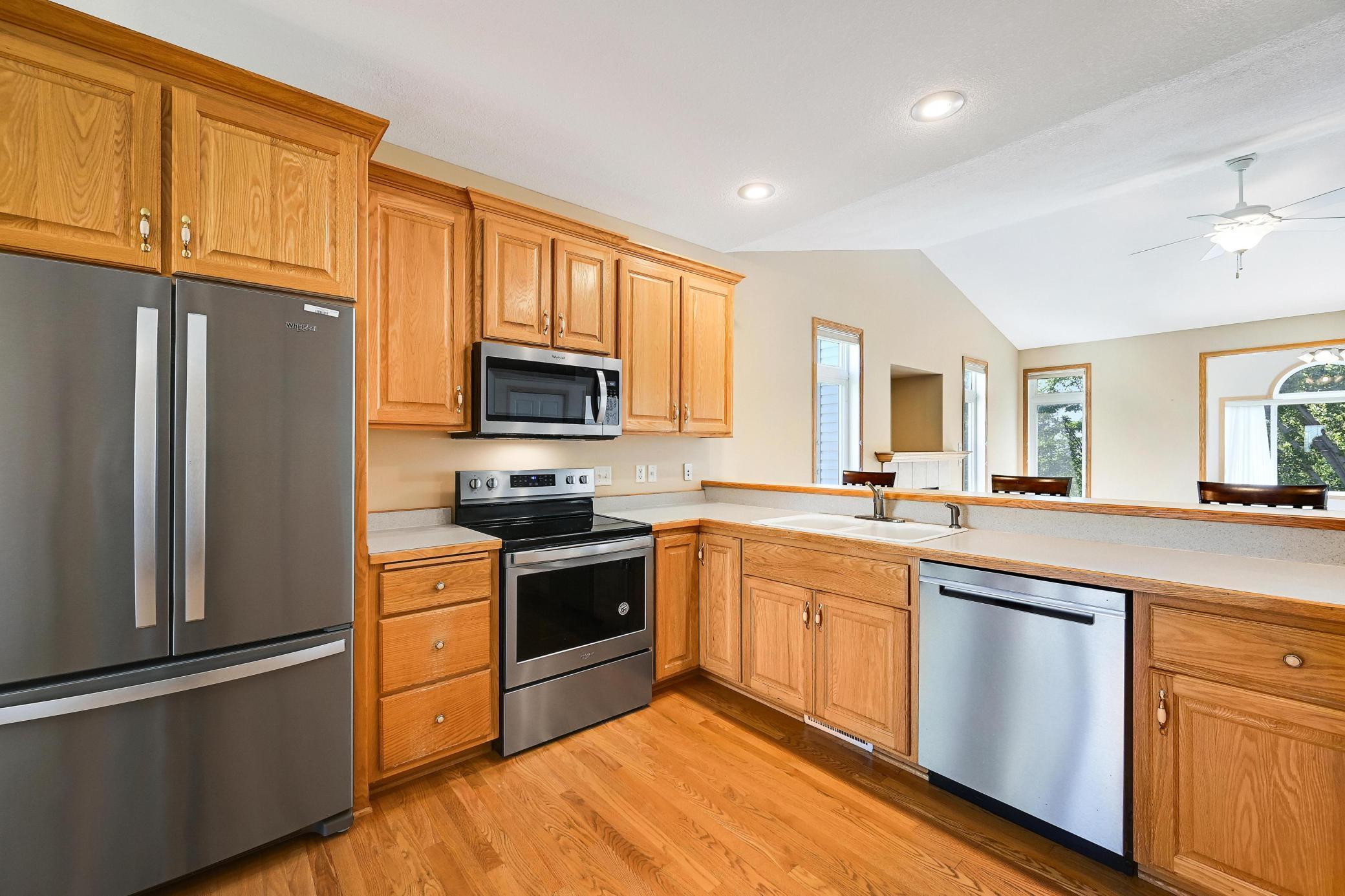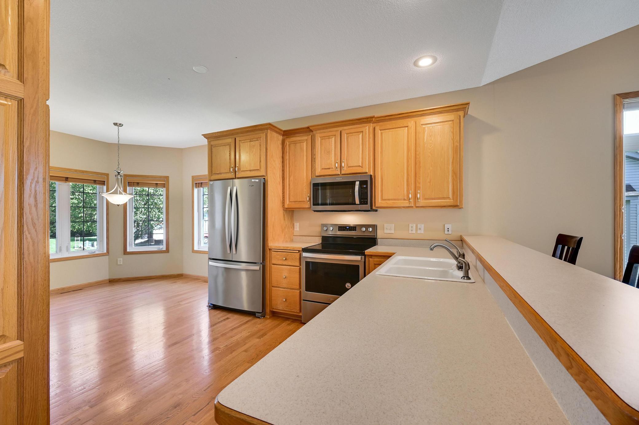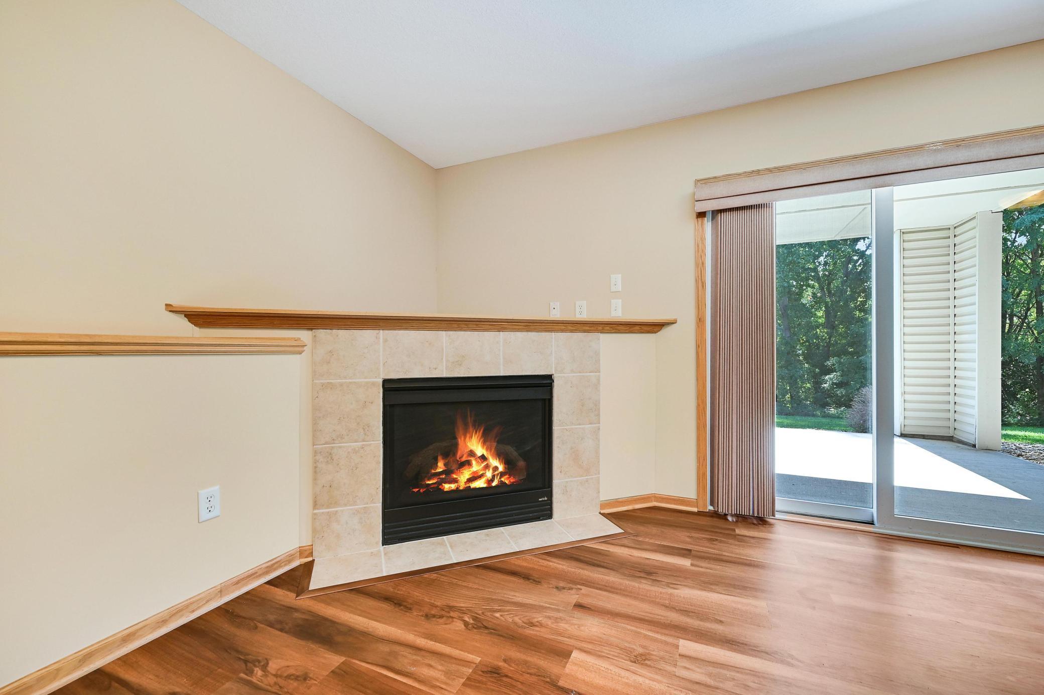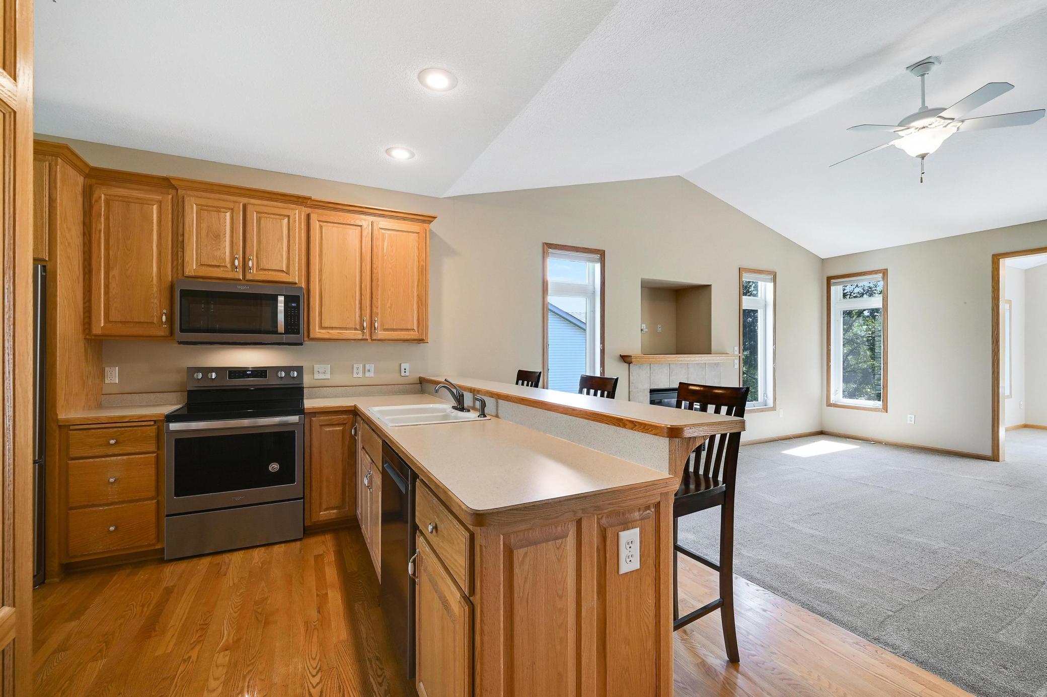 This lovely one level walkout twin home has been beautifully updated by current homeowner. The open floor plan starts with a charming breakfast nook surrounded by windows. The nicely updated kitchen has new Whirlpool stainless steel appliances and custom-built pull-outs in the cabinets and pantry areas. There is an eat-at breakfast ledge as well as another dining area. Spacious living room has a cozy gas fireplace surrounded by windows. Sun-filled 4 season porch and a large deck both have a southern exposure that overlooks a pond and trees. The adjacent City park land has trails that attach to Bunker Hills Regional Park. Main level primary bedroom has new flooring along with an ensuite and two closets, one is a walk-in. Convenient main floor laundry. Full walk-out lower level has a multi-purpose family room with a gas fireplace, plumbing for a wet bar, along with newer low-maintenance flooring. There are two additional bedrooms, a full bath, and tons of storage cabinets. The attached garage has built-in storage cabinets and a work bench. High demand area. See attached list of updates.