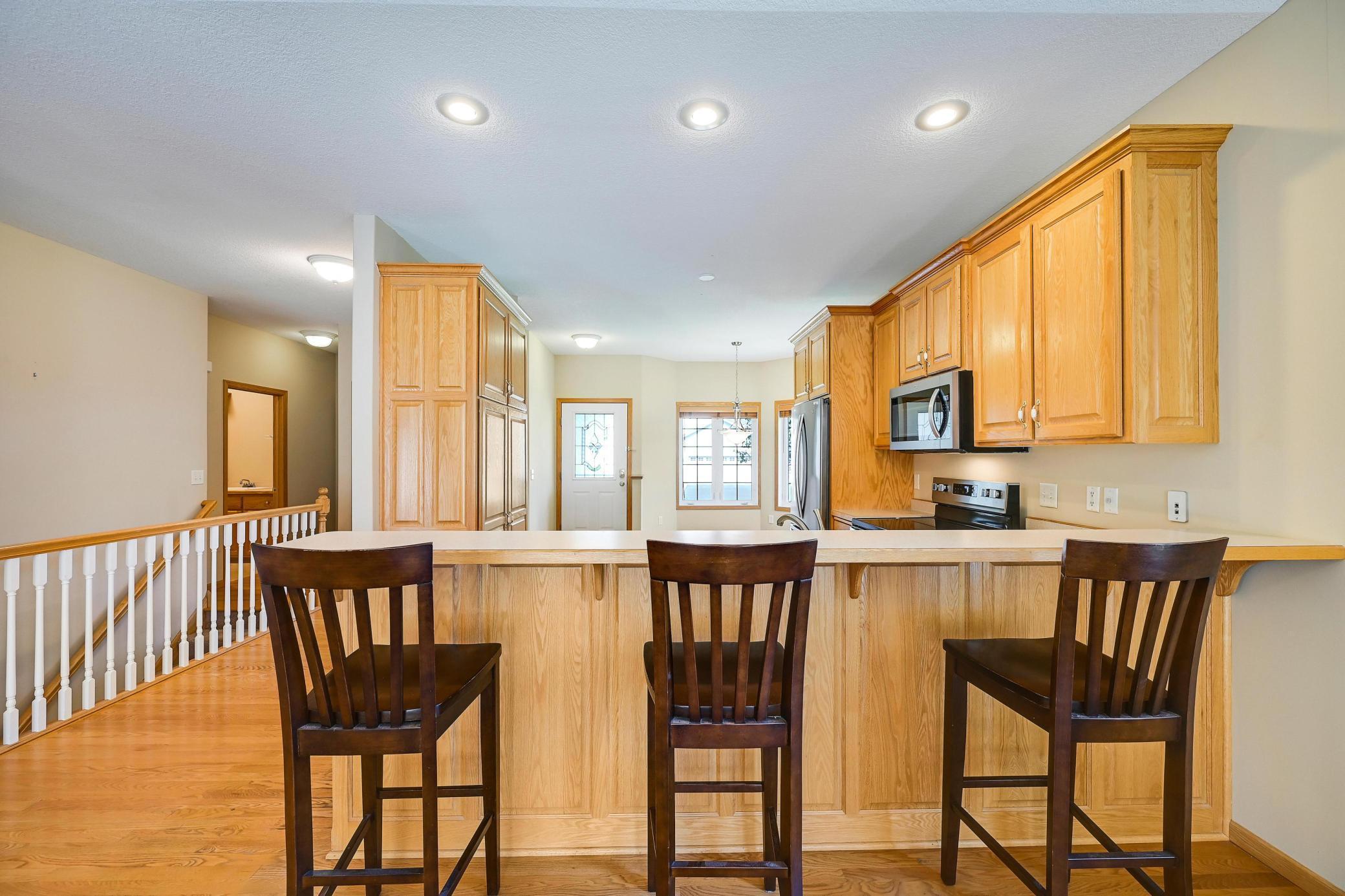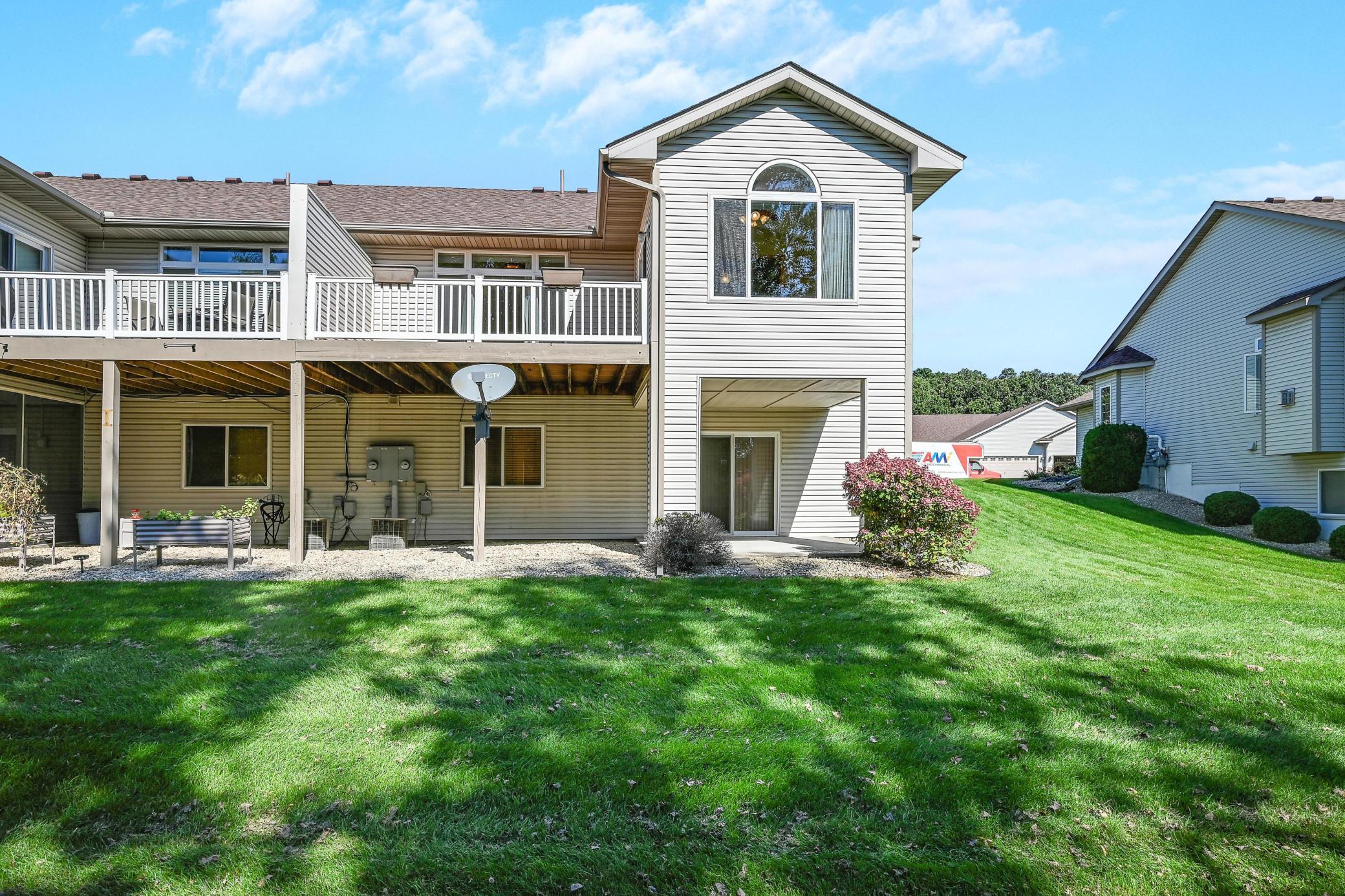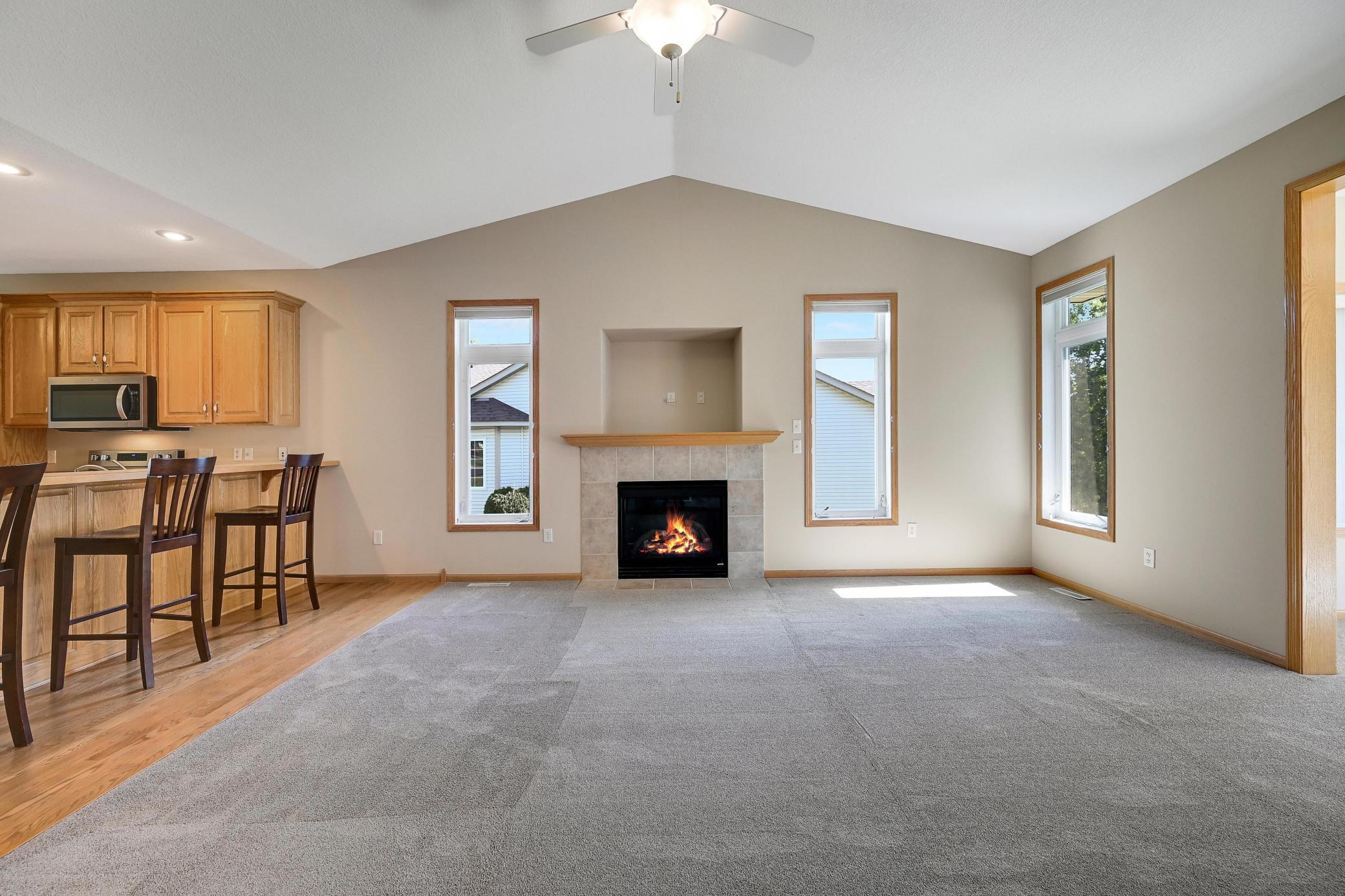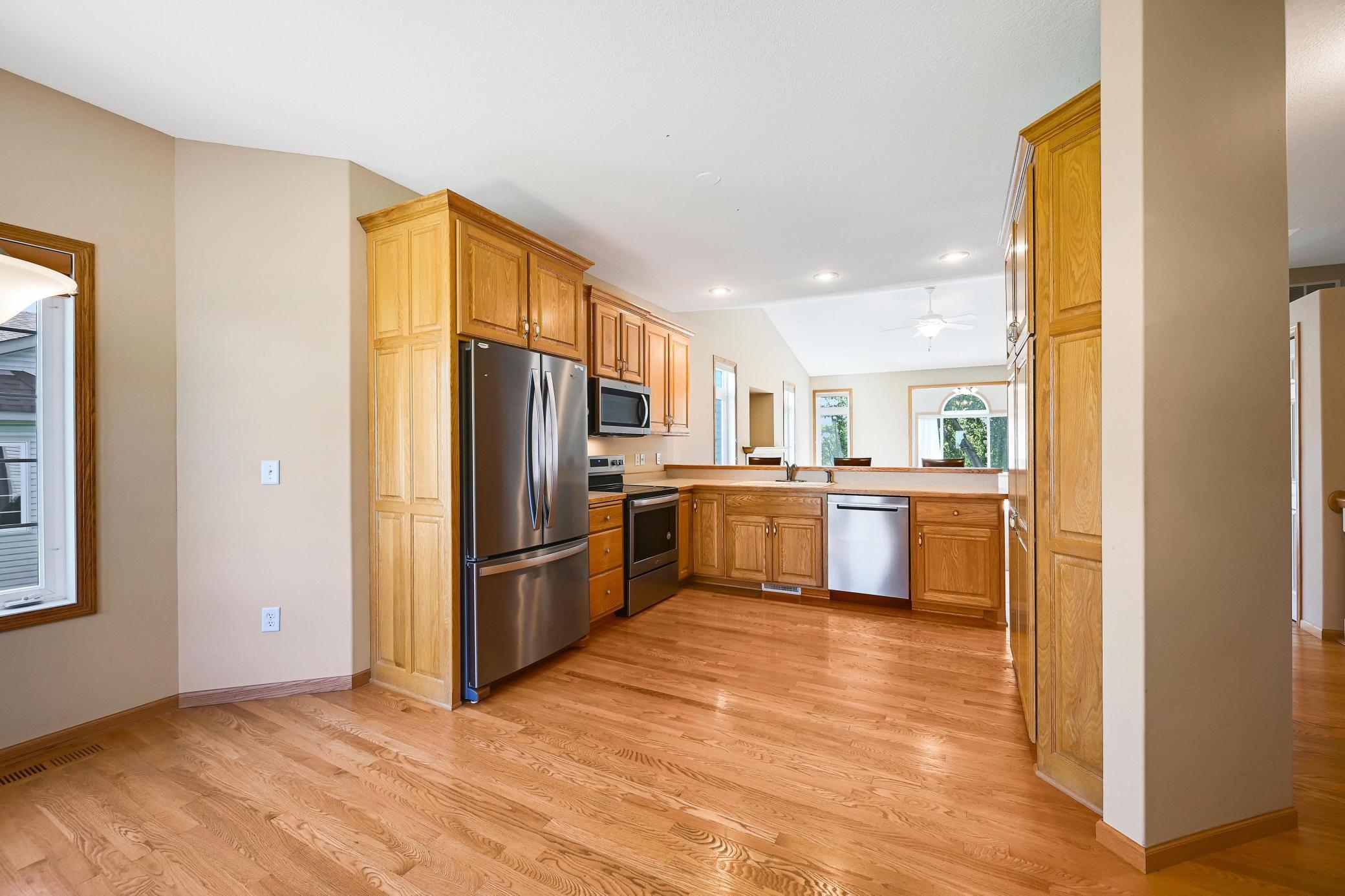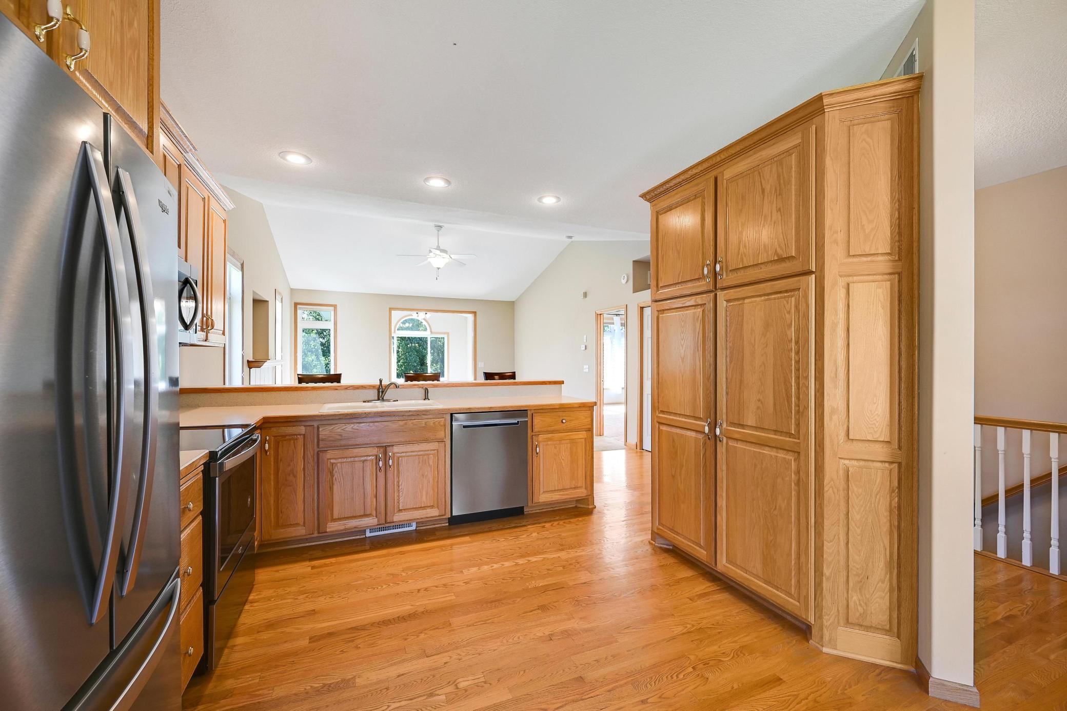 This lovely one level walkout twin home has been beautifully updated by current homeowner. The open floor plan starts with a charming breakfast nook surrounded by windows. The nicely updated kitchen has new Whirlpool stainless steel appliances and custom-built pull-outs in the cabinets and pantry areas. There is an eat-at breakfast ledge as well as another dining area. Spacious living room has a cozy gas fireplace surrounded by windows. Sun-filled 4 season porch and a large deck both have a southern exposure that overlooks a pond and trees. The adjacent City park land has trails that attach to Bunker Hills Regional Park. Main level primary bedroom has new flooring along with an ensuite and two closets, one is a walk-in. Convenient main floor laundry. Full walk-out lower level has a multi-purpose family room with a gas fireplace, plumbing for a wet bar, along with newer low-maintenance flooring. There are two additional bedrooms, a full bath, and tons of storage cabinets. The attached garage has built-in storage cabinets and a work bench. High demand area. See attached list of updates.