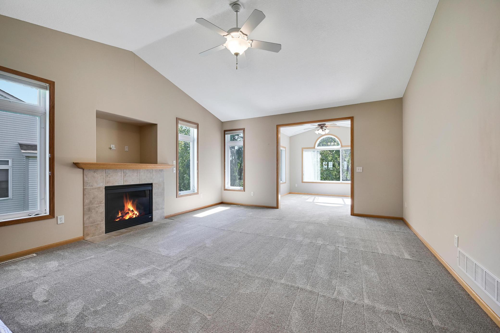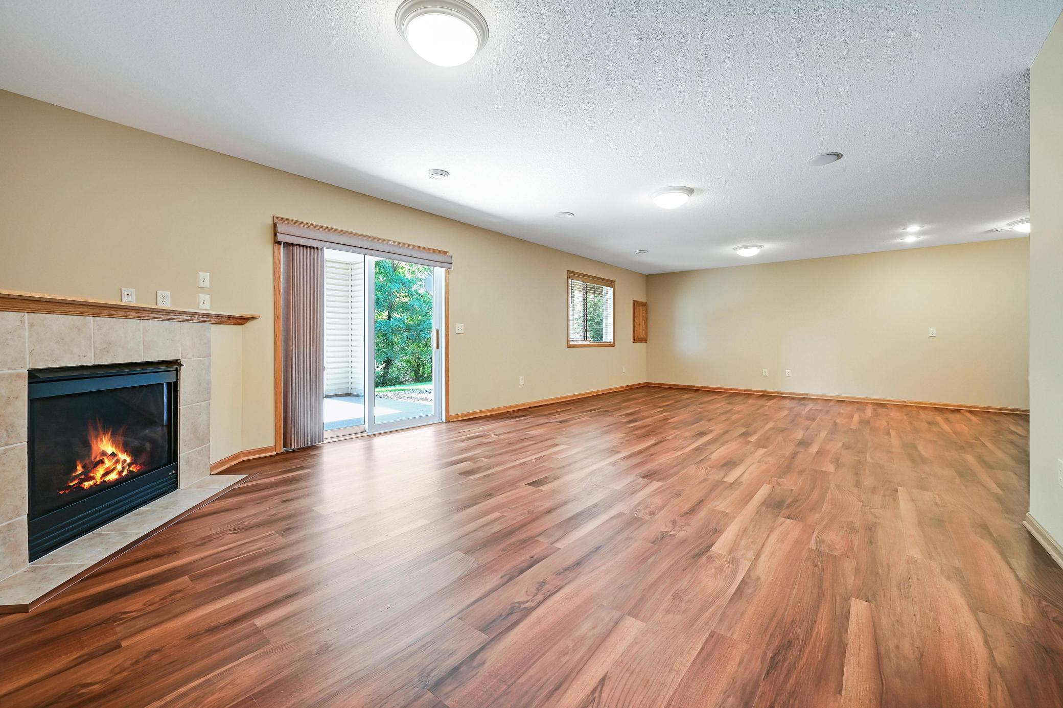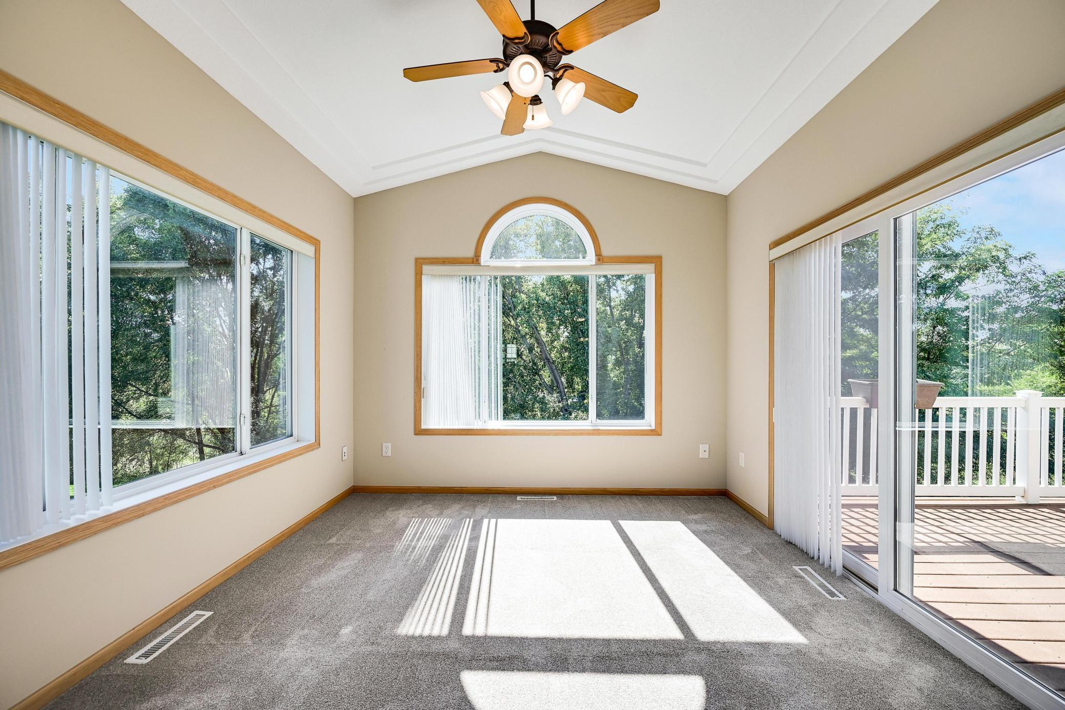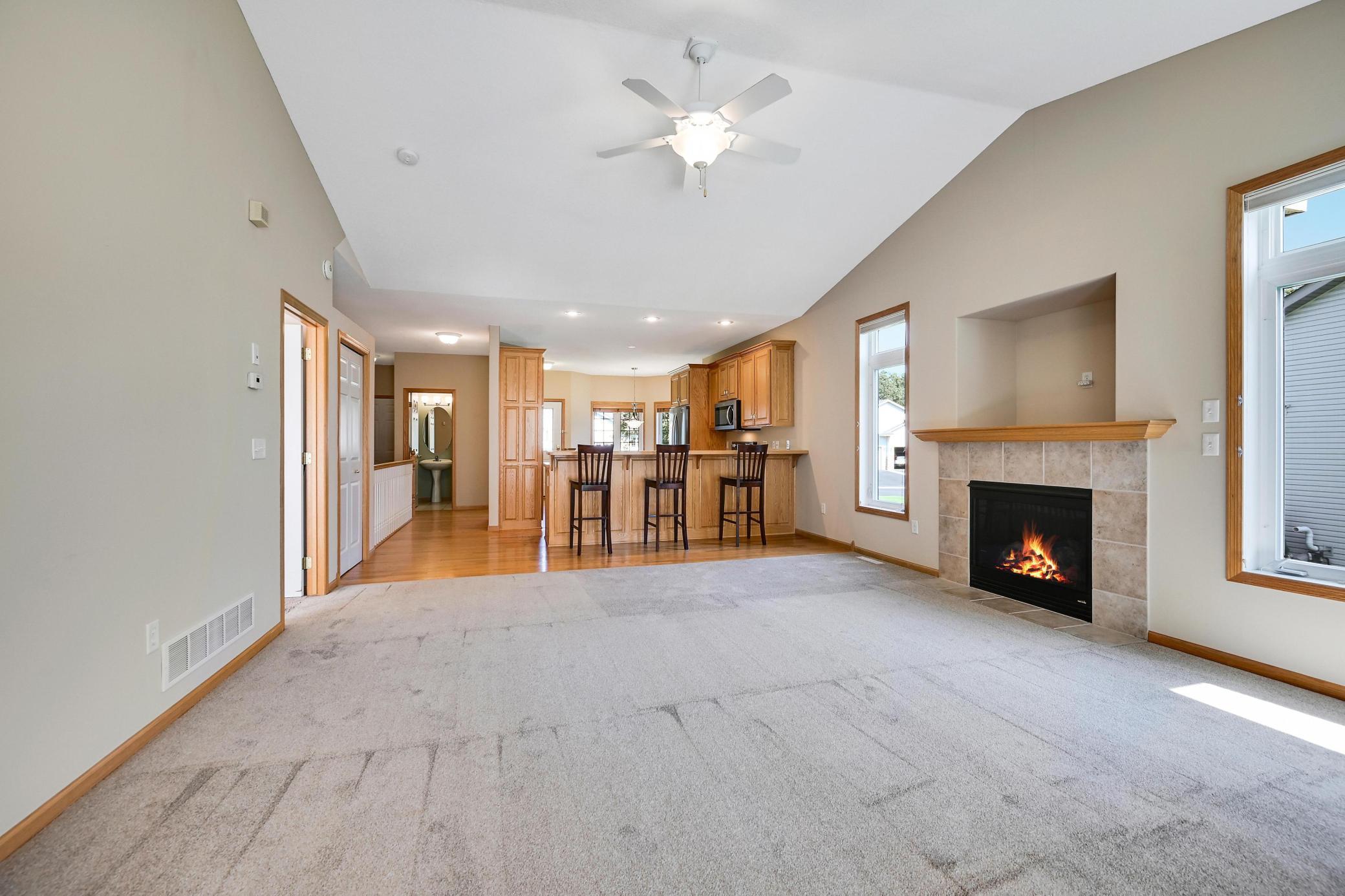 This lovely one level walkout twin home has been beautifully updated by current homeowner. The open floor plan starts with a charming breakfast nook surrounded by windows. The nicely updated kitchen has new Whirlpool stainless steel appliances and custom-built pull-outs in the cabinets and pantry areas. There is an eat-at breakfast ledge as well as another dining area. Spacious living room has a cozy gas fireplace surrounded by windows. Sun-filled 4 season porch and a large deck both have a southern exposure that overlooks a pond and trees. The adjacent City park land has trails that attach to Bunker Hills Regional Park. Main level primary bedroom has new flooring along with an ensuite and two closets, one is a walk-in. Convenient main floor laundry. Full walk-out lower level has a multi-purpose family room with a gas fireplace, plumbing for a wet bar, along with newer low-maintenance flooring. There are two additional bedrooms, a full bath, and tons of storage cabinets. The attached garage has built-in storage cabinets and a work bench. High demand area. See attached list of updates.