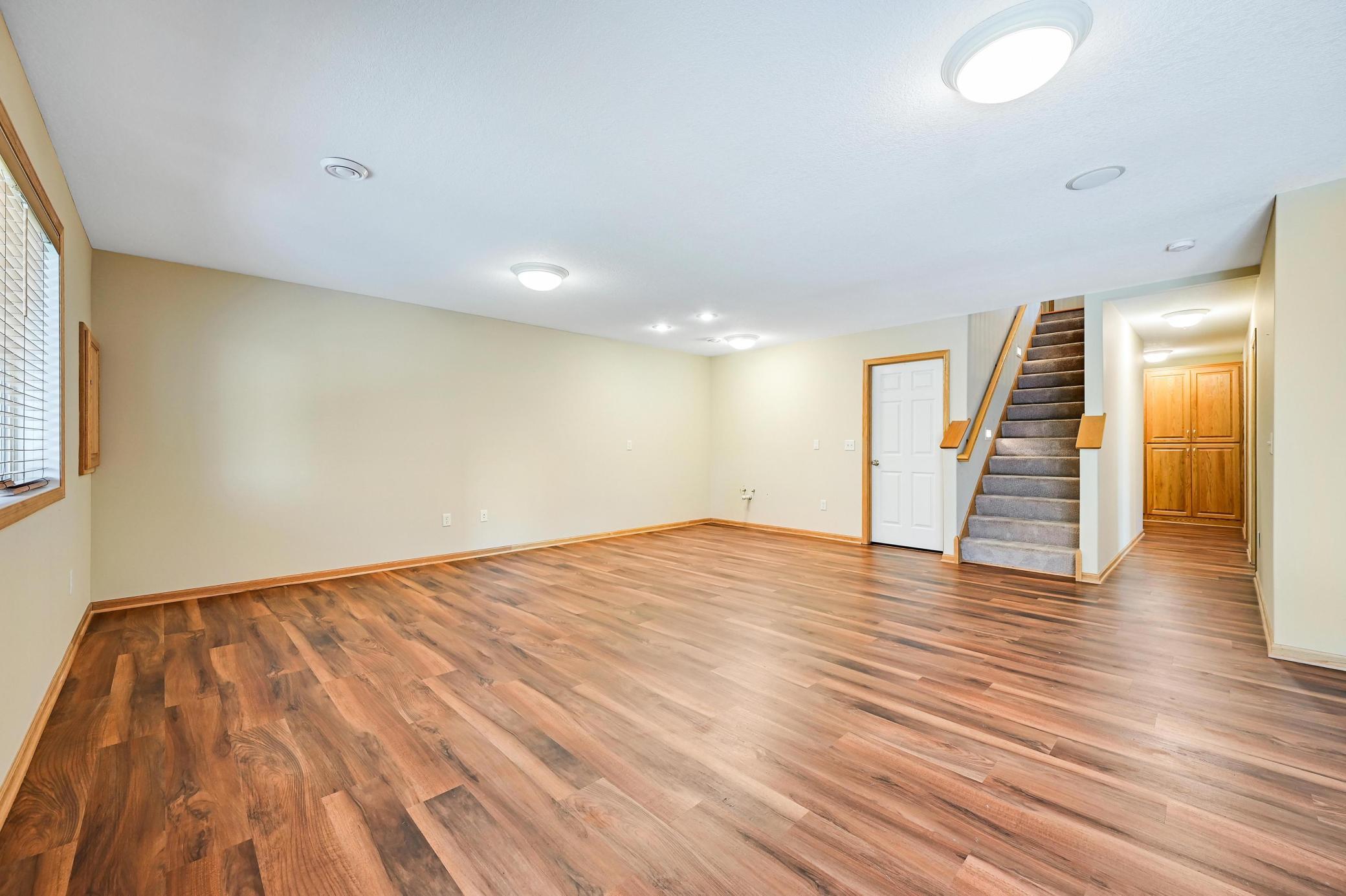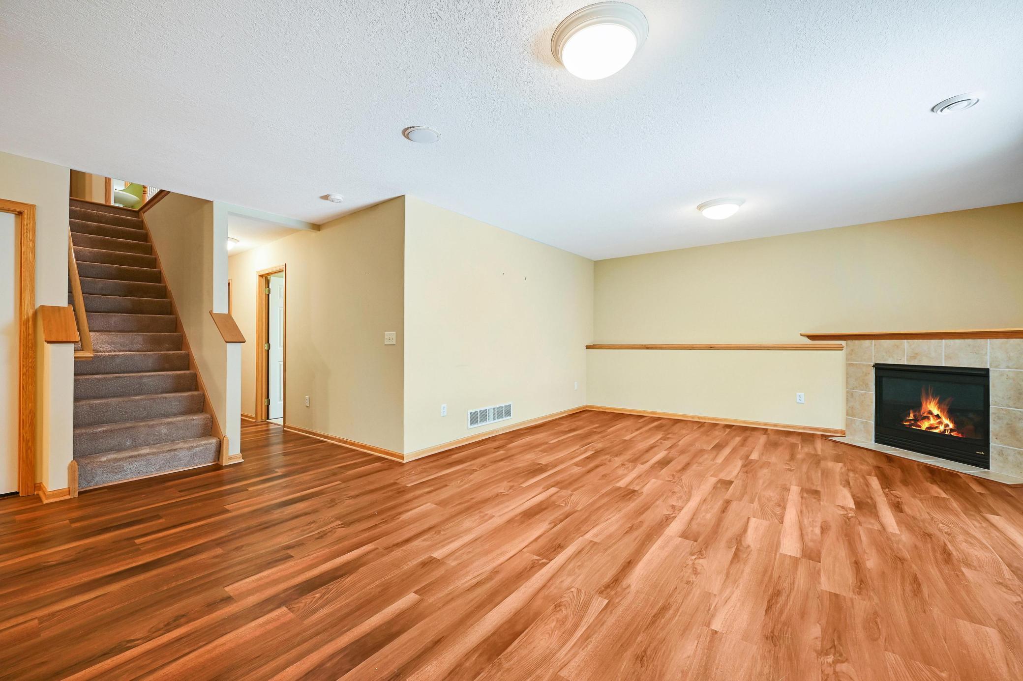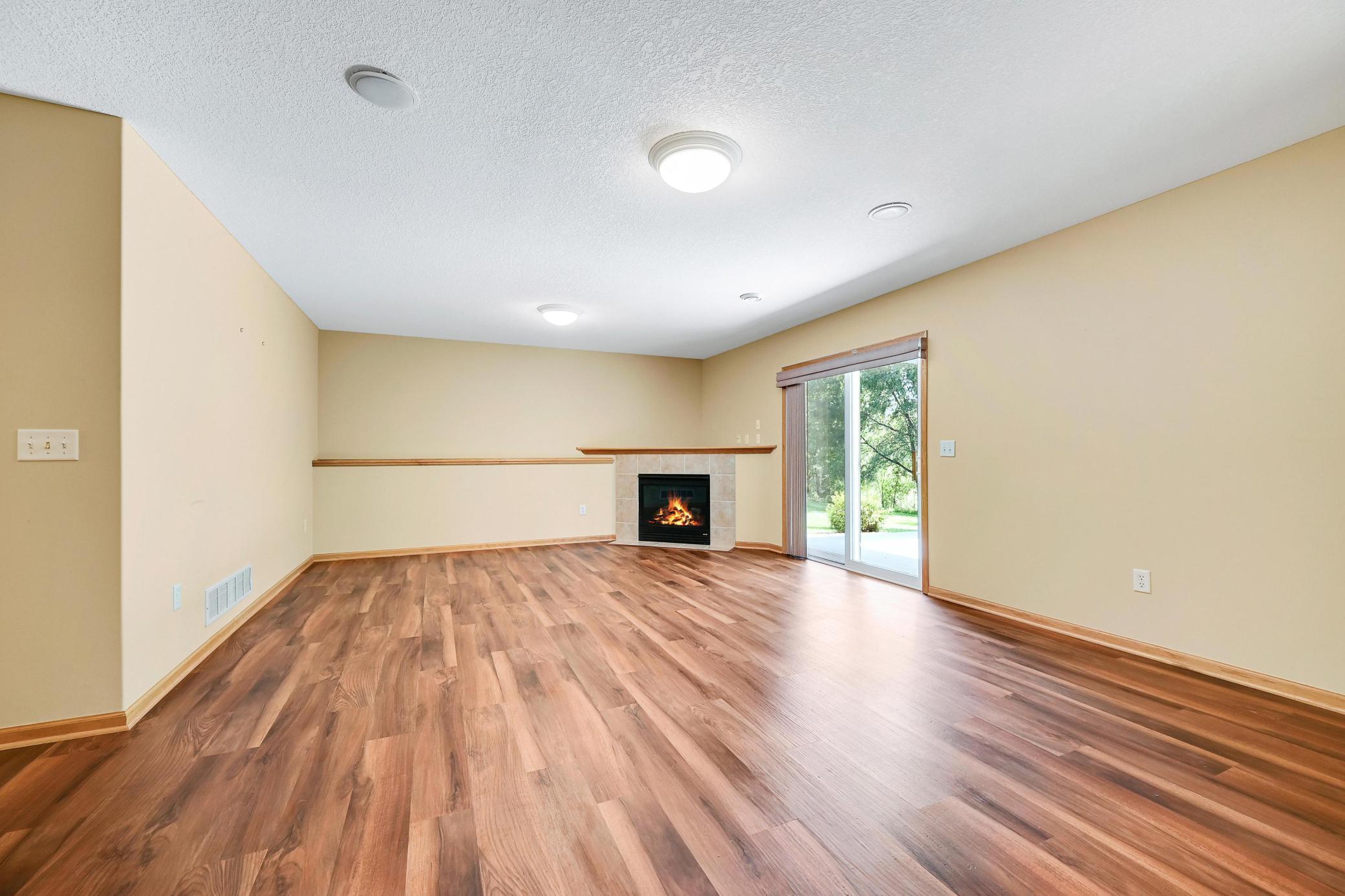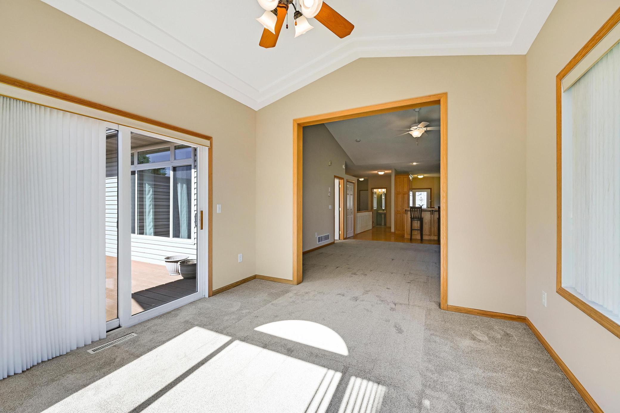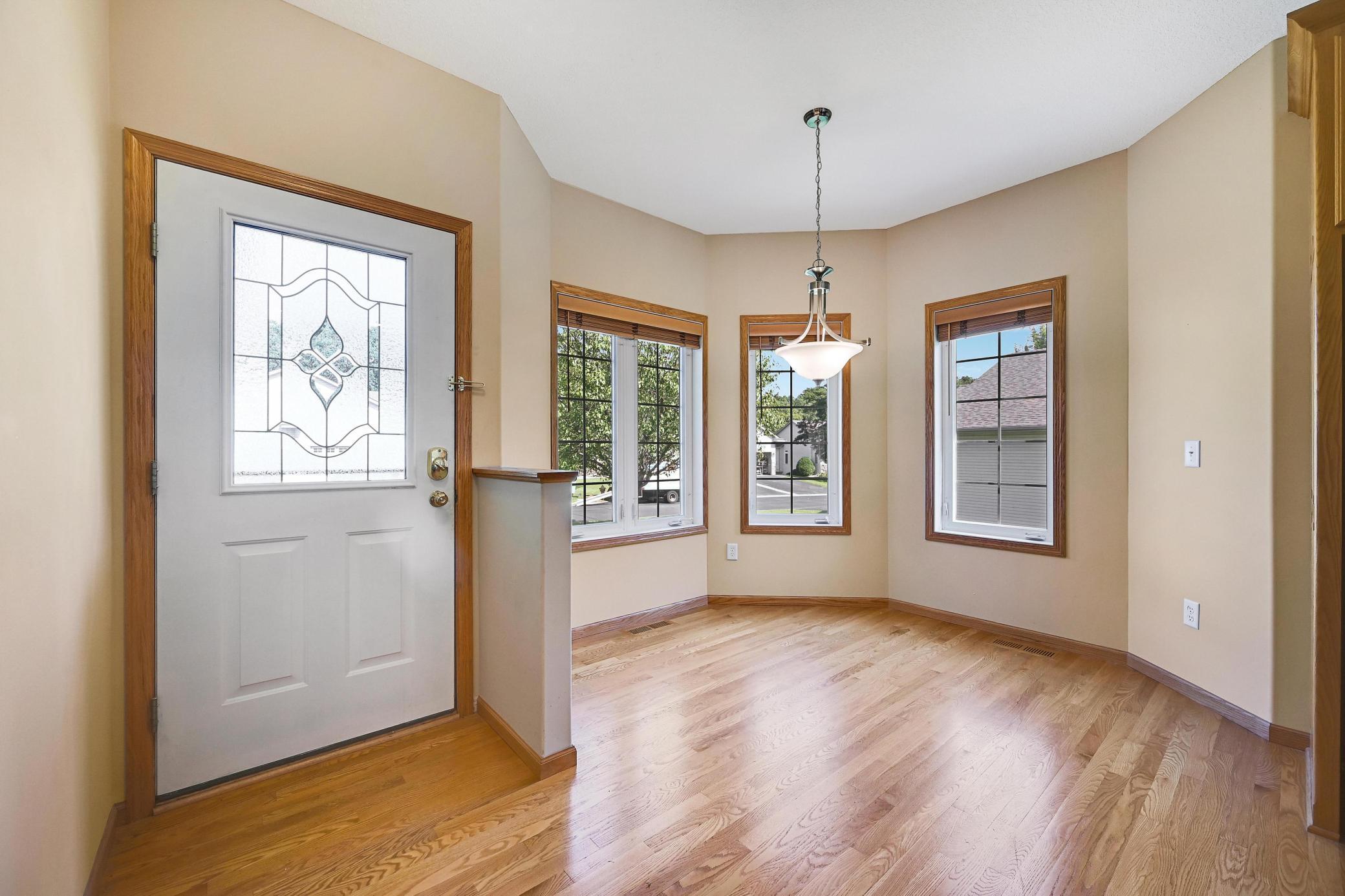 This lovely one level walkout twin home has been beautifully updated by current homeowner. The open floor plan starts with a charming breakfast nook surrounded by windows. The nicely updated kitchen has new Whirlpool stainless steel appliances and custom-built pull-outs in the cabinets and pantry areas. There is an eat-at breakfast ledge as well as another dining area. Spacious living room has a cozy gas fireplace surrounded by windows. Sun-filled 4 season porch and a large deck both have a southern exposure that overlooks a pond and trees. The adjacent City park land has trails that attach to Bunker Hills Regional Park. Main level primary bedroom has new flooring along with an ensuite and two closets, one is a walk-in. Convenient main floor laundry. Full walk-out lower level has a multi-purpose family room with a gas fireplace, plumbing for a wet bar, along with newer low-maintenance flooring. There are two additional bedrooms, a full bath, and tons of storage cabinets. The attached garage has built-in storage cabinets and a work bench. High demand area. See attached list of updates.