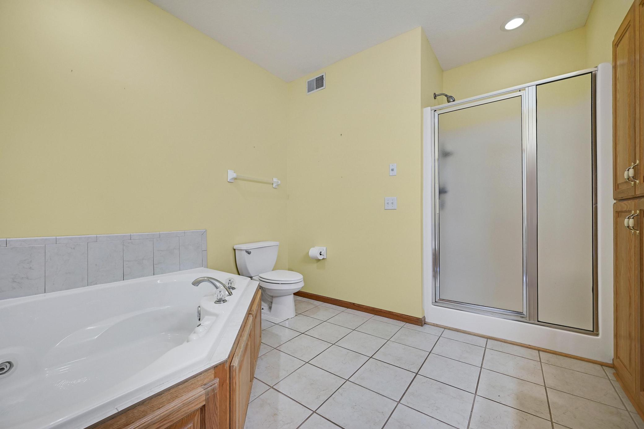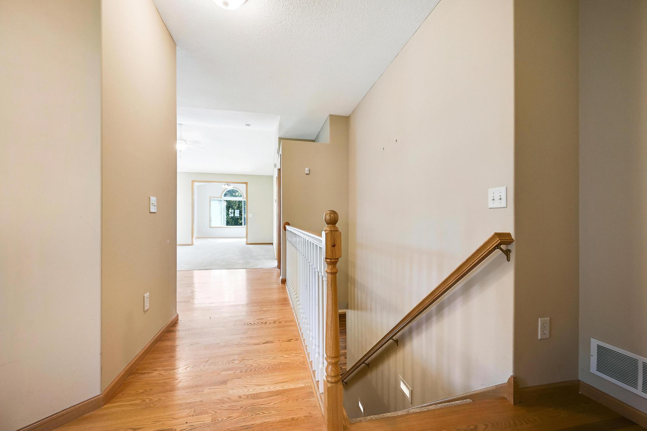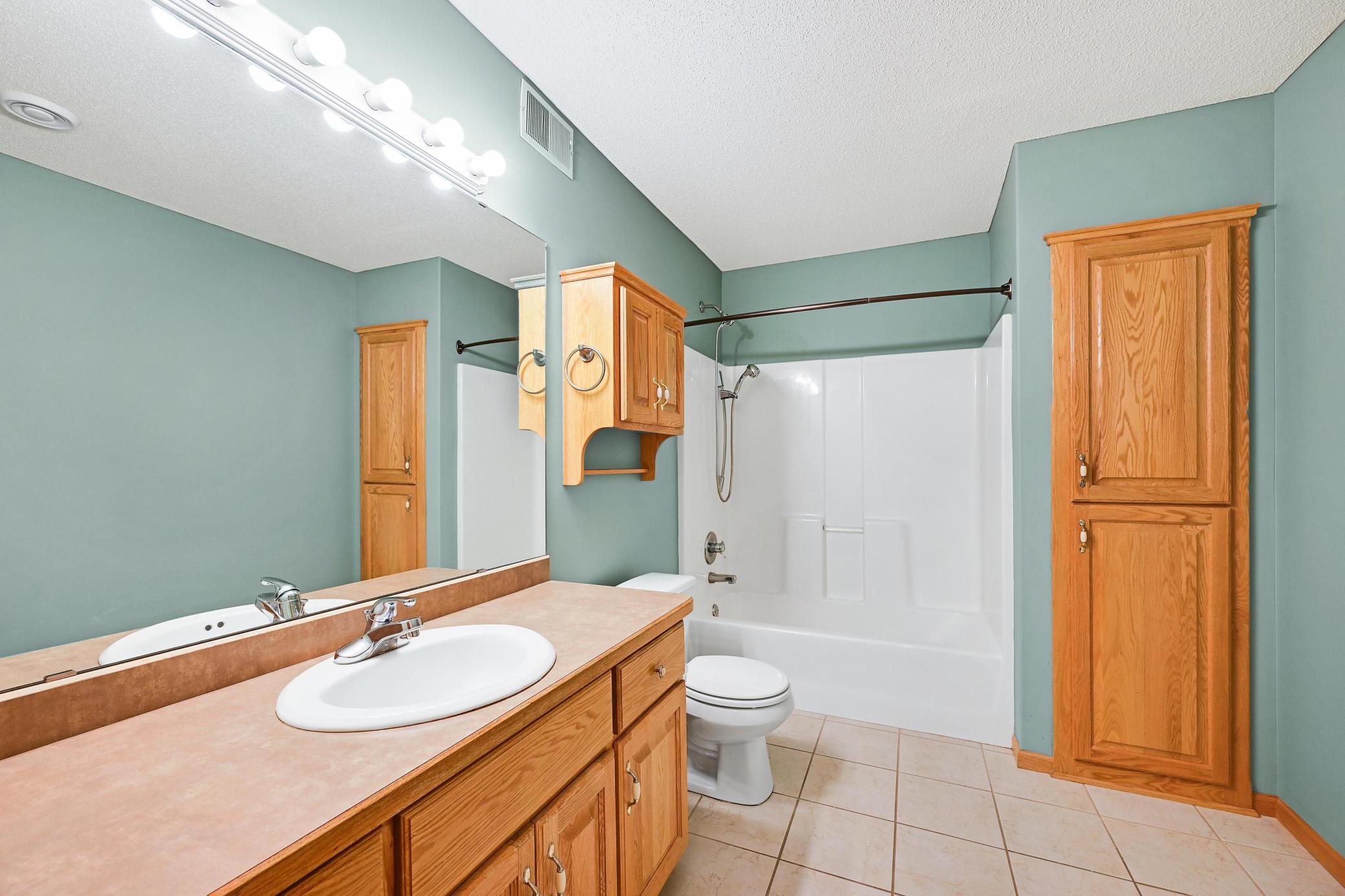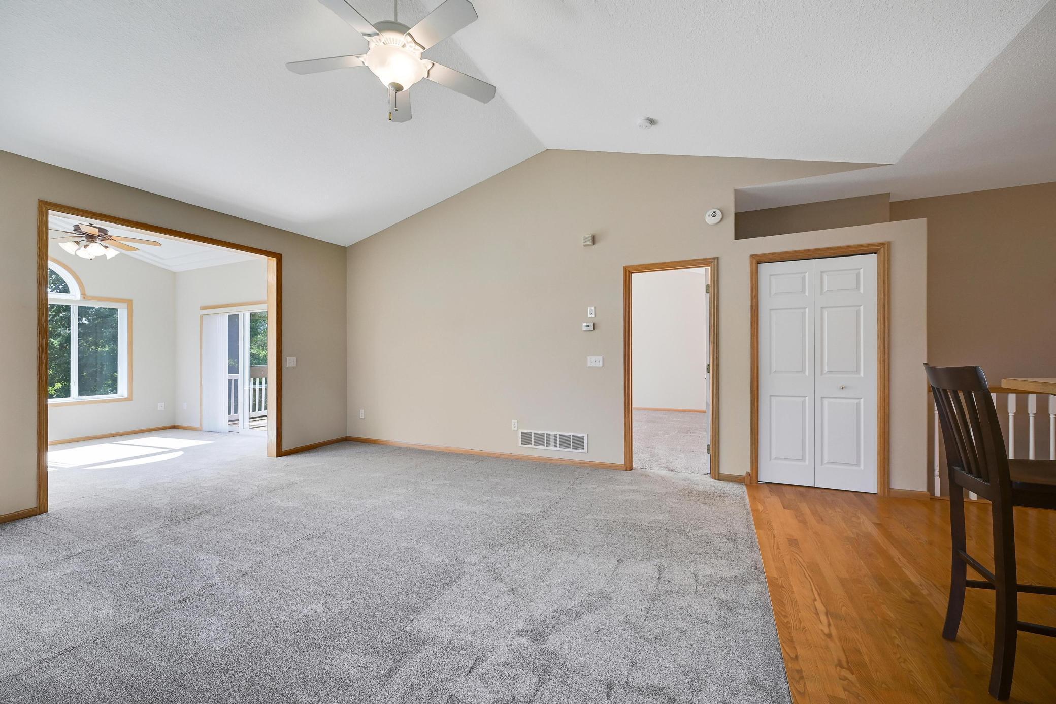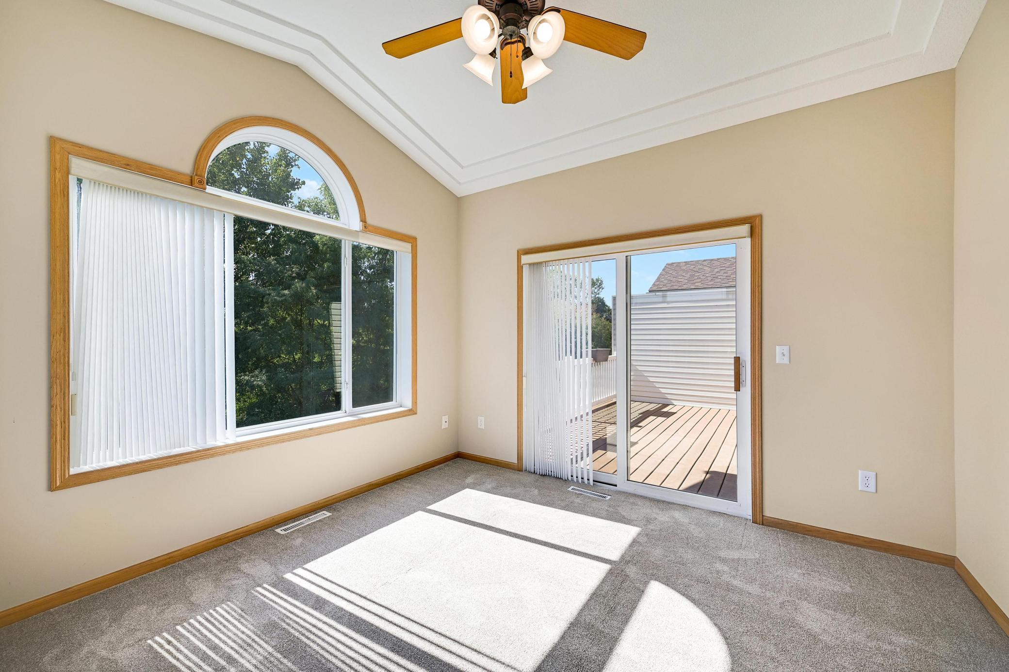 This lovely one level walkout twin home has been beautifully updated by current homeowner. The open floor plan starts with a charming breakfast nook surrounded by windows. The nicely updated kitchen has new Whirlpool stainless steel appliances and custom-built pull-outs in the cabinets and pantry areas. There is an eat-at breakfast ledge as well as another dining area. Spacious living room has a cozy gas fireplace surrounded by windows. Sun-filled 4 season porch and a large deck both have a southern exposure that overlooks a pond and trees. The adjacent City park land has trails that attach to Bunker Hills Regional Park. Main level primary bedroom has new flooring along with an ensuite and two closets, one is a walk-in. Convenient main floor laundry. Full walk-out lower level has a multi-purpose family room with a gas fireplace, plumbing for a wet bar, along with newer low-maintenance flooring. There are two additional bedrooms, a full bath, and tons of storage cabinets. The attached garage has built-in storage cabinets and a work bench. High demand area. See attached list of updates.
