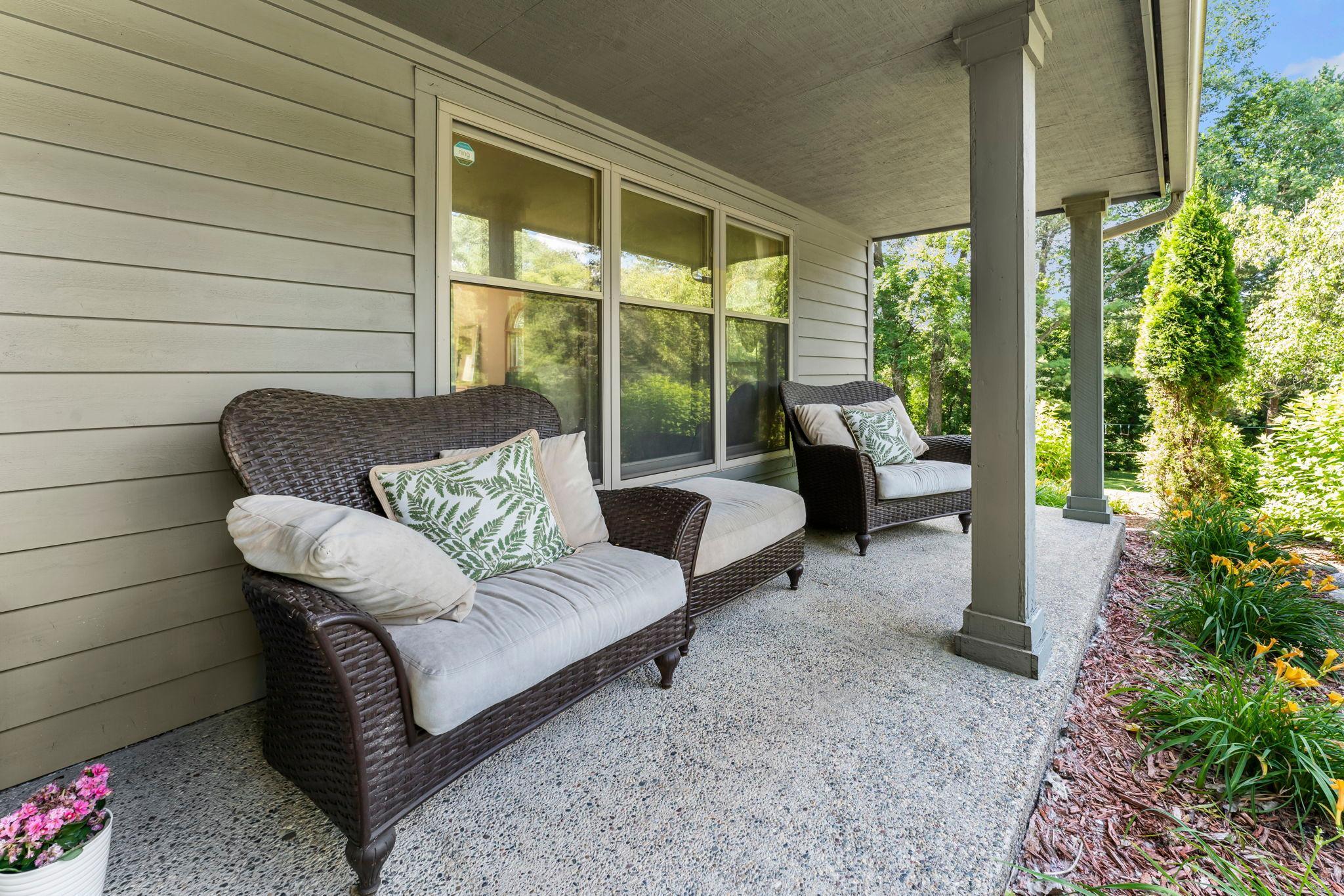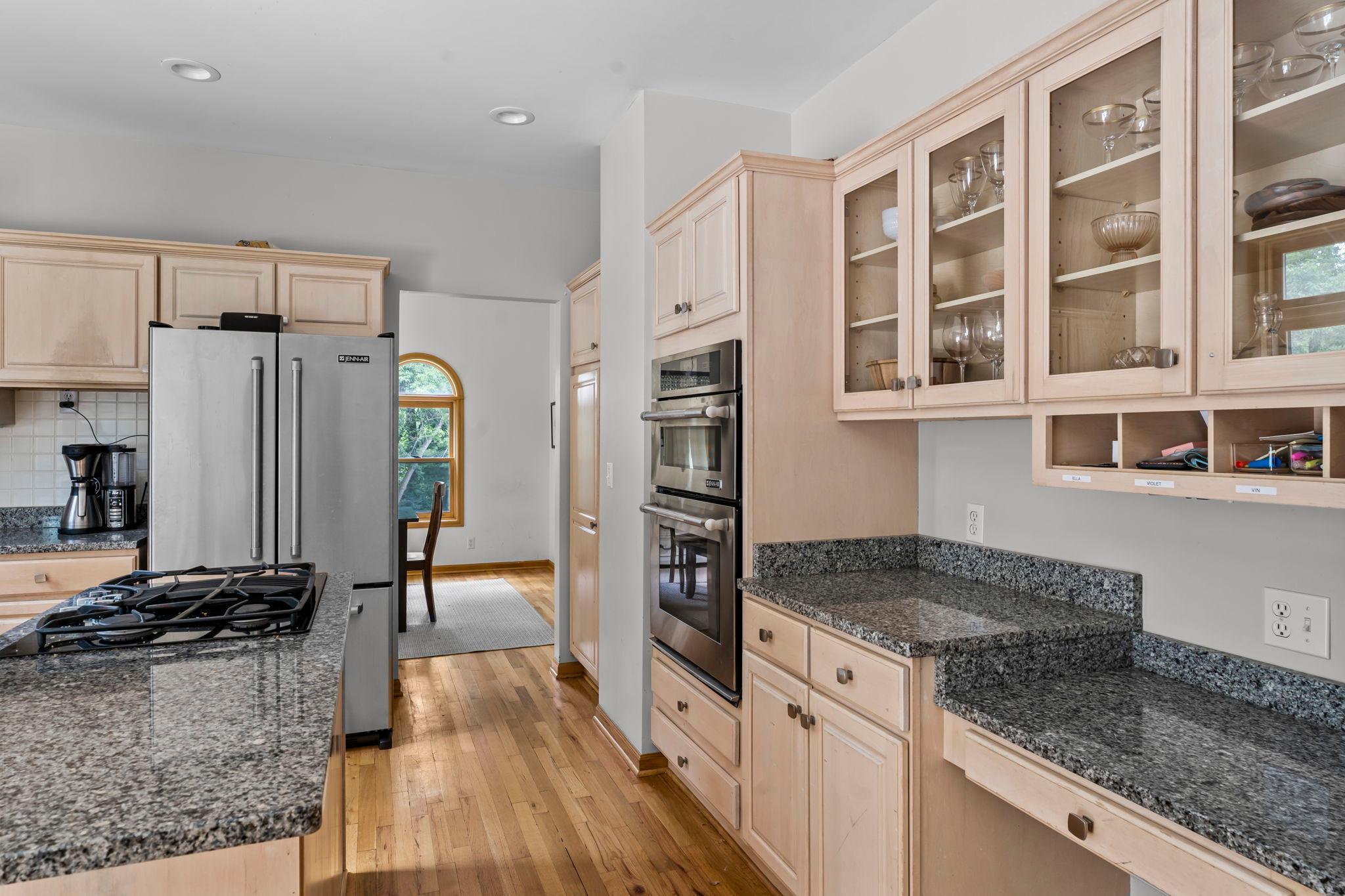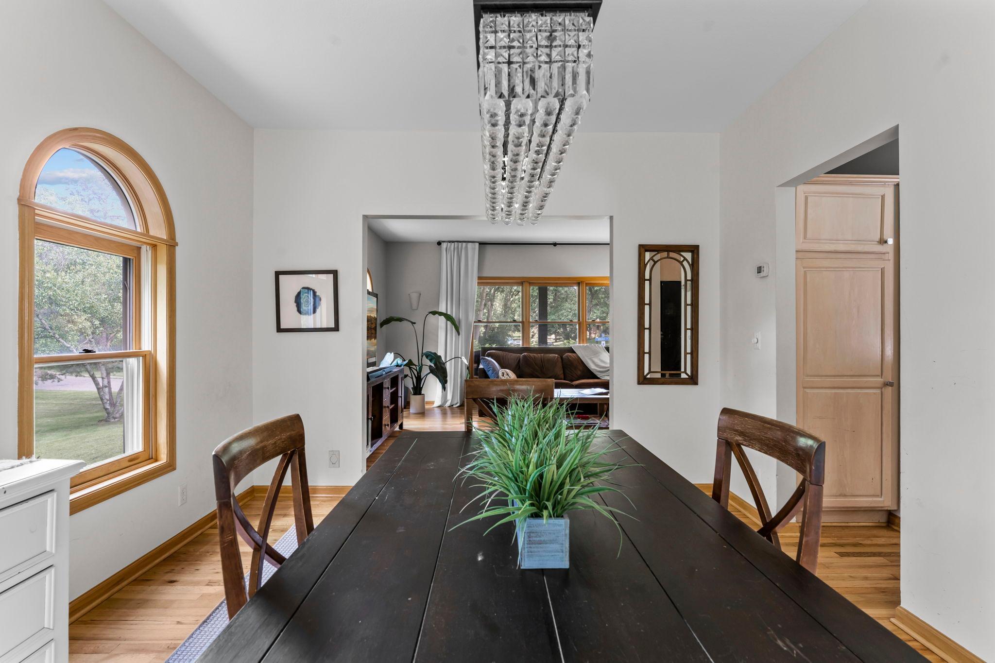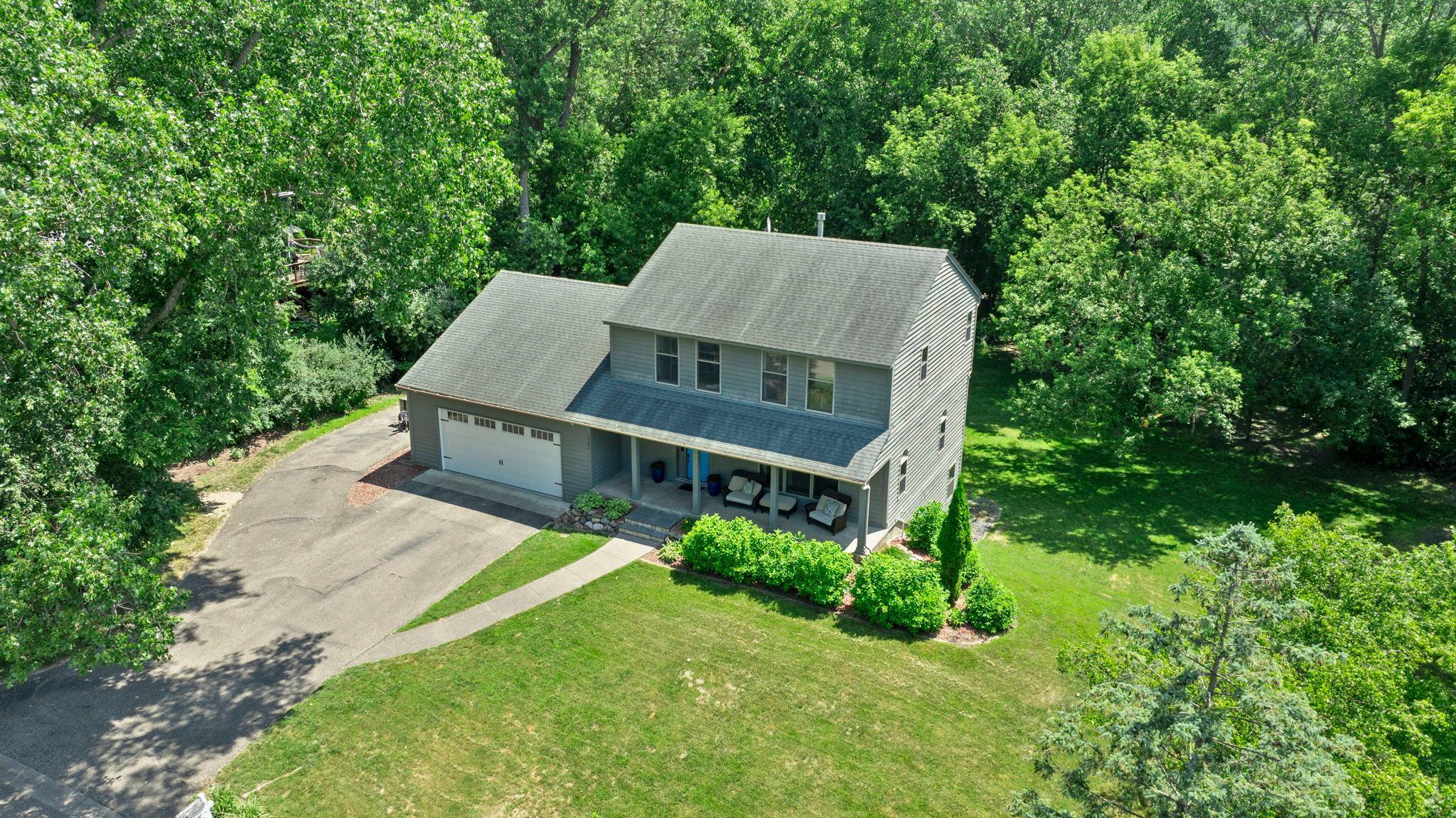 Stunning 3BR, 3BA home nestled in a peaceful, tree-lined neighborhood near scenic Purgatory Creek and Boulder Creek Park. Ideally located in Minnetonka School District, near Scenic Heights Elementary, and just minutes from shopping, dining, and conveniences, this home offers a perfect balance of tranquility and accessibility. Step into a sun-drenched living room with a grand picture window and rich wood floors that flow into an elegant formal dining room featuring charming arched windows. The chef’s kitchen dazzles with stainless steel appliances, gas cooktop, double wall ovens, center island, built-in desk, and stylish tile backsplash. Enjoy casual meals and gatherings in the informal dining area that opens to a vaulted-ceiling family room with sliding doors leading to a large maintenance-free deck—ideal for indoor-outdoor living. Main-level laundry includes Maytag washer/dryer and utility sink, plus a tasteful half bath. Upstairs, the vaulted primary suite boasts dual 5x5 walk-in closets and a spa-inspired en suite with tiled walk-in shower, jetted tub, and double vanity. Two additional spacious bedrooms share a full bath, one with its own walk-in closet. The unfinished walkout basement offers endless possibilities. Outside, relax on the covered 32x6 front porch or entertain on the expansive 26x12 deck, surrounded by mature trees and immaculate landscaping. Bonus side driveway and attached 2-car garage complete this beautiful, move-in-ready home!