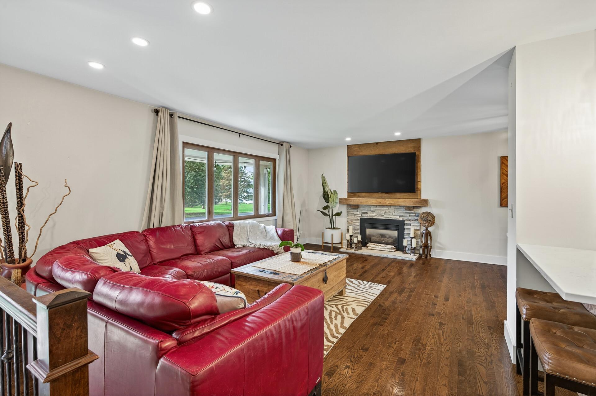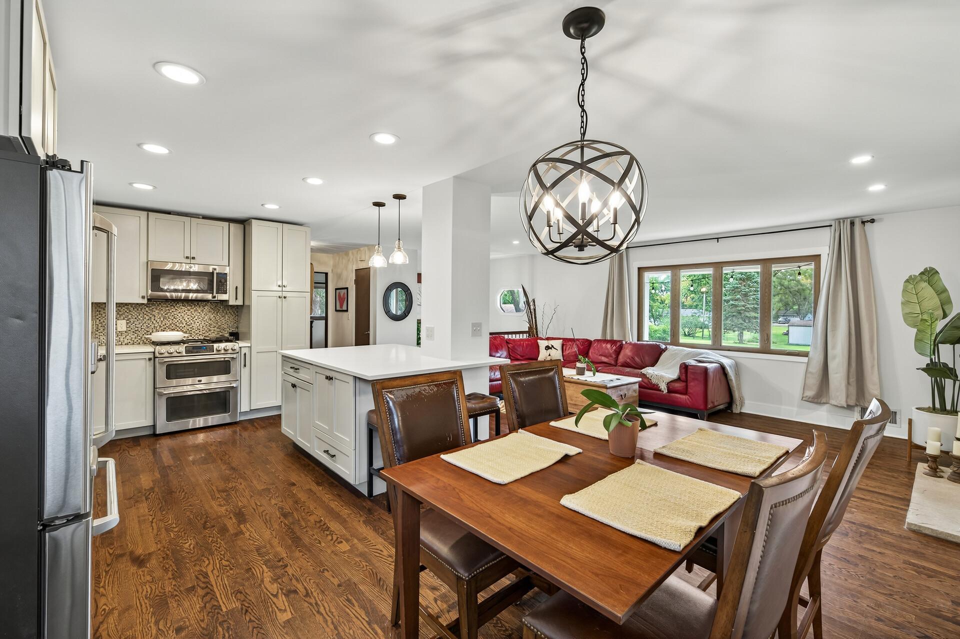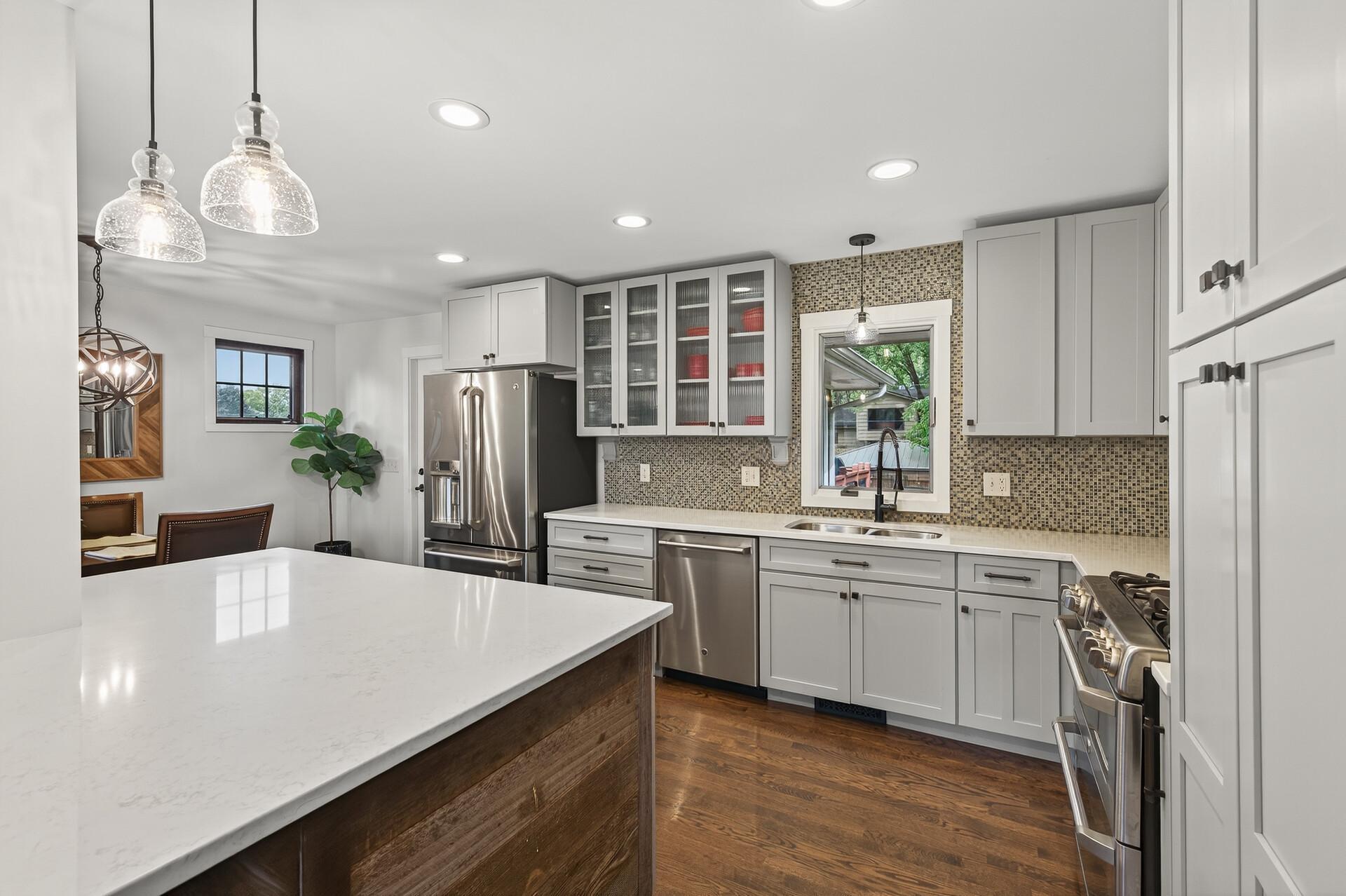 Welcome to your own slice of paradise! Nestled on a quiet, tree-lined street just minutes from schools, this beautifully updated and meticulously maintained home is filled with charm! You will love the remodeled kitchen featuring quartz countertops and eating bar, stunning backsplash, upgraded cabinets and top of the line stainless steel appliances. Fresh paint, gleaming hardwood floors and new carpet on the stairs make this home move-in ready! The cozy living room offers a brick hearth fireplace and lovely windows that frame peaceful views to the outdoors! Curl up with a good book or just watch the seasons change from the 3- season porch with floor-to-ceiling surround windows, this will be your favorite spot to relax! The lower-level family room with its own fireplace offers even more space to hang out. Wonderful laundry/mud room with new flooring, utility sink and lots of storage! Outdoor living shines here with so many options – grill on the deck, entertain under the pergola or gather around the firepit to stargaze! Plenty of room for your Thanksgiving day flag football game or host a fierce game of neighborhood tag! Raised garden beds, a storage shed and a half acre of gorgeous landscape complete this amazing property! New roof in 2024! All this in a prime Eden Prairie location near shopping, restaurants and entertainment!