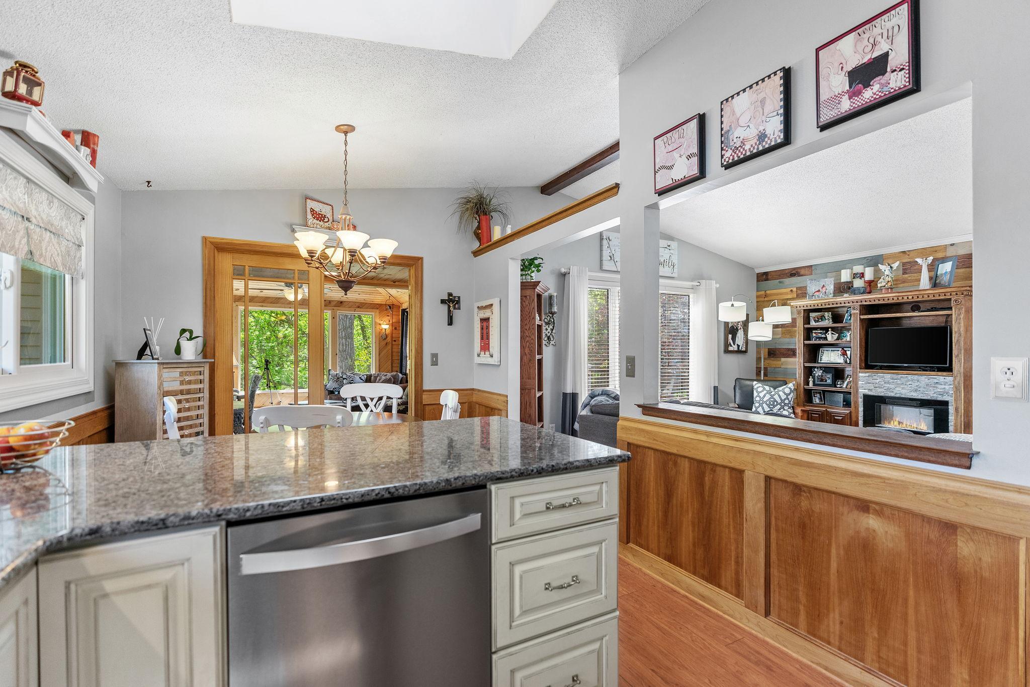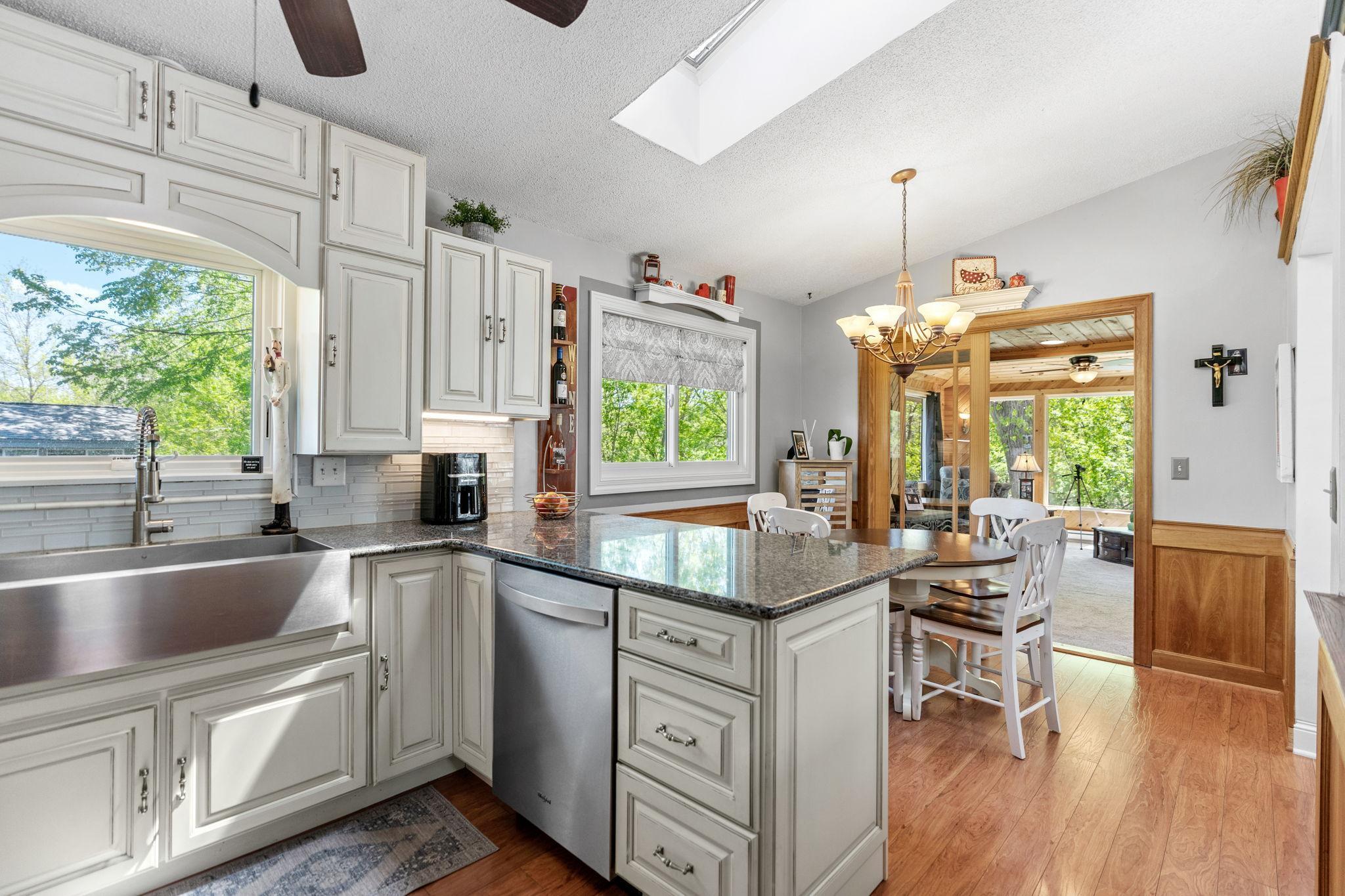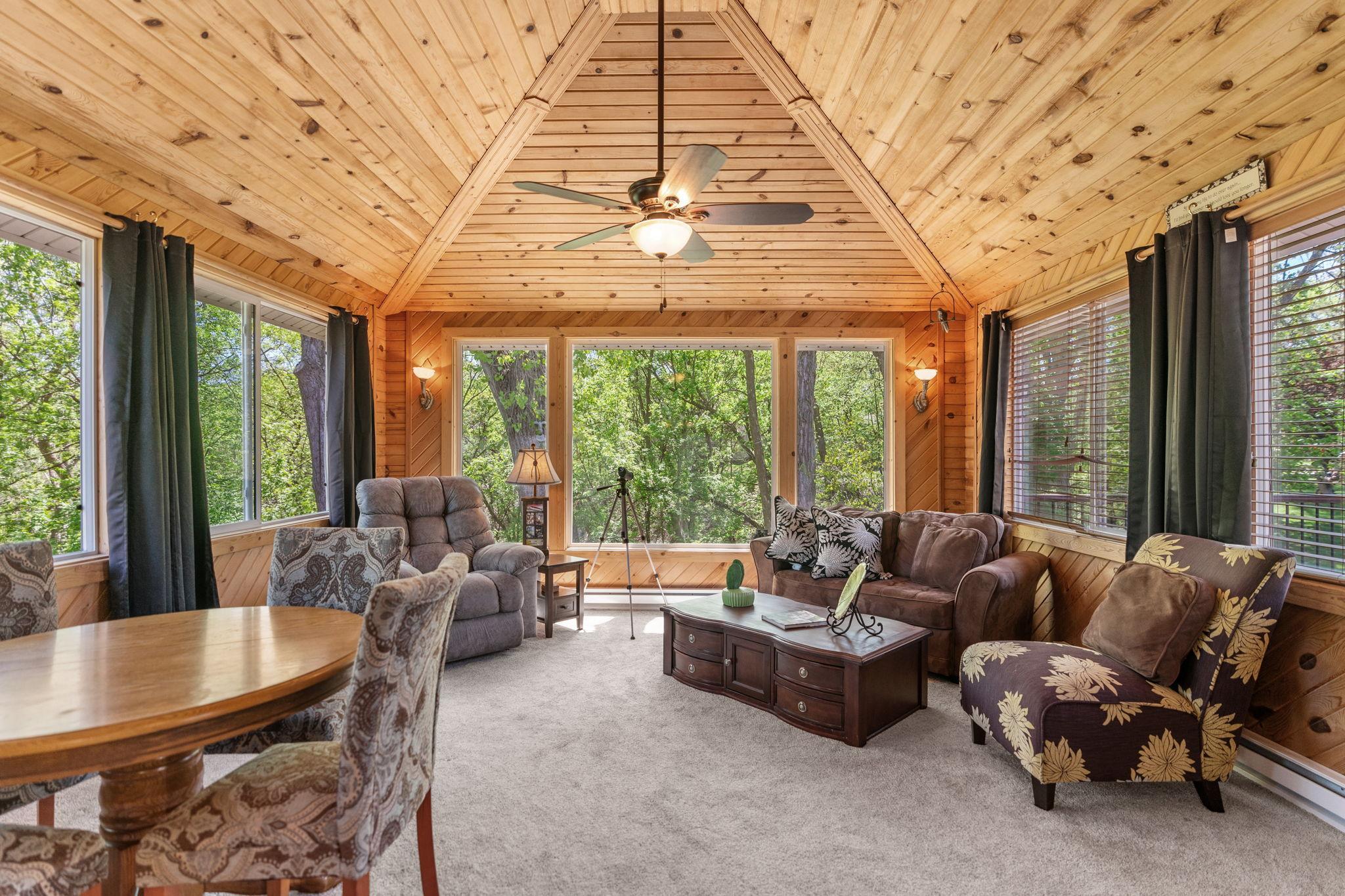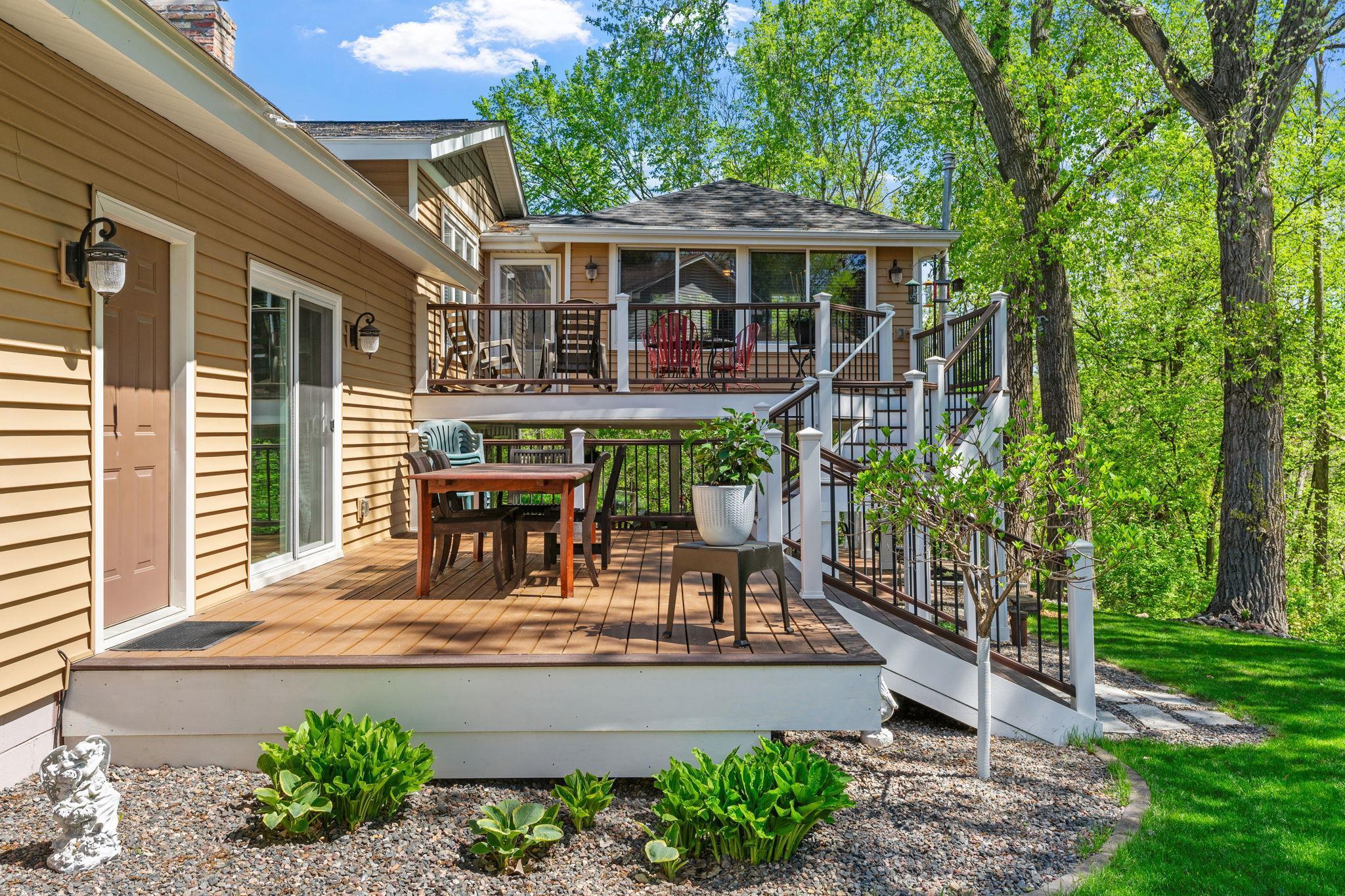 Welcome to this extended split-level home! Walk upstairs to a newly remodeled kitchen with views stretching through the four-season porch and out over acres of serene woods. The upper level features three bedrooms, including a primary suite with en-suite bath. A private office opens directly onto a two-level deck. The spacious 4-stall (2x2) garage comes with epoxy floors, and the basement has been completely remodeled for modern comfort. Watch a movie in the converted movie theater with mounted screen. Lay by either of the two fireplaces. Walk out downstairs to a stamped patio covered by under-decking. Beautifully positioned along the edge of Weaver Lake Knolls Nature Preserve, this home offers rare backyard privacy and daily access to scenic natural beauty.