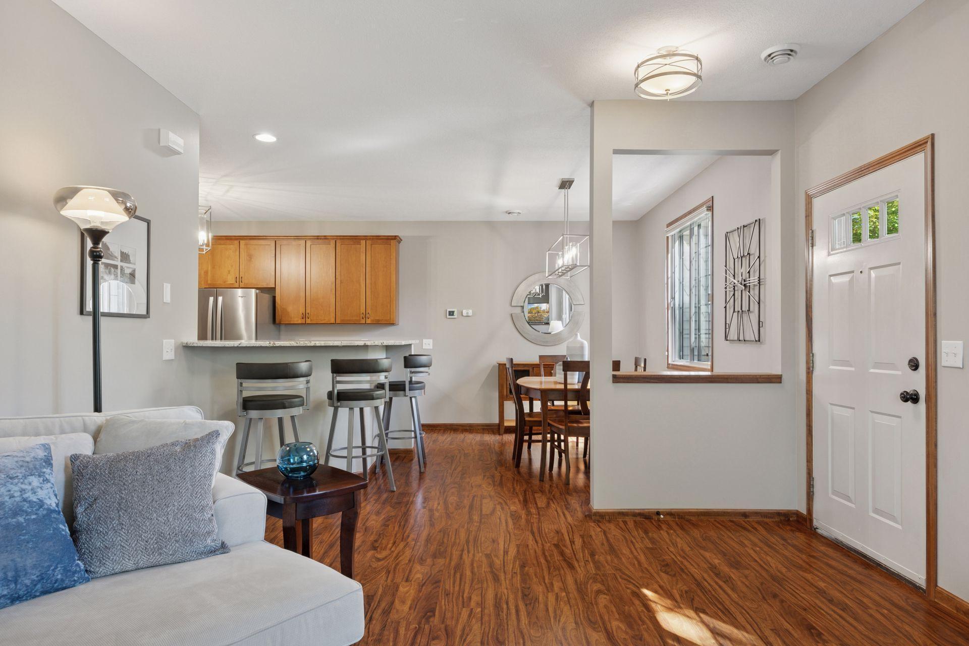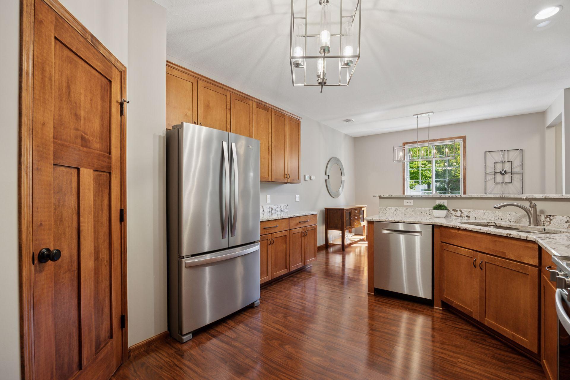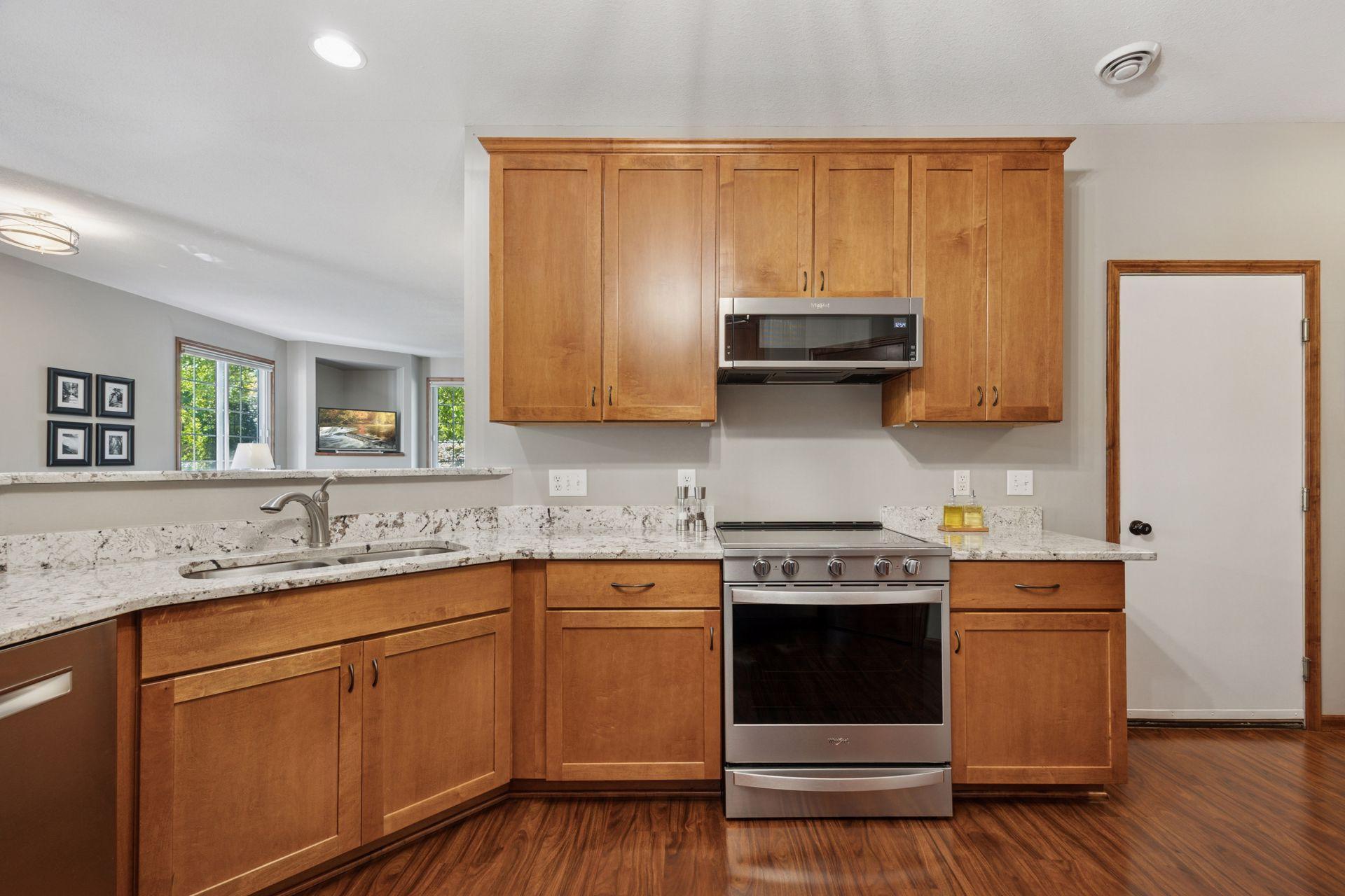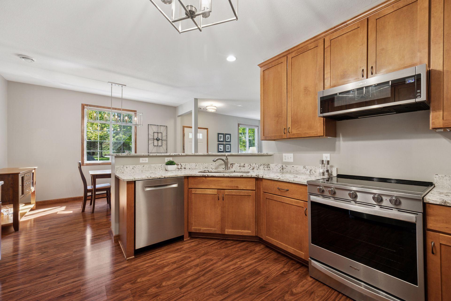Impeccably maintained end-unit townhome that is sure to impress even the most particular buyers. The kitchen has been beautifully updated with craftsman cabinetry, granite countertops, and stainless steel appliances including a 5-burner gas range. The open-concept main level features laminate wood flooring, updated lighting, and a cozy gas fireplace, creating a warm and inviting space for everyday living and entertaining. A versatile loft offers the perfect bonus area for a home office or media room. The spacious primary walkthrough includes a custom closet and a fully remodeled bathroom designed from top to bottom with modern finishes. Enjoy the privacy of your own patio with views of the surrounding green space, along with the convenience of a large driveway for extra parking. With thoughtful updates throughout—including doors, fixtures, and finishes—this home combines low-maintenance living with stylish upgrades in a desirable end-unit setting with wooded views across the street.