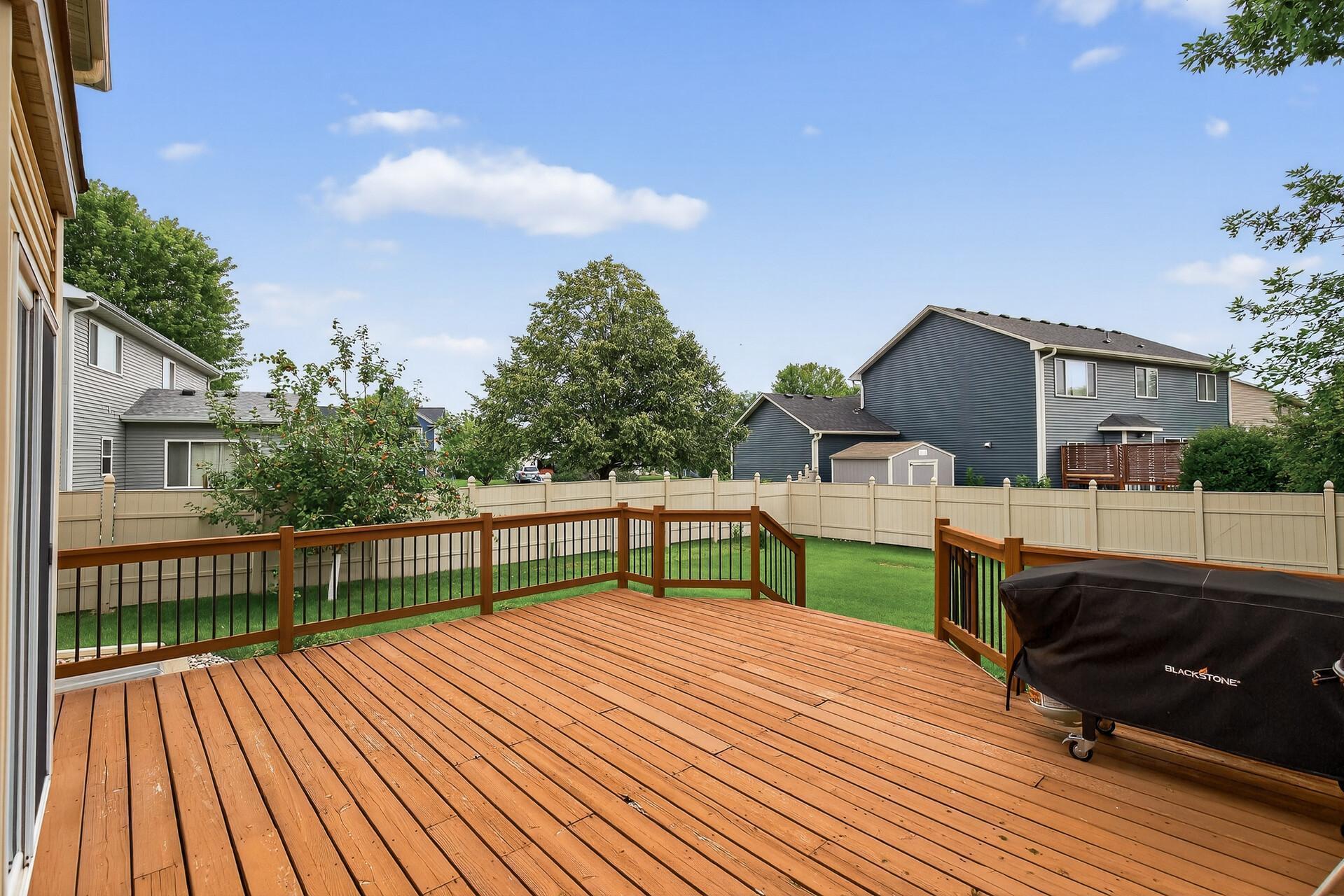 Fresh price improvement to $524,900! Home is still available for showings — current offer is contingent on the sale of the buyer’s home, and the seller remains open to another offer. This beautifully maintained former model home is truly move-in ready, offering the perfect blend of style, comfort, and functionality. As a desirable corner unit, it provides added privacy with a fully fenced yard, a spacious wood deck, and an in-ground sprinkler system for effortless upkeep. Inside, you’ll find a bright white kitchen featuring granite countertops, newer appliances, pantry, updated faucet, garbage disposal, and durable LVP flooring. The open-concept layout includes custom built-ins and a striking fireplace with a granite surround—ideal for cozy evenings at home. The luxurious primary suite boasts a tray ceiling, dual closets, and a spa-inspired en-suite with tile floors, whirlpool tub, and granite finishes. Additional highlights include crisp white trim throughout, a new 2025 water softener, epoxy-coated garage floor, and a 3-car garage with plenty of storage. The unfinished basement offers endless possibilities—use it as a play area today or finish it to add living space tomorrow. This turnkey home is a rare opportunity to own model-quality design with thoughtful updates and meticulous care.