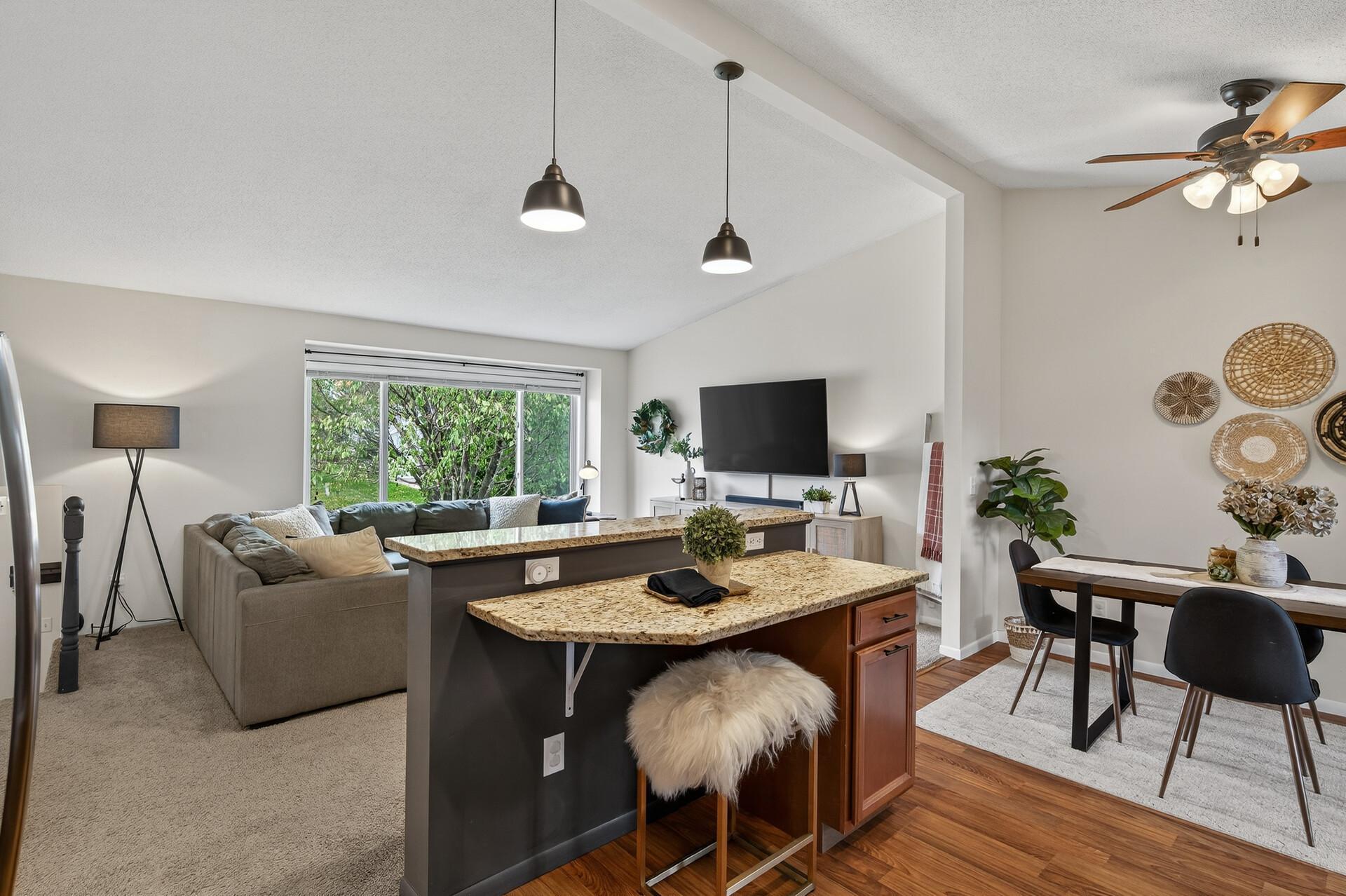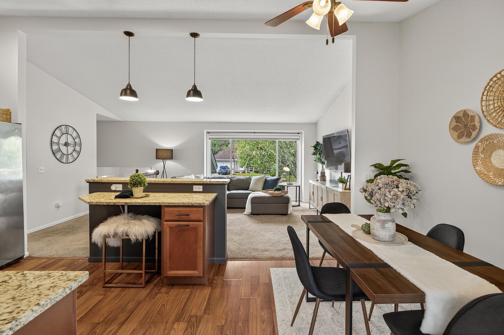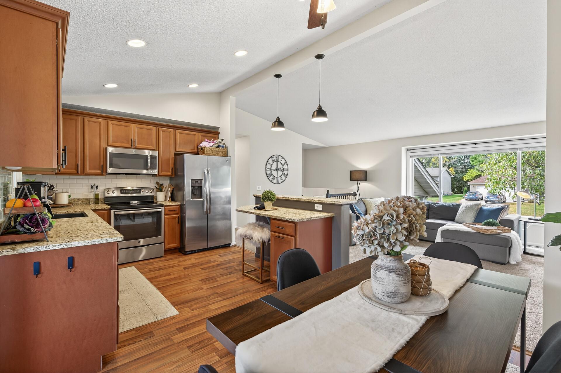 Welcome to this beautifully updated, turn-key open floor plan home on a quiet corner in the heart of Oakdale! This property offers both privacy and convenience. There is a park just down the street and all the best shopping and clinics are within a 10 min drive. The spacious 3-season room will be your happy place. It offers an abundance of natural light, a connection to nature and a large composite deck. The kitchen is stocked with abundant storage, stainless steel appliances, granite countertops, easy flow, and a great spot to pull up a chair at the breakfast bar with a connection to the spacious vaulted ceiling living room. The bright and sunny family room in the lower level provides space for everyone to have a space including room for exercise equipment to keep your fitness goals on track. With numerous updates, modern updates and a thoughtful design, this home is ready and for its next chapter. The friendly neighbors can't wait to meet you!