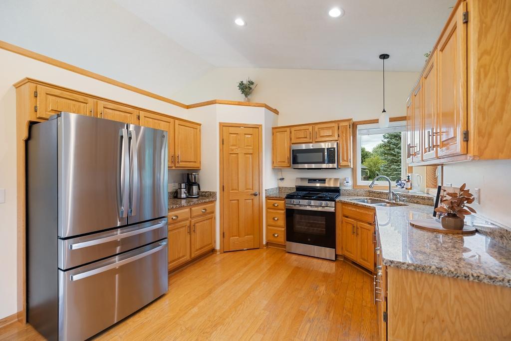 Welcome home! Step inside and feel right at home! This beautifully maintained, pre-inspected 5-bedroom, 3-bath home truly checks every box. From the moment you arrive, the new concrete garage floor, apron, and backyard patio (2025) reflect the quality and care found throughout. Need peace of mind? A brand new water heater (2025) has you covered. Inside, fall in love with the vaulted ceilings, gleaming hardwood floors, and an open-concept layout that flows effortlessly from the gorgeous kitchen featuring granite countertops + stainless steel appliances to the inviting sunroom that offers a walkout to the deck - a perfect spot for morning coffee or evening relaxation. The spacious family room and separate amusement room gives everyone room to spread out, while the six-panel doors and high-end finishes throughout add timeless appeal. Generous storage can be found throughout the home including an oversized 3-car garage. Love the outdoors? You'll appreciate the lush yard with irrigation system that's as beautiful as it is easy to maintain.