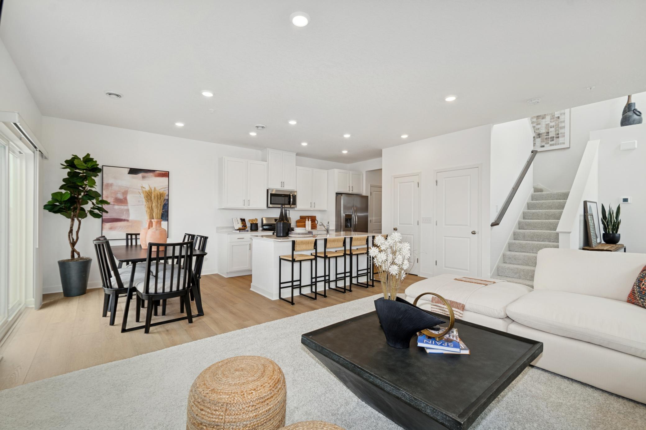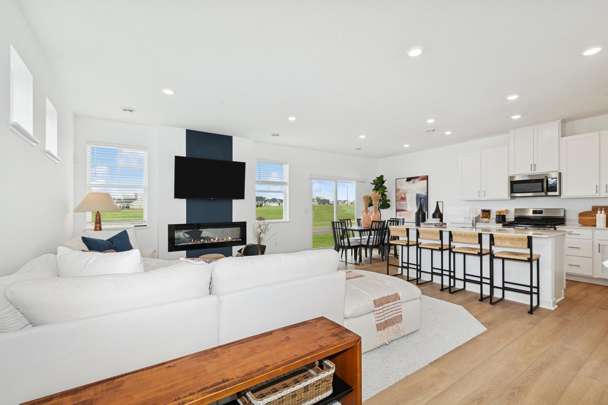 Home is under construction and will be complete in December! Ask about saving up to $7,500 & a 5.375 fixed rate when using Seller's Preferred Lender! This thoughtfully designed two-story townhome blends comfort and convenience, starting with a striking double-height foyer that warmly welcomes residents and guests. Down the hall, the open-concept layout features a cozy Great Room with an electric fireplace, a dining area ideal for gatherings, and a sleek, modern kitchen perfect for culinary exploration. Sliding glass doors lead to a peaceful patio, offering a private outdoor retreat. Upstairs, three well-appointed bedrooms provide restful spaces, including a generous owner’s suite with an en-suite bathroom. A two-car garage with direct access through a practical mudroom completes this inviting home.