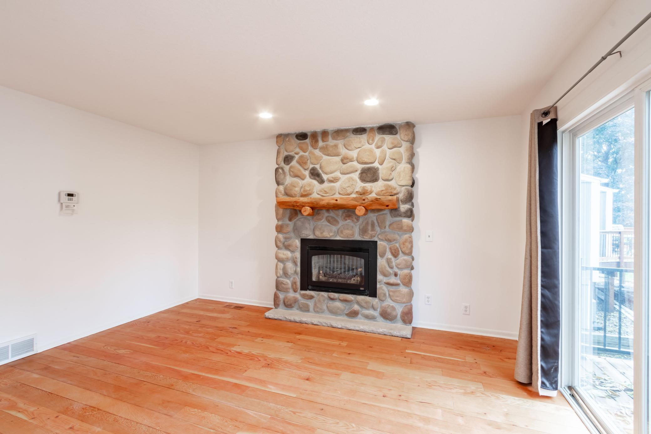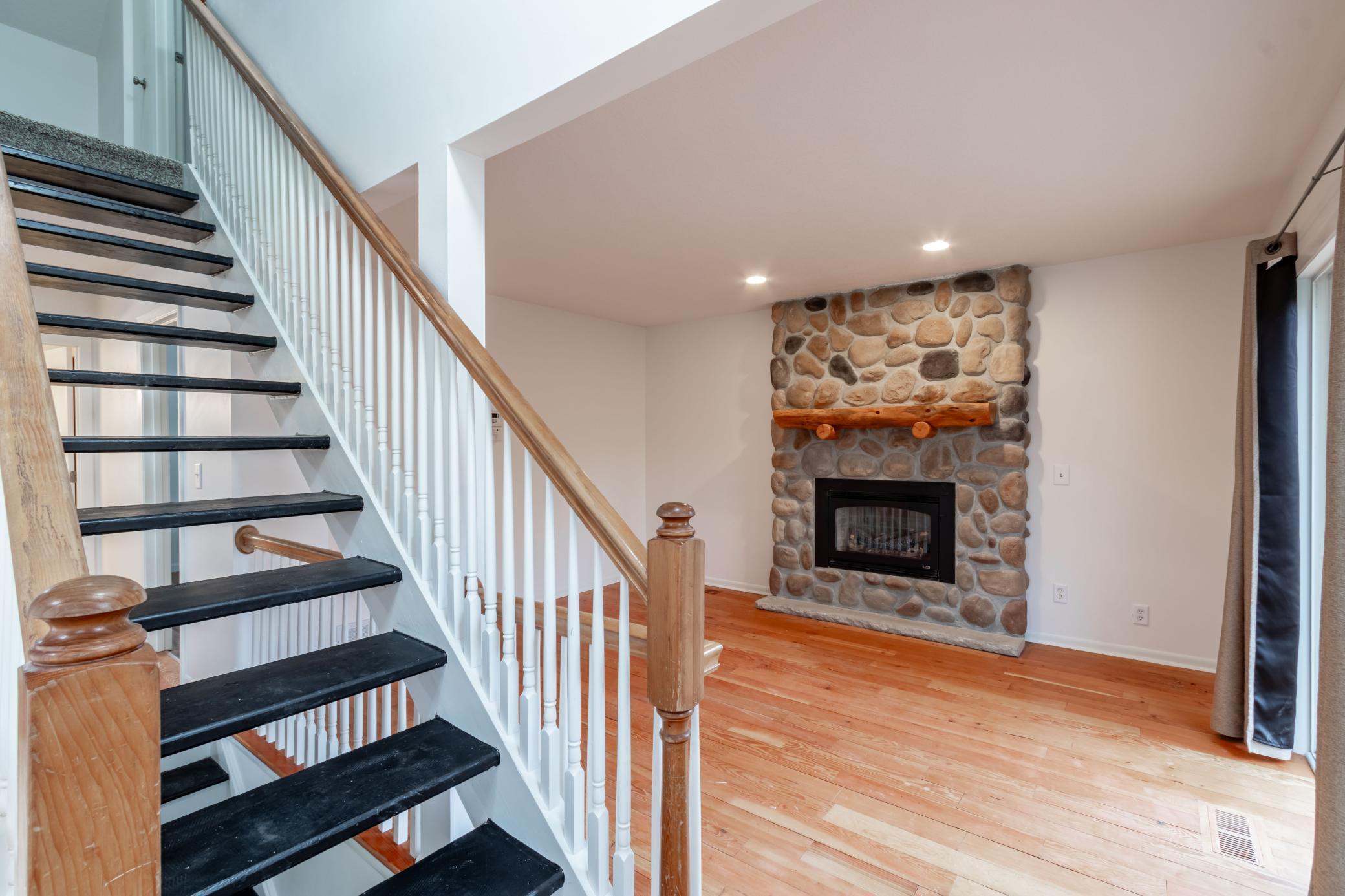 Detached townhome in Tiburon Association. Great location overlooking big open area by the swimming pool and club house with pool table. Unit has rustic wood floors, fieldstone fireplace, main floor bedroom, open stairway to loft-den area upstairs, nice clean kitchen and main floor full bath. Double garage. Super low association dues cover lawn and snow care, trash. Pets allowed. New roof this summer. AC unit one year old. New deck 3 months ago, New water softner. 25 acres of common grounds & trails.