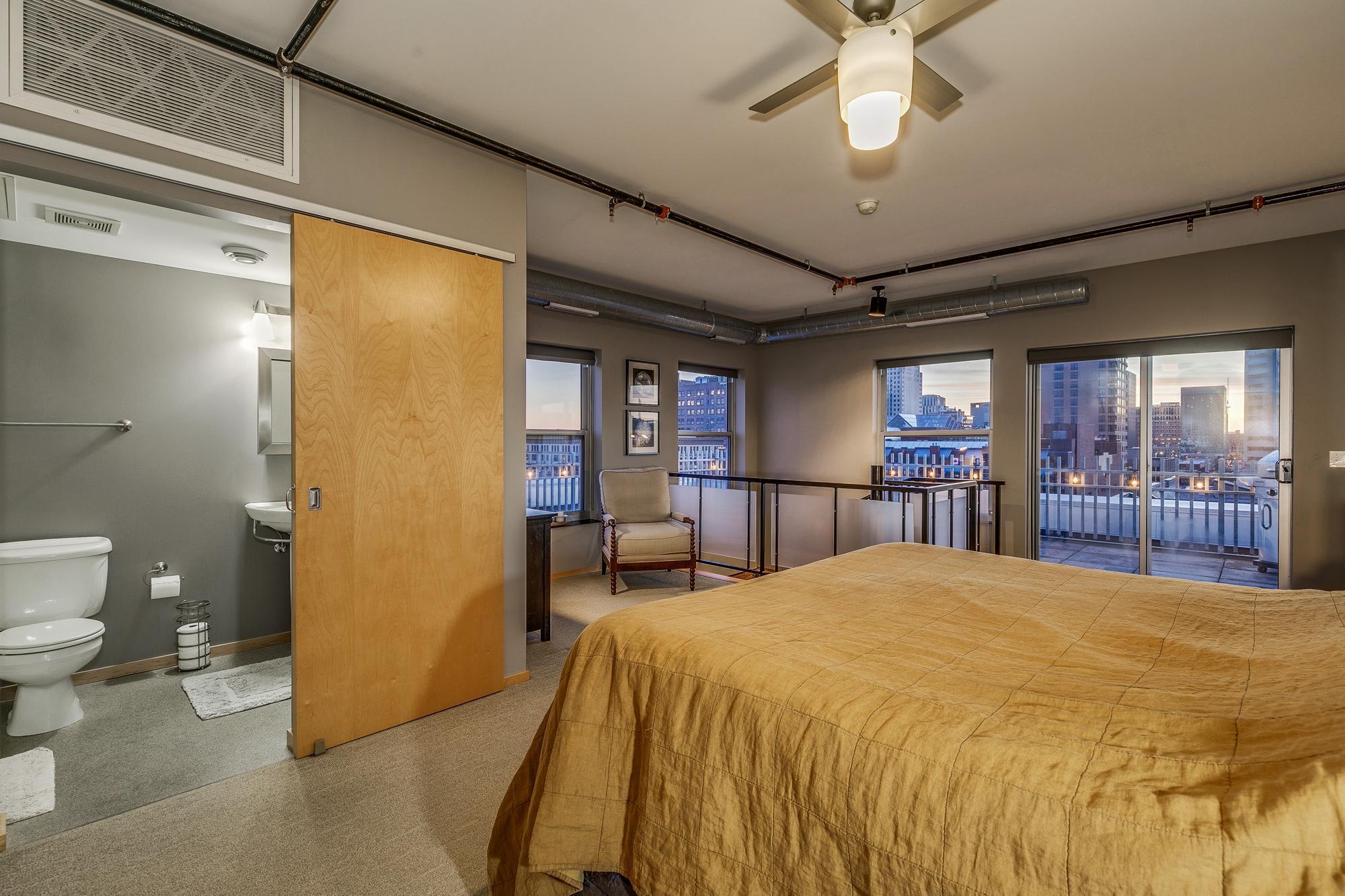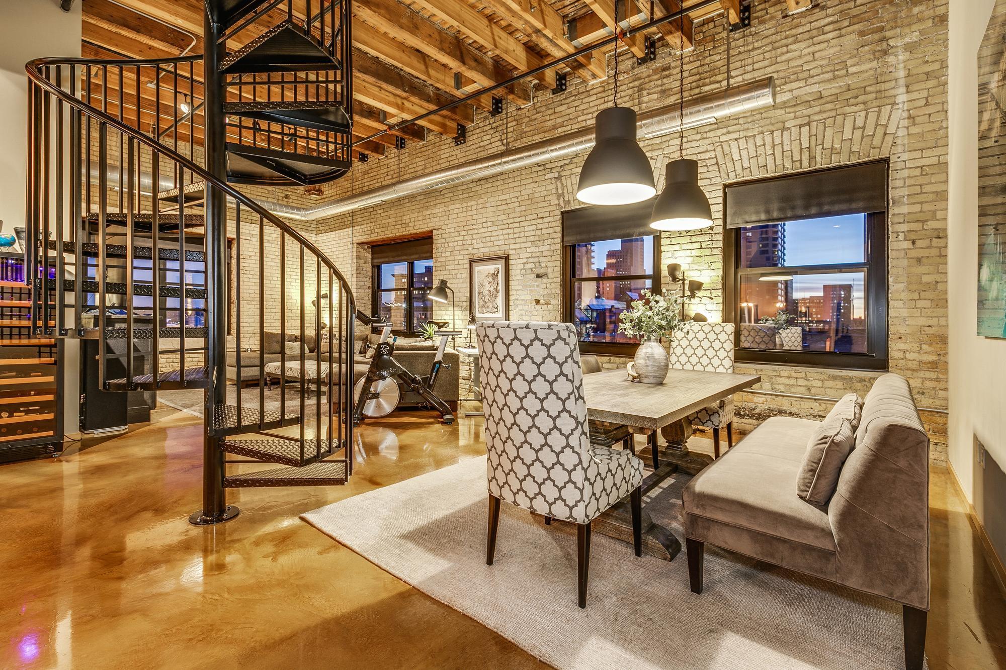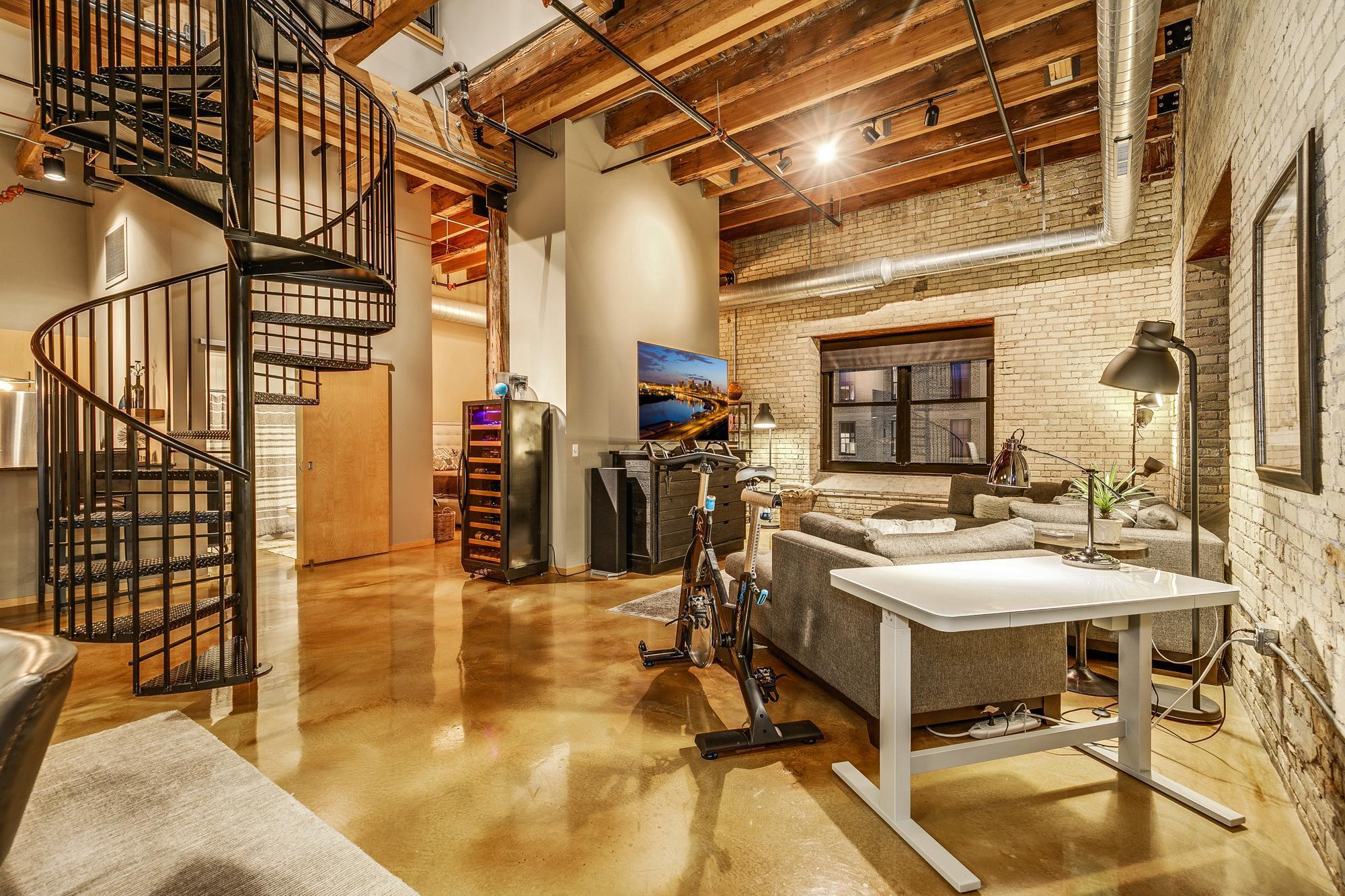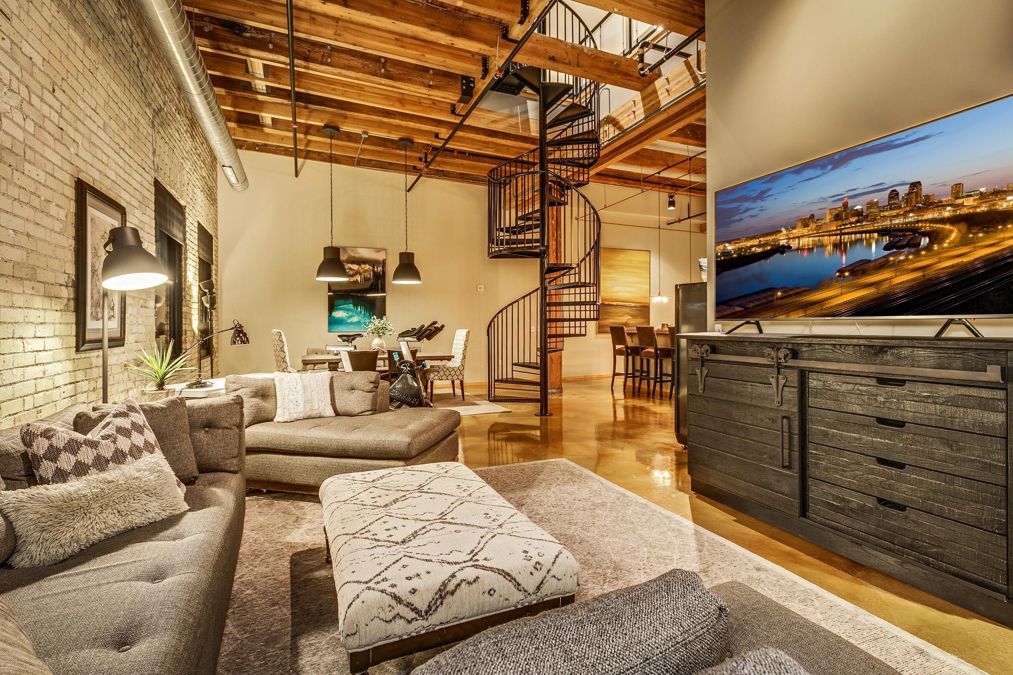 7th-floor penthouse loft on the SW corner of Historic River Park Lofts, overlooking Mears Park, CHS Fields in Lowertown! Every Saints game you can enjoy the fireworks off your large wrap-around patio!! Wait till you see the views. The unit boasts exposed brick & beams, gorgeous stained concrete floors, high ceilings, true open loft. Main level living with large wide-open spaces & spiral staircase to 2nd level with 2nd bedroom, 3/4 bath, sitting room, & fabulous corner wrap-around rooftop deck with panoramic city views. Heated indoor parking (In the building and not in the ramp next door)for 2 cars and a storage locker included. Walk to the farmers market, ballpark, river, light rail, exciting restaurants, great shops, and more. This building is pet-approved and has 2 dog parks very close by. Community spaces, inclusive of Community room/business center and fitness facility on G level of the building. Skyway access is on the 2nd floor of the building. Owners only pay for electricity! Heating, air conditioning, internet, cable, snow removal, water/sewer, security, and all other amenities are included in the monthly association fee. River Park Lofts offers homeowners safety, security, on-site property management, and heated and secured parking. Modern living paired with pieces of historic architecture.