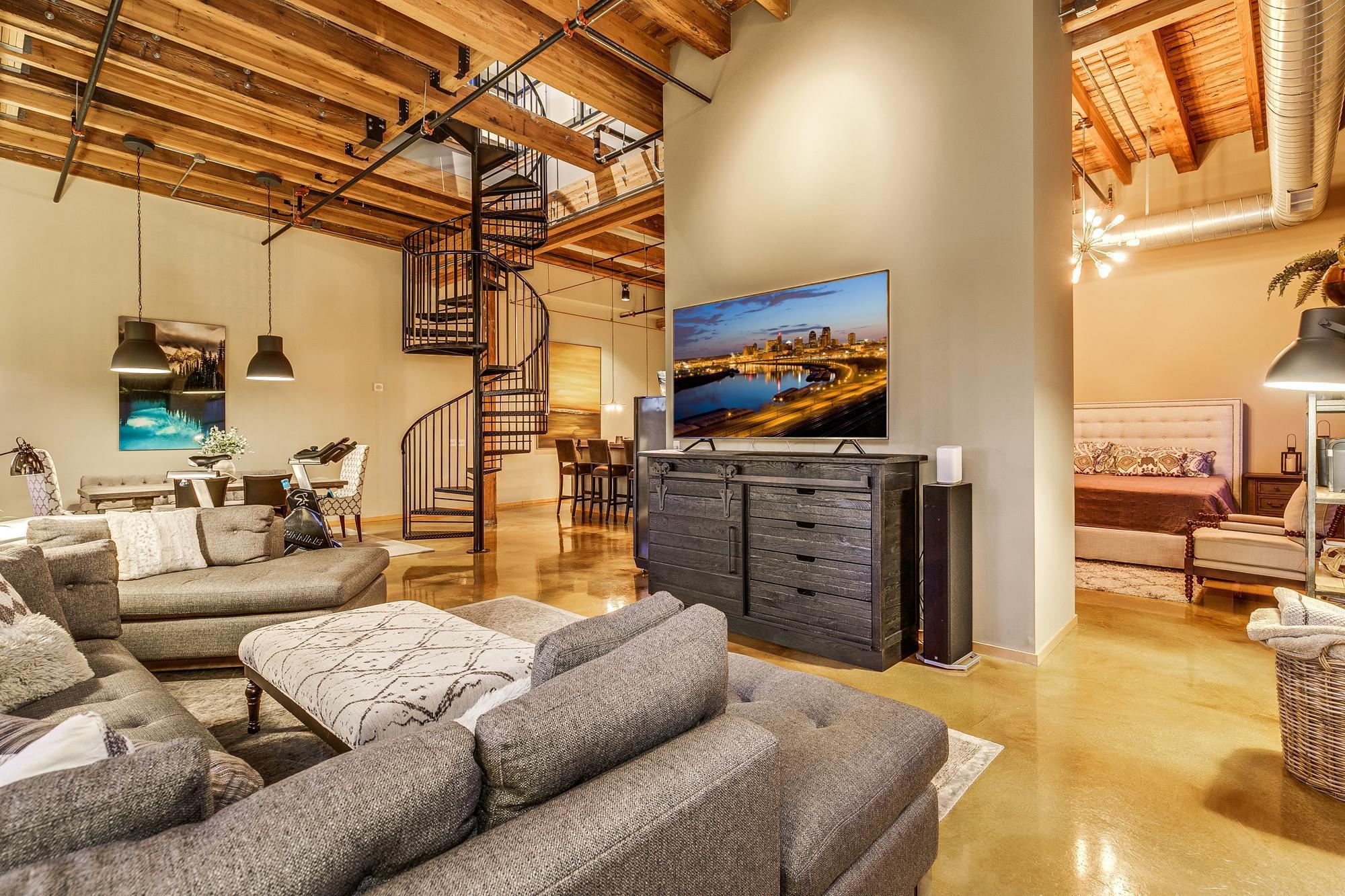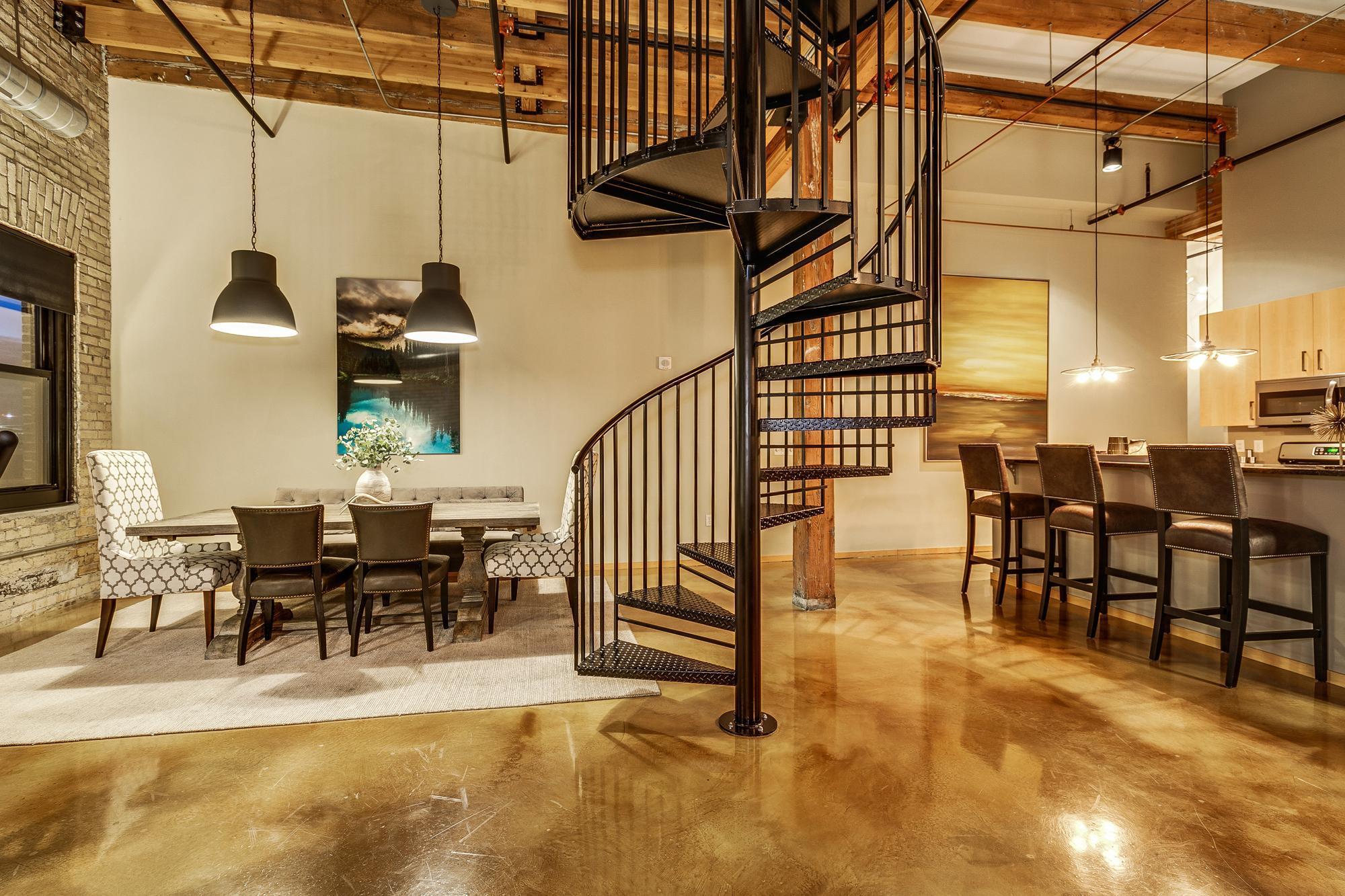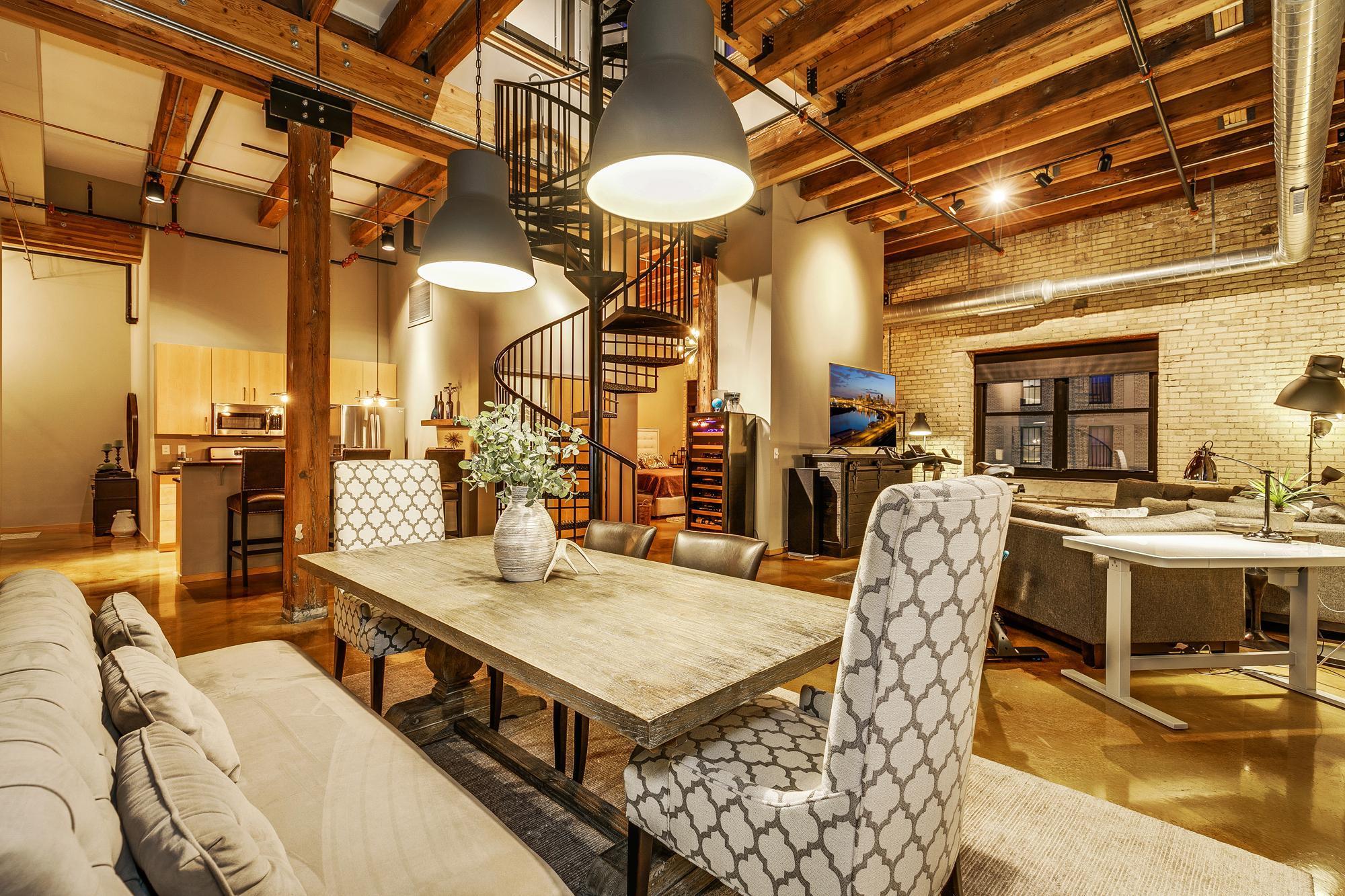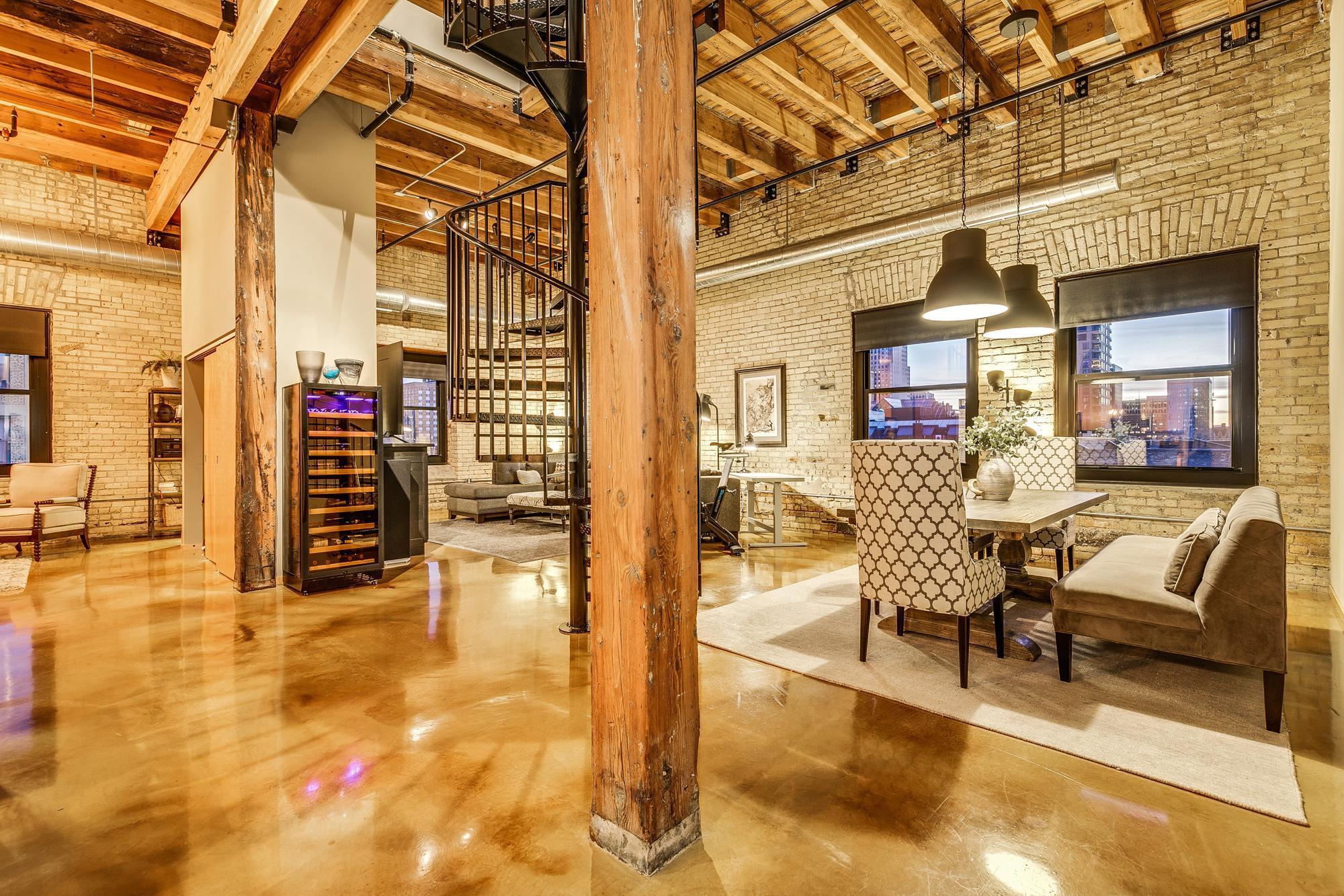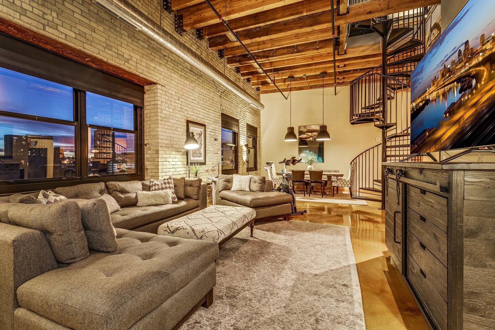 7th-floor penthouse loft on the SW corner of Historic River Park Lofts, overlooking Mears Park, CHS Fields in Lowertown! Every Saints game you can enjoy the fireworks off your large wrap-around patio!! Wait till you see the views. The unit boasts exposed brick & beams, gorgeous stained concrete floors, high ceilings, true open loft. Main level living with large wide-open spaces & spiral staircase to 2nd level with 2nd bedroom, 3/4 bath, sitting room, & fabulous corner wrap-around rooftop deck with panoramic city views. Heated indoor parking (In the building and not in the ramp next door)for 2 cars and a storage locker included. Walk to the farmers market, ballpark, river, light rail, exciting restaurants, great shops, and more. This building is pet-approved and has 2 dog parks very close by. Community spaces, inclusive of Community room/business center and fitness facility on G level of the building. Skyway access is on the 2nd floor of the building. Owners only pay for electricity! Heating, air conditioning, internet, cable, snow removal, water/sewer, security, and all other amenities are included in the monthly association fee. River Park Lofts offers homeowners safety, security, on-site property management, and heated and secured parking. Modern living paired with pieces of historic architecture.