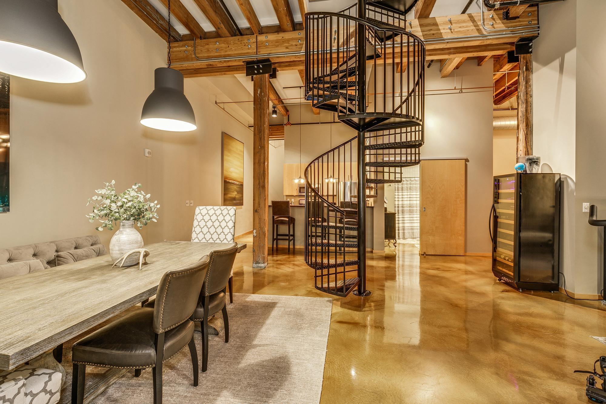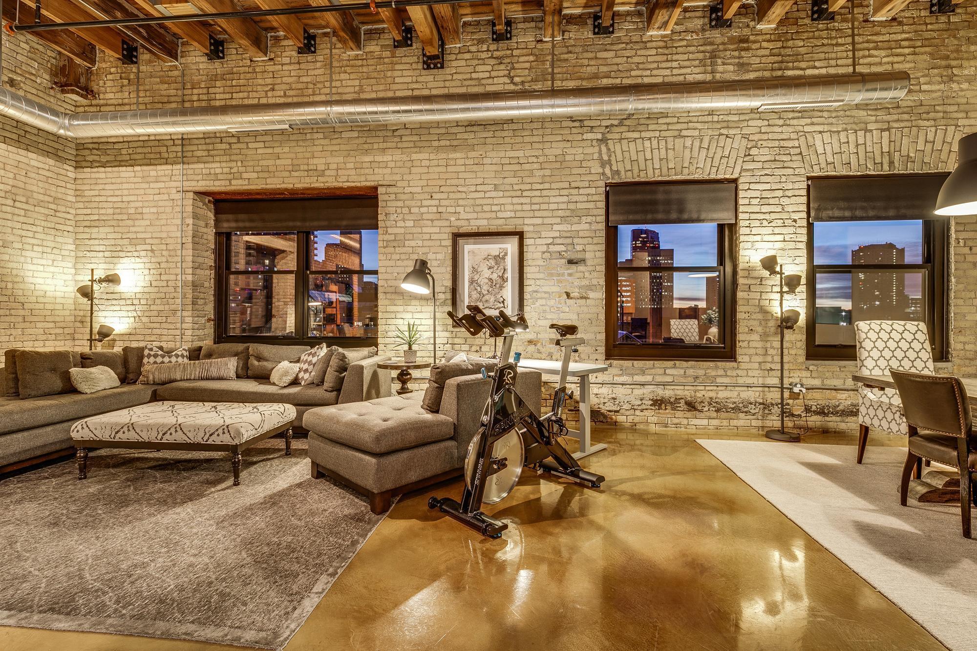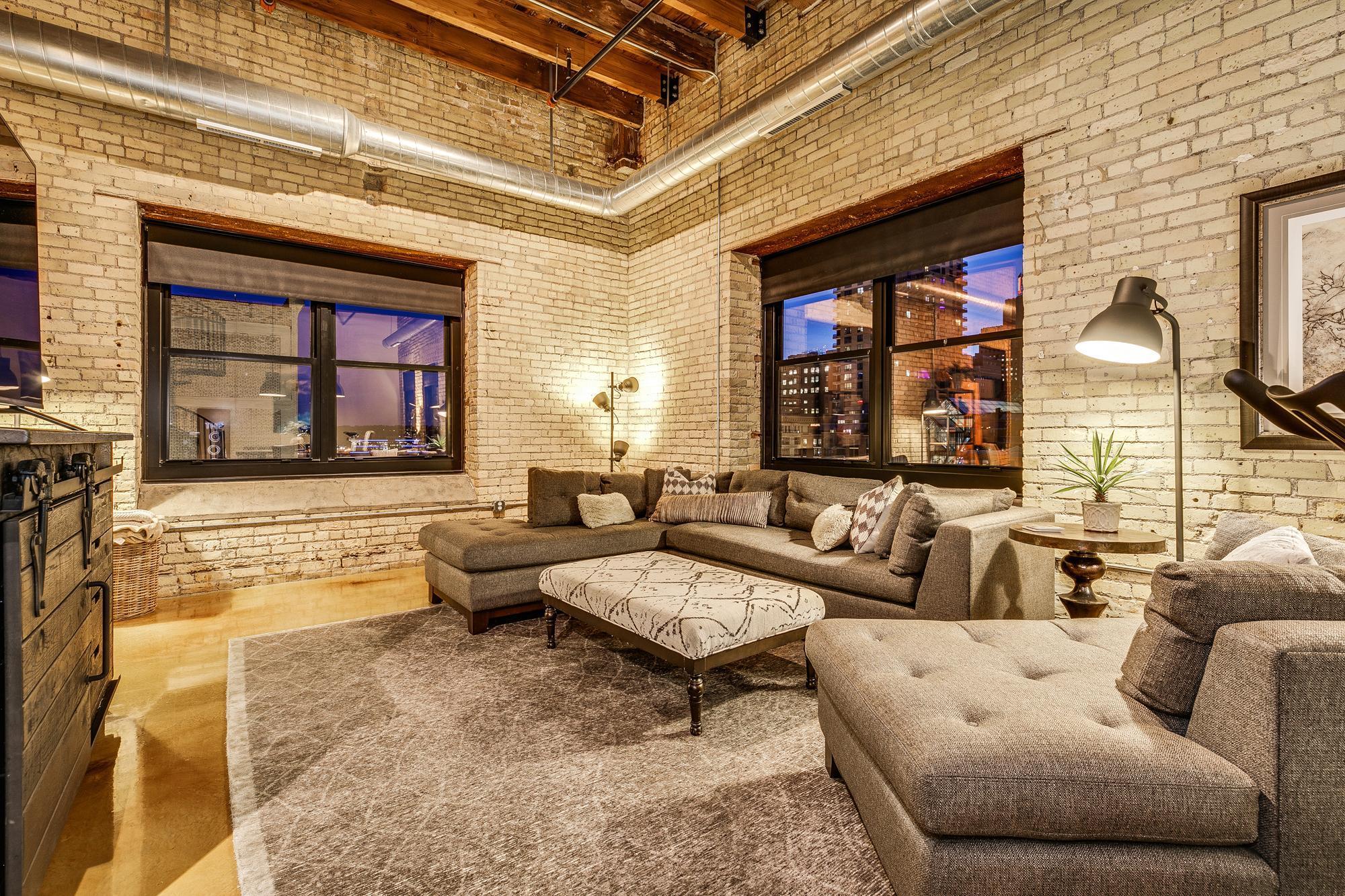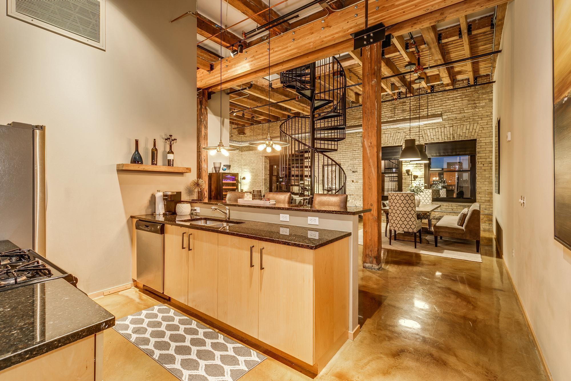 7th-floor penthouse loft on the SW corner of Historic River Park Lofts, overlooking Mears Park, CHS Fields in Lowertown! Every Saints game you can enjoy the fireworks off your large wrap-around patio!! Wait till you see the views. The unit boasts exposed brick & beams, gorgeous stained concrete floors, high ceilings, true open loft. Main level living with large wide-open spaces & spiral staircase to 2nd level with 2nd bedroom, 3/4 bath, sitting room, & fabulous corner wrap-around rooftop deck with panoramic city views. Heated indoor parking (In the building and not in the ramp next door)for 2 cars and a storage locker included. Walk to the farmers market, ballpark, river, light rail, exciting restaurants, great shops, and more. This building is pet-approved and has 2 dog parks very close by. Community spaces, inclusive of Community room/business center and fitness facility on G level of the building. Skyway access is on the 2nd floor of the building. Owners only pay for electricity! Heating, air conditioning, internet, cable, snow removal, water/sewer, security, and all other amenities are included in the monthly association fee. River Park Lofts offers homeowners safety, security, on-site property management, and heated and secured parking. Modern living paired with pieces of historic architecture.