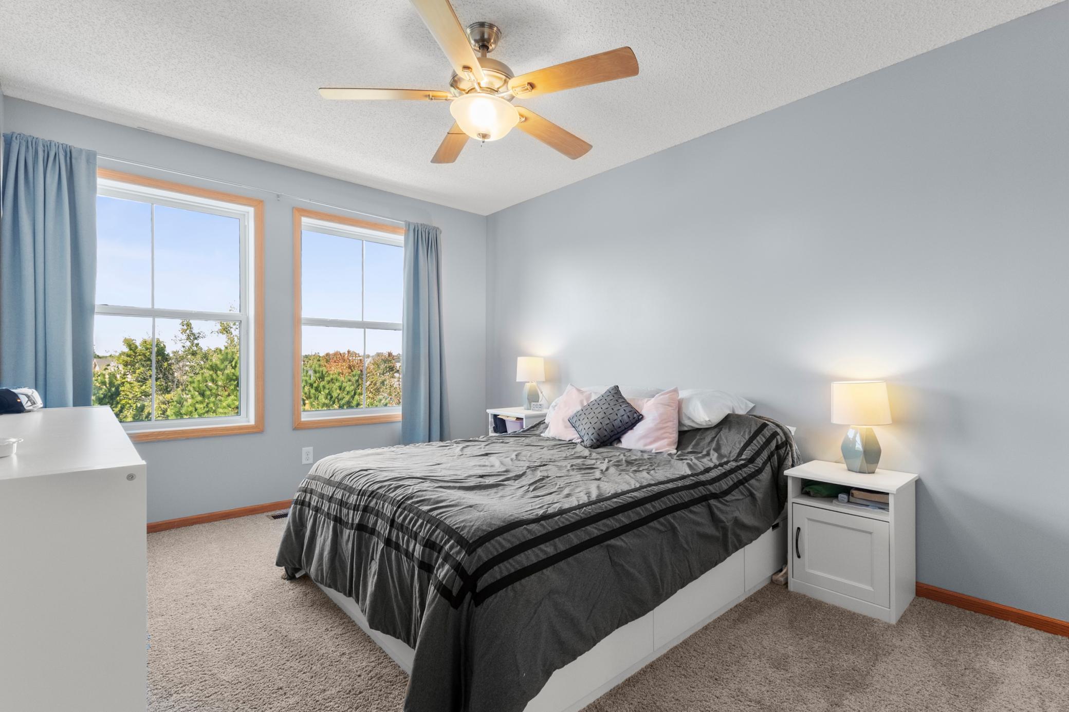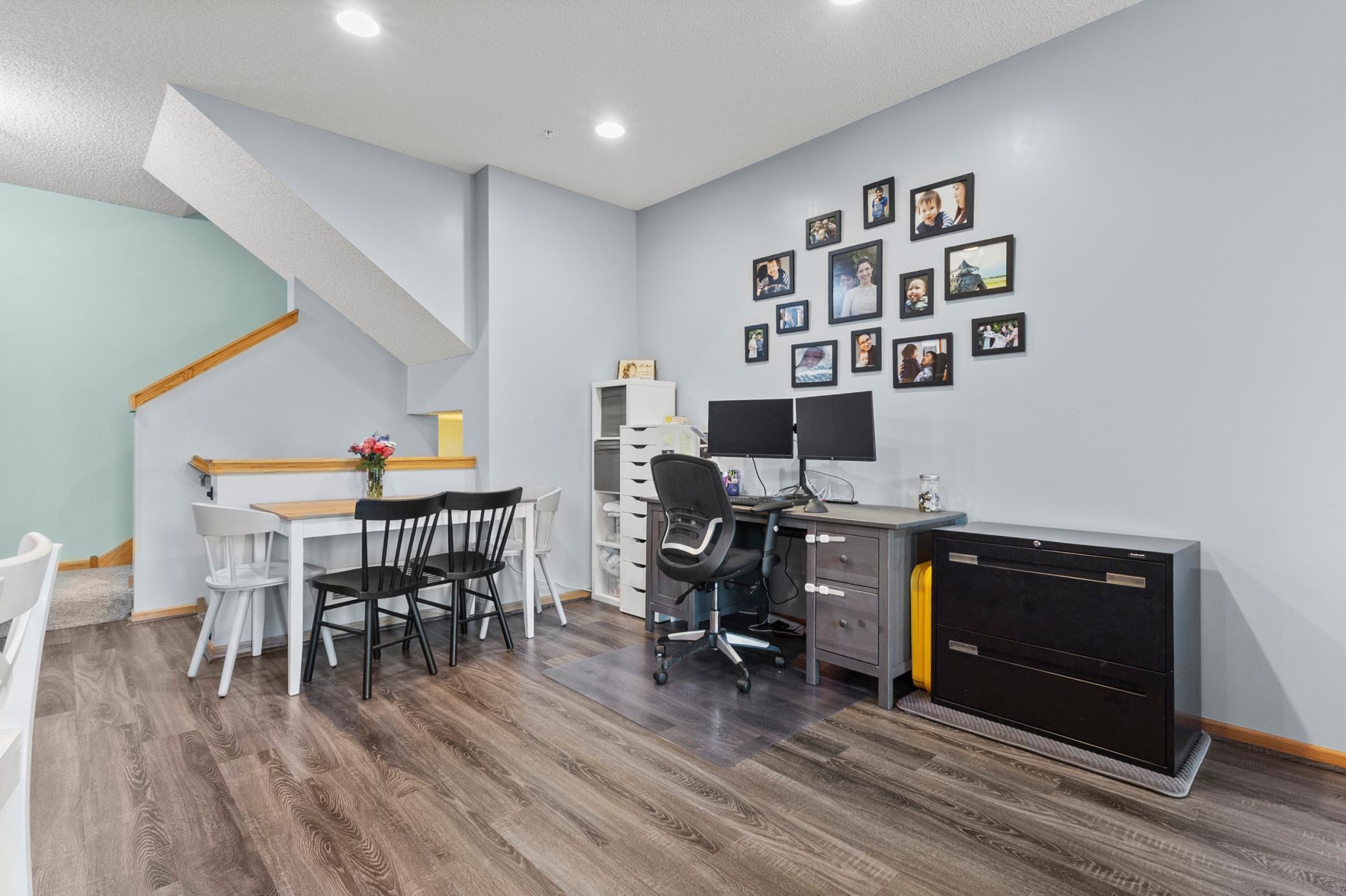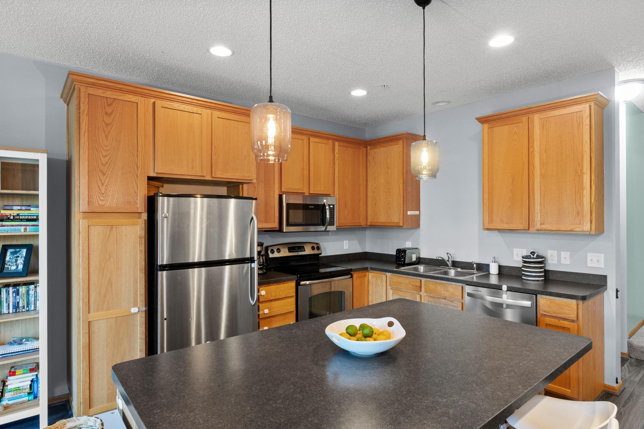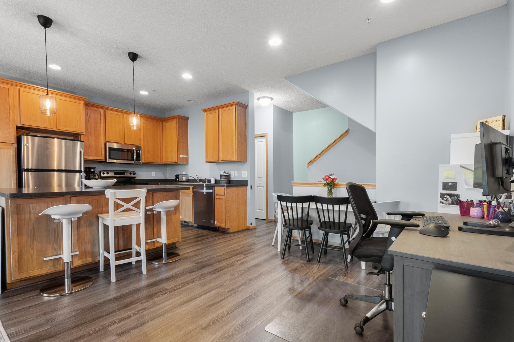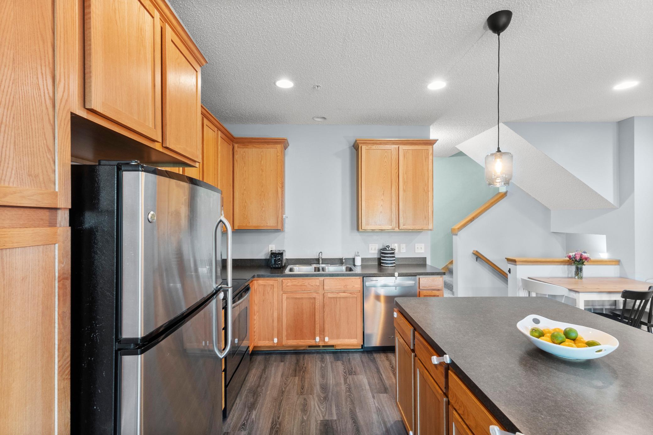 Welcome to modern townhome living in Hugo! Discover this beautifully maintained home offering the ideal blend of comfort, style, and convenience, featuring an open concept main floor with generous natural light, perfect for entertaining or relaxing. The kitchen features ample counterspace making it ideal for cooking or baking to your heart's content. This level is also home to a half bath for added convenience, and a sizeable deck for outdoor enjoyment. Upstairs, you'll find a loft which makes the perfect family room/play area, as well as the spacious primary bedroom with walk-through bathroom and oversized closet, and an additional bedroom and full bath. The lower level features plenty of storage space as well as an additional sitting room for an added living area. Recent updates include new paint, carpeting, and a new water heater. Nearby are your shared amenities: a basketball court, the playground, the swimming pool, and the fountain. With close proximity to shopping, parks, and commuter routes, this fresh and modern home is ready for you to move right in!