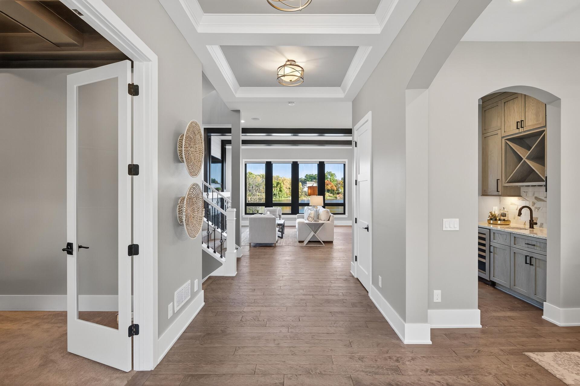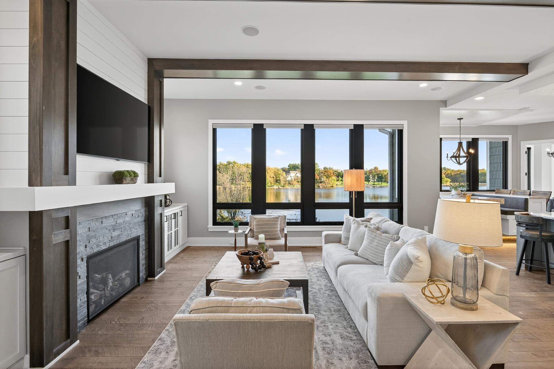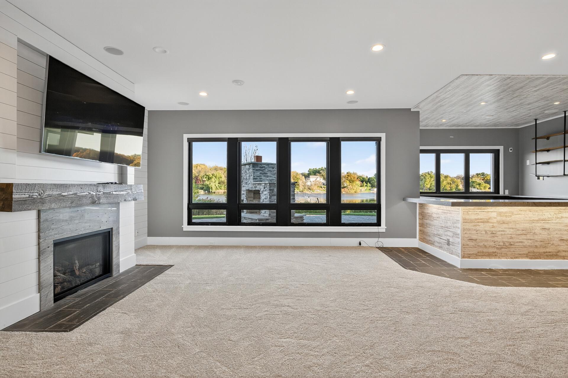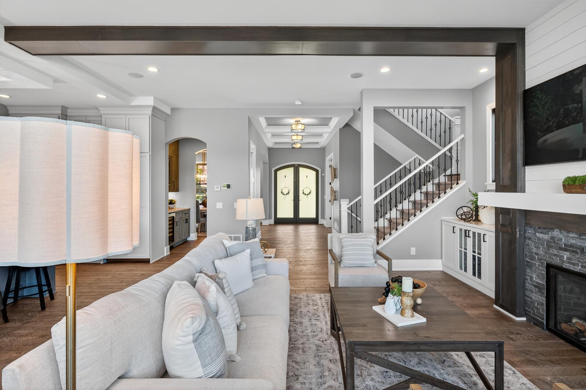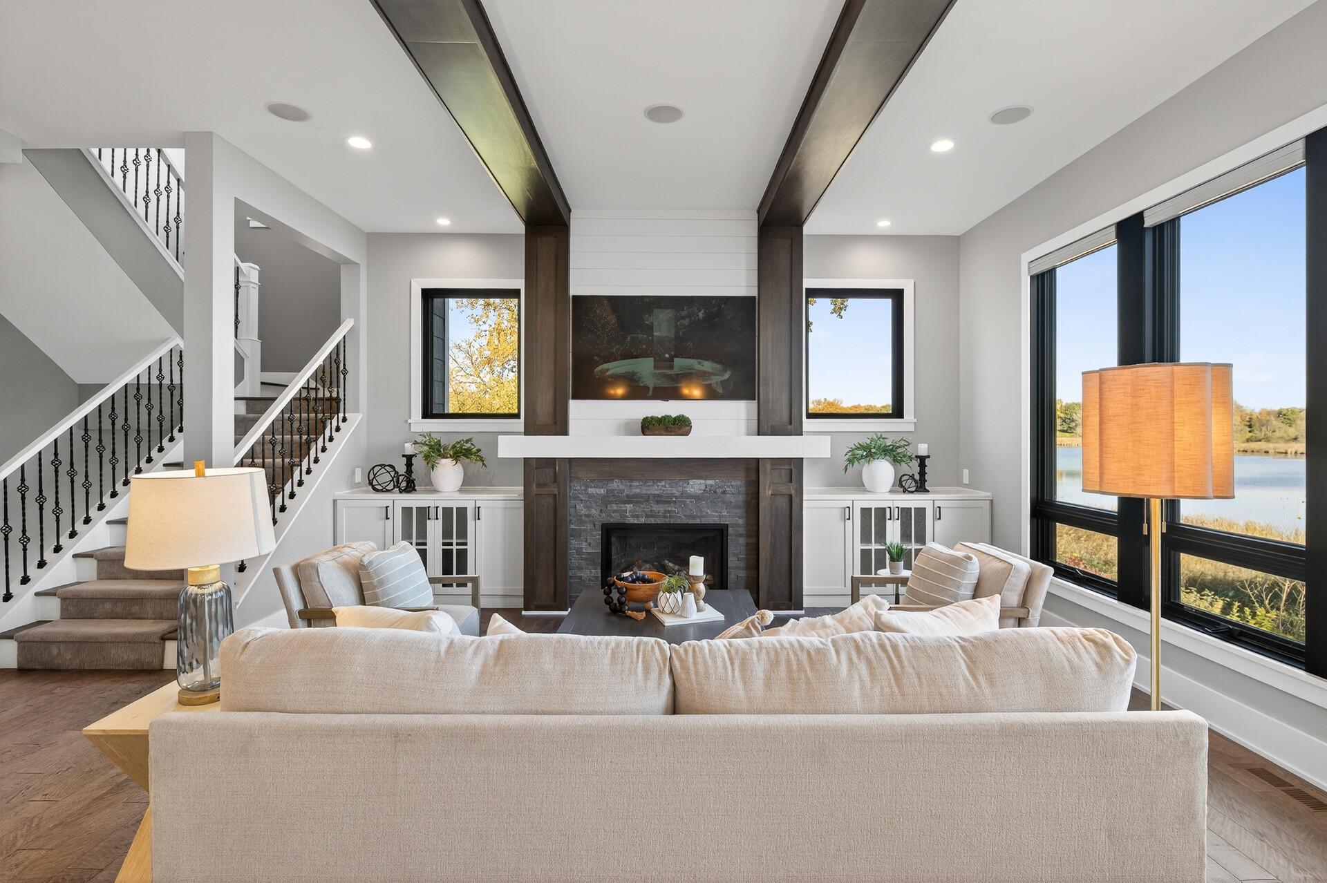 This stunning home blends timeless architecture with modern comfort. A covered front entry leads into a bright, open-concept main floor where oversized windows fill the great room with natural light. The gourmet kitchen features high-end finishes and flows seamlessly into the dining area — perfect for both entertaining and everyday living. A private main-floor office provides a quiet workspace, while the mudroom off the three-car garage helps keep life organized. Upstairs, the primary suite offers a spacious retreat with a spa-style bath that includes a soaking tub, walk-in shower, and large walk-in closet. Four additional bedrooms, a loft lounge, and a convenient laundry room complete the upper level. The walkout lower level adds exceptional living and recreation space with a large family room, full wet bar with commercial-grade appliances, a grilling room, guest bedroom, and a sport court with scoreboard. Direct access to the backyard and Boat House enhances indoor-outdoor living and entertaining. Combining style, space, and versatility, this home is ideal for modern living — whether for family life, remote work, or recreation.