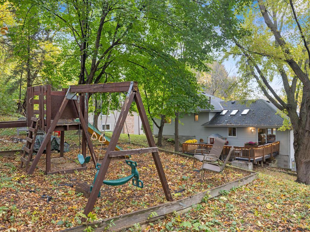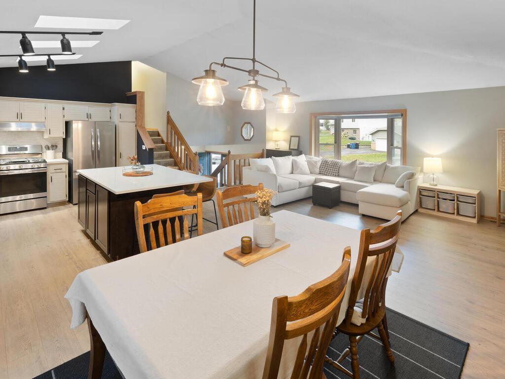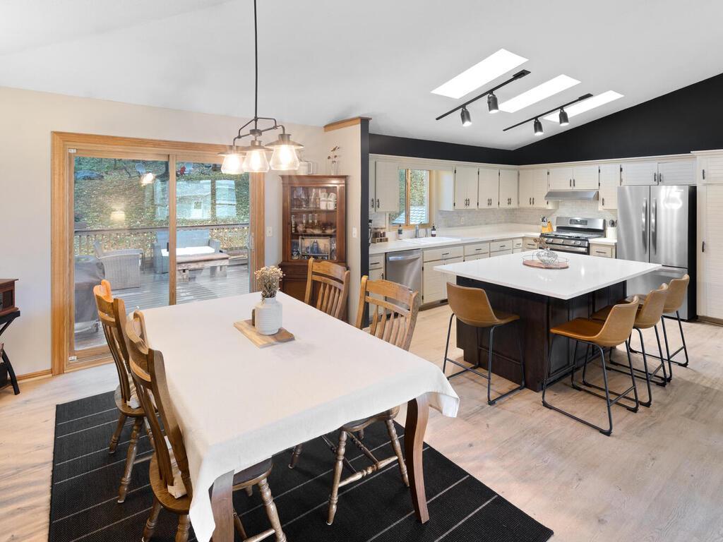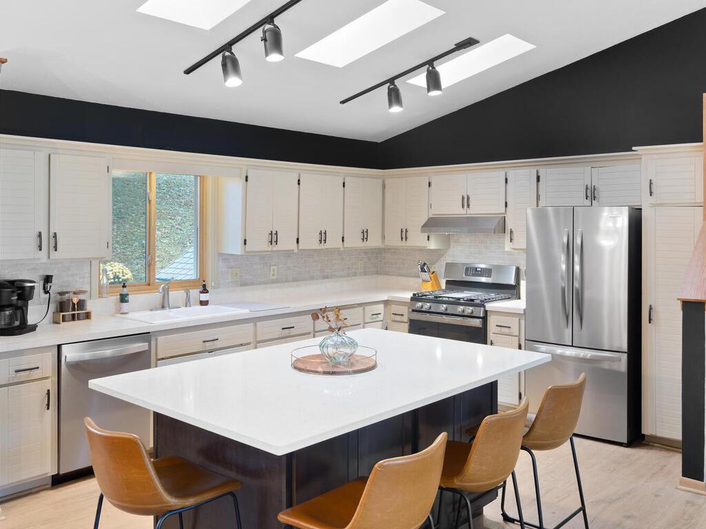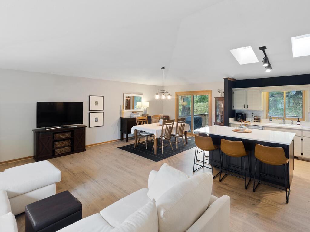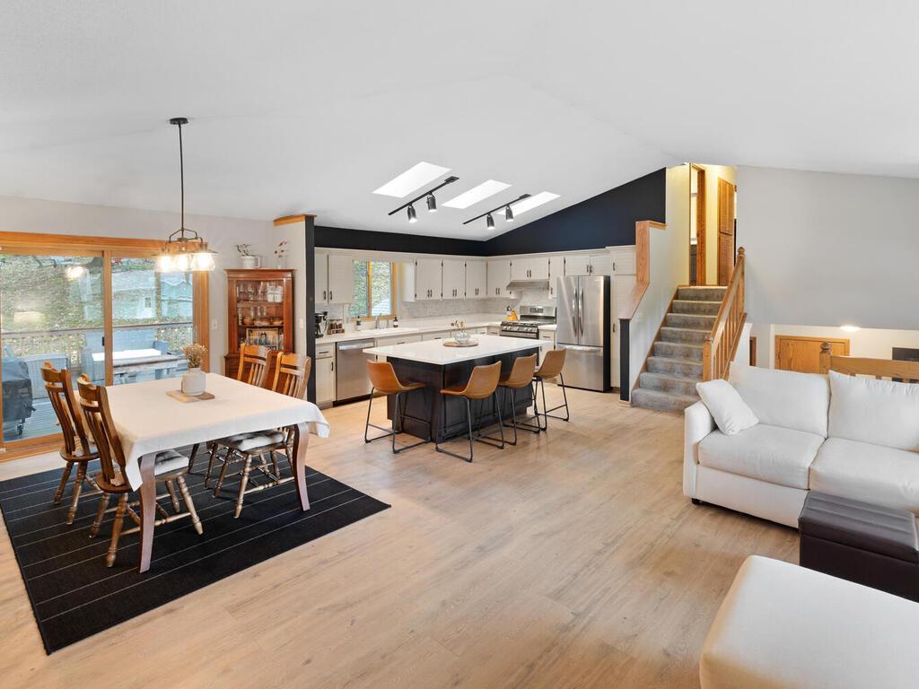 Beautifully updated home with a bright, open layout! The remodeled kitchen features a large center island and flows seamlessly into the living and dining areas-perfect for entertaining. Step outside to the deck and enjoy peaceful views of the treed backyard. Vaulted ceilings and skylights fill the space with natural light. Three bedrooms on one level offer comfort and convenience, including a private primary suite with a remodeled bath and laundry room on the same level. The lower level boasts a cozy family room with a wood-burning fireplace, ideal for gatherings. Immaculate condition with stylish updates throughout - truly move-in ready. Fantastic location within walking distance to Bass Lake Playfield, parks, and trails. A perfect blend of modern design and everyday comfort!
