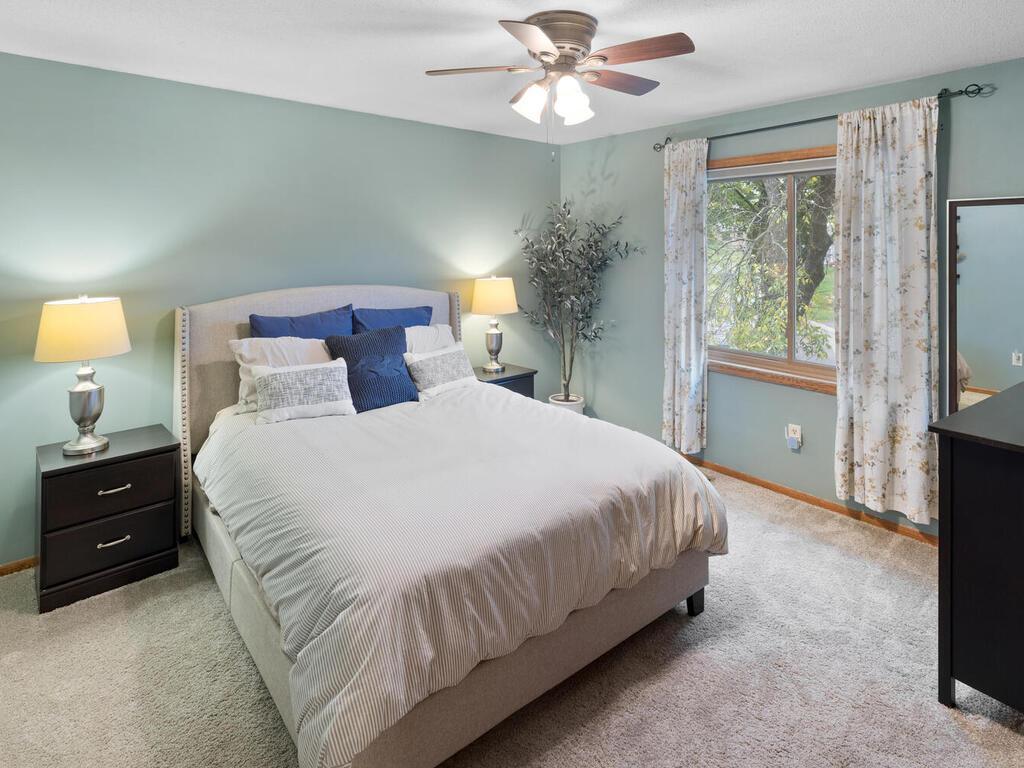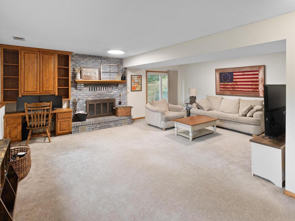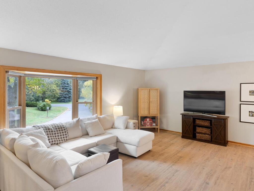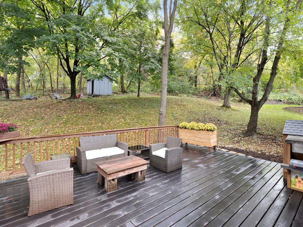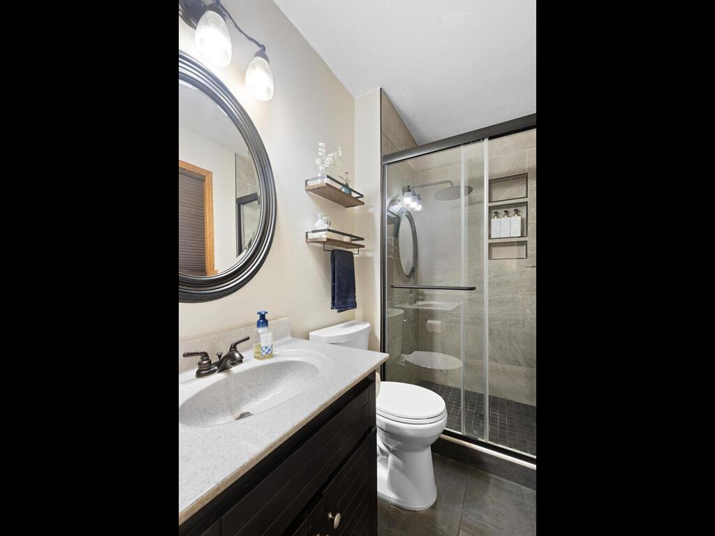 Beautifully updated home with a bright, open layout! The remodeled kitchen features a large center island and flows seamlessly into the living and dining areas-perfect for entertaining. Step outside to the deck and enjoy peaceful views of the treed backyard. Vaulted ceilings and skylights fill the space with natural light. Three bedrooms on one level offer comfort and convenience, including a private primary suite with a remodeled bath and laundry room on the same level. The lower level boasts a cozy family room with a wood-burning fireplace, ideal for gatherings. Immaculate condition with stylish updates throughout - truly move-in ready. Fantastic location within walking distance to Bass Lake Playfield, parks, and trails. A perfect blend of modern design and everyday comfort!
