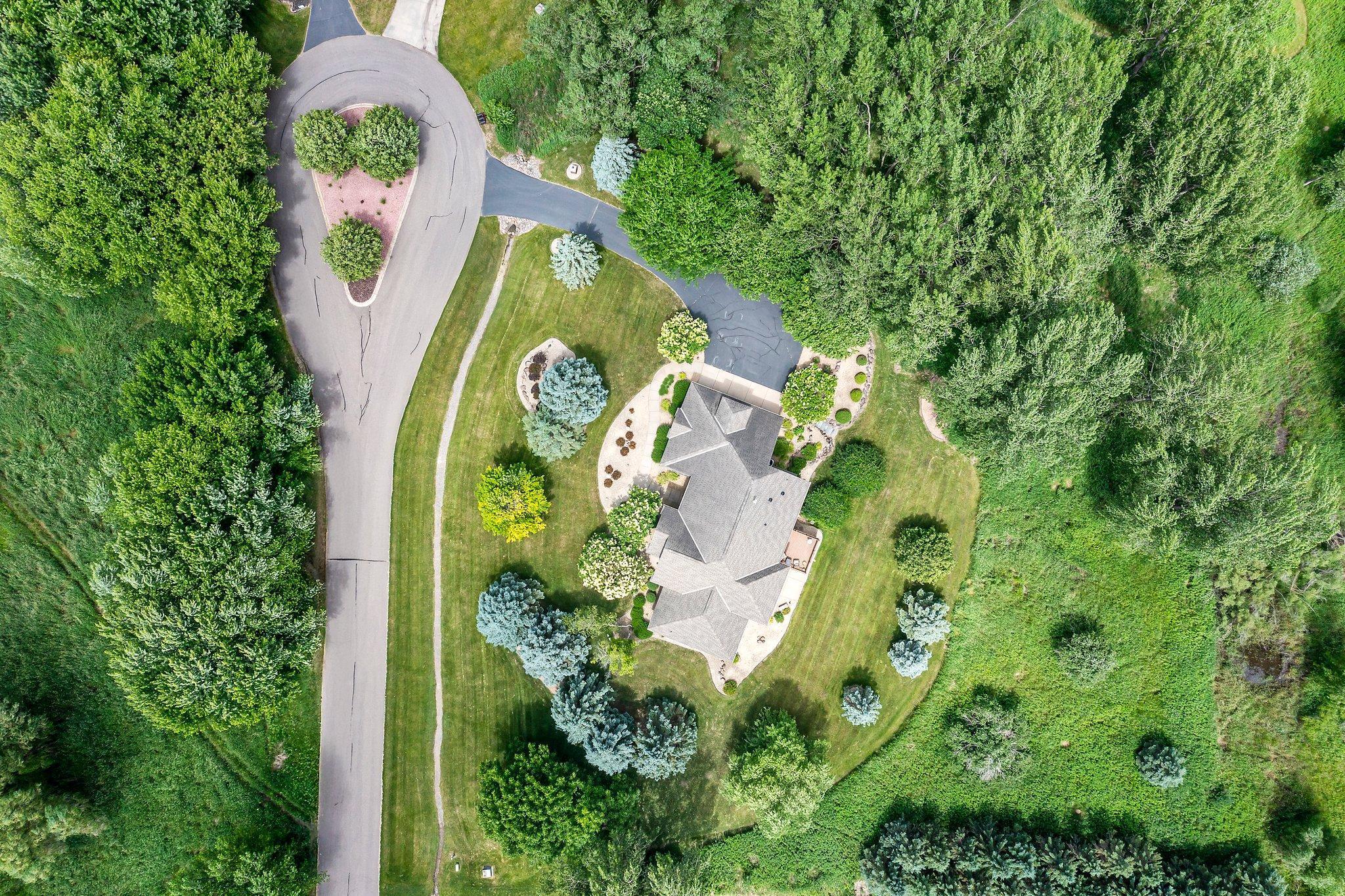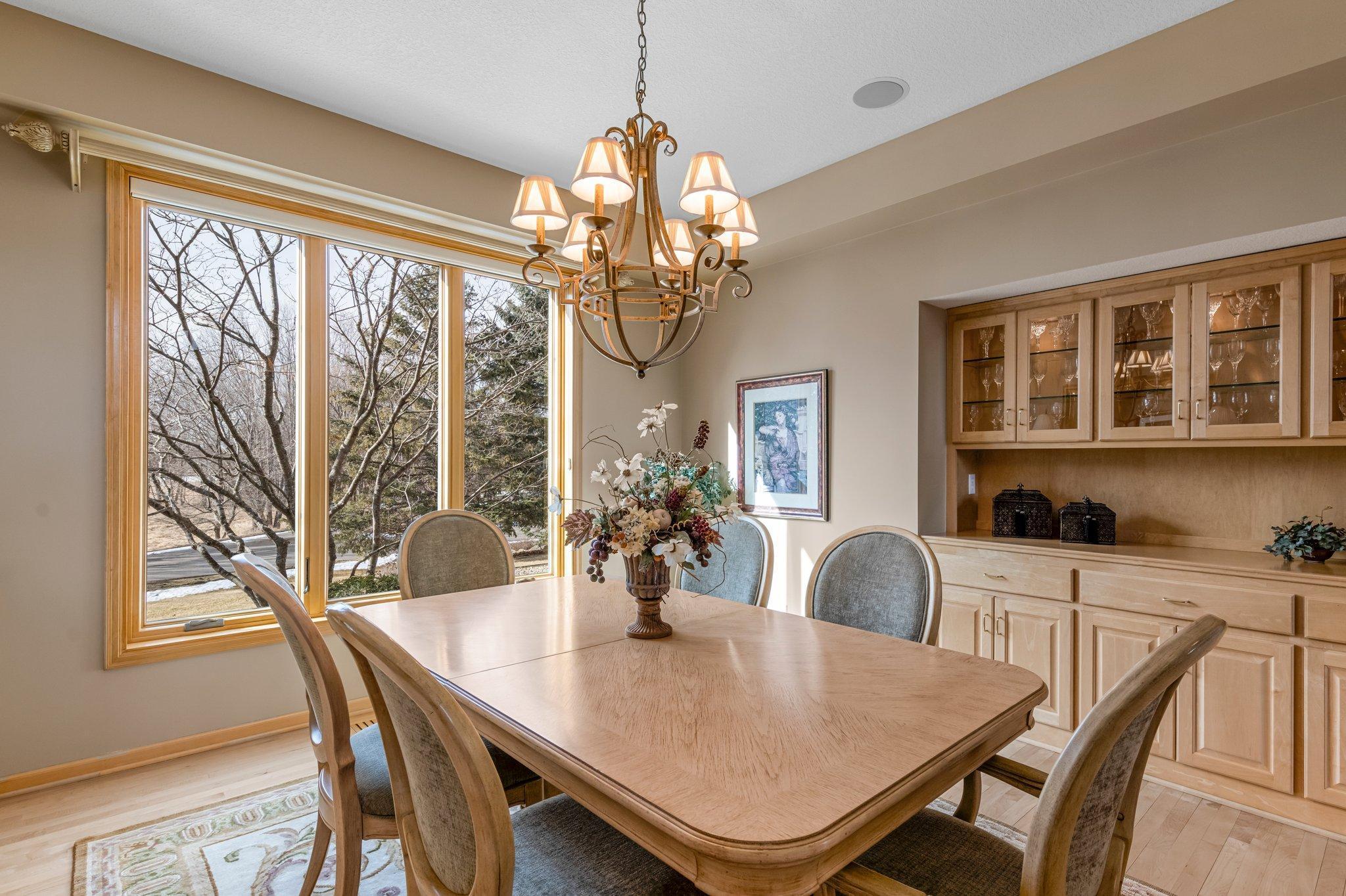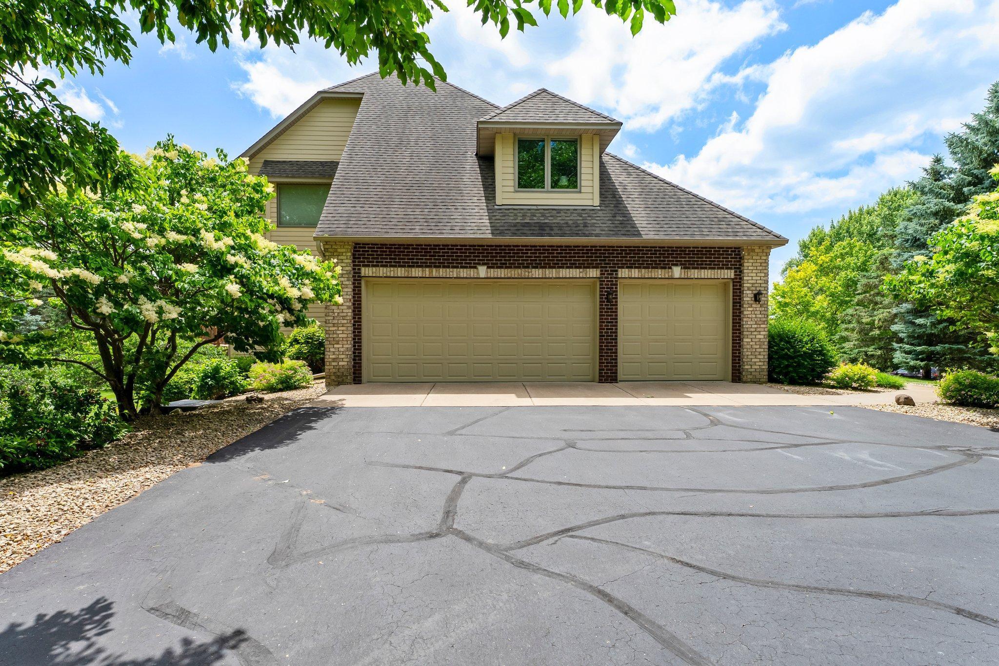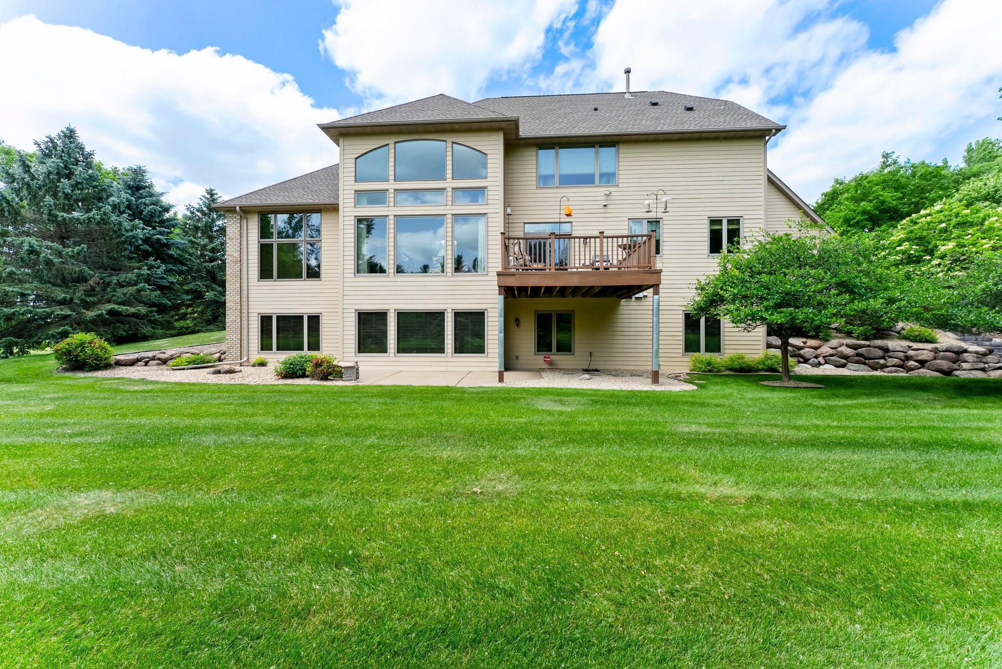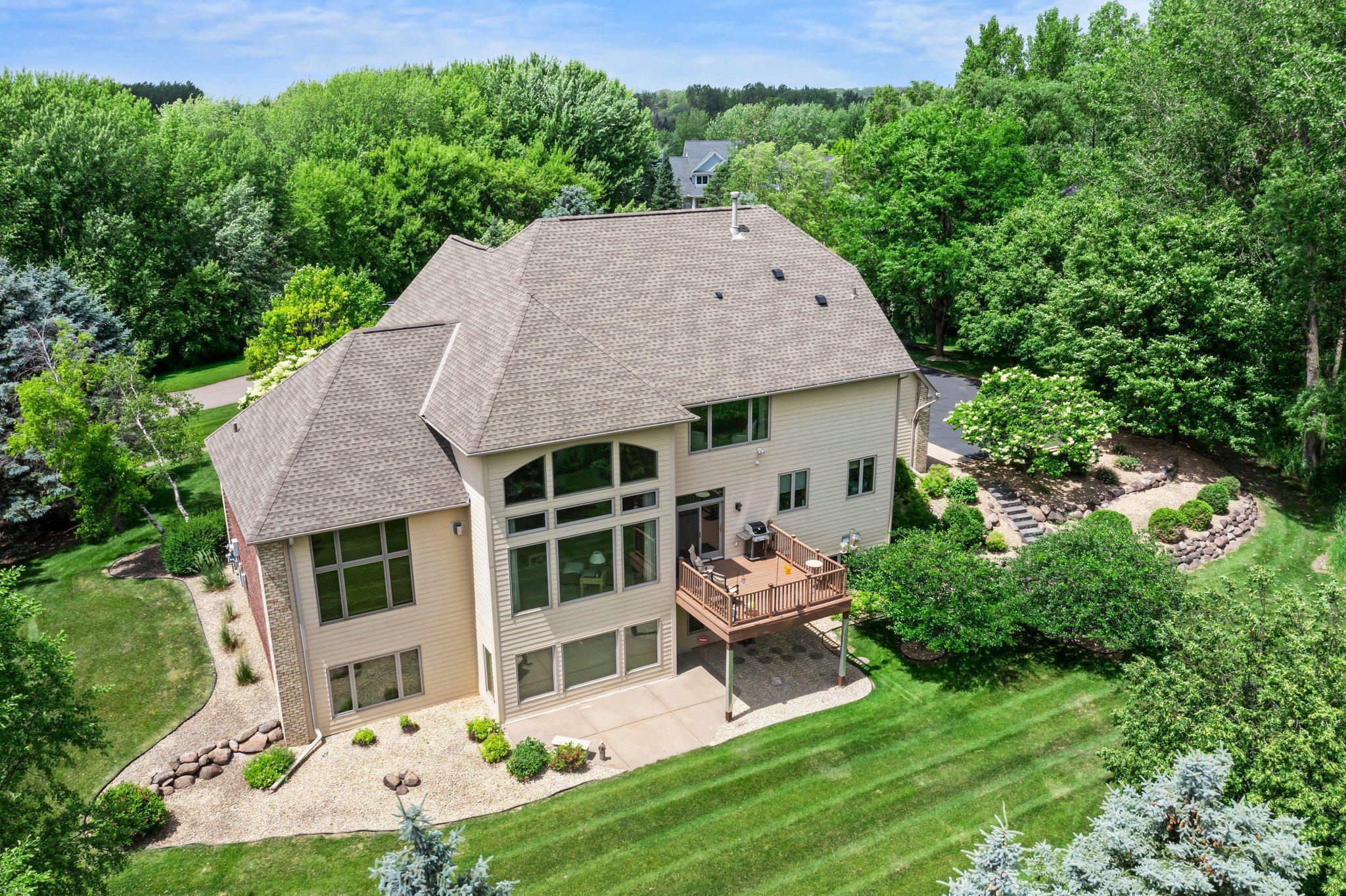 This meticulously maintained, stunning custom-built 5-bedroom, 4-bathroom home is nestled on a peaceful cul-de-sac in Dellwood, offering modern convenience and tranquil, nature-filled surroundings. The kitchen is a chef's dream with beautiful wood flooring, natural maple cabinetry, and granite countertops. A spacious center island boasts a built-in Wolf range cooktop and breakfast bar seating. Stainless steel appliances, including a double wall oven, reverse osmosis water system, and a 5x4 pantry, are complemented by a stunning tile backsplash. Adjacent to the kitchen, the informal dining room features elegant wood flooring, a stylish chandelier, and seamless access to the maintenance-free 14x14 deck—perfect for indoor-outdoor entertaining. The spacious living room has soaring 18-foot ceilings and floor-to-ceiling windows filling the space with natural light. Plush carpeting, a double-sided gas fireplace with a tile surround, and custom maple built-ins enhance the space. The main-level den features glass French doors, plush carpeting, a wet bar, and a double-sided gas fireplace shared with the living room. Large windows on both ends allow natural light in, creating a bright, inviting space. The formal dining room has wood flooring, a chandelier, and a built-in buffet. Large windows provide ample light. The main-floor laundry room, located off the kitchen, includes a utility sink, generous counter space, and ample cabinetry. On the upper level, the spacious primary suite boasts tray ceilings, a ceiling fan, large windows, and plush carpeting. It includes a 21x10 walk-in closet with built-ins. The luxurious en-suite has a jetted bathtub, a large tiled walk-in shower, and a double vanity with generous storage. Bedroom two is carpeted and includes a 6x5 walk-in closet. It shares a Jack and Jill bathroom with bedroom three, each with a private vanity. The shared full bathroom is separated by pocket doors, offering privacy while providing access to the shared tub/shower combo. Bedroom three is spacious, featuring dual closets and a cozy nook with a window overlooking the side of the home. The lower level, with carpeting throughout, offers a spacious recreation area with large windows and walk-out access to the backyard patio. Adjacent is a wet bar area with silestone countertops, a two-tiered bar with high-top seating, ample cabinet space, a sink, and a small fridge—perfect for entertaining. The lower level also includes a versatile exercise room or flex space with French doors and a mirrored wall. Bedrooms four and five both feature 5x5 walk-in closets and backyard views, just steps from the shared ¾ bathroom. The bathroom has tiled floors, a single vanity with storage, and a walk-in shower. The attached, heated, finished, and insulated three-car garage boasts epoxy flooring and hot and cold running water, ensuring year-round vehicle protection. The garage entrance opens into a tiled mudroom with built-in cabinetry, a walk-in closet with shelving, and coat racks, along with a nearby ½ bathroom. Additional features include a security system, a new furnace air exchanger (2025), Anderson windows, an added Kinetico water system (2024), and a new water pump (2024). The home also has three-zone heating and cooling, a central vacuum system, and stereo surround sound speakers throughout. Located in the highly sought-after Mahtomedi School District, this home is just a short drive from shopping, dining, Dellwood Country Club, Oneka Ridge Golf Course, White Bear Lake, and several parks.