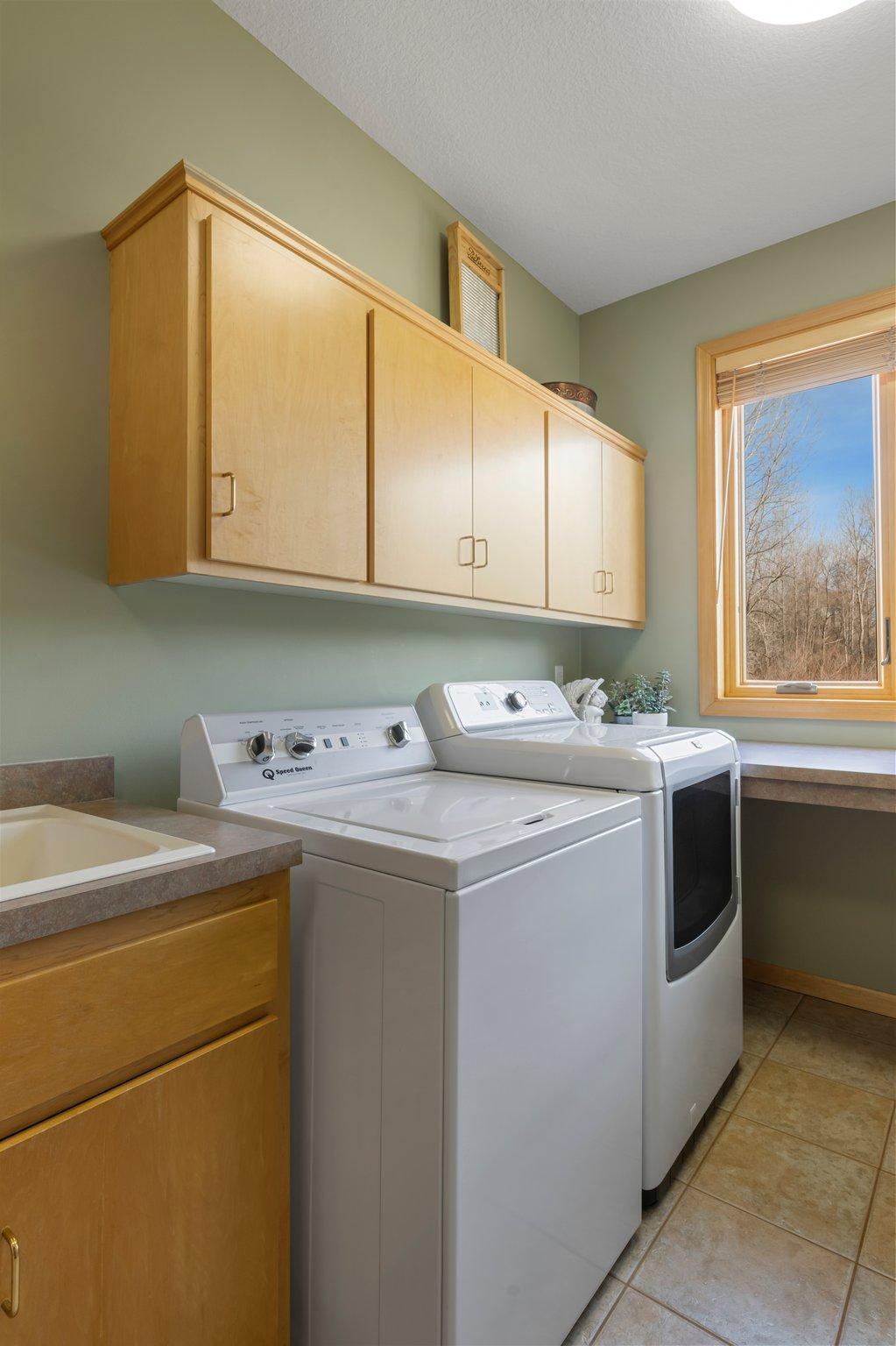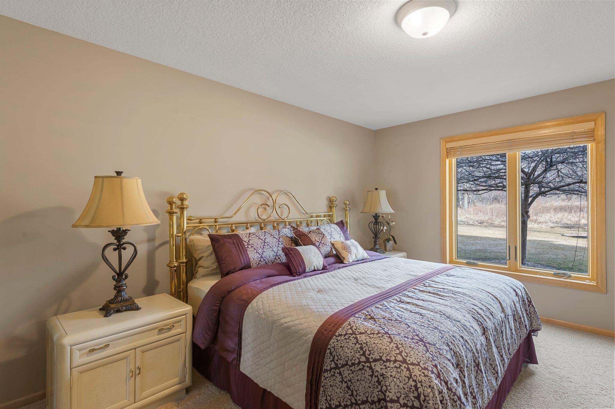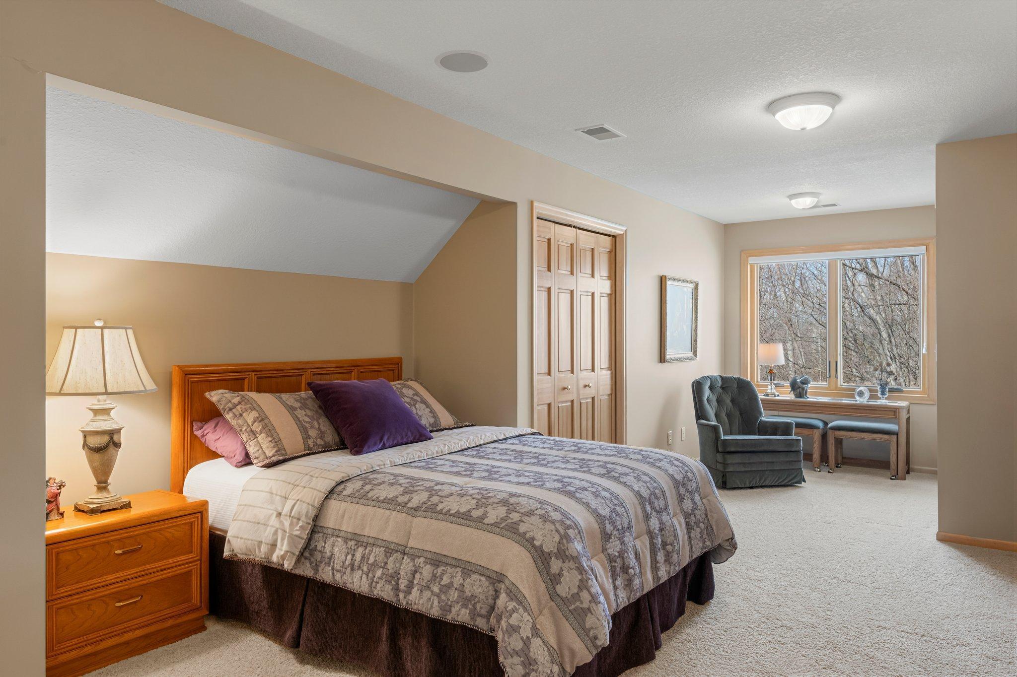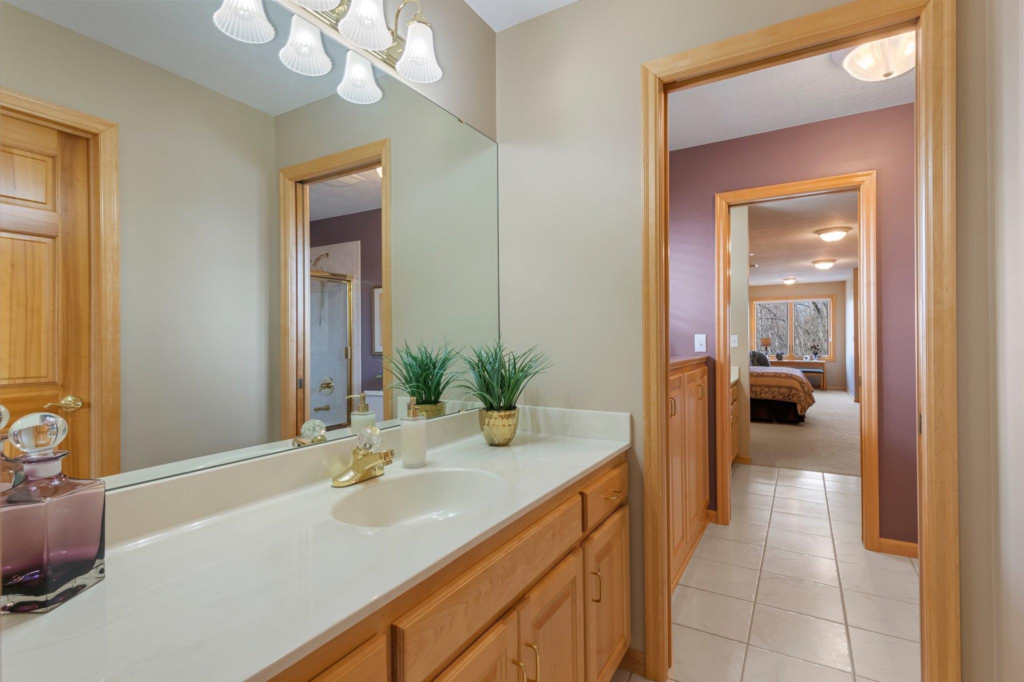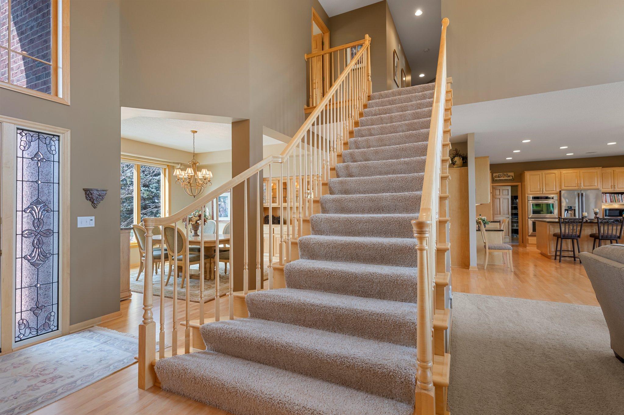This meticulously maintained, stunning custom-built 5-bedroom, 4-bathroom home is nestled on a peaceful cul-de-sac in Dellwood, offering modern convenience and tranquil, nature-filled surroundings. The kitchen is a chef's dream with beautiful wood flooring, natural maple cabinetry, and granite countertops. A spacious center island boasts a built-in Wolf range cooktop and breakfast bar seating. Stainless steel appliances, including a double wall oven, reverse osmosis water system, and a 5x4 pantry, are complemented by a stunning tile backsplash. Adjacent to the kitchen, the informal dining room features elegant wood flooring, a stylish chandelier, and seamless access to the maintenance-free 14x14 deck—perfect for indoor-outdoor entertaining. The spacious living room has soaring 18-foot ceilings and floor-to-ceiling windows filling the space with natural light. Plush carpeting, a double-sided gas fireplace with a tile surround, and custom maple built-ins enhance the space. The main-level den features glass French doors, plush carpeting, a wet bar, and a double-sided gas fireplace shared with the living room. Large windows on both ends allow natural light in, creating a bright, inviting space. The formal dining room has wood flooring, a chandelier, and a built-in buffet. Large windows provide ample light. The main-floor laundry room, located off the kitchen, includes a utility sink, generous counter space, and ample cabinetry. On the upper level, the spacious primary suite boasts tray ceilings, a ceiling fan, large windows, and plush carpeting. It includes a 21x10 walk-in closet with built-ins. The luxurious en-suite has a jetted bathtub, a large tiled walk-in shower, and a double vanity with generous storage. Bedroom two is carpeted and includes a 6x5 walk-in closet. It shares a Jack and Jill bathroom with bedroom three, each with a private vanity. The shared full bathroom is separated by pocket doors, offering privacy while providing access to the shared tub/shower combo. Bedroom three is spacious, featuring dual closets and a cozy nook with a window overlooking the side of the home. The lower level, with carpeting throughout, offers a spacious recreation area with large windows and walk-out access to the backyard patio. Adjacent is a wet bar area with silestone countertops, a two-tiered bar with high-top seating, ample cabinet space, a sink, and a small fridge—perfect for entertaining. The lower level also includes a versatile exercise room or flex space with French doors and a mirrored wall. Bedrooms four and five both feature 5x5 walk-in closets and backyard views, just steps from the shared ¾ bathroom. The bathroom has tiled floors, a single vanity with storage, and a walk-in shower. The attached, heated, finished, and insulated three-car garage boasts epoxy flooring and hot and cold running water, ensuring year-round vehicle protection. The garage entrance opens into a tiled mudroom with built-in cabinetry, a walk-in closet with shelving, and coat racks, along with a nearby ½ bathroom. Additional features include a security system, a new furnace air exchanger (2025), Anderson windows, an added Kinetico water system (2024), and a new water pump (2024). The home also has three-zone heating and cooling, a central vacuum system, and stereo surround sound speakers throughout. Located in the highly sought-after Mahtomedi School District, this home is just a short drive from shopping, dining, Dellwood Country Club, Oneka Ridge Golf Course, White Bear Lake, and several parks.