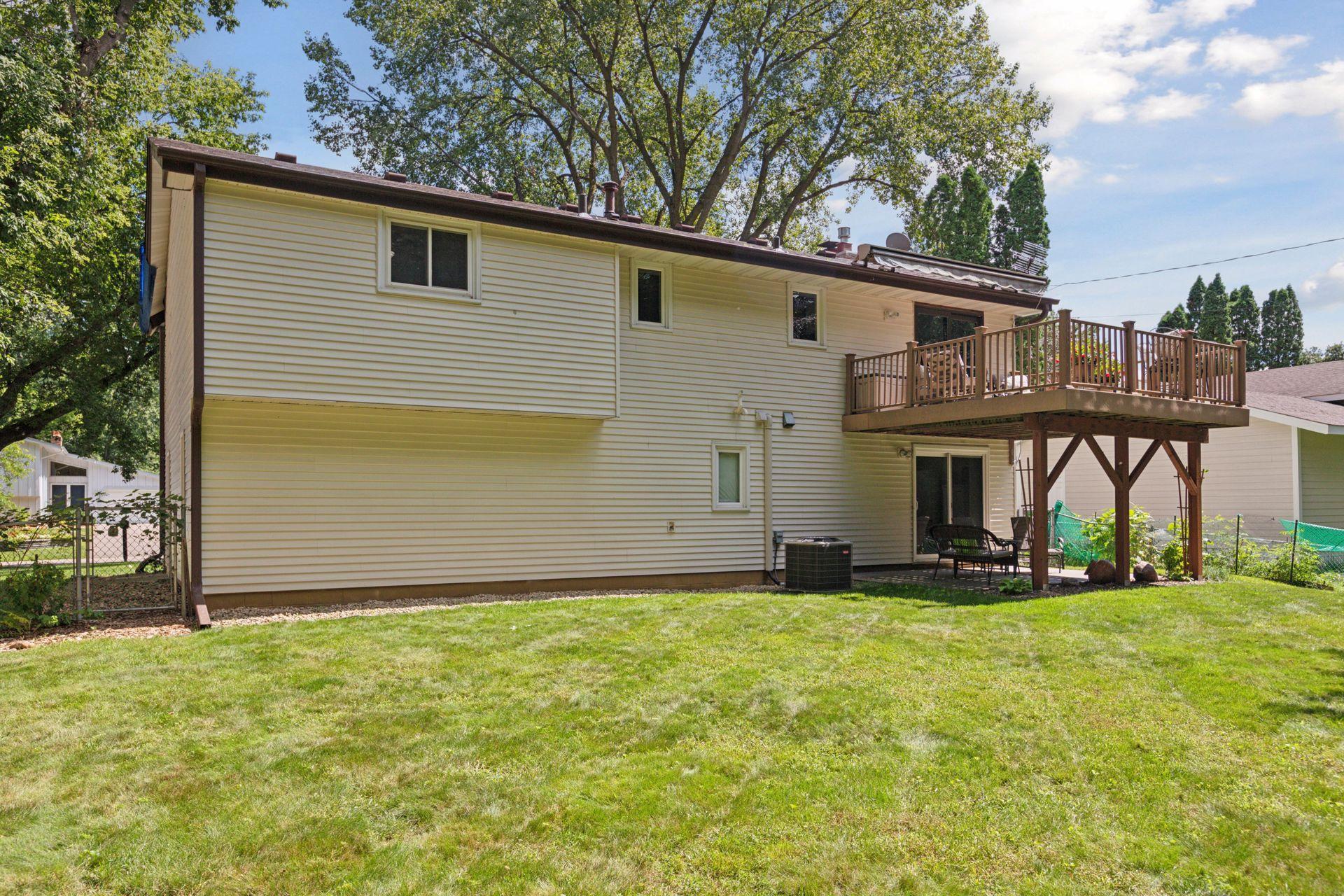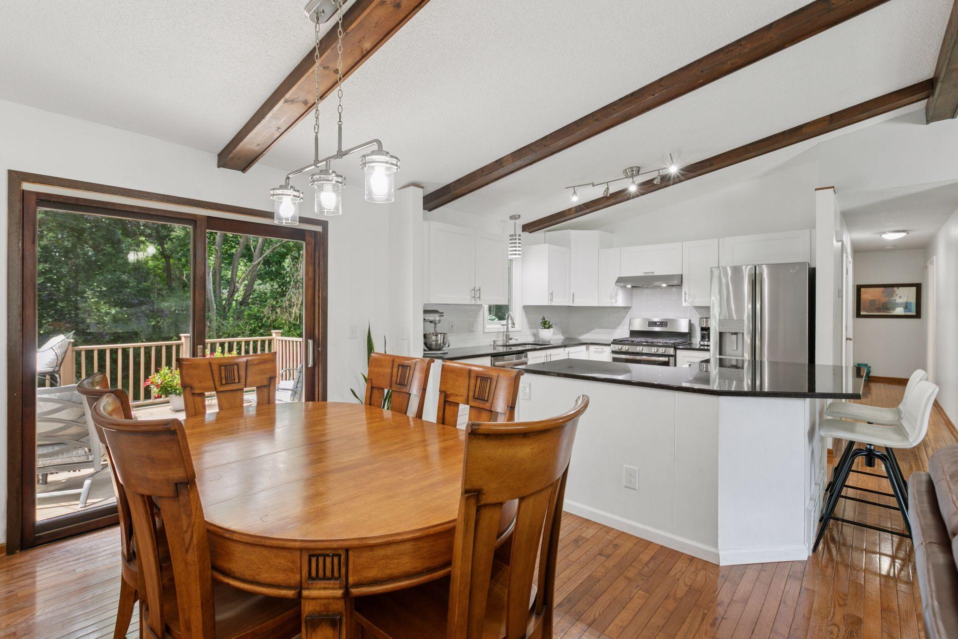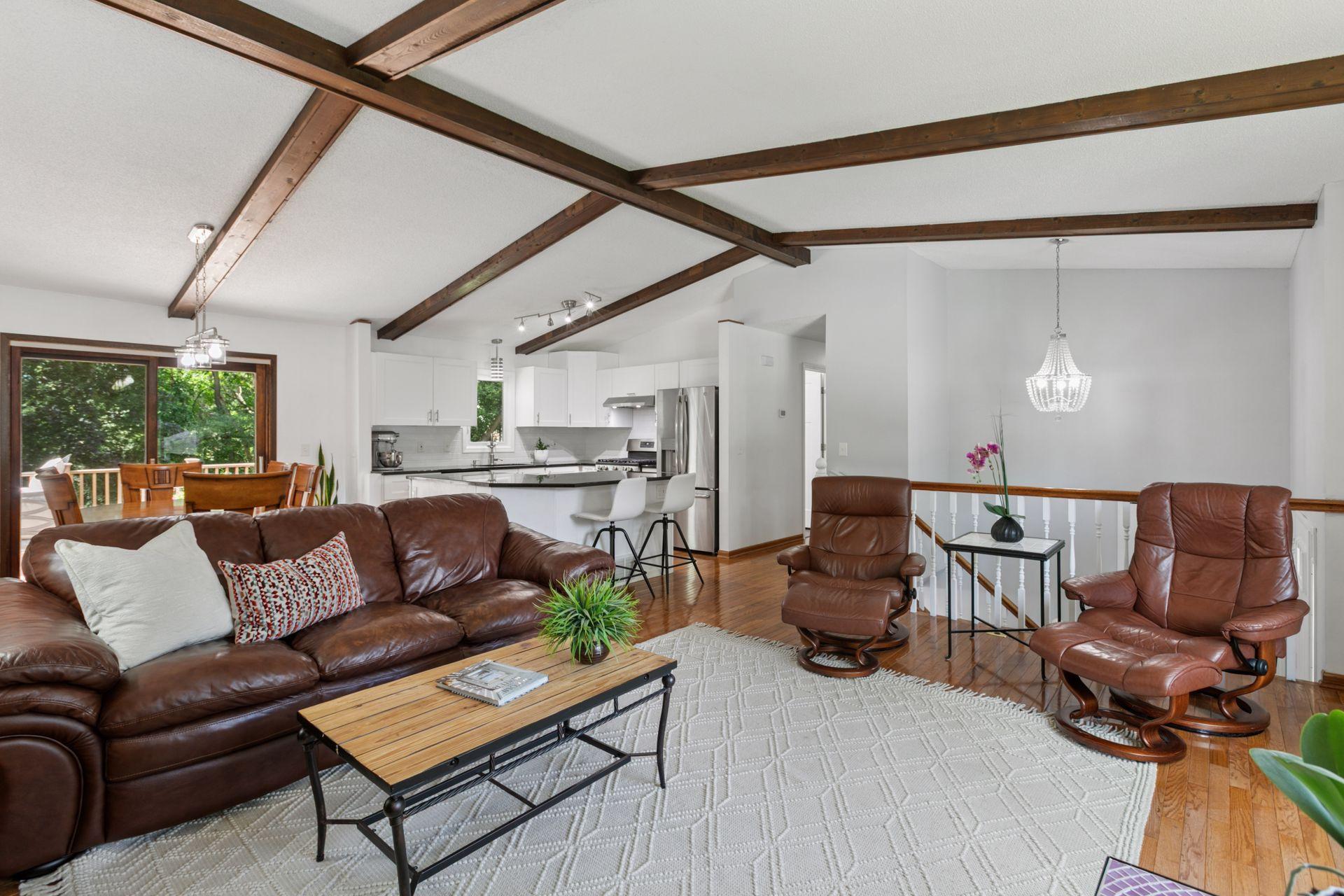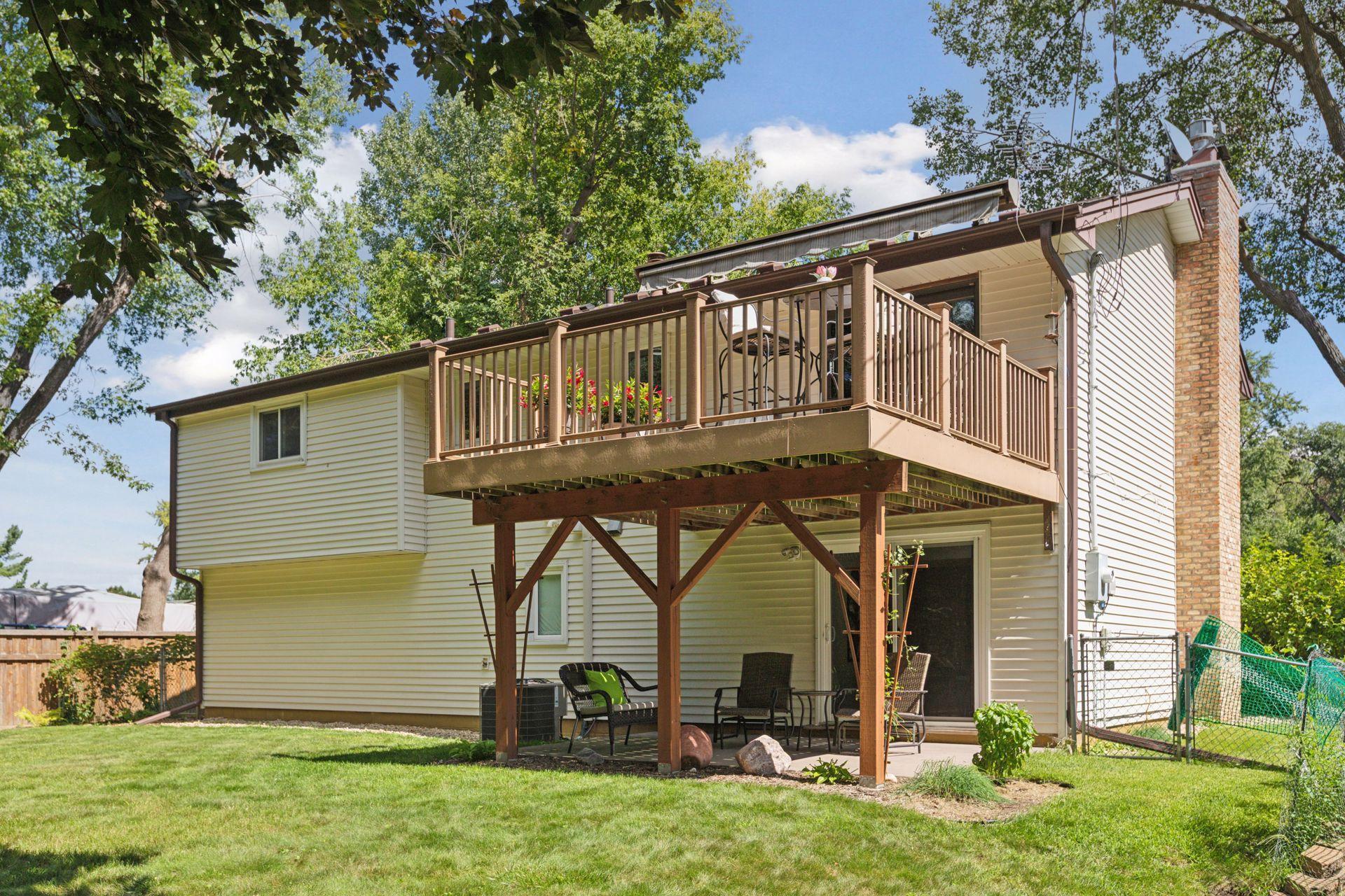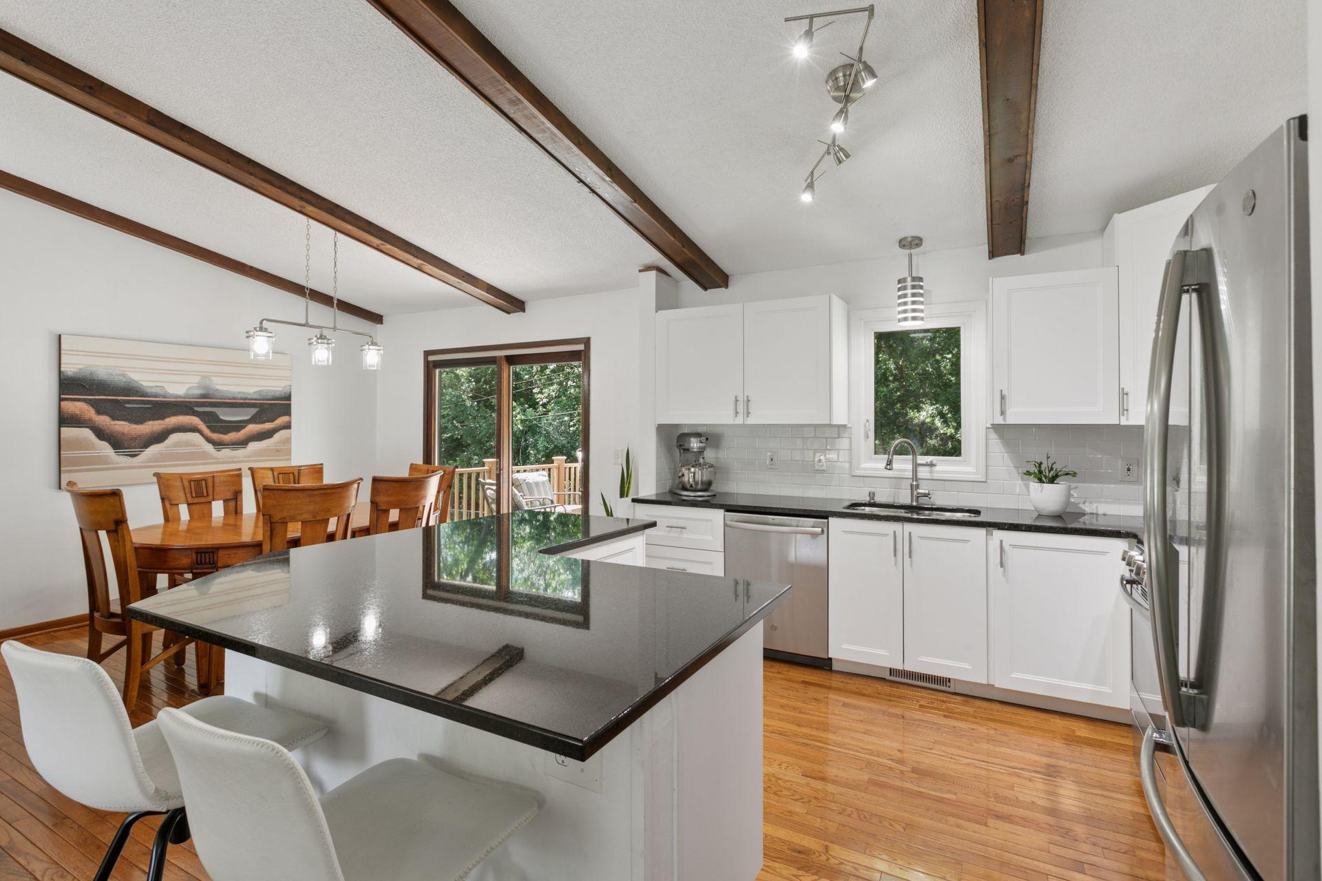 Impeccably maintained home in desirable Fridley location. Freshly updated kitchen with white cabinetry and stainless appliances flows seamlessly into the dining area, accented by exposed wood beams and direct deck access to a private, tree-lined backyard. Beautiful hardwood floors throughout main level. Three bedrooms on upper level provide excellent separation of space. Lower level family room showcases brick fireplace and custom built-ins. Generous lot with mature landscaping ensures maximum privacy. Attached two-car garage. Prime location near Locke Park and Moore Lake Commons with quick access to retail, restaurants, and major commuter routes. Don't miss this one.