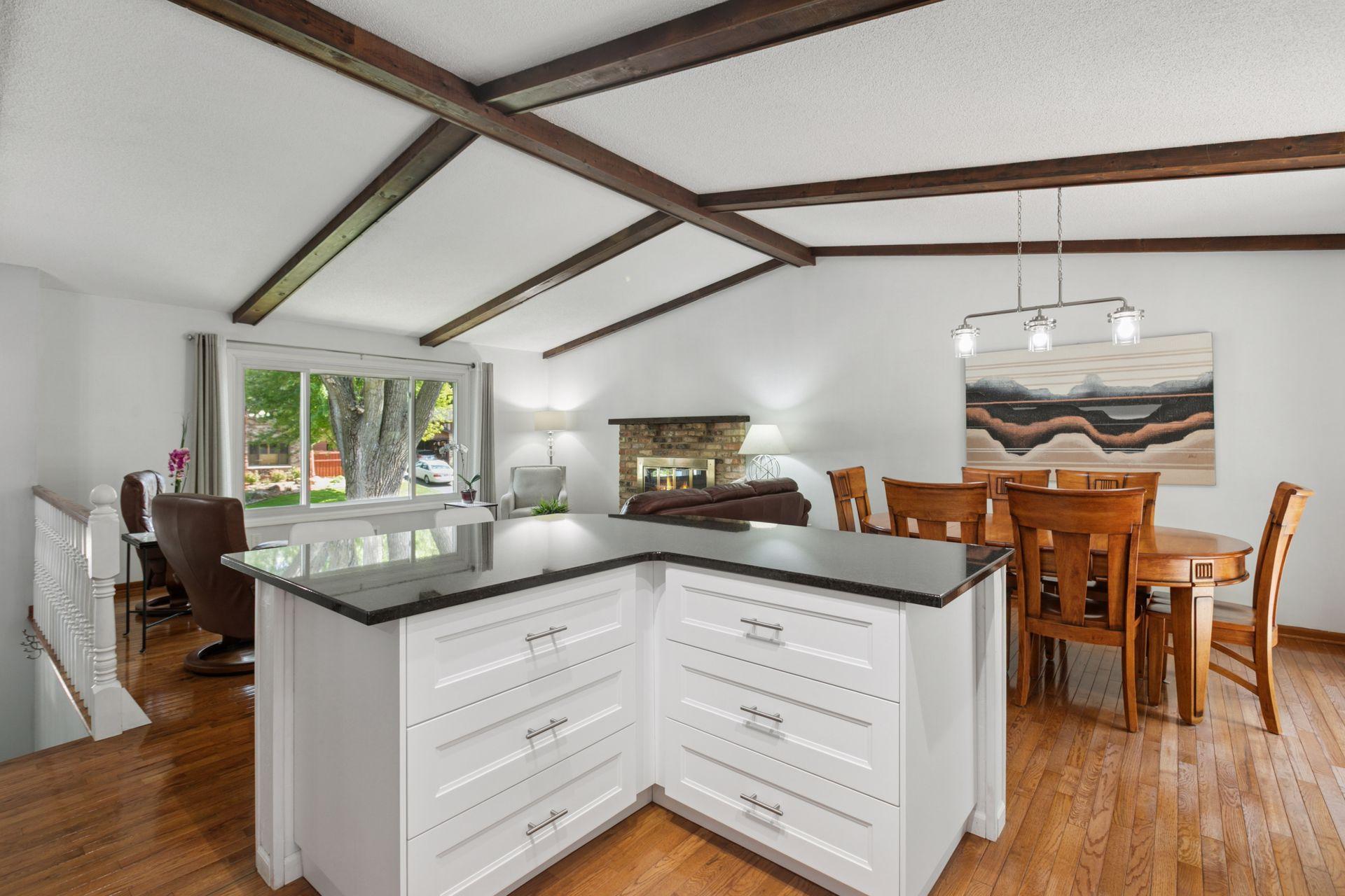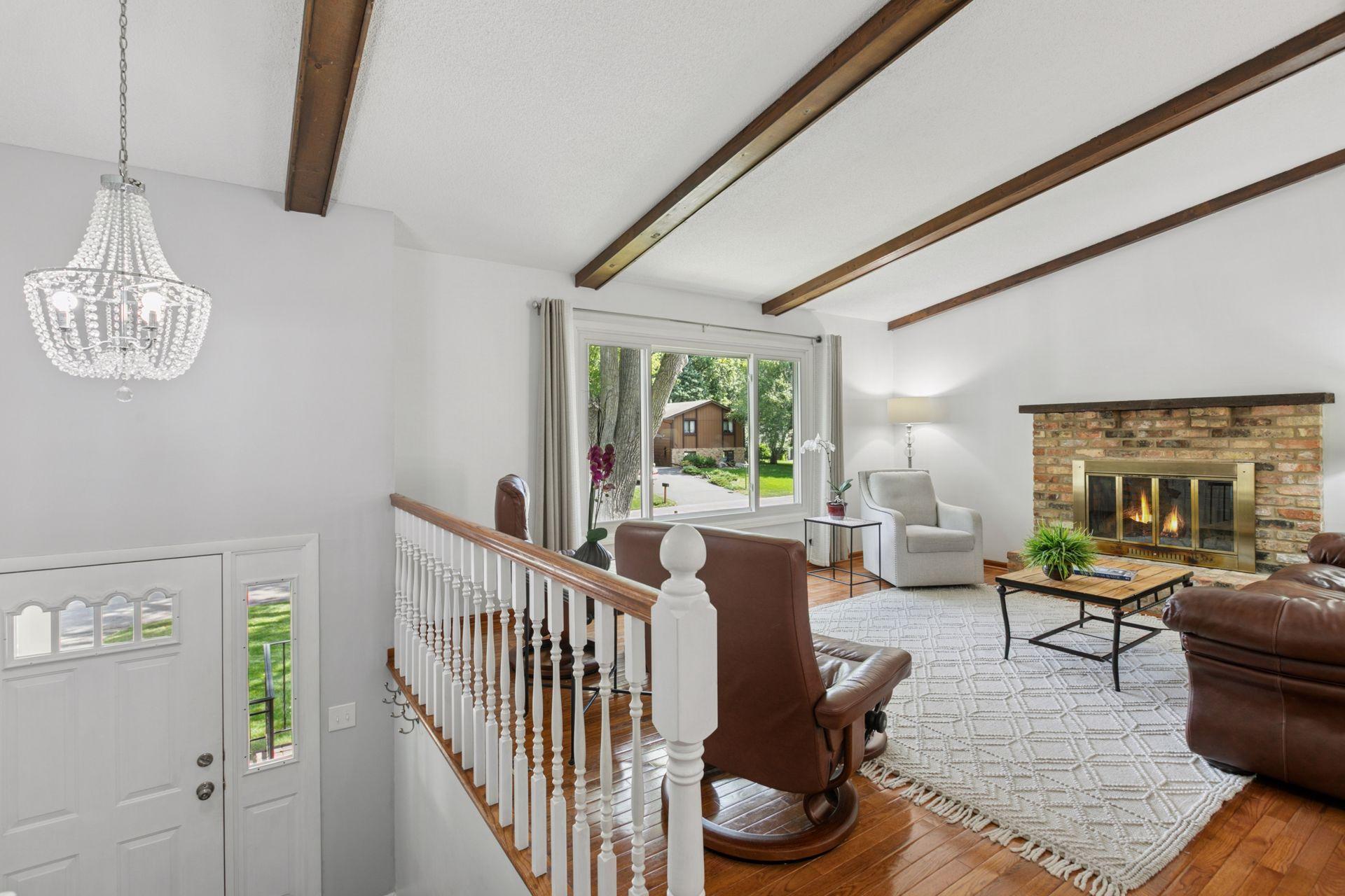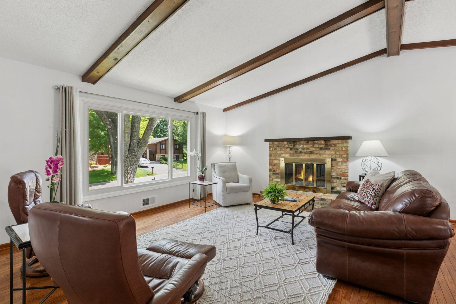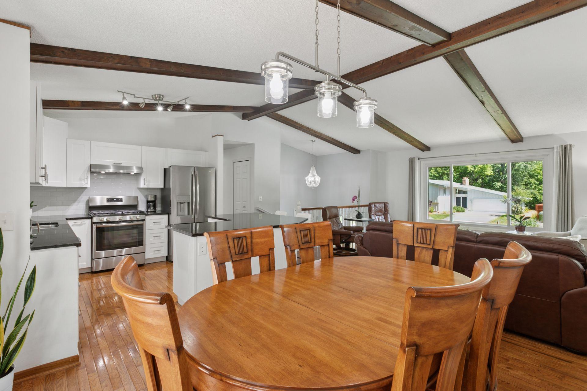 Impeccably maintained home in desirable Fridley location. Freshly updated kitchen with white cabinetry and stainless appliances flows seamlessly into the dining area, accented by exposed wood beams and direct deck access to a private, tree-lined backyard. Beautiful hardwood floors throughout main level. Three bedrooms on upper level provide excellent separation of space. Lower level family room showcases brick fireplace and custom built-ins. Generous lot with mature landscaping ensures maximum privacy. Attached two-car garage. Prime location near Locke Park and Moore Lake Commons with quick access to retail, restaurants, and major commuter routes. Don't miss this one.