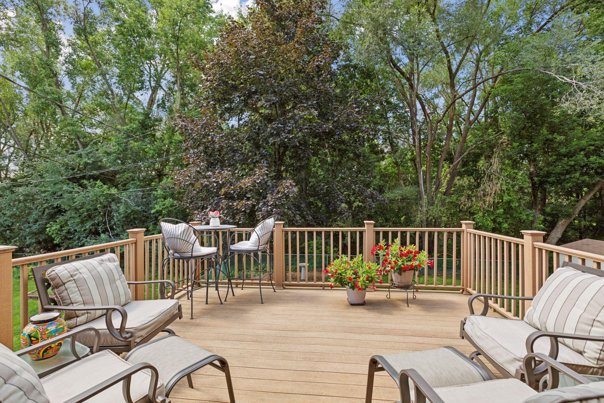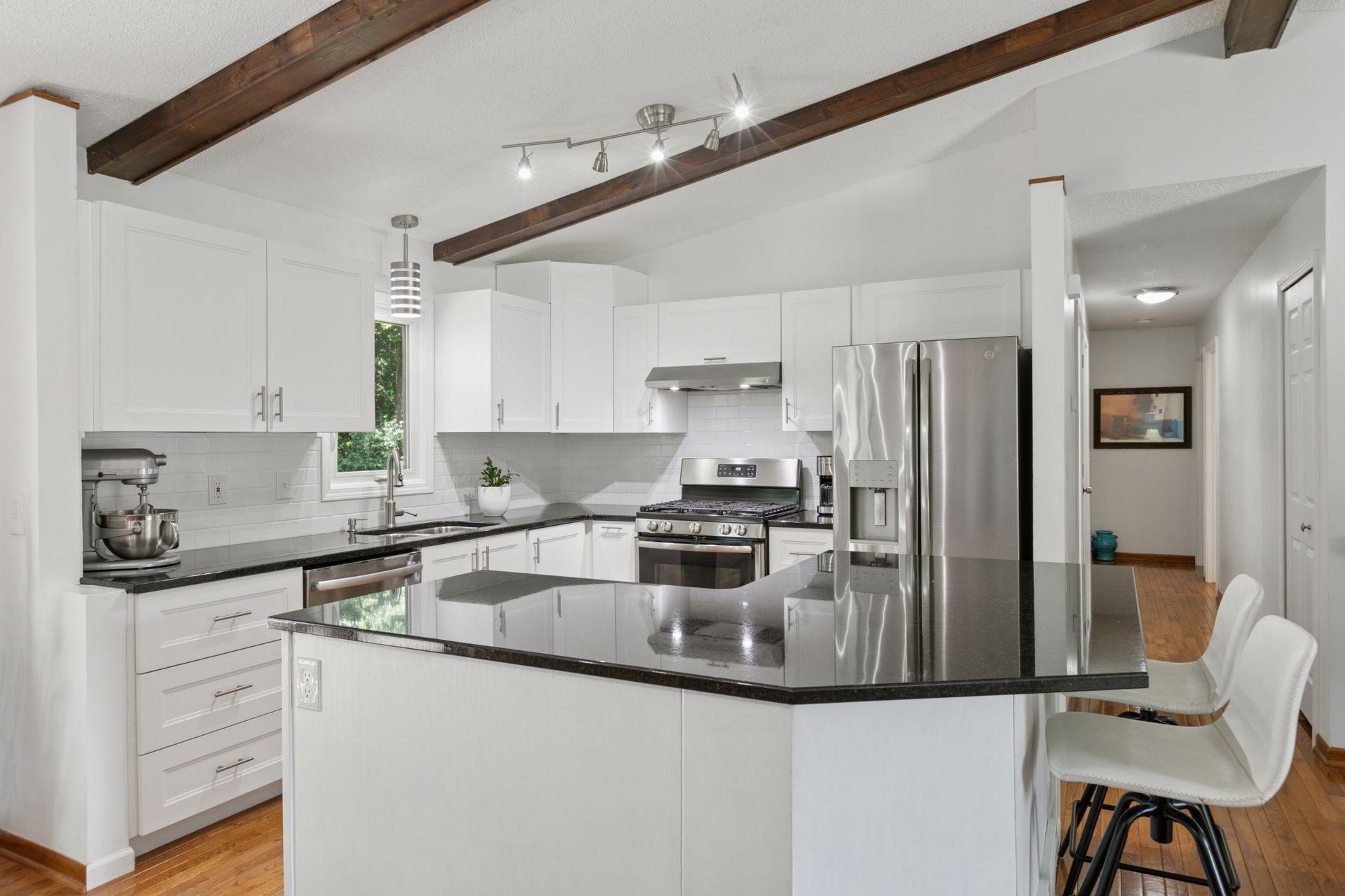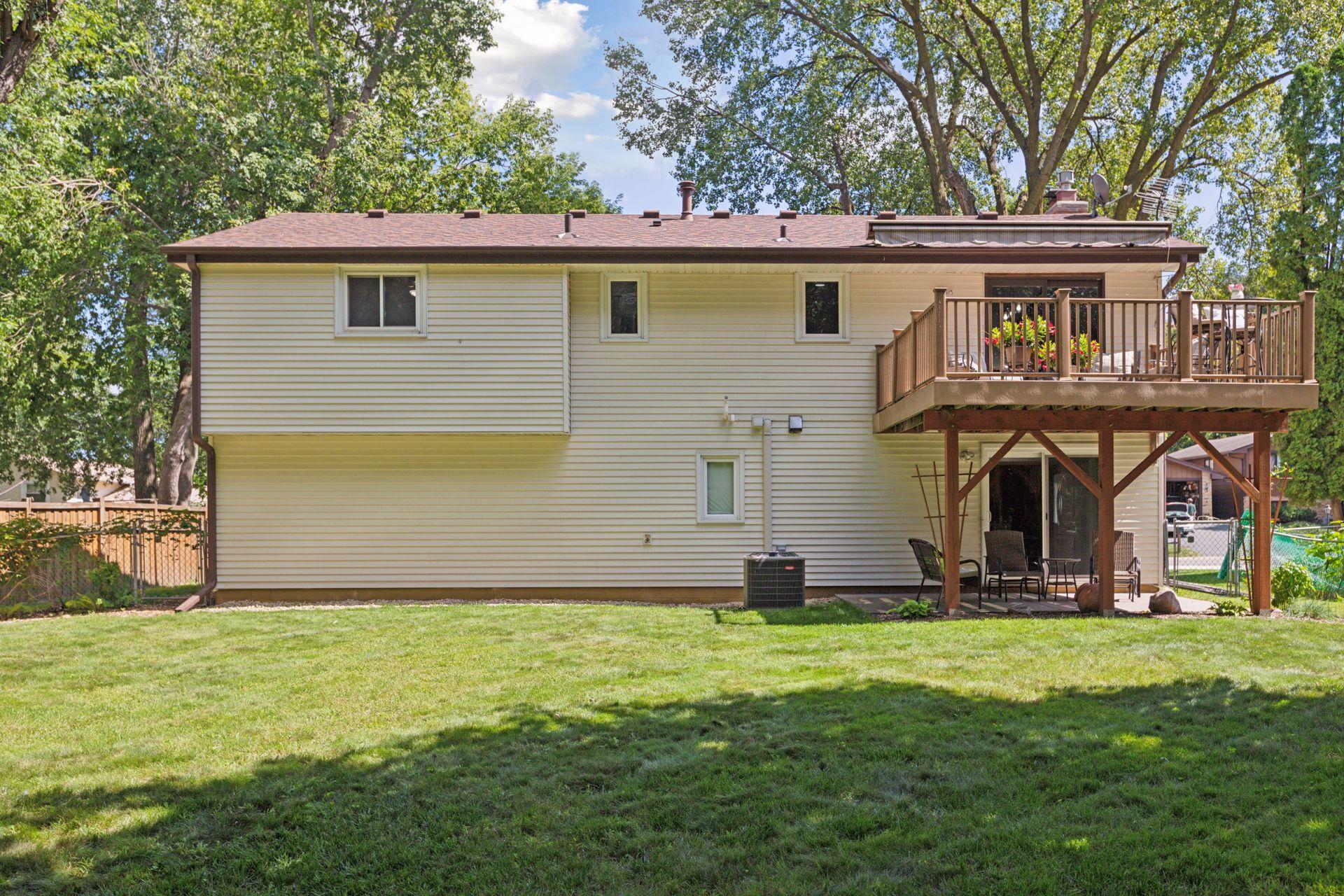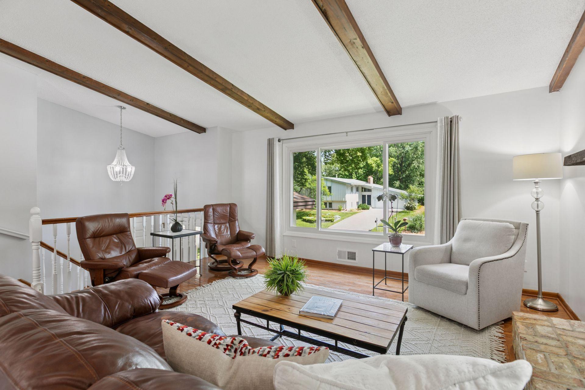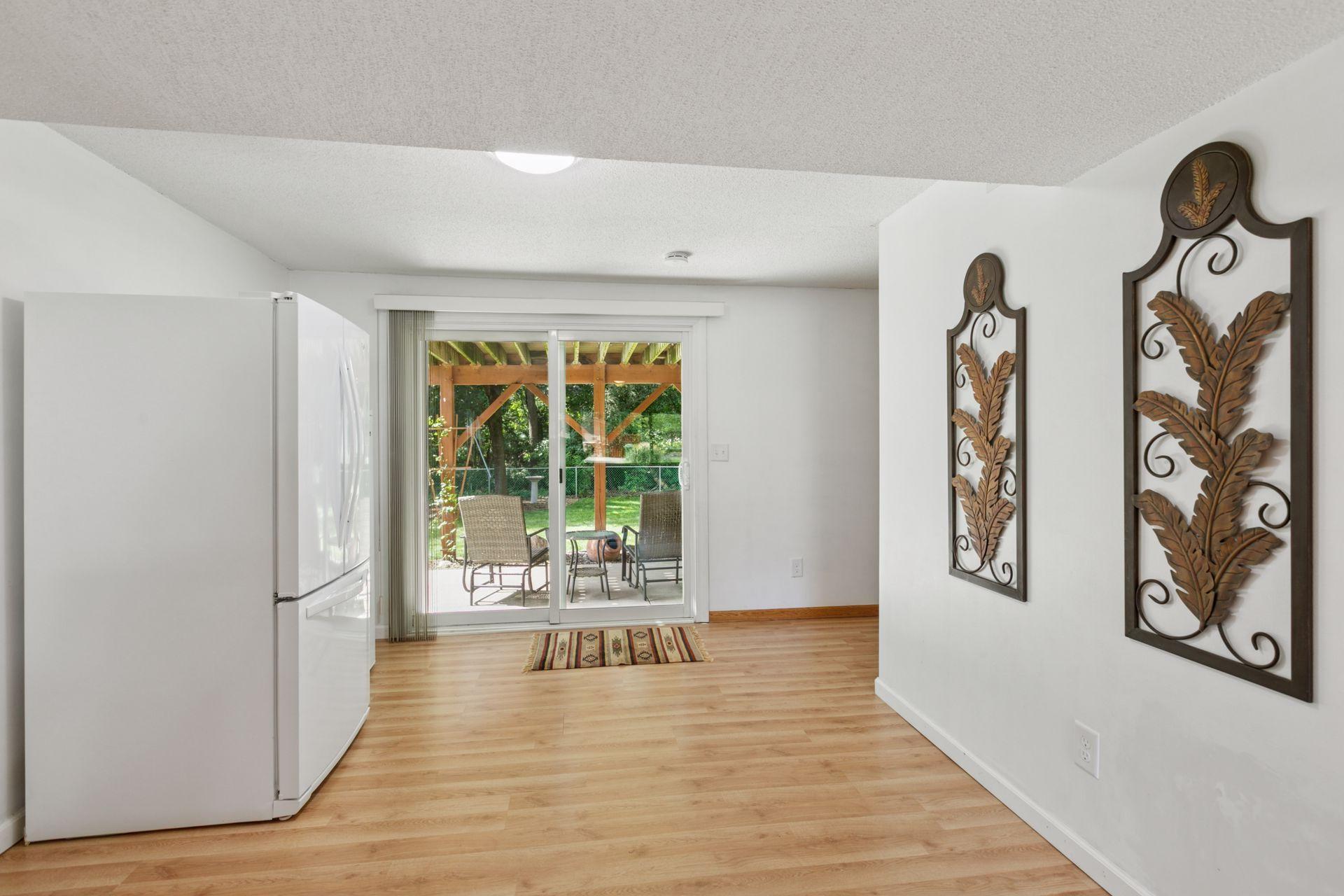 Impeccably maintained home in desirable Fridley location. Freshly updated kitchen with white cabinetry and stainless appliances flows seamlessly into the dining area, accented by exposed wood beams and direct deck access to a private, tree-lined backyard. Beautiful hardwood floors throughout main level. Three bedrooms on upper level provide excellent separation of space. Lower level family room showcases brick fireplace and custom built-ins. Generous lot with mature landscaping ensures maximum privacy. Attached two-car garage. Prime location near Locke Park and Moore Lake Commons with quick access to retail, restaurants, and major commuter routes. Don't miss this one.