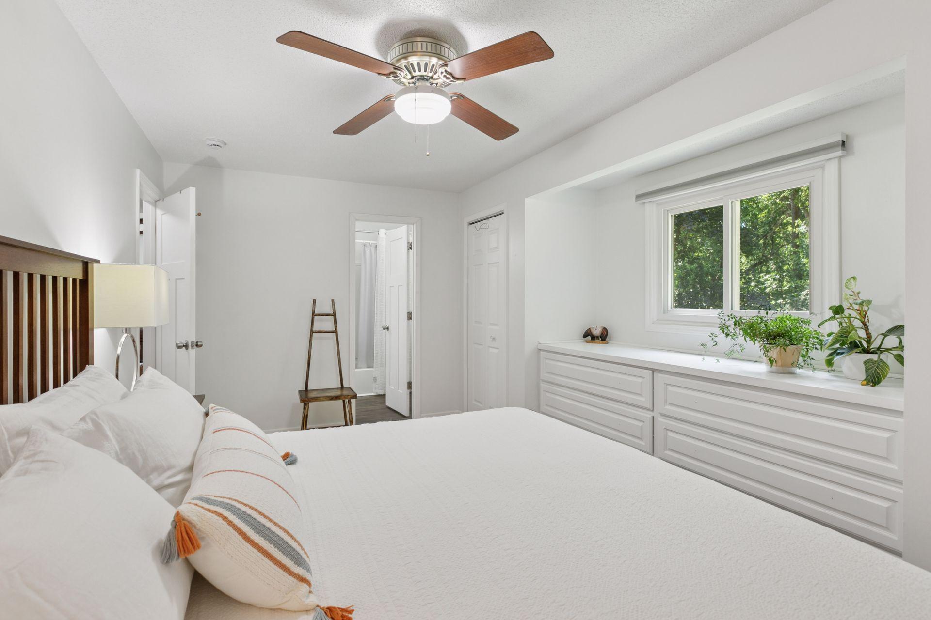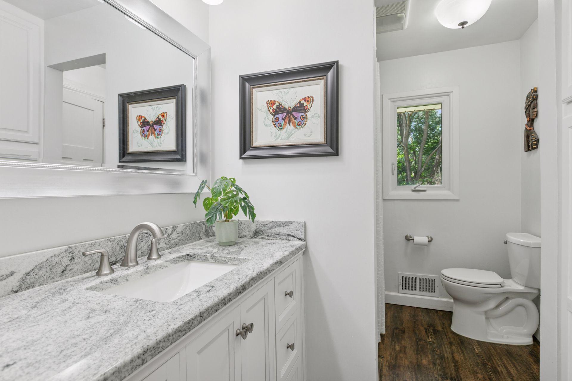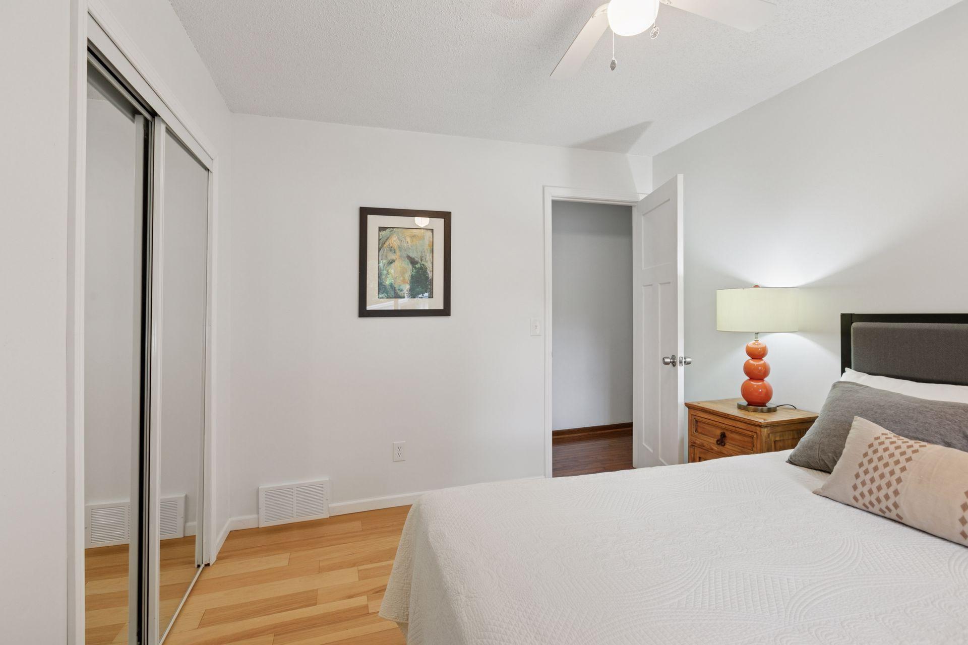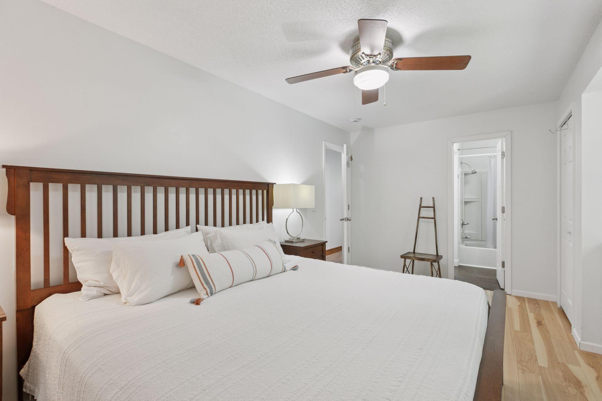 Impeccably maintained home in desirable Fridley location. Freshly updated kitchen with white cabinetry and stainless appliances flows seamlessly into the dining area, accented by exposed wood beams and direct deck access to a private, tree-lined backyard. Beautiful hardwood floors throughout main level. Three bedrooms on upper level provide excellent separation of space. Lower level family room showcases brick fireplace and custom built-ins. Generous lot with mature landscaping ensures maximum privacy. Attached two-car garage. Prime location near Locke Park and Moore Lake Commons with quick access to retail, restaurants, and major commuter routes. Don't miss this one.