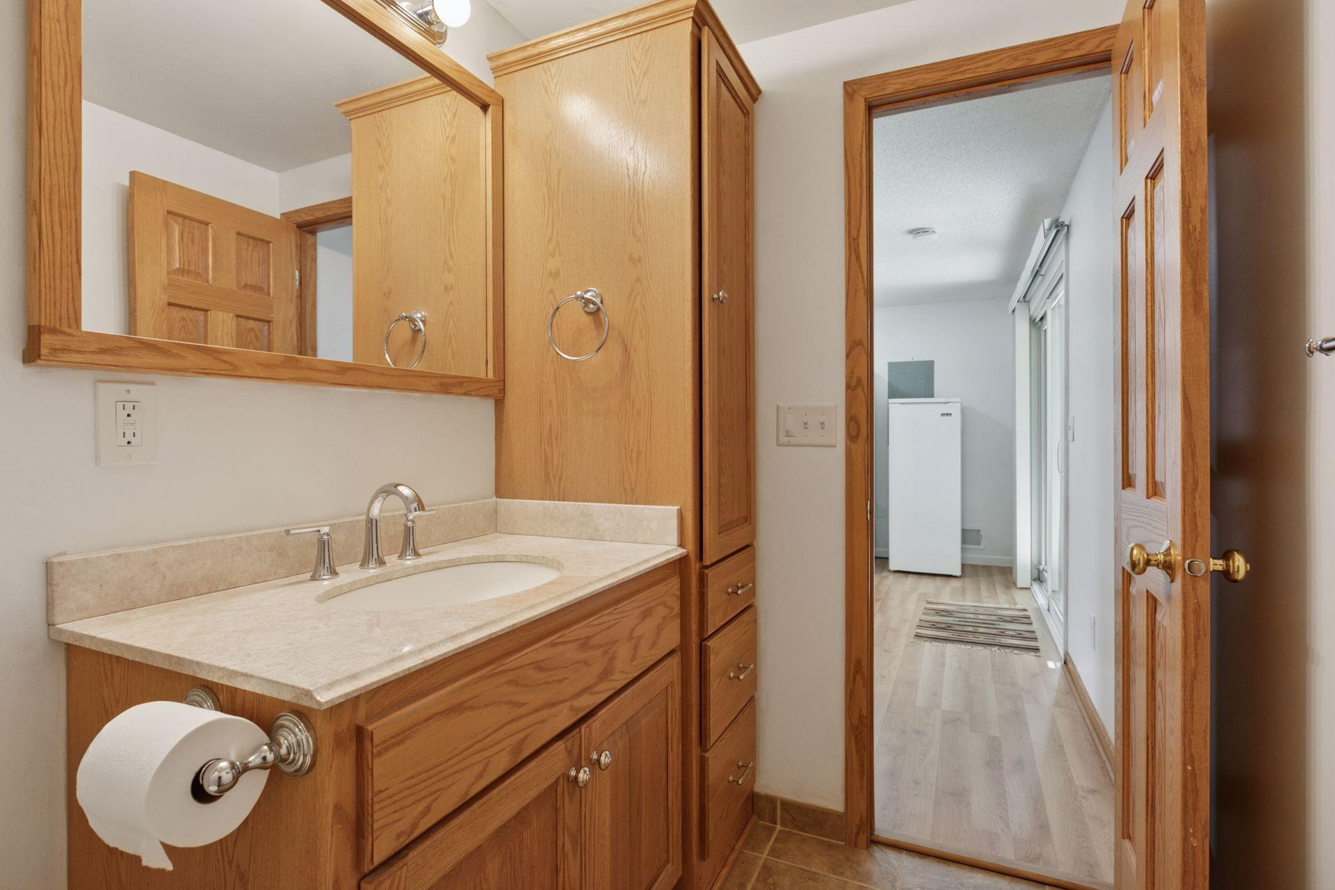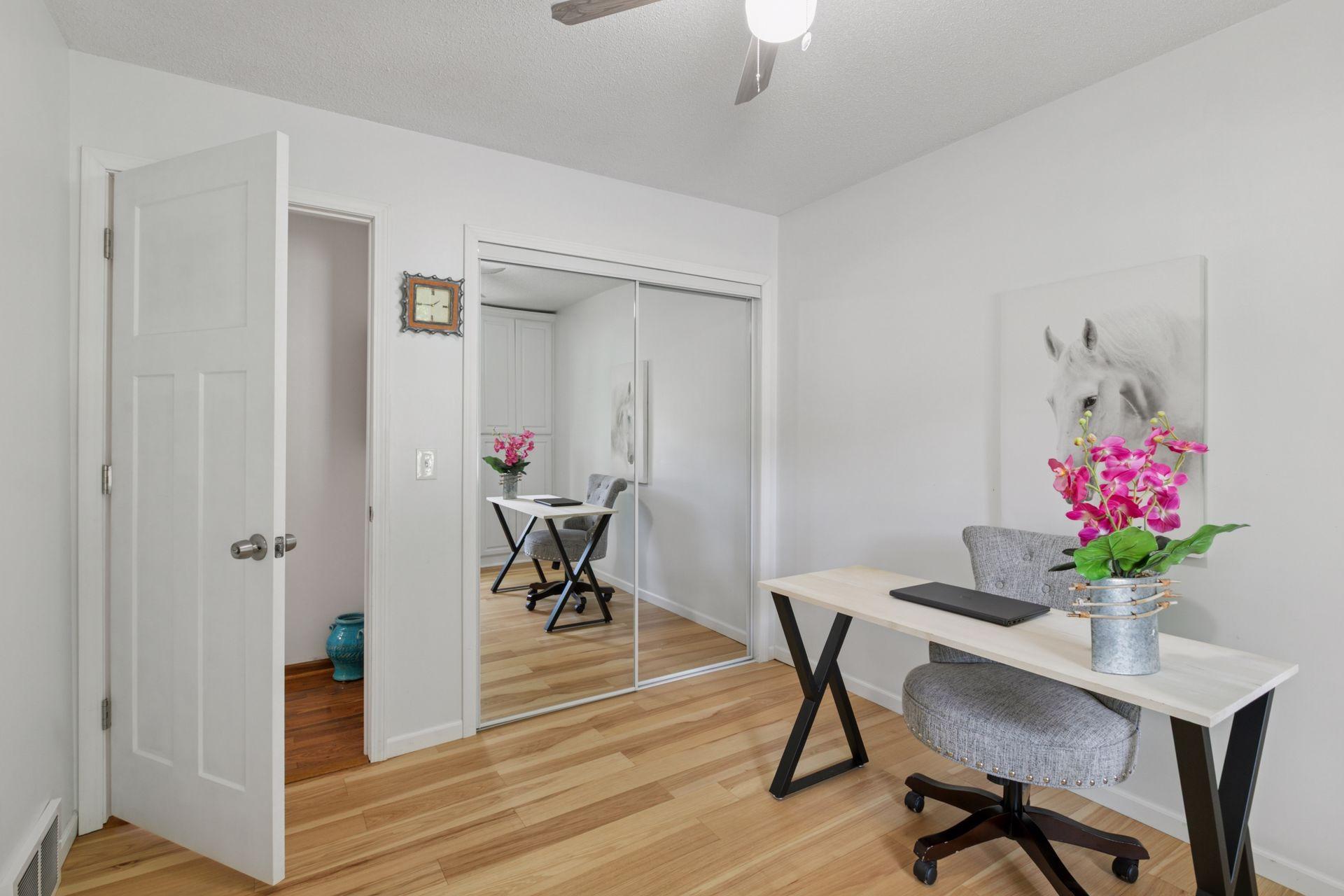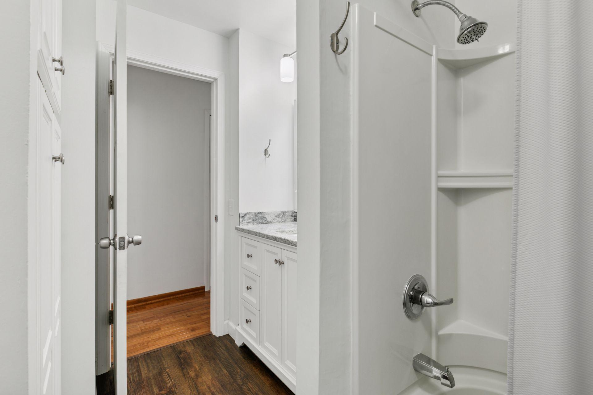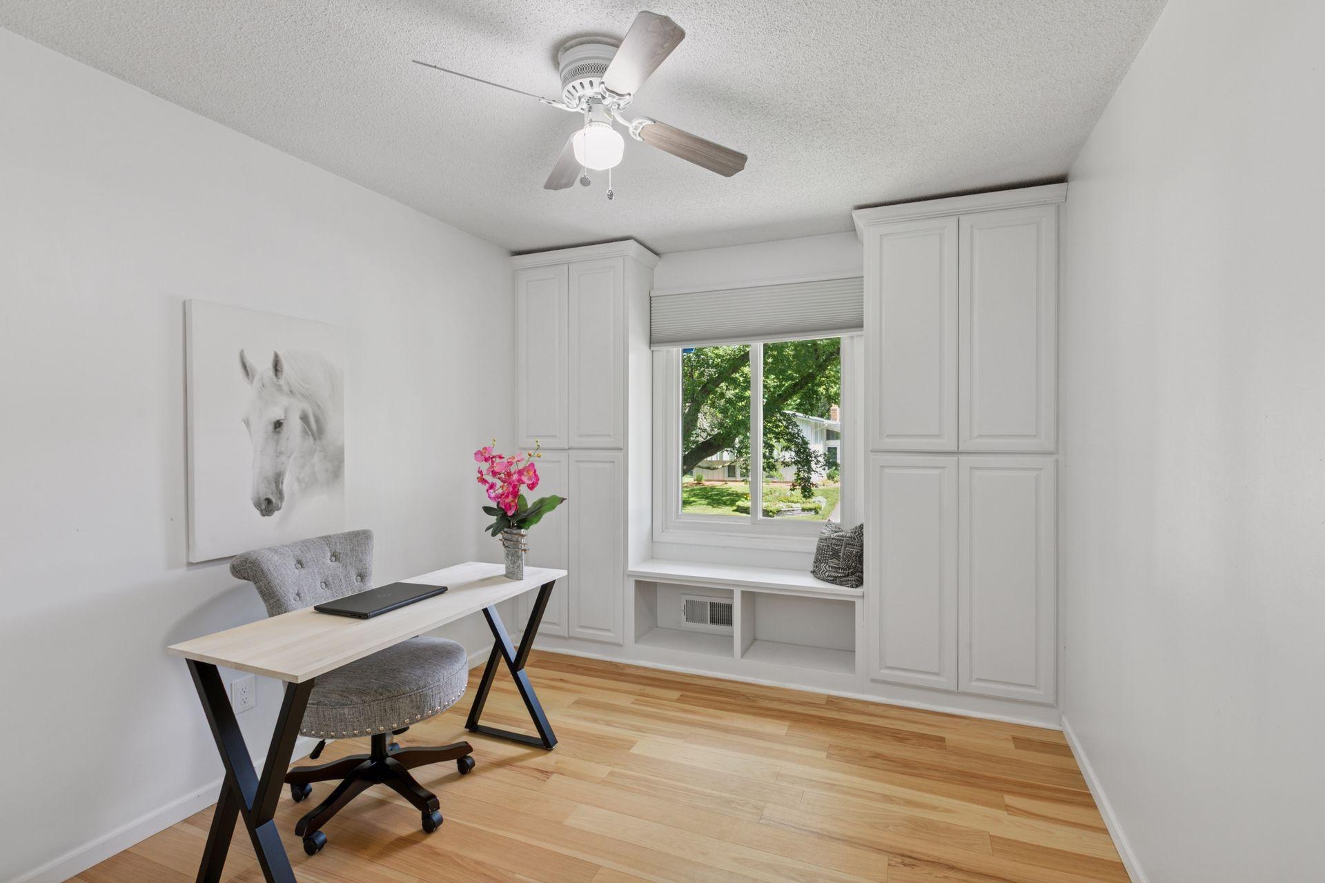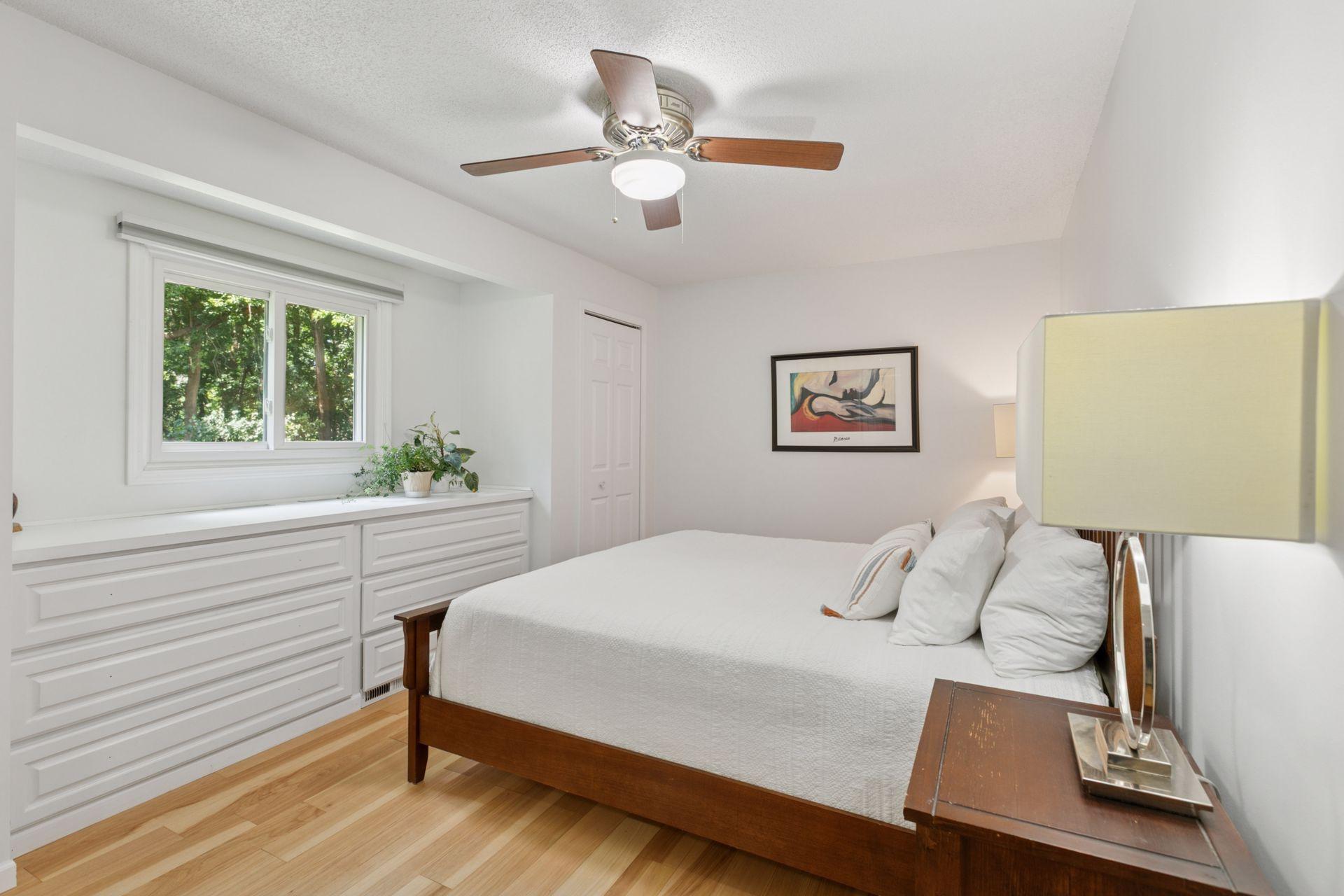 Impeccably maintained home in desirable Fridley location. Freshly updated kitchen with white cabinetry and stainless appliances flows seamlessly into the dining area, accented by exposed wood beams and direct deck access to a private, tree-lined backyard. Beautiful hardwood floors throughout main level. Three bedrooms on upper level provide excellent separation of space. Lower level family room showcases brick fireplace and custom built-ins. Generous lot with mature landscaping ensures maximum privacy. Attached two-car garage. Prime location near Locke Park and Moore Lake Commons with quick access to retail, restaurants, and major commuter routes. Don't miss this one.