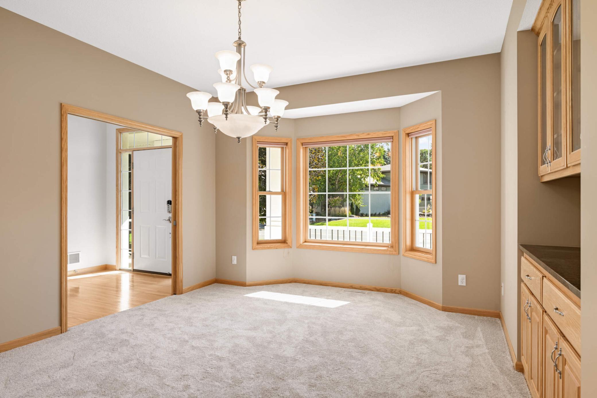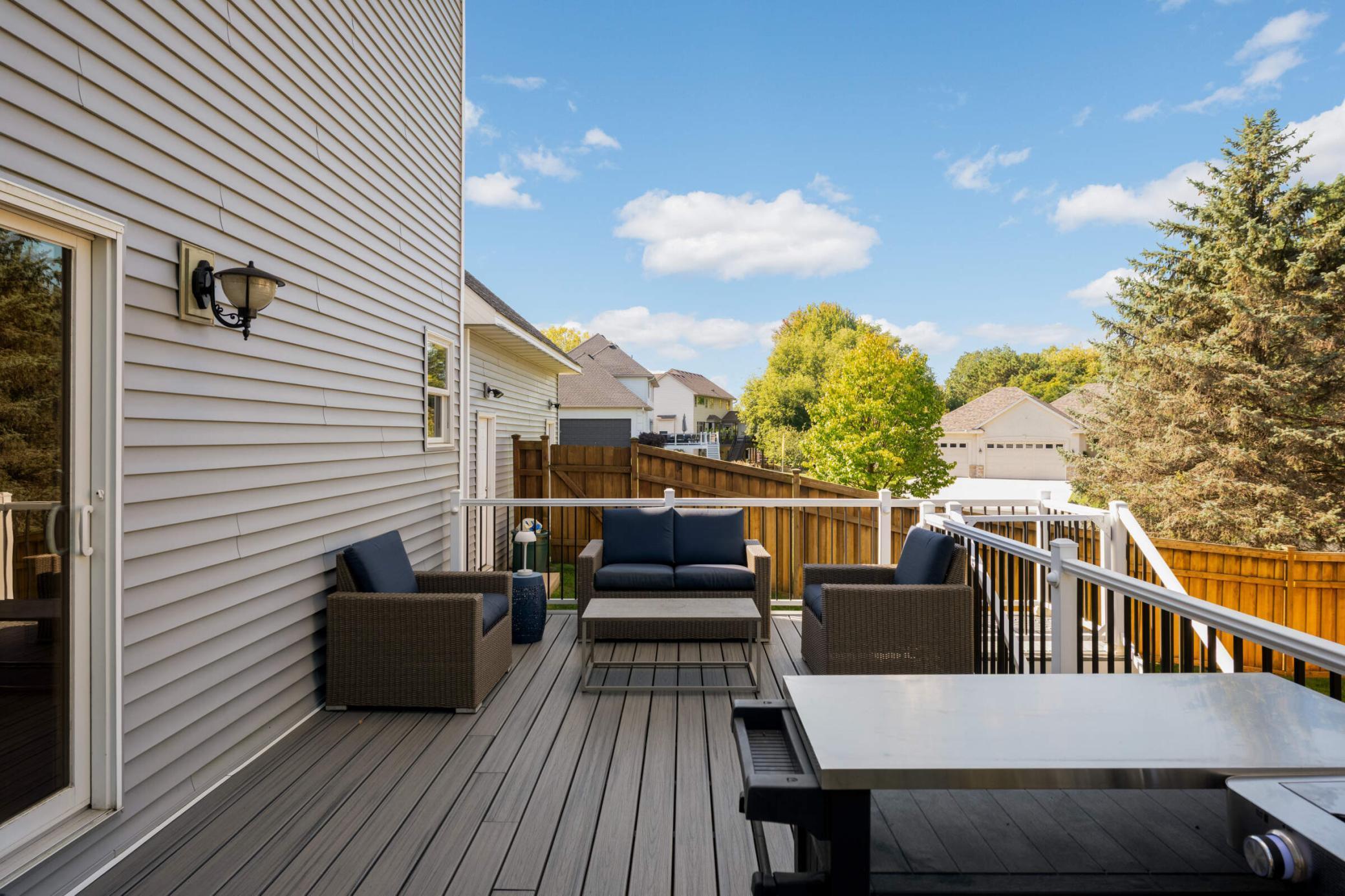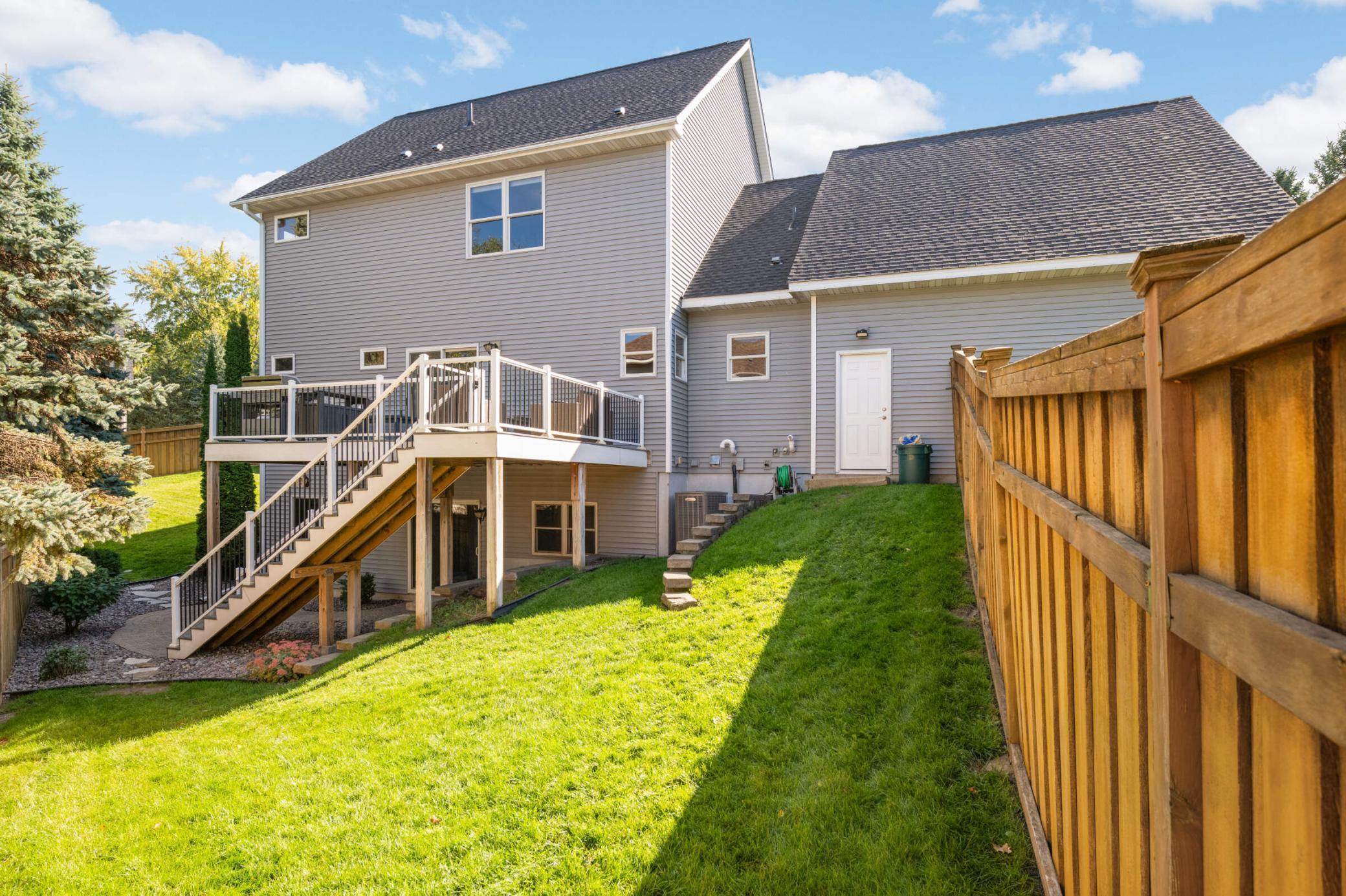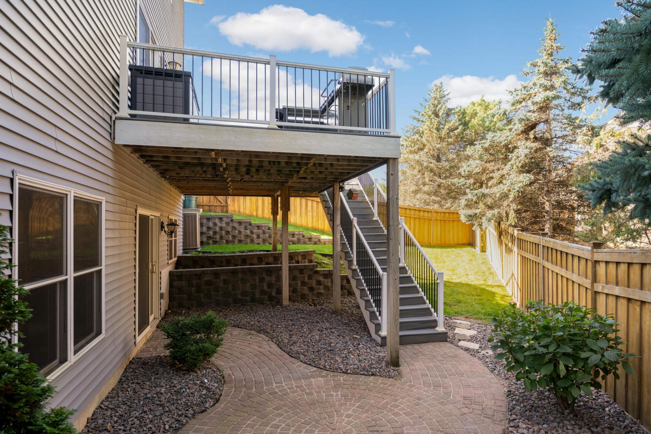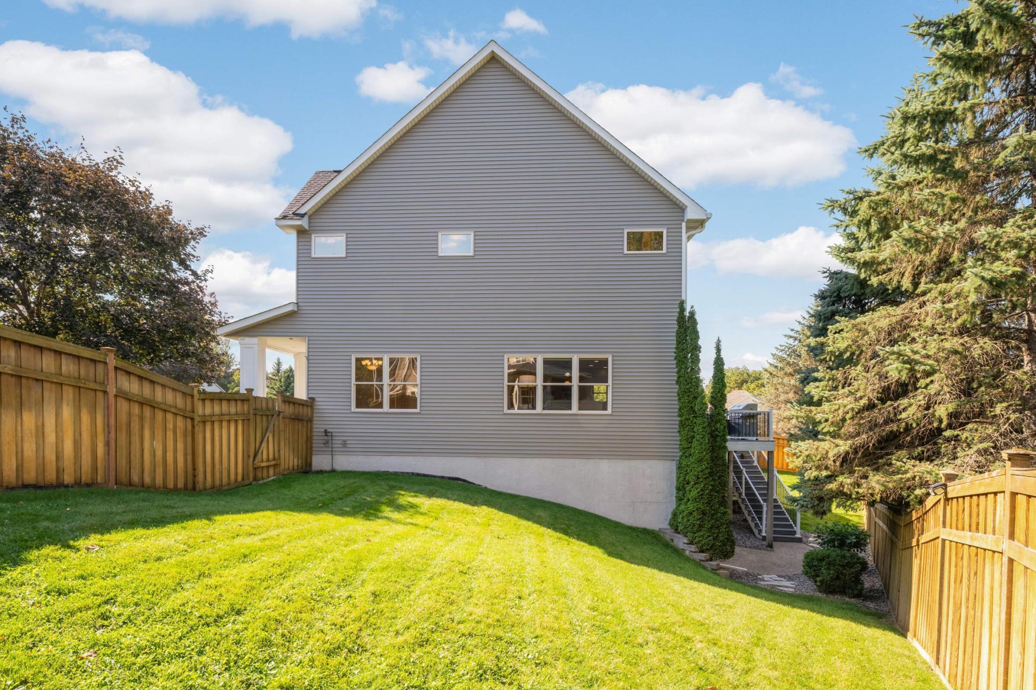 Custom-built home in District 196 has 4 bedrooms, 2.5 bathrooms, and 3-car garage with a dedicated workshop area. Wonderful fenced in corner lot with .3 acres and a beautiful first impression. The large front porch has space to sit and relax. Front rooms with new carpet can easily be used as office, study, formal dining or piano rooms. The family room has built ins and a gas fireplace (and new carpet). It is adjacent to the marvelous, large kitchen perfect for cooking and entertaining. Stainless steel appliances, wall oven, center island and plenty of storage space, too. The maintenance free deck off of the kitchen is a perfect spot for morning coffee or grilling with friends. Upstairs, the primary bedroom has two large walk in closets, and private primary bath has a newly tiled shower with bluetooth as well as a soaker tub. Two other bedrooms are spacious and close to the upstairs full bath. The large bedroom over the garage is a wonderful surprise! Could be used as a bedroom or bonus room. Walk out lower level is framed in, offering endless possibilities such as an additional bedroom, bathroom, game room/exercise room, home office. Patio door leads to a lovely patio area with decorative pavers.Easy access to Woodland Elementary, Dakota Hills, and Eagan High School.
