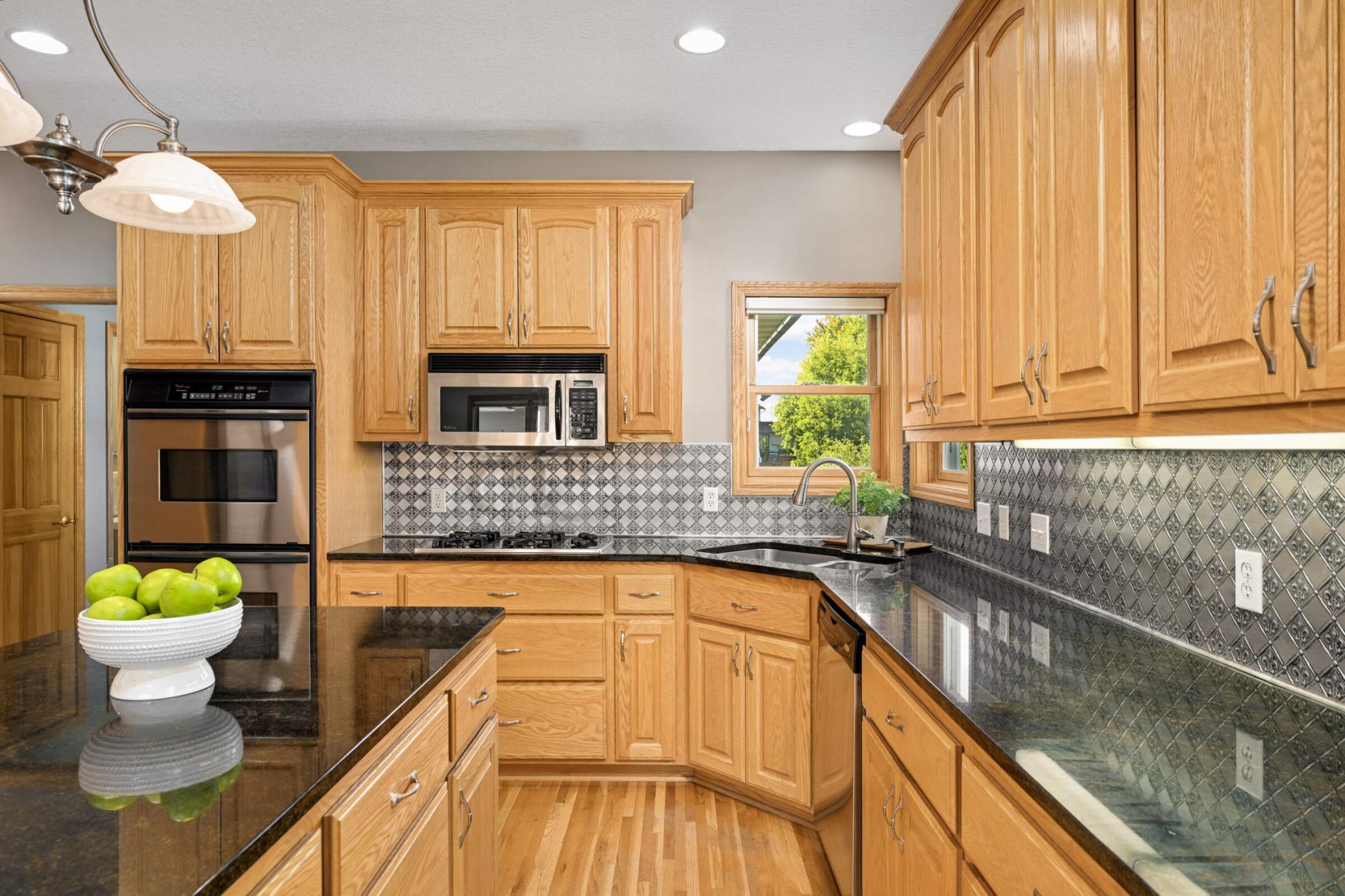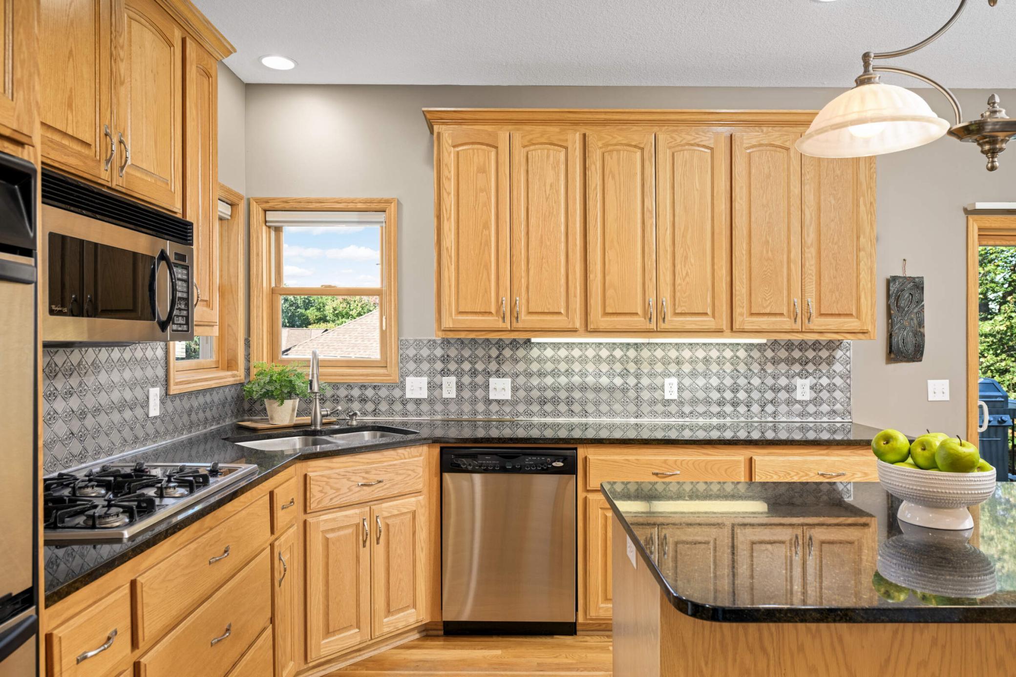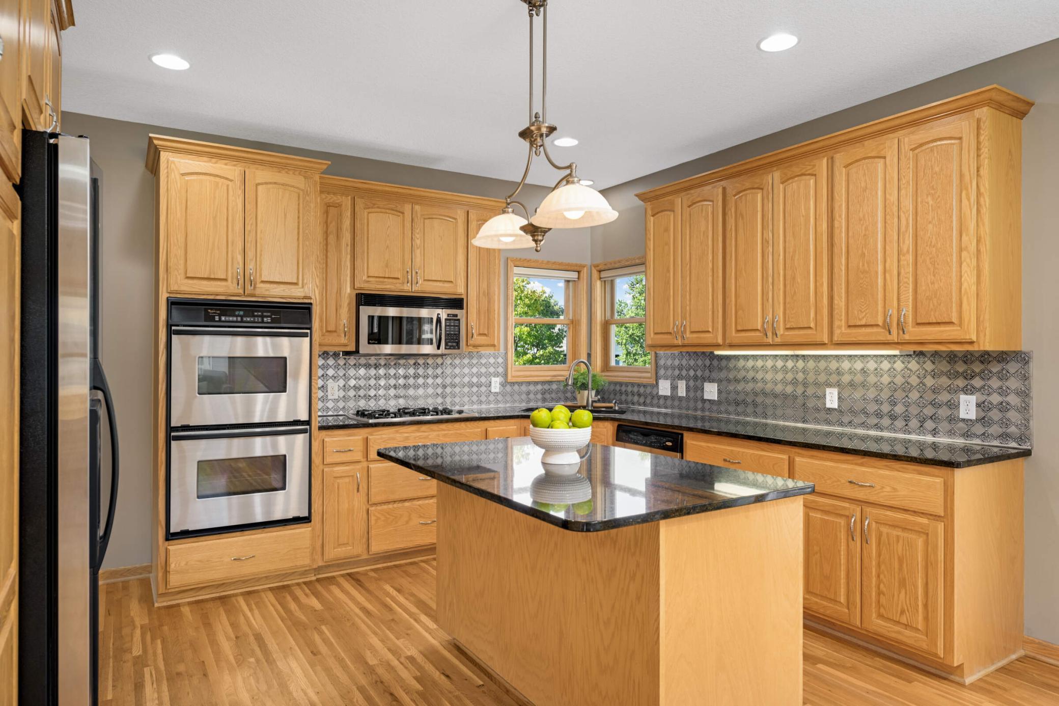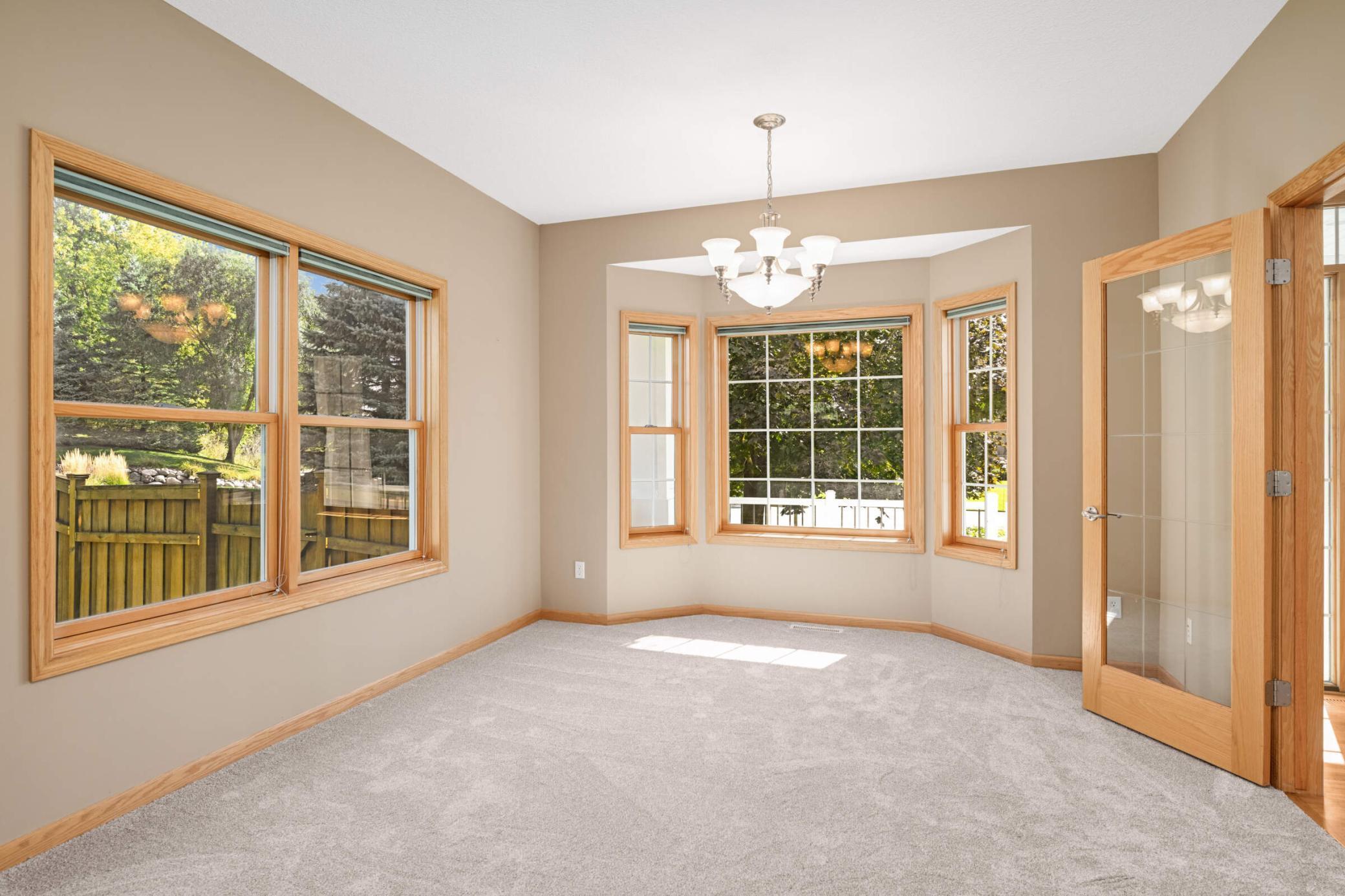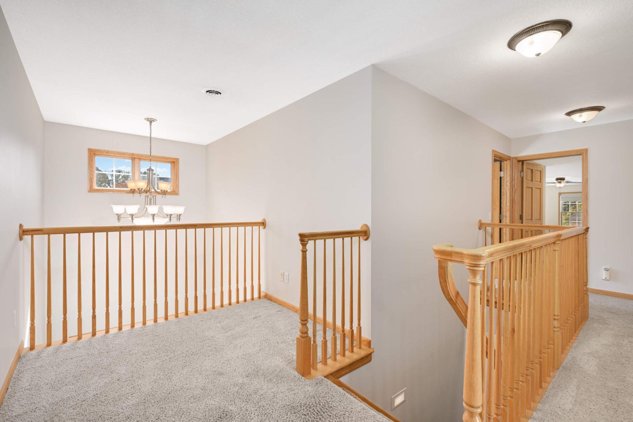 Custom-built home in District 196 has 4 bedrooms, 2.5 bathrooms, and 3-car garage with a dedicated workshop area. Wonderful fenced in corner lot with .3 acres and a beautiful first impression. The large front porch has space to sit and relax. Front rooms with new carpet can easily be used as office, study, formal dining or piano rooms. The family room has built ins and a gas fireplace (and new carpet). It is adjacent to the marvelous, large kitchen perfect for cooking and entertaining. Stainless steel appliances, wall oven, center island and plenty of storage space, too. The maintenance free deck off of the kitchen is a perfect spot for morning coffee or grilling with friends. Upstairs, the primary bedroom has two large walk in closets, and private primary bath has a newly tiled shower with bluetooth as well as a soaker tub. Two other bedrooms are spacious and close to the upstairs full bath. The large bedroom over the garage is a wonderful surprise! Could be used as a bedroom or bonus room. Walk out lower level is framed in, offering endless possibilities such as an additional bedroom, bathroom, game room/exercise room, home office. Patio door leads to a lovely patio area with decorative pavers.Easy access to Woodland Elementary, Dakota Hills, and Eagan High School.