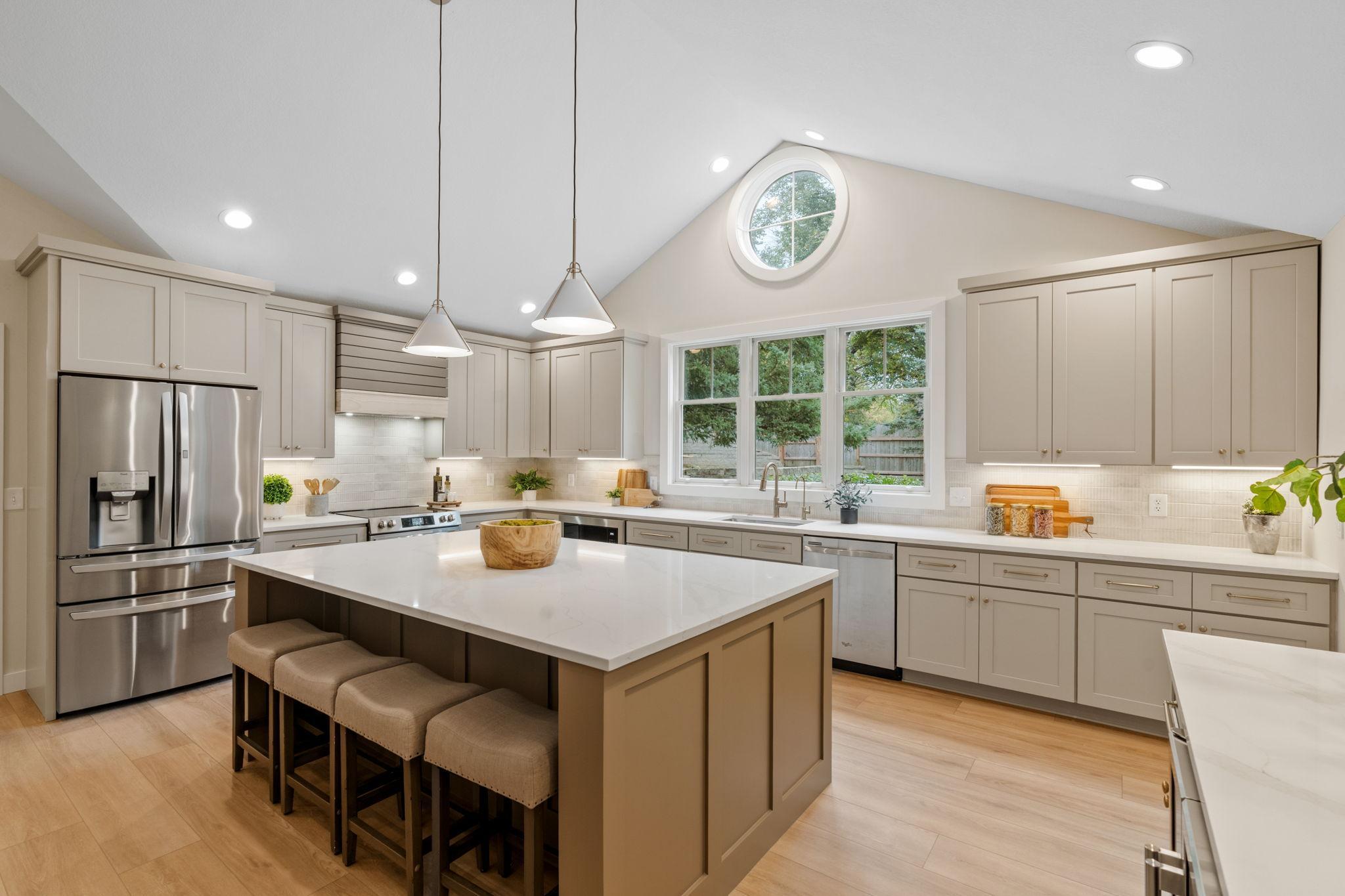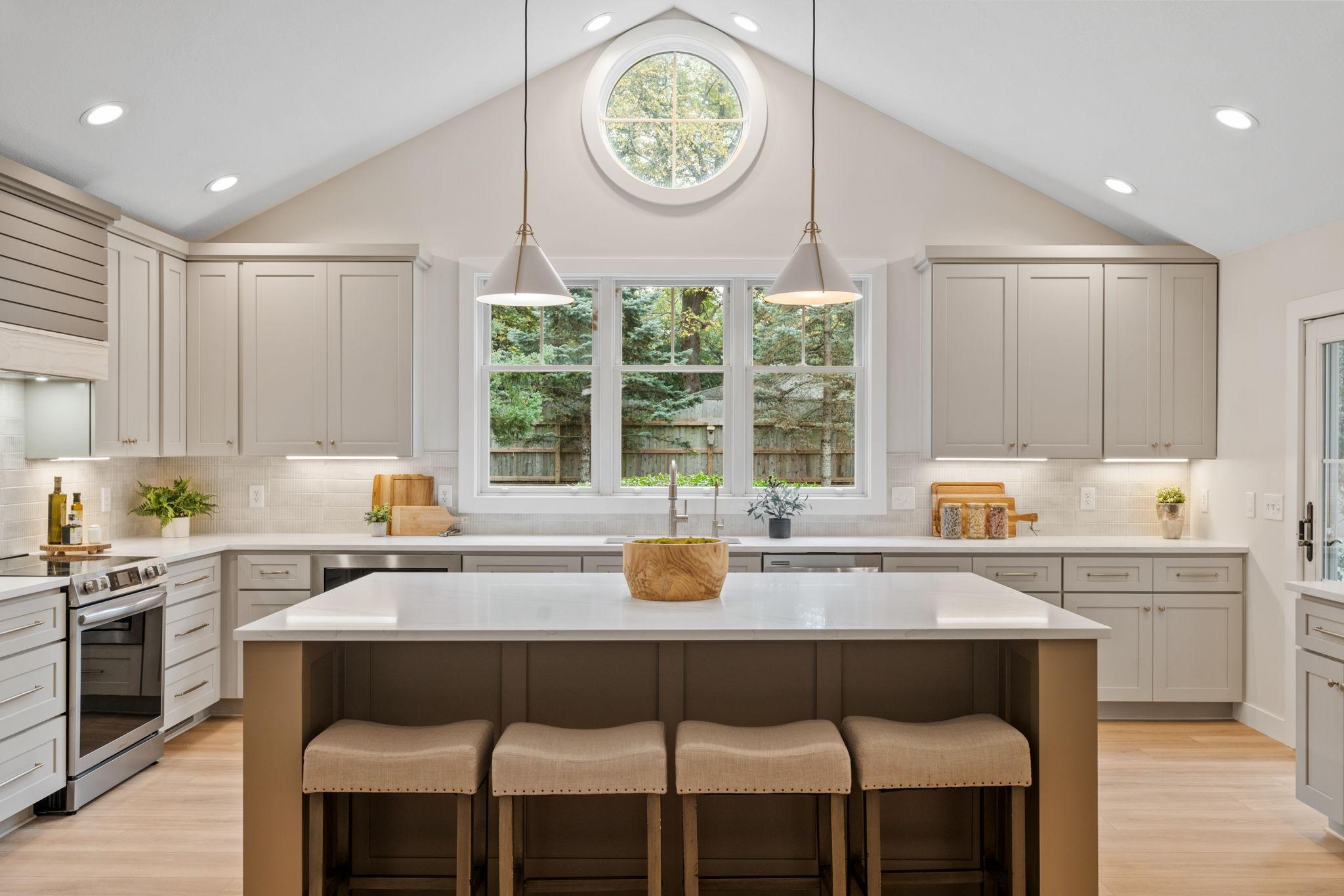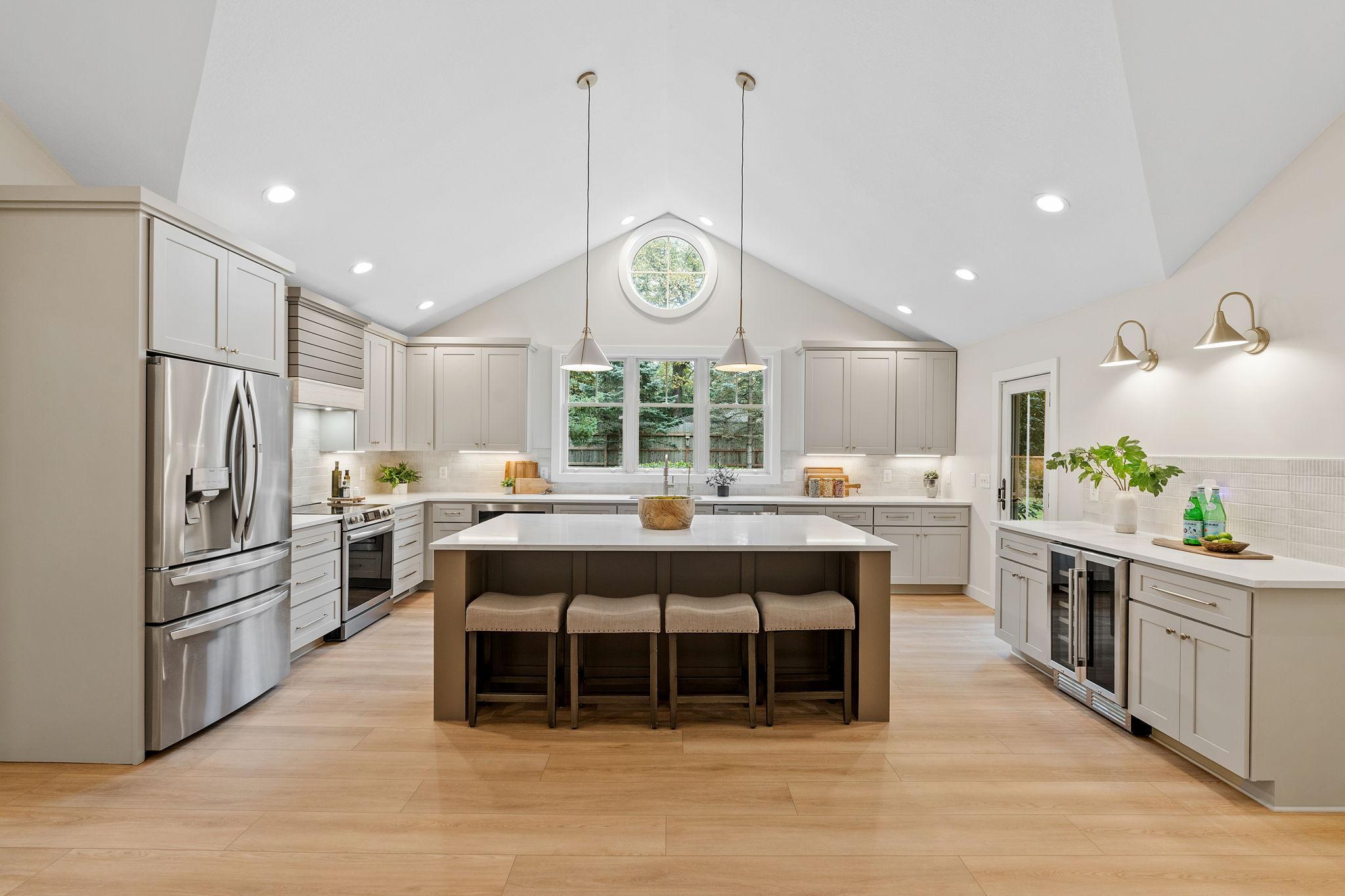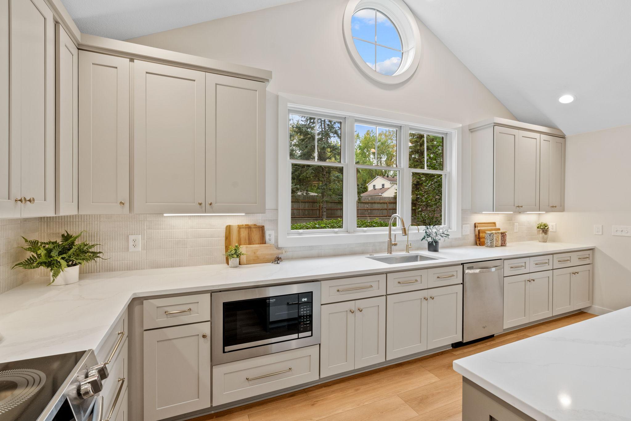 Welcome to this beautifully renovated 4-bedroom, 5-bathroom home that perfectly blends luxury, functionality, and modern design. From the moment you step through the front door, you'll be impressed by the soaring vaulted ceilings, in-floor heat and the high-end finishes throughout. The heart of the home is the gourmet kitchen, featuring custom cabinetry, brand-new stainless steel appliances, and ample space for cooking and entertaining. Enjoy the warmth and flow of the open-concept layout, highlighted by new flooring, trim, doors, and fresh paint throughout. This home offers exceptional flexibility with two spacious primary suites—one conveniently located on the main floor, and another upstairs, accompanied by two additional bedrooms and a loft space ideal for a home office or playroom. Located in a desirable neighborhood, this home offers both tranquility and easy access to nearby amenities, schools, and commuter routes. The garage is oversized, heated and insulated! Other improvements include Anderson windows, roof and siding that are 4 years old, secondary washer/dryer hookup upstairs. This home has the option for all living facilities to be on one level, come and see this move-in ready and meticulously updated home!