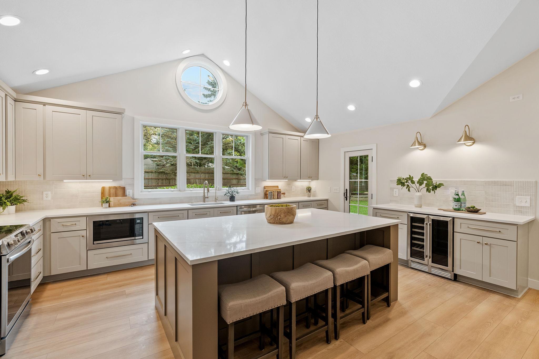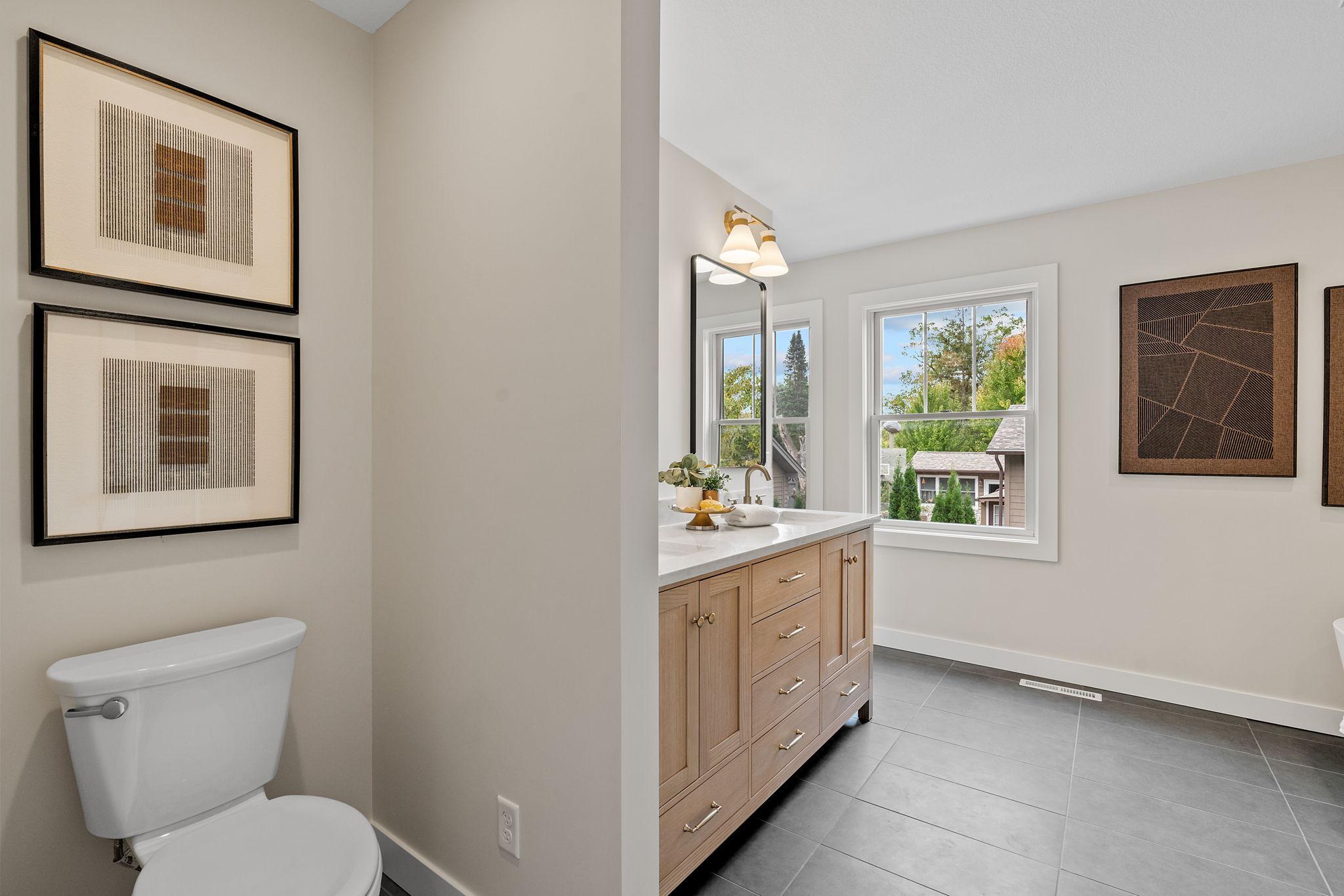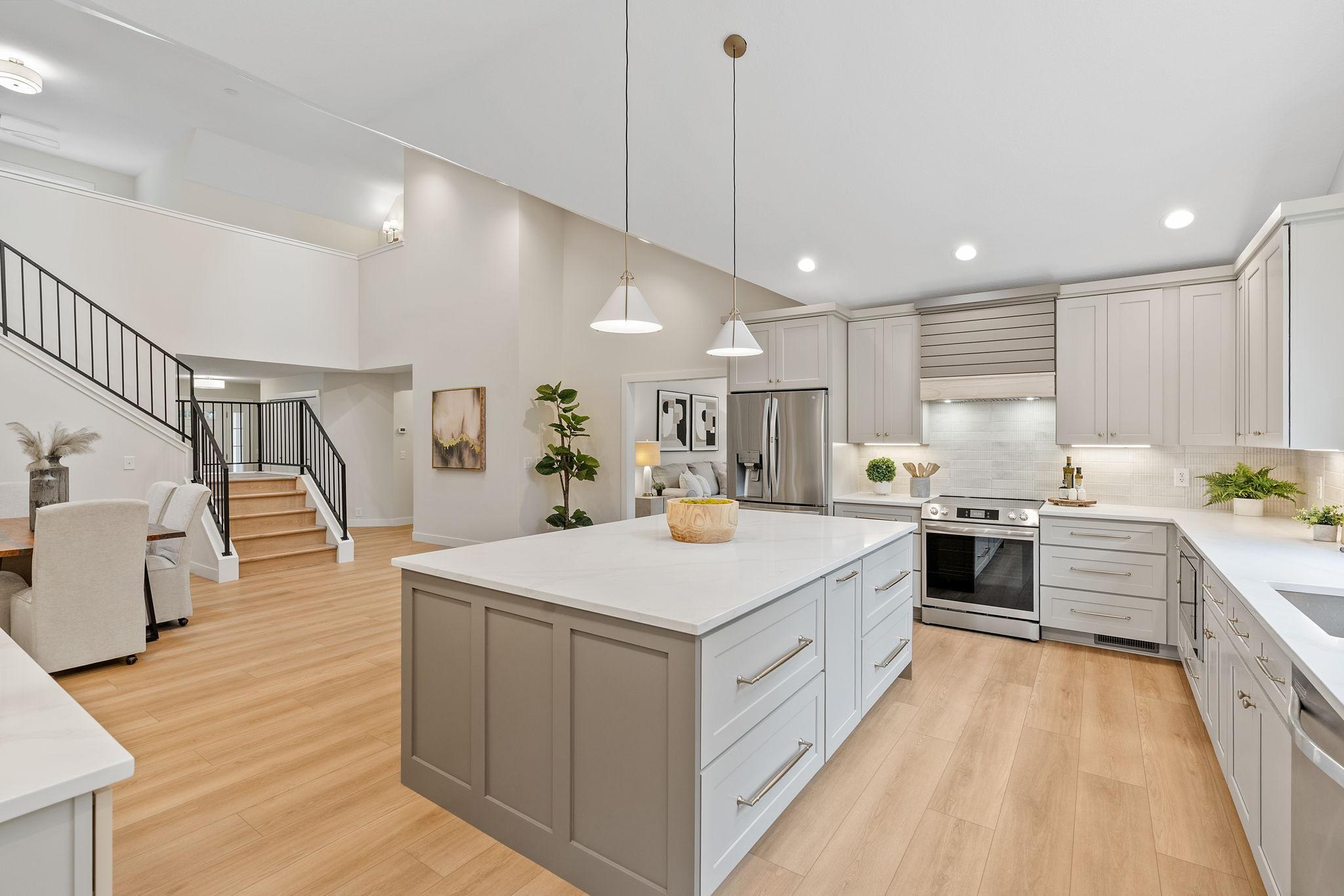 Welcome to this beautifully renovated 4-bedroom, 5-bathroom home that perfectly blends luxury, functionality, and modern design. From the moment you step through the front door, you'll be impressed by the soaring vaulted ceilings, in-floor heat and the high-end finishes throughout. The heart of the home is the gourmet kitchen, featuring custom cabinetry, brand-new stainless steel appliances, and ample space for cooking and entertaining. Enjoy the warmth and flow of the open-concept layout, highlighted by new flooring, trim, doors, and fresh paint throughout. This home offers exceptional flexibility with two spacious primary suites—one conveniently located on the main floor, and another upstairs, accompanied by two additional bedrooms and a loft space ideal for a home office or playroom. Located in a desirable neighborhood, this home offers both tranquility and easy access to nearby amenities, schools, and commuter routes. The garage is oversized, heated and insulated! Other improvements include Anderson windows, roof and siding that are 4 years old, secondary washer/dryer hookup upstairs. This home has the option for all living facilities to be on one level, come and see this move-in ready and meticulously updated home!