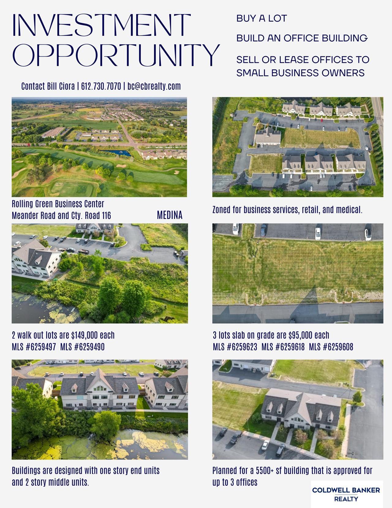 5 Lots available. 3 slab on grade at $95,000 each. 2 walkout lots at $149,000 each (listed separately). Great opportunity for an investor or business owner to buy Lot 13 in the Rolling Green Business Center! Approved for 3 office condos or design and build a building that is suited for your particular business. Opportunity to own, sell or lease. Located in the charming and growing community of Medina. Off Hwy 55 near Medina Golf & Country Club, residential developments, and other small businesses.