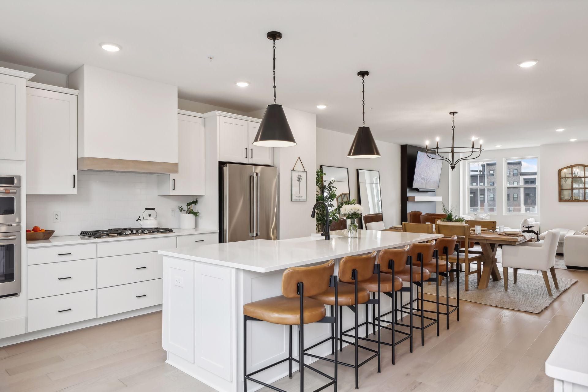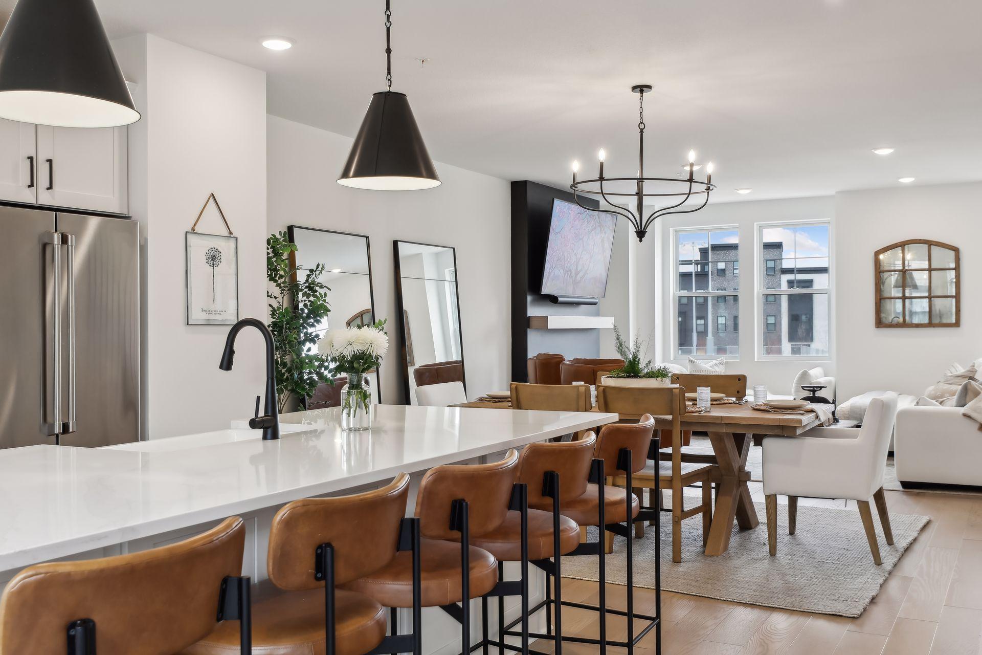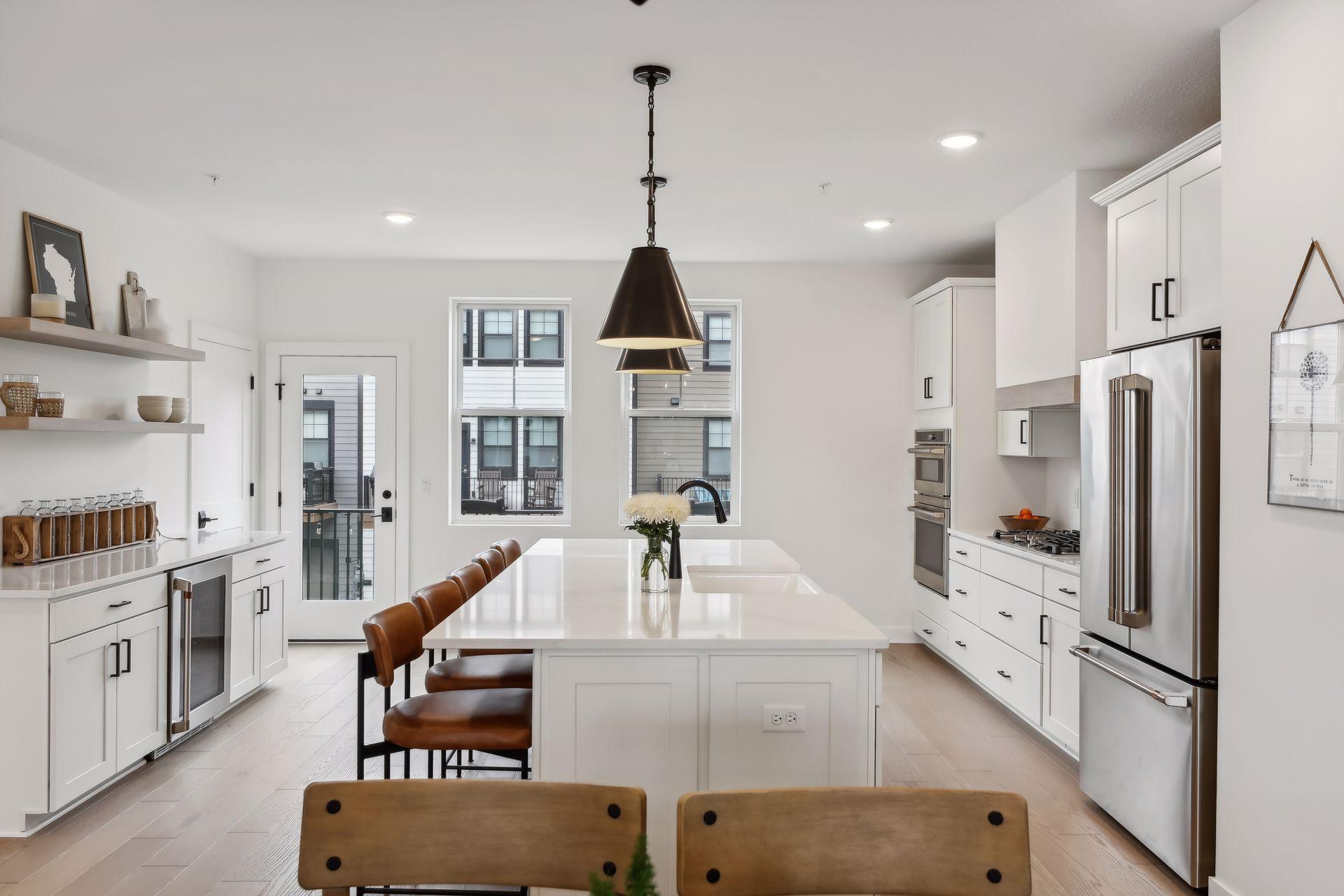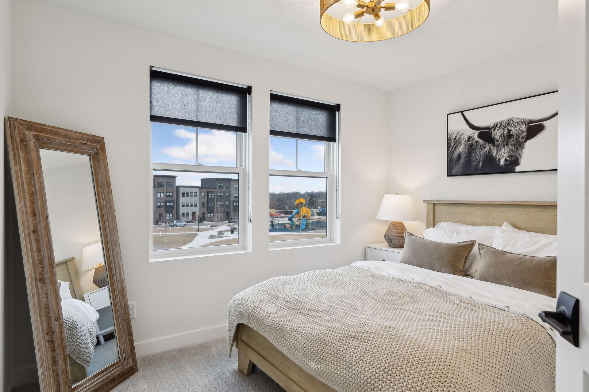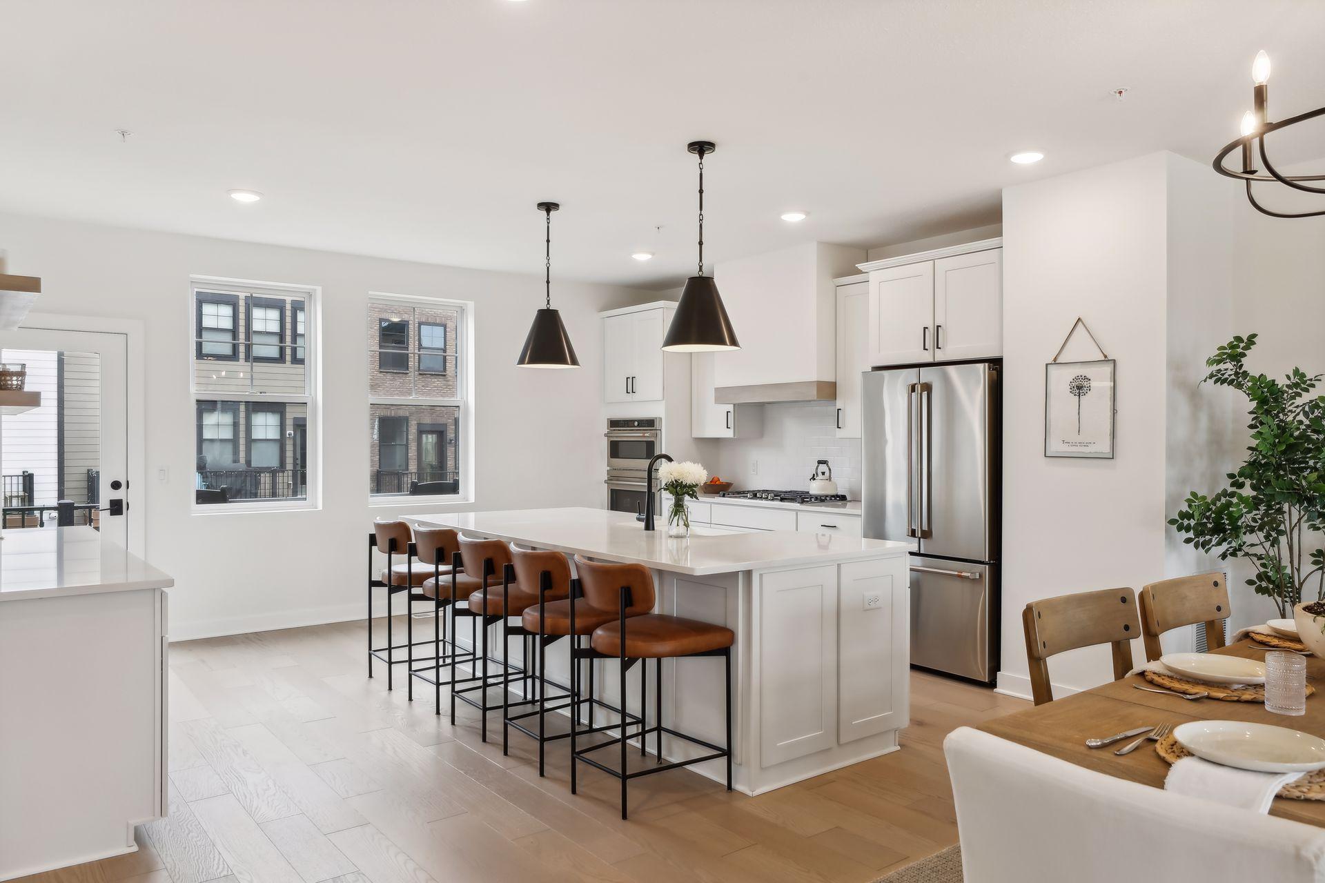 Welcome to Highland Bridge in Highland Park! A unique opportunity, this incredible Jayton floor plan is one of the largest floor plans offered here and is no longer available by the builder if you are seeking four bedrooms, five bathrooms, and a fourth level with a family room, rooftop deck and incredible views. Better than new, this rowhome is stunning top to bottom and is urban living at its finest. Walkable to just about everything you could ever desire including the flagship Lunds & Byerlys grocery store, Lifetime Fitness, Target, Starbucks, Walgreens, Highland Movie Theater, shops and a medley of restaurants. Just minutes to the Minneapolis/St. Paul International Airport, it’s perfect for frequent travelers and is close proximity to downtown St. Paul, Minneapolis and freeway access. This premium river front development is 55 acres of parks and recreation, 10 miles of walking and biking trails, dog park, skateboarding, pickle ball, basketball and futsal courts. Boasting over 3000 square feet, this lives like a house, without maintenance. The main level is open concept with a luxury chef’s kitchen with GE Café’ upgraded stainless appliances, custom exhaust hood, quartz countertops, massive center island for casual dining, generous amounts of cabinet space, an incredible pantry, informal dining, low-maintenance deck for grilling and a beautiful living room with electric fireplace and white oak hardwood floors throughout. The third level has a luxurious primary bedroom with a spa-like ¾ bath with dual sinks, walk-in tiled shower and an incredible walk-in closet with California Closet shelving. This floor is rounded off with two more over-sized bedrooms, a full bath with quartz countertop, and a convenient laundry closet. The fourth level features a family room, great for entertaining or escaping, fourth bedroom with full bath, and party deck with panoramic views of the Mississippi River Valley, heartwarming sunsets, and the Downtown Minneapolis skyline. The main floor has an executive office with built-in book case and ½ bath. The over-sized two-car garage has epoxy floors with electric vehicle charging. Over $360,000 in builder and post-closing upgrades. Low association fee. Quick closing possible. A fully furnished option is available. This property is sure to amaze! See 3D virtual tour for your own private showing today.