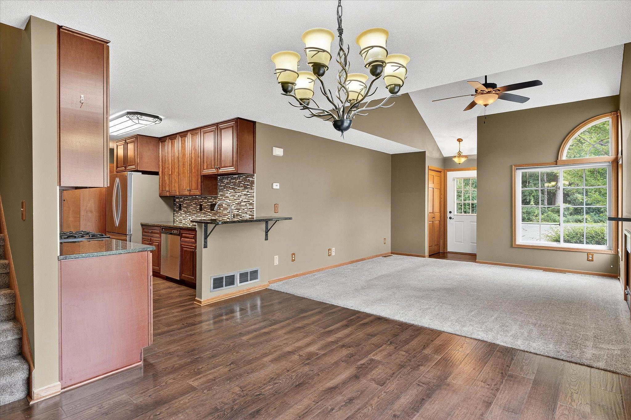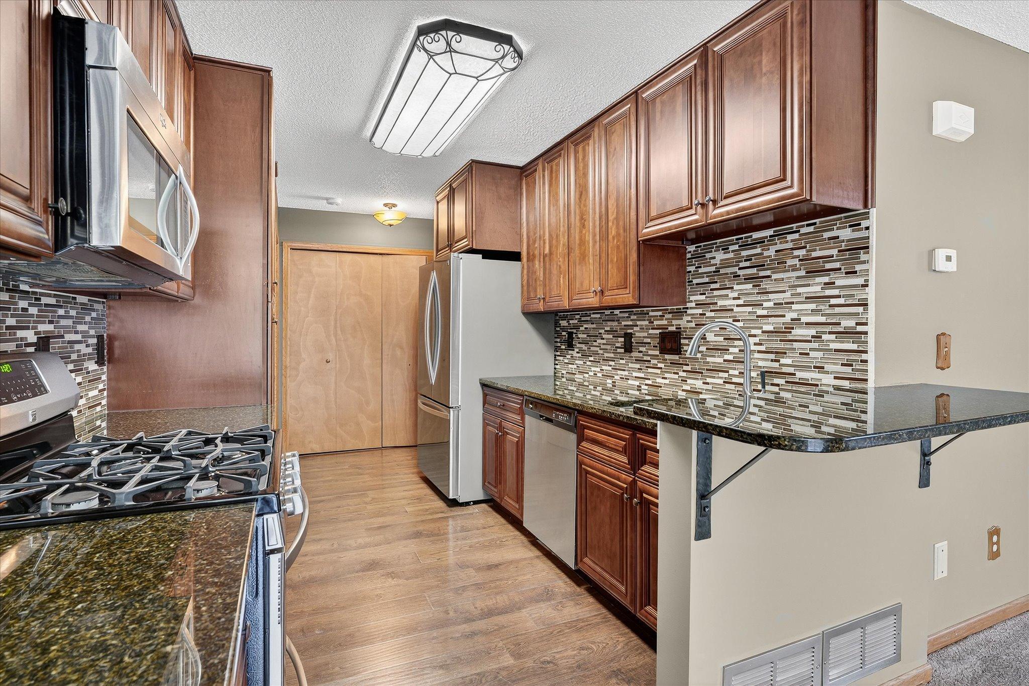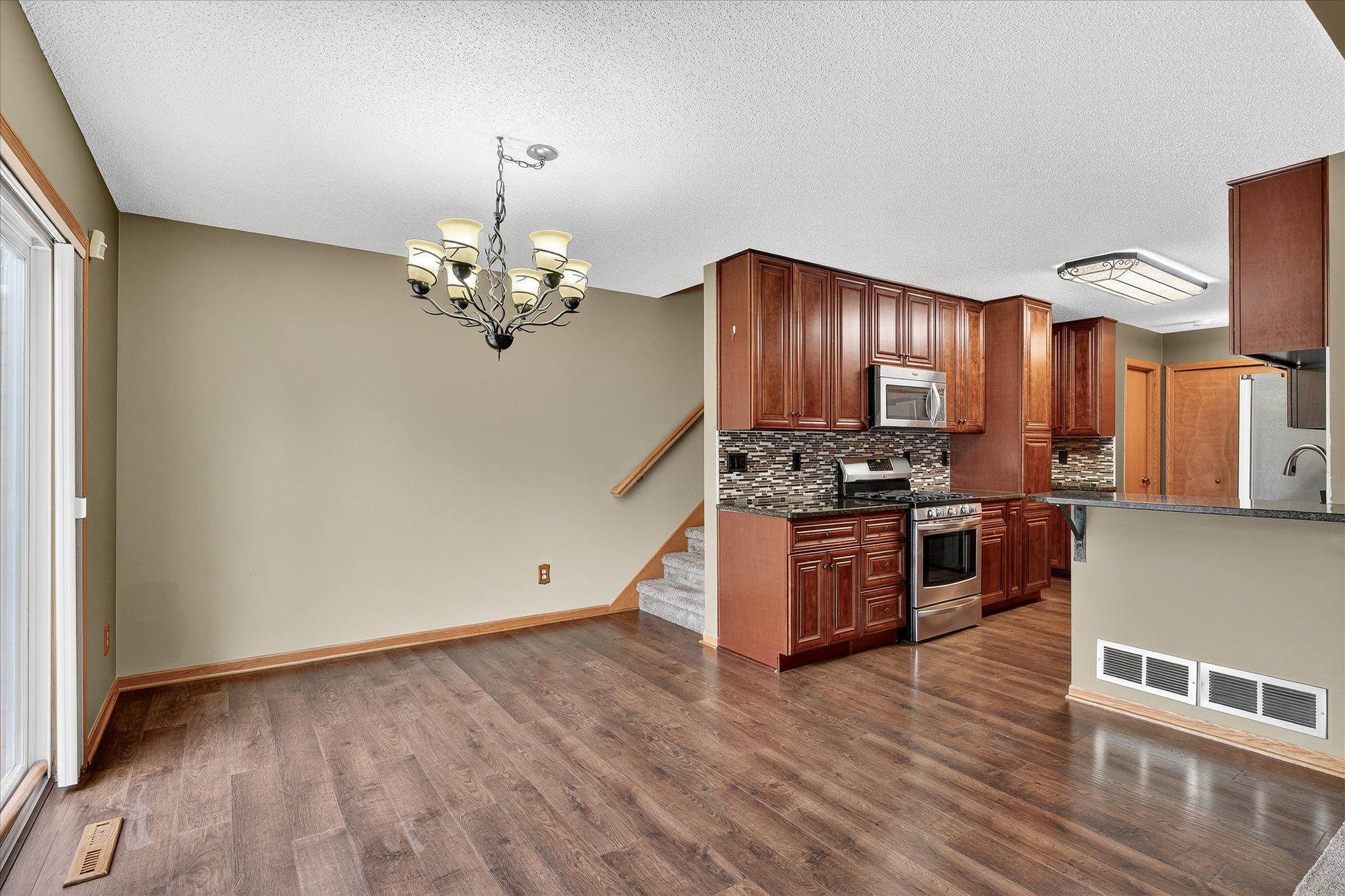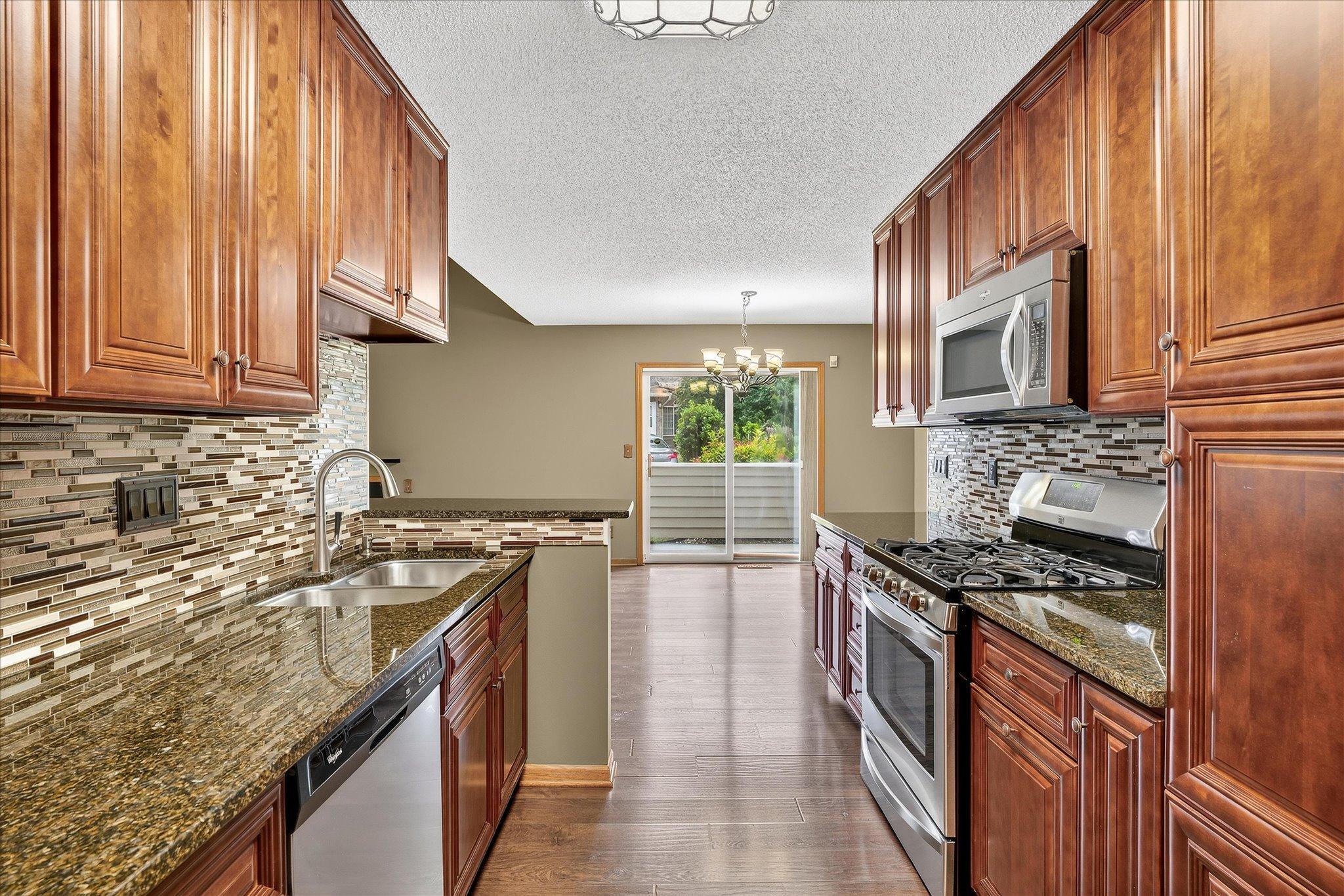 Seller has spared no expense in updating this stunning 4-bedroom, 3-bath end-unit townhome located in a highly desirable neighborhood. The completely remodeled kitchen is a showstopper, featuring rich cherry-finish cabinetry, granite countertops, stainless steel appliances, and a stylish tile backsplash. With nearly 2,000 finished square feet, the spacious floor plan offers an inviting layout and meticulous updates throughout. Enjoy peace of mind with new siding, a new roof, and newer mechanicals, including the furnace, AC, and water heater. The main level provides a bright living room with a cozy gas fireplace and direct access to the patio through sliding glass doors, making it perfect for relaxing or entertaining. Upstairs you’ll find three comfortable bedrooms, complemented by newer carpet and fresh paint. The lower level adds exceptional living space, complete with a large fourth bedroom (or optional family room), a wet bar, and a stylish third bath. Whether you’re looking for guest accommodations or extra room to gather, this level has it all. Situated on a quiet street- this home is conveniently located just steps to parks, trail and shopping. All the updates have been completed, move right in and enjoy!